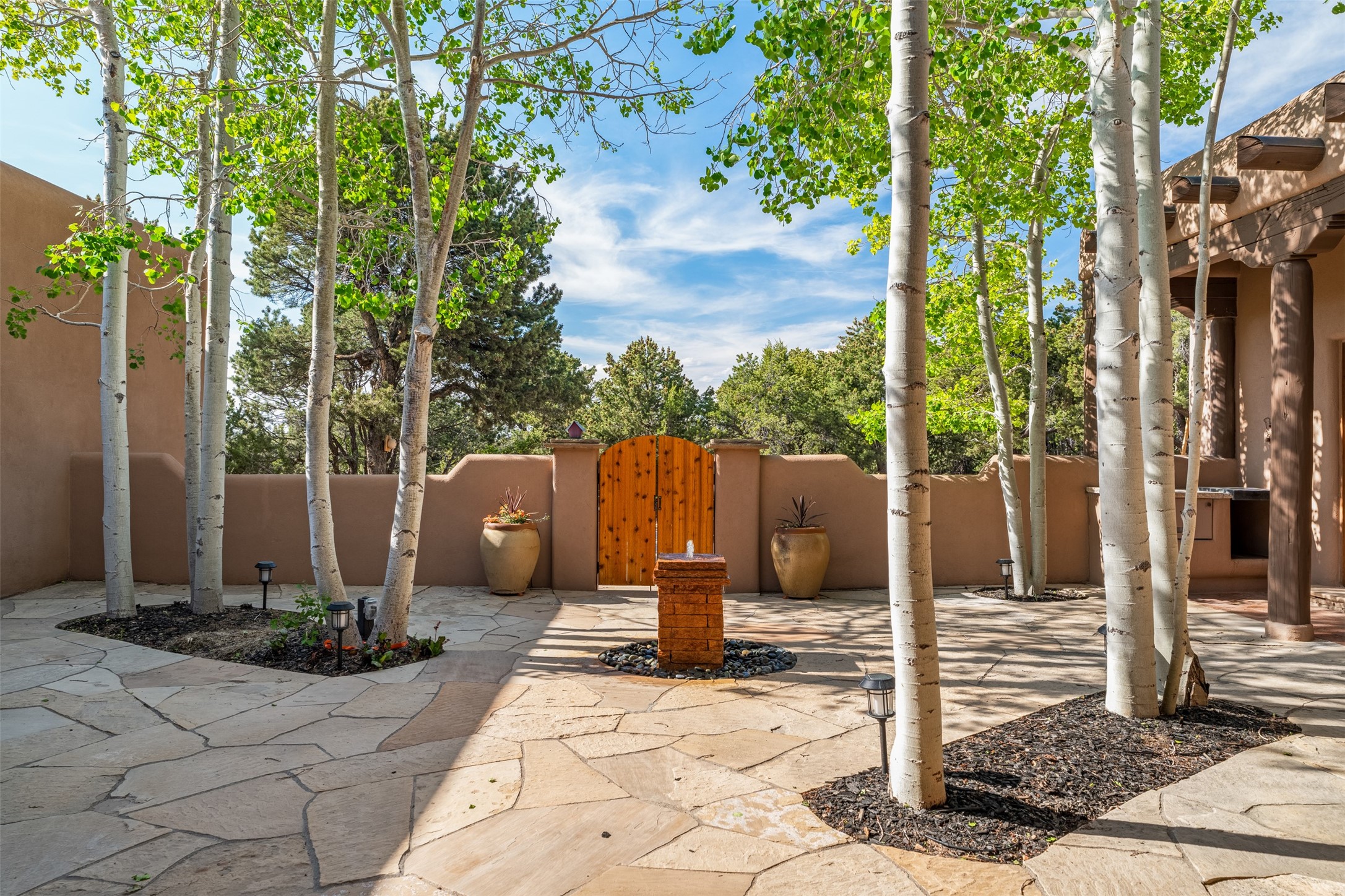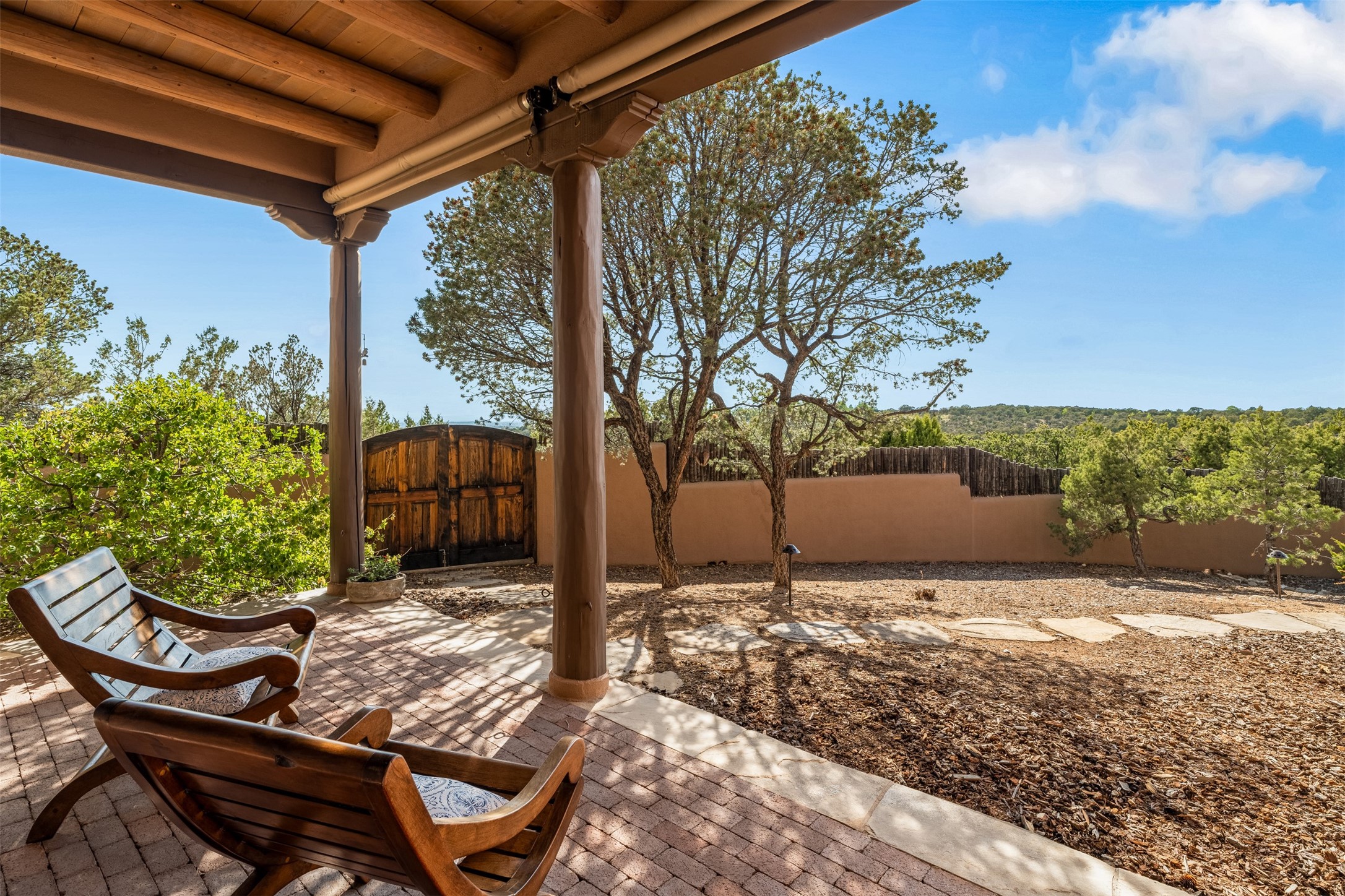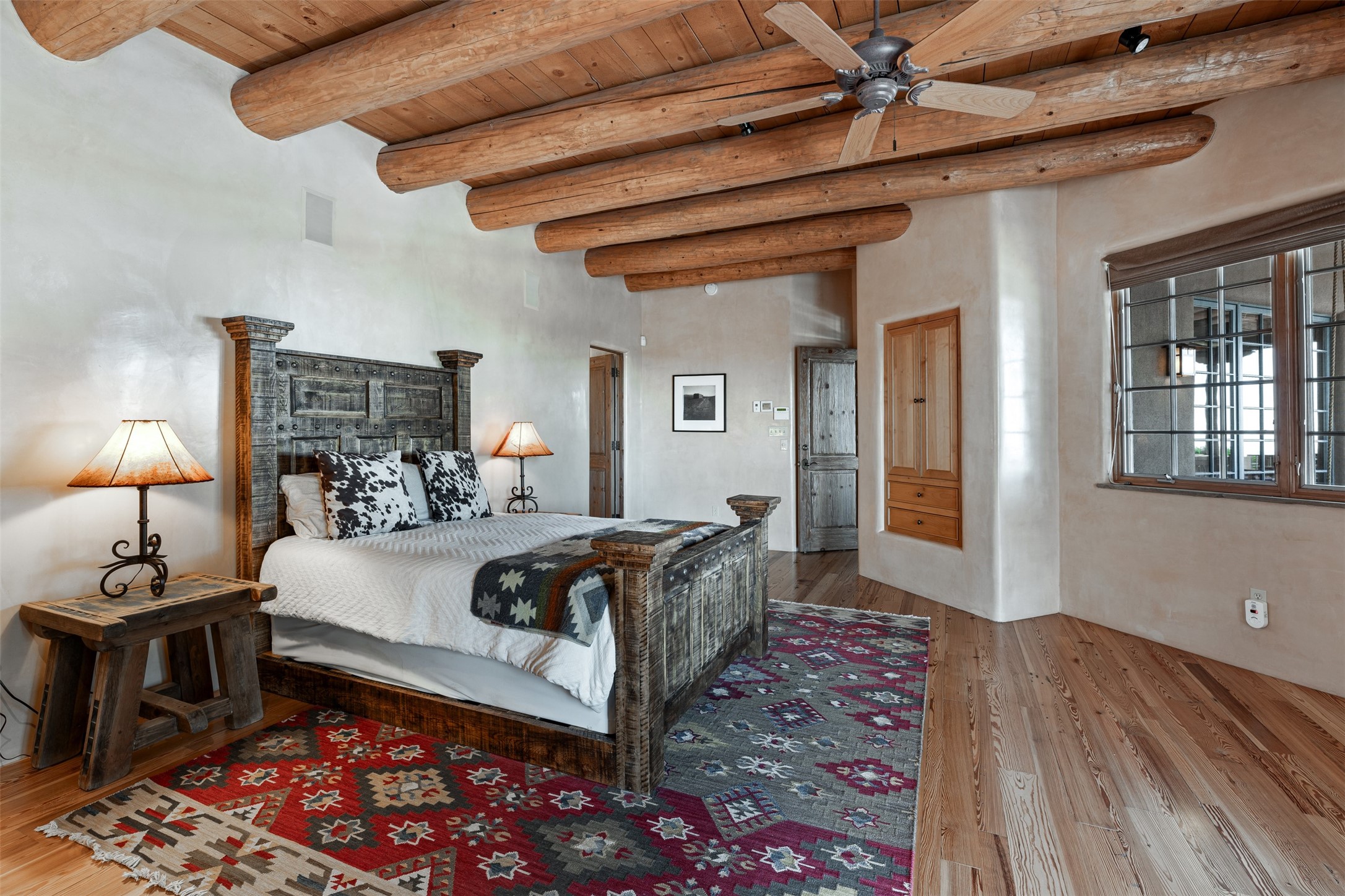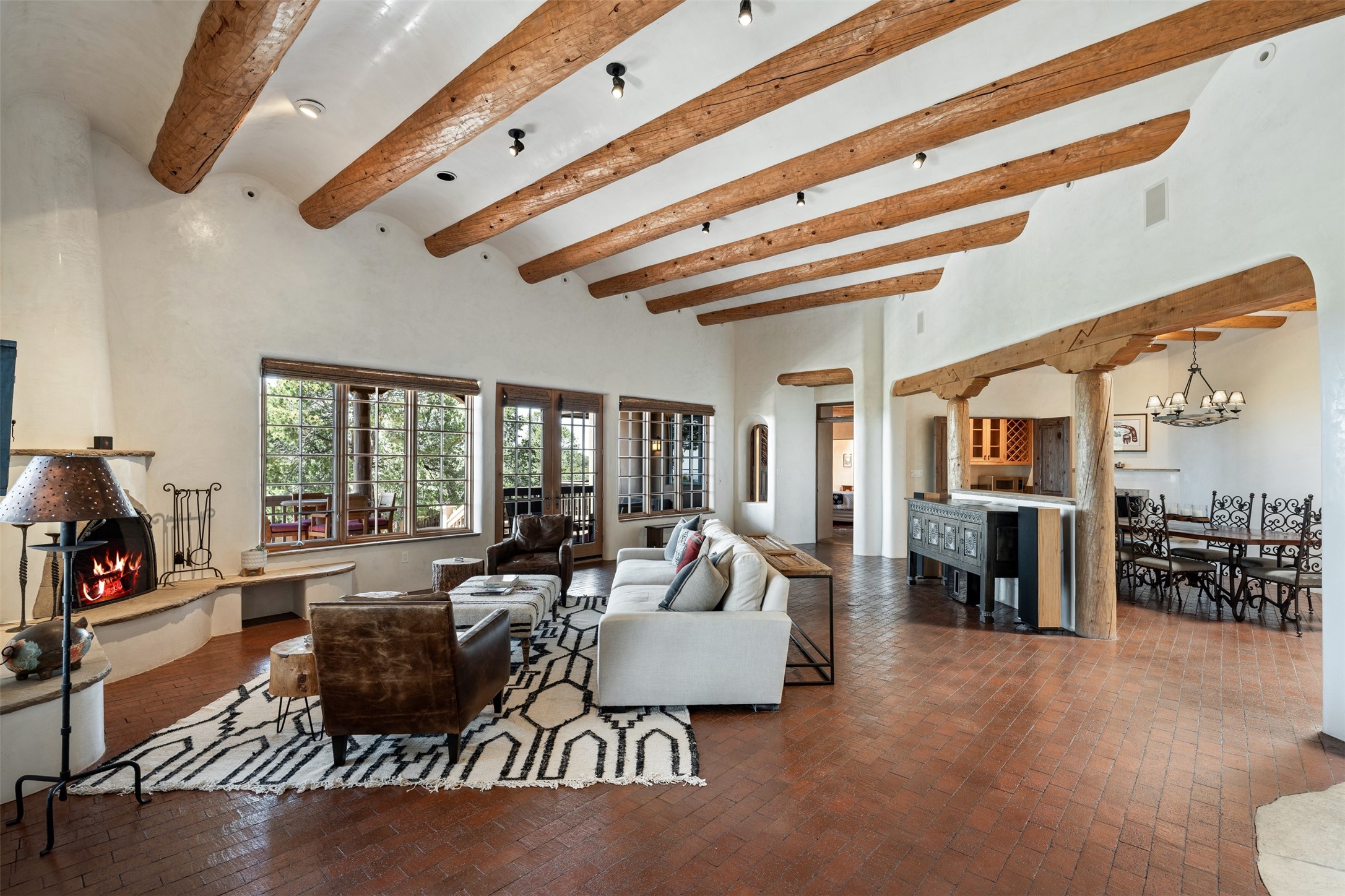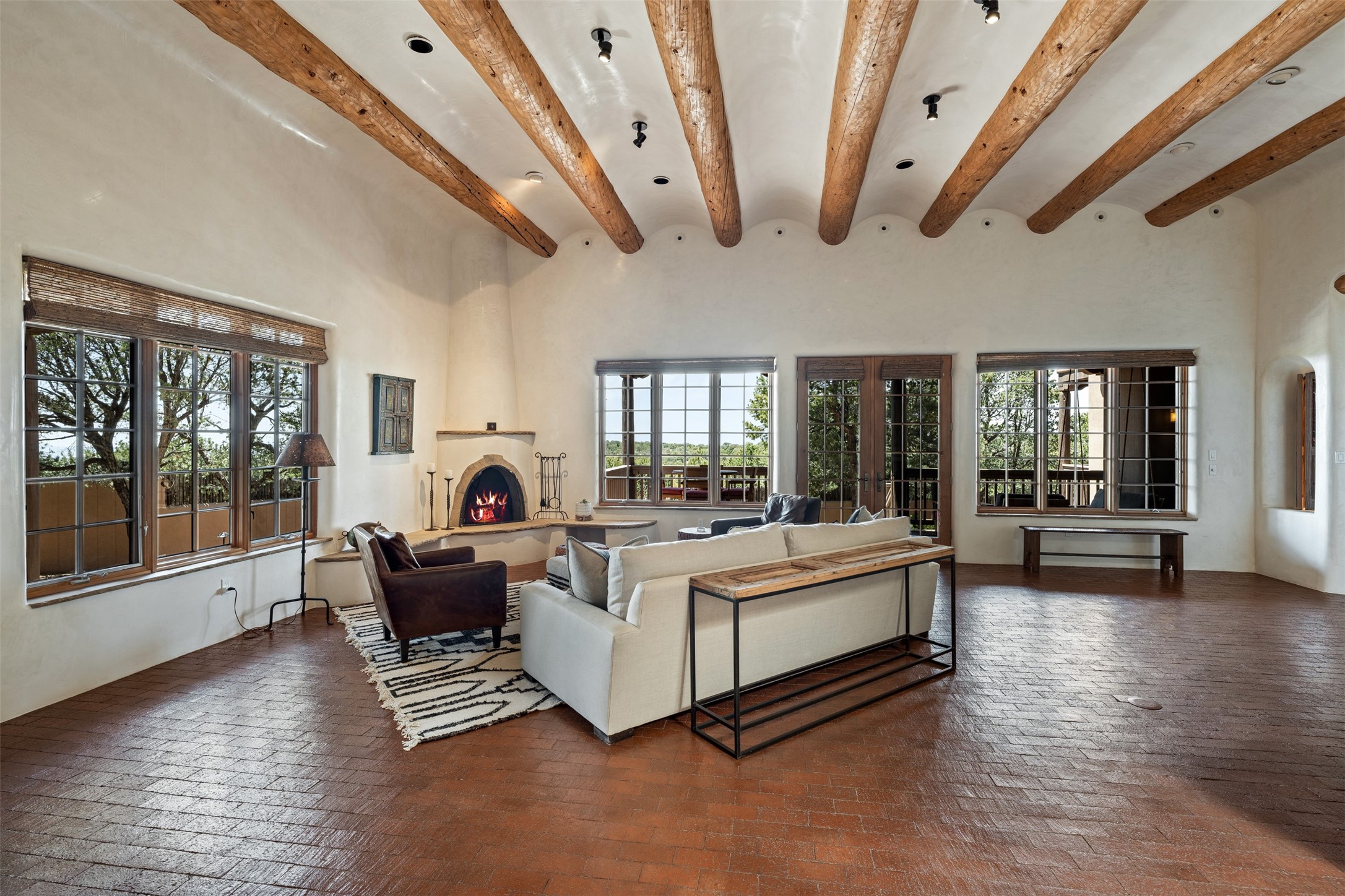 This, Rick Driscoll built, Sierra del Norte estate is perfectly located near the top of the subdivision. The 2.15 acre lot borders county open land, offers western views and can accommodate a casita. This home is a must see for the discerning buyer who wants quality, architectural excellence, privacy, views, and convenient access to the heart of Santa Fe and the ski area. Finishes include diamond polished plaster walls, vigas with coved ceilings, massive beams and reclaimed pine, brick and flagstone floors. The inviting floor plan has separated primary and guest bedrooms in addition to a private office. Each guest suite features, en-suite baths and wood burning fireplaces. The spacious kitchen was completely remodeled by the current owners and features top-notch appliances, Taj Mahal countertops and custom cabinetry. The kitchen is well placed in relation to the living/dining areas, den, and portals to allow for easy entertaining. The spacious primary suite with fireplace opens onto a private portal. The spa like bath features a large shower with separate steam shower, dual sinks, tub, dual toilets and a bidet. The home is fully air conditioned and has radiant in-floor heating, Multiple portals are thoughtfully attached to the various living spaces and bedrooms. The gated driveway leads to an oversized, heated four car garage with lots of storage and EV charger outlet. The grounds are landscaped with rock walls, mature trees, water features and are fenced. An owned photovoltaic system keeps electric bills very low. The membrane roof is under warranty. This is a wonderful, well maintained, home in one of Santa Fe's most sought after neighborhoods. Just move in and enjoy.