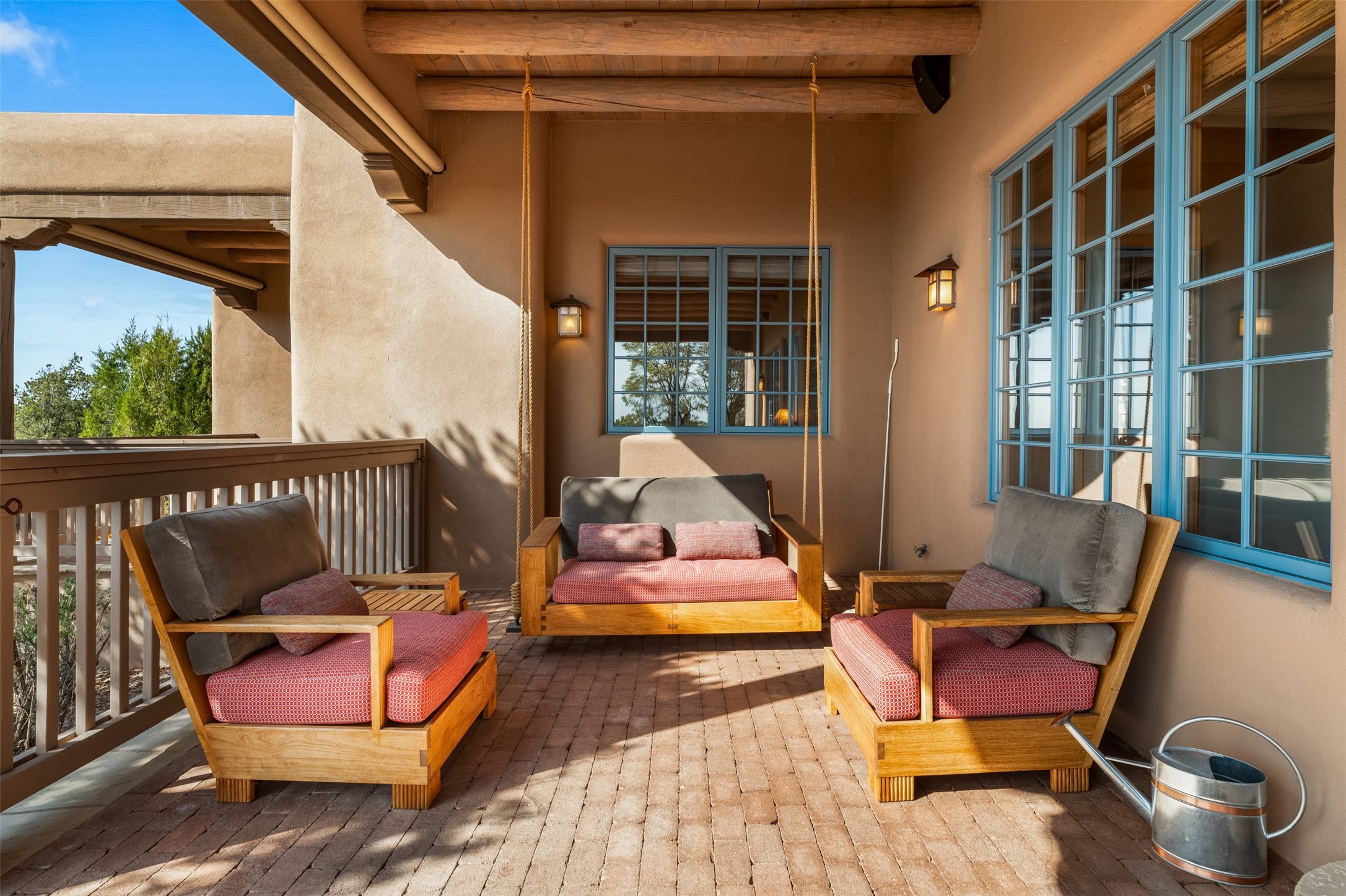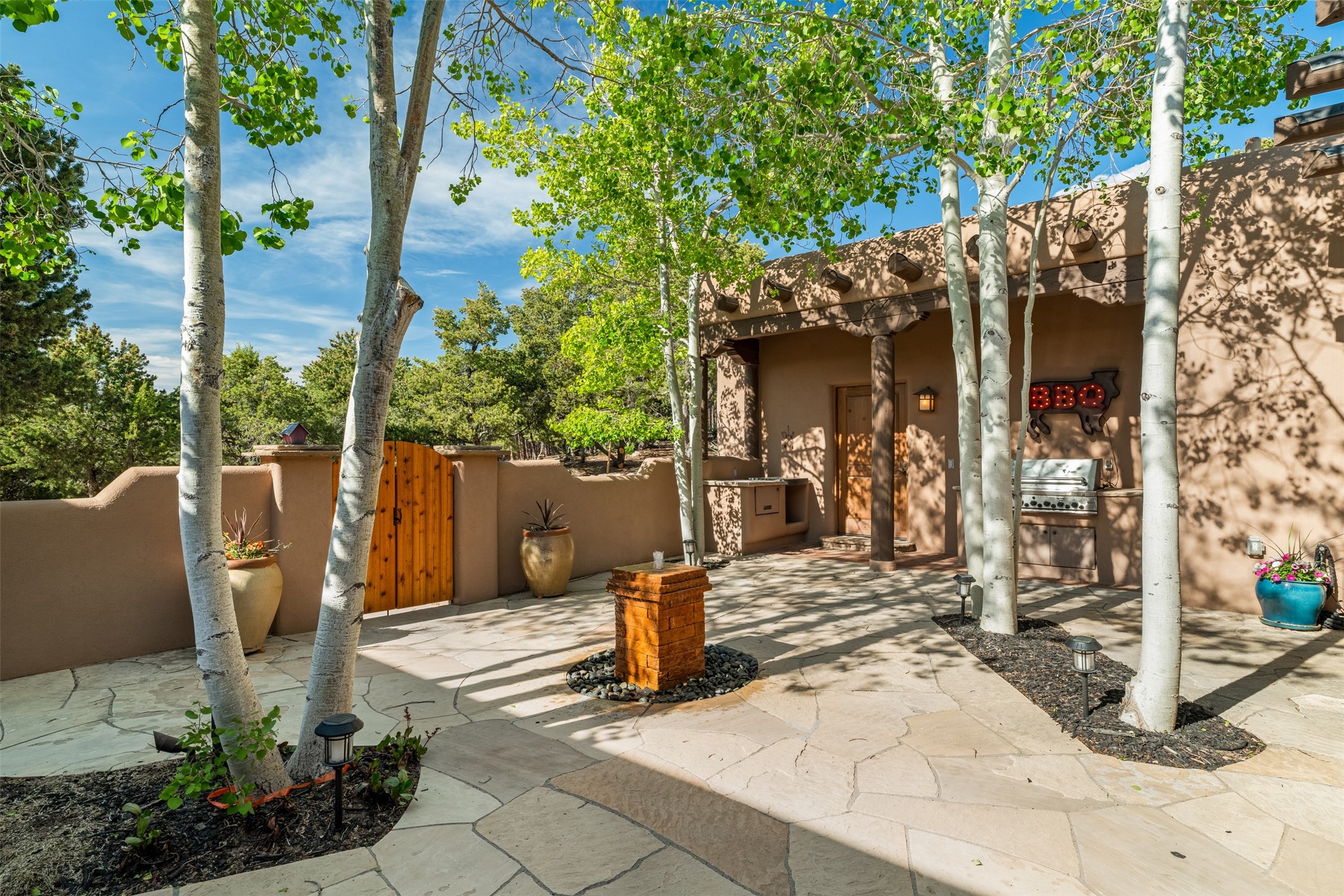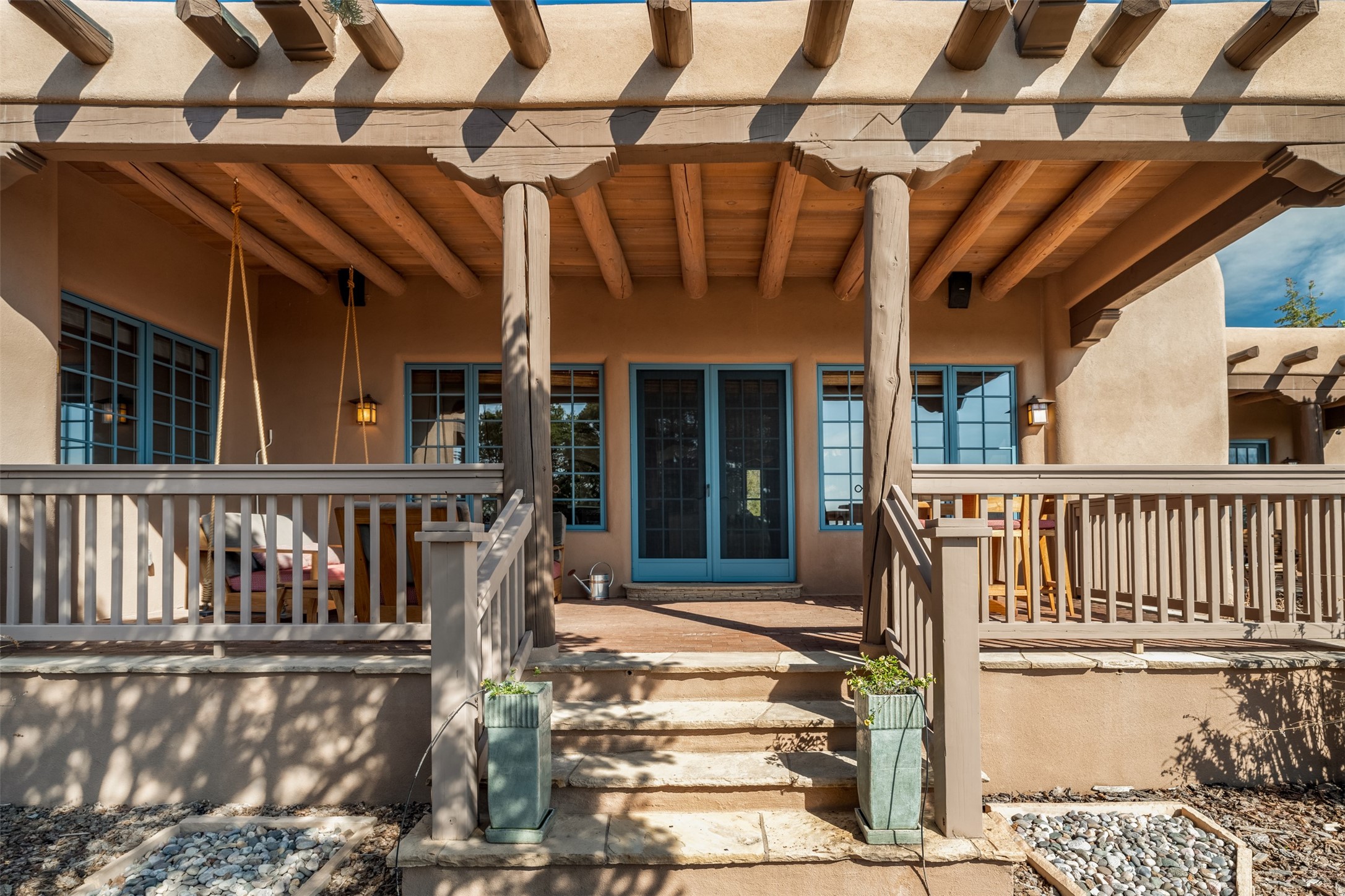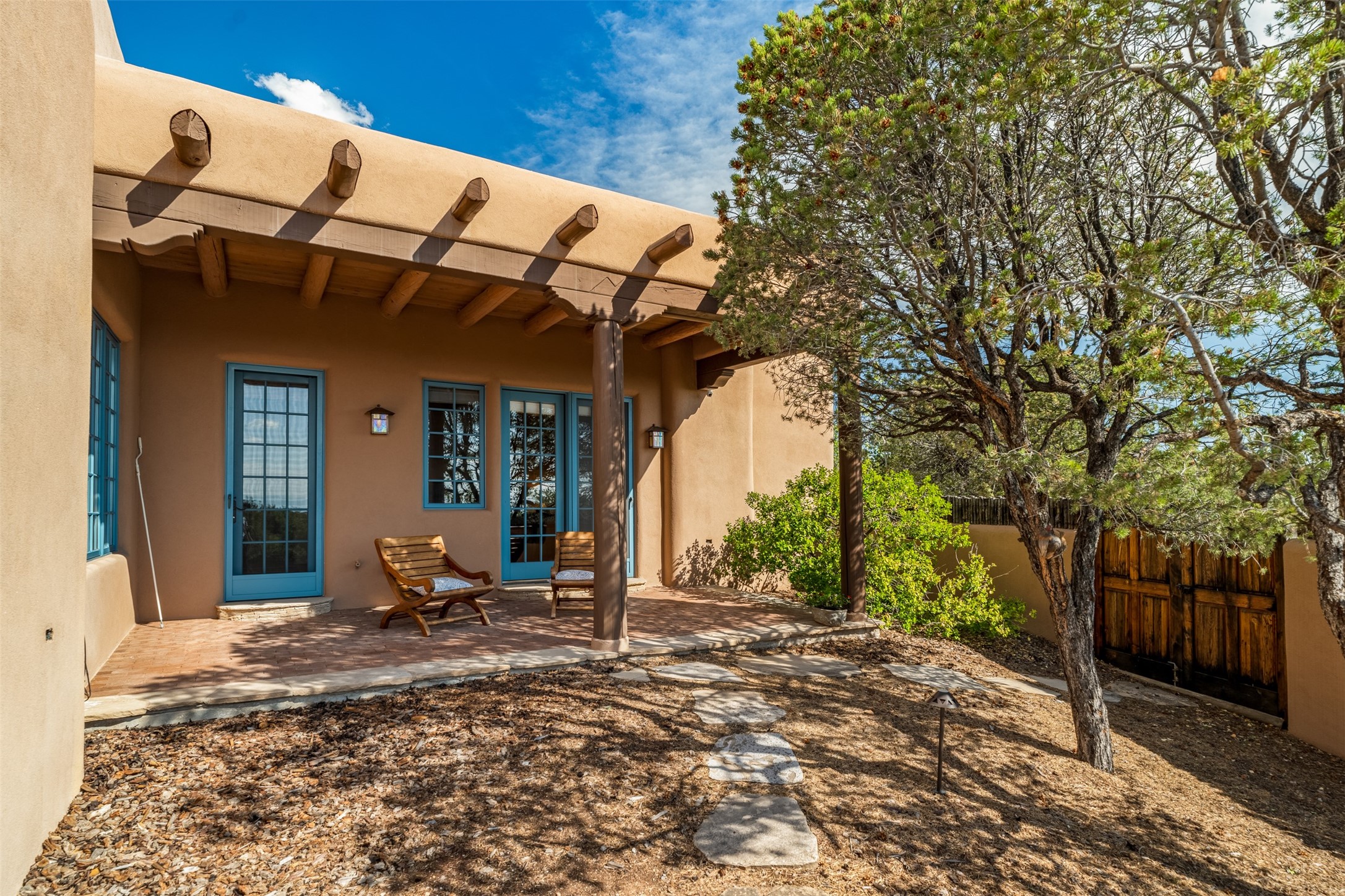 This, Rick Driscoll built, Sierra del Norte estate is perfectly located near the top of the subdivision. The 2.15 acre lot borders county open land, offers western views and can accommodate a casita. This home is a must see for the discerning buyer who wants quality, architectural excellence, privacy, views, and convenient access to the heart of Santa Fe and the ski area. Finishes include diamond polished plaster walls, vigas with coved ceilings, massive beams and reclaimed pine, brick and flagstone floors. The inviting floor plan has separated primary and guest bedrooms in addition to a private office. Each guest suite features, en-suite baths and wood burning fireplaces. The spacious kitchen was completely remodeled by the current owners and features top-notch appliances, Taj Mahal countertops and custom cabinetry. The kitchen is well placed in relation to the living/dining areas, den, and portals to allow for easy entertaining. The spacious primary suite with fireplace opens onto a private portal. The spa like bath features a large shower with separate steam shower, dual sinks, tub, dual toilets and a bidet. The home is fully air conditioned and has radiant in-floor heating, Multiple portals are thoughtfully attached to the various living spaces and bedrooms. The gated driveway leads to an oversized, heated four car garage with lots of storage and EV charger outlet. The grounds are landscaped with rock walls, mature trees, water features and are fenced. An owned photovoltaic system keeps electric bills very low. The membrane roof is under warranty. This is a wonderful, well maintained, home in one of Santa Fe's most sought after neighborhoods. Just move in and enjoy.