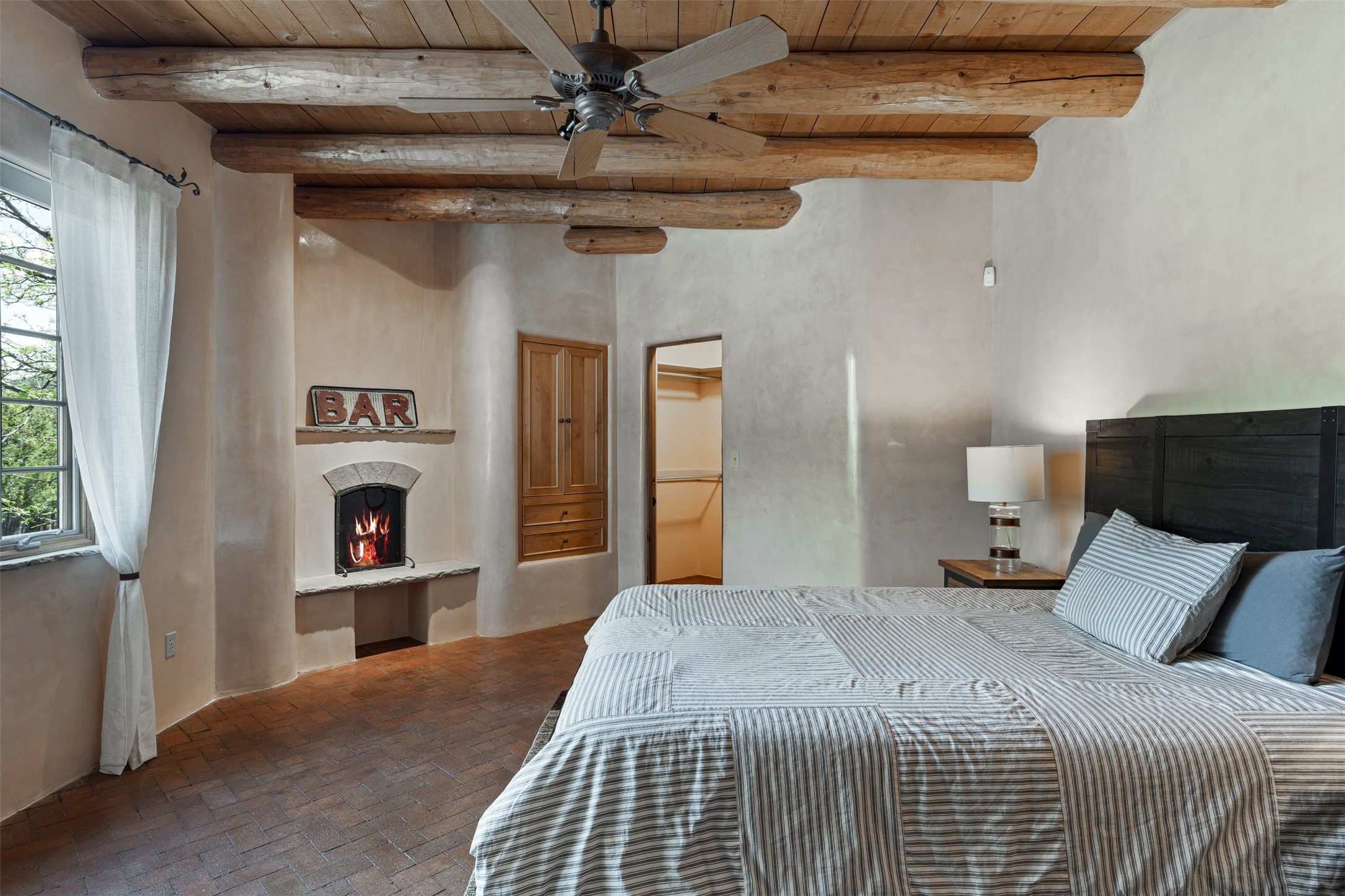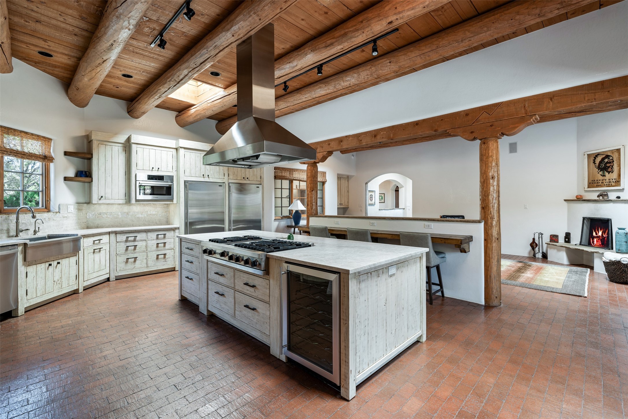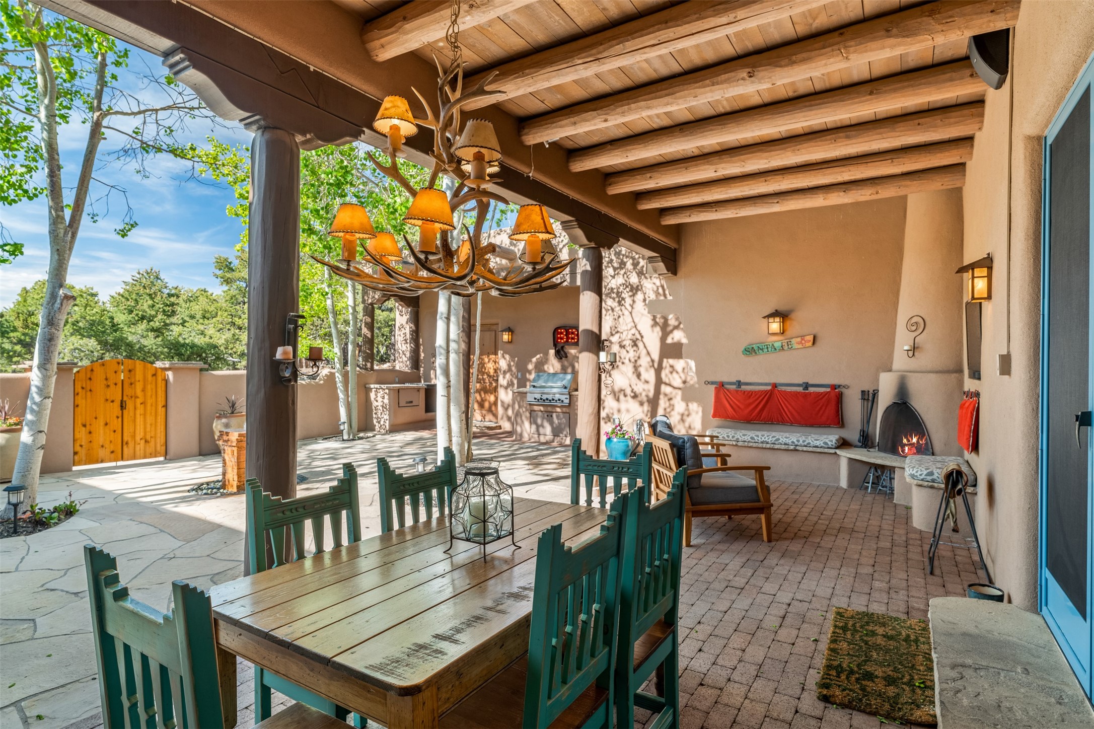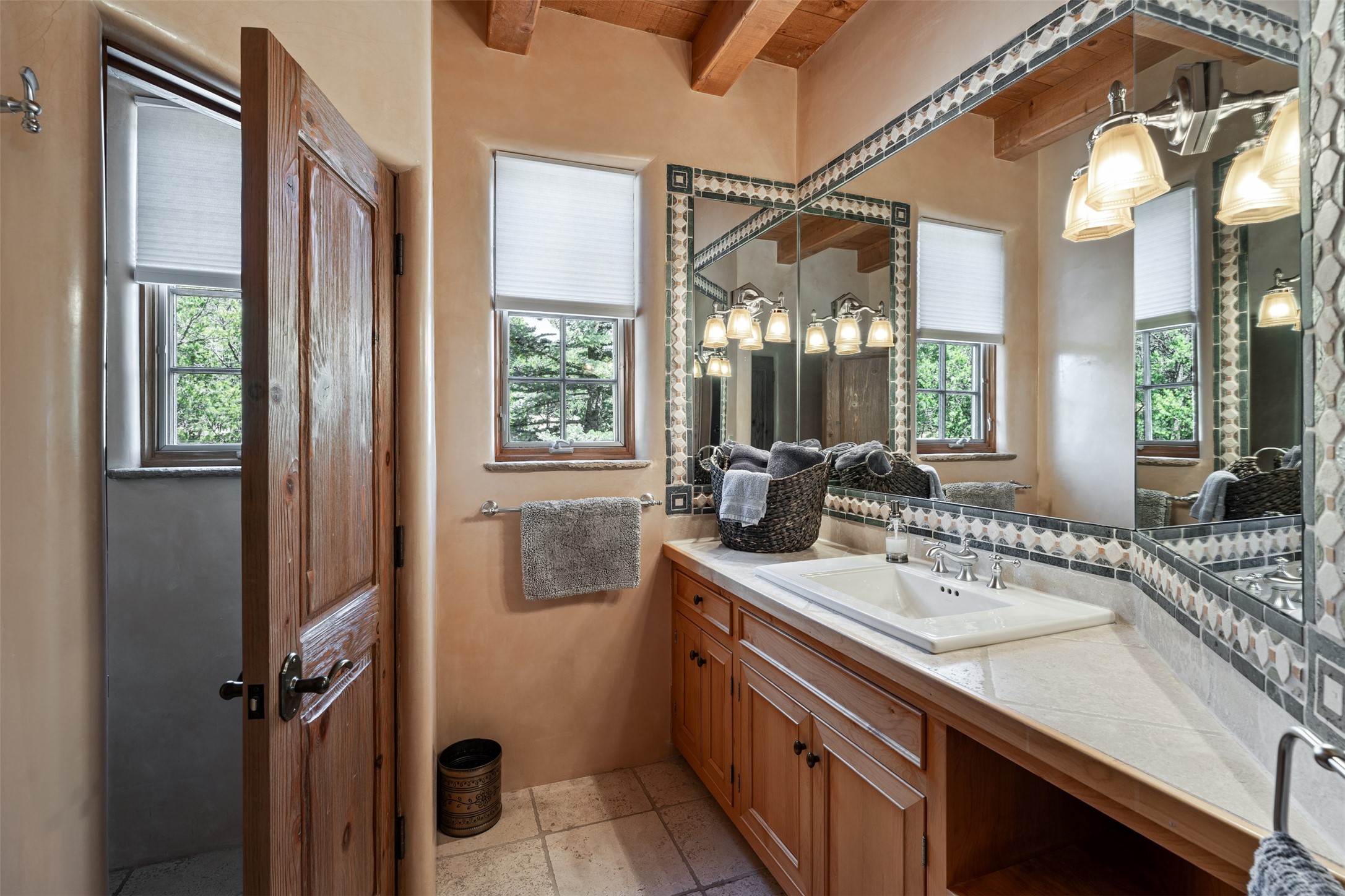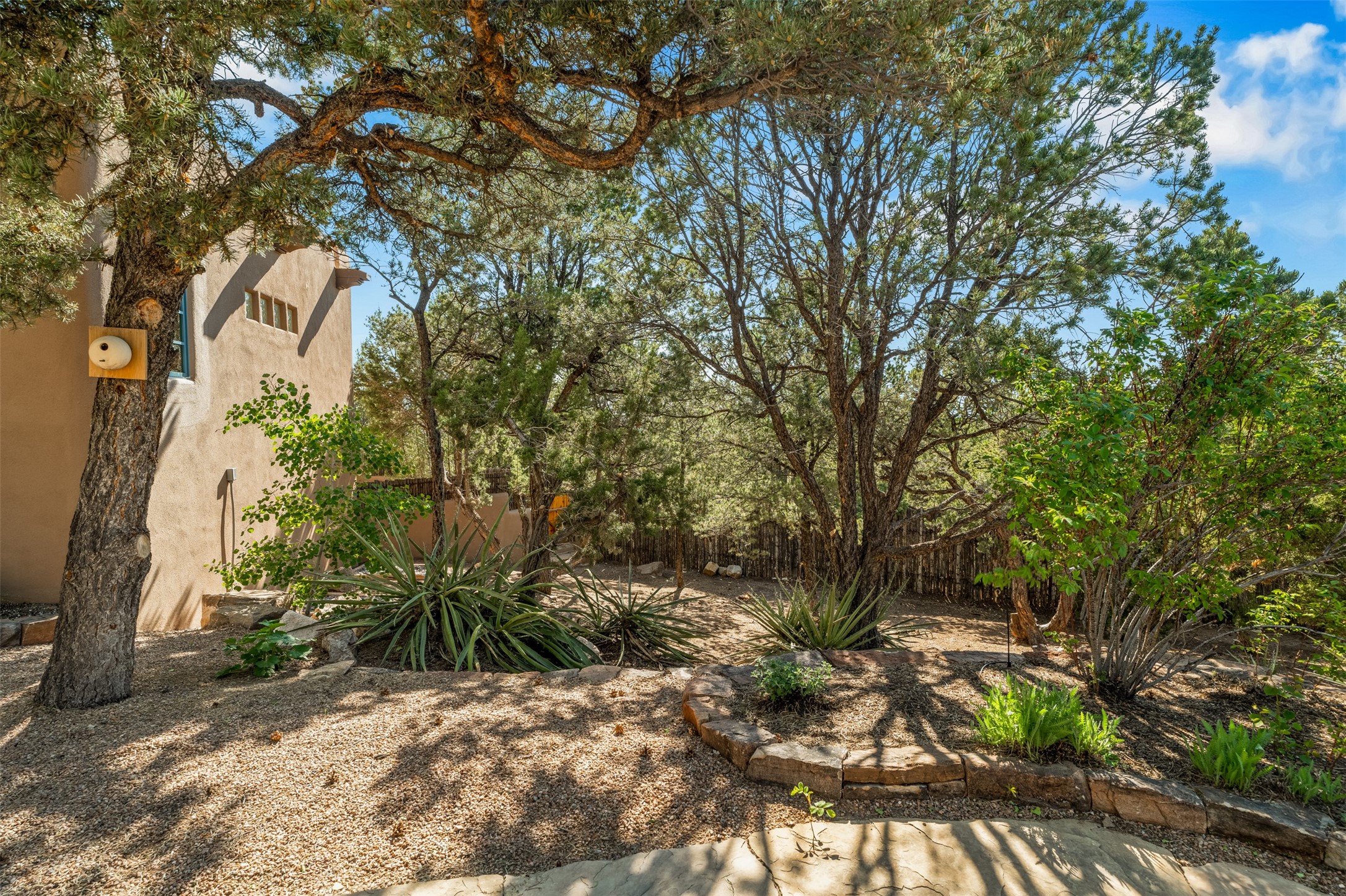 This, Rick Driscoll built, Sierra del Norte estate is perfectly located near the top of the subdivision. The 2.15 acre lot borders county open land, offers western views and can accommodate a casita. This home is a must see for the discerning buyer who wants quality, architectural excellence, privacy, views, and convenient access to the heart of Santa Fe and the ski area. Finishes include diamond polished plaster walls, vigas with coved ceilings, massive beams and reclaimed pine, brick and flagstone floors. The inviting floor plan has separated primary and guest bedrooms in addition to a private office. Each guest suite features, en-suite baths and wood burning fireplaces. The spacious kitchen was completely remodeled by the current owners and features top-notch appliances, Taj Mahal countertops and custom cabinetry. The kitchen is well placed in relation to the living/dining areas, den, and portals to allow for easy entertaining. The spacious primary suite with fireplace opens onto a private portal. The spa like bath features a large shower with separate steam shower, dual sinks, tub, dual toilets and a bidet. The home is fully air conditioned and has radiant in-floor heating, Multiple portals are thoughtfully attached to the various living spaces and bedrooms. The gated driveway leads to an oversized, heated four car garage with lots of storage and EV charger outlet. The grounds are landscaped with rock walls, mature trees, water features and are fenced. An owned photovoltaic system keeps electric bills very low. The membrane roof is under warranty. This is a wonderful, well maintained, home in one of Santa Fe's most sought after neighborhoods. Just move in and enjoy.