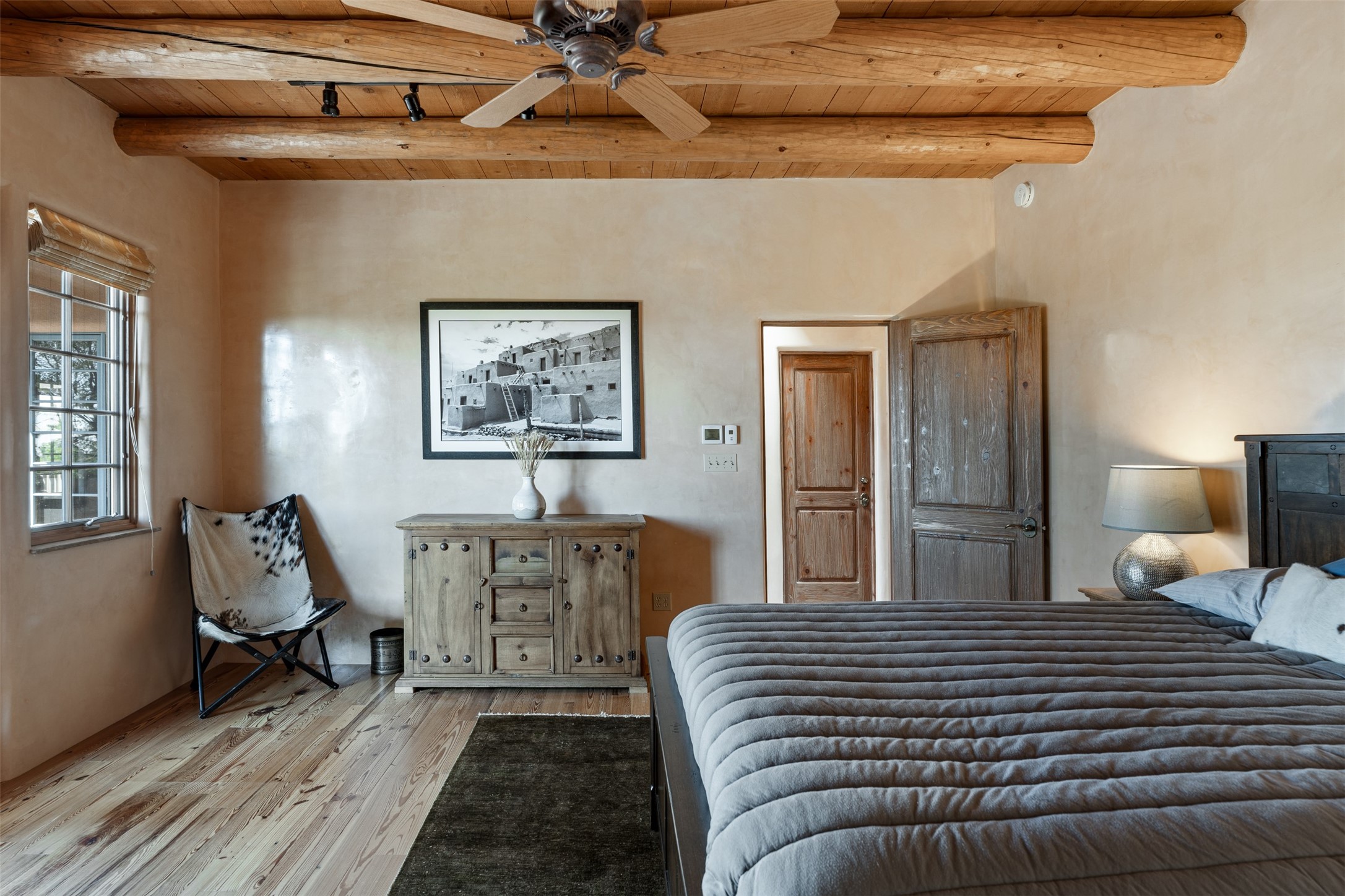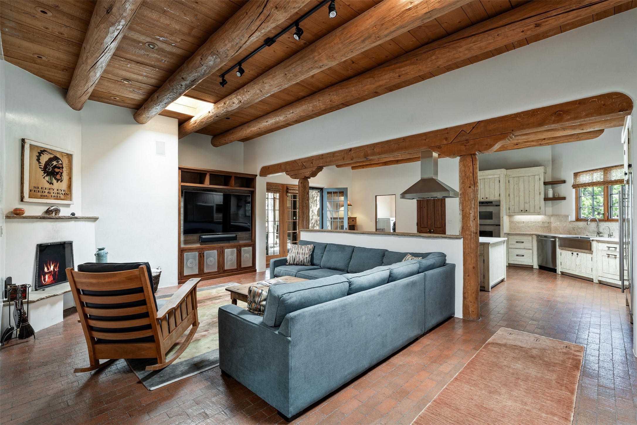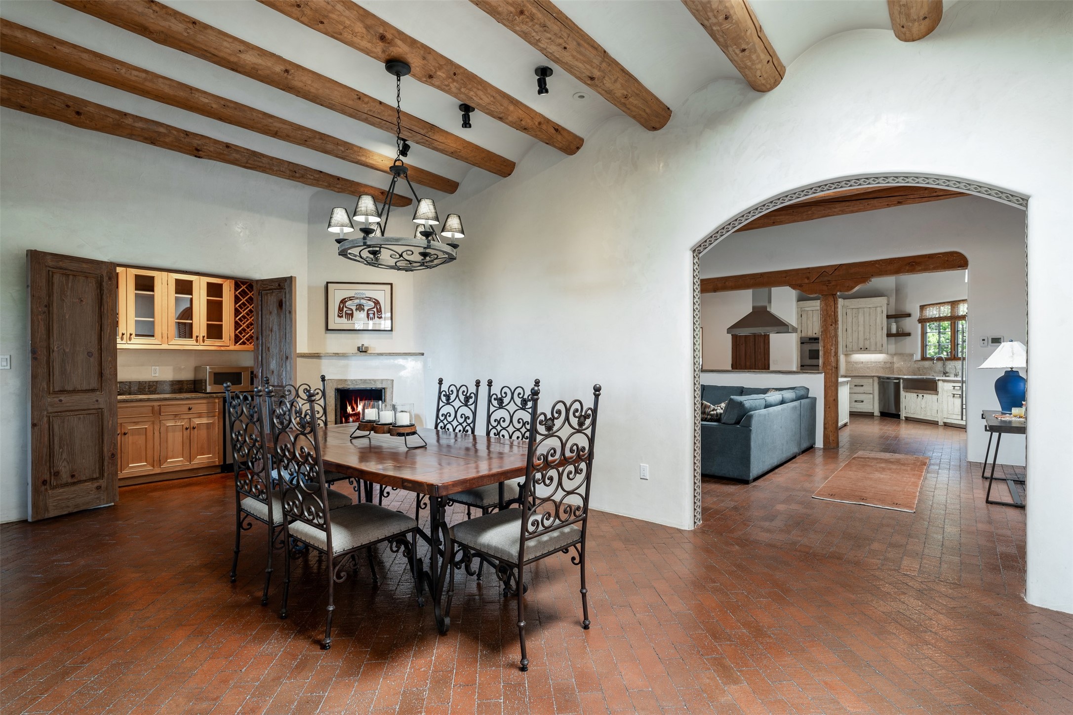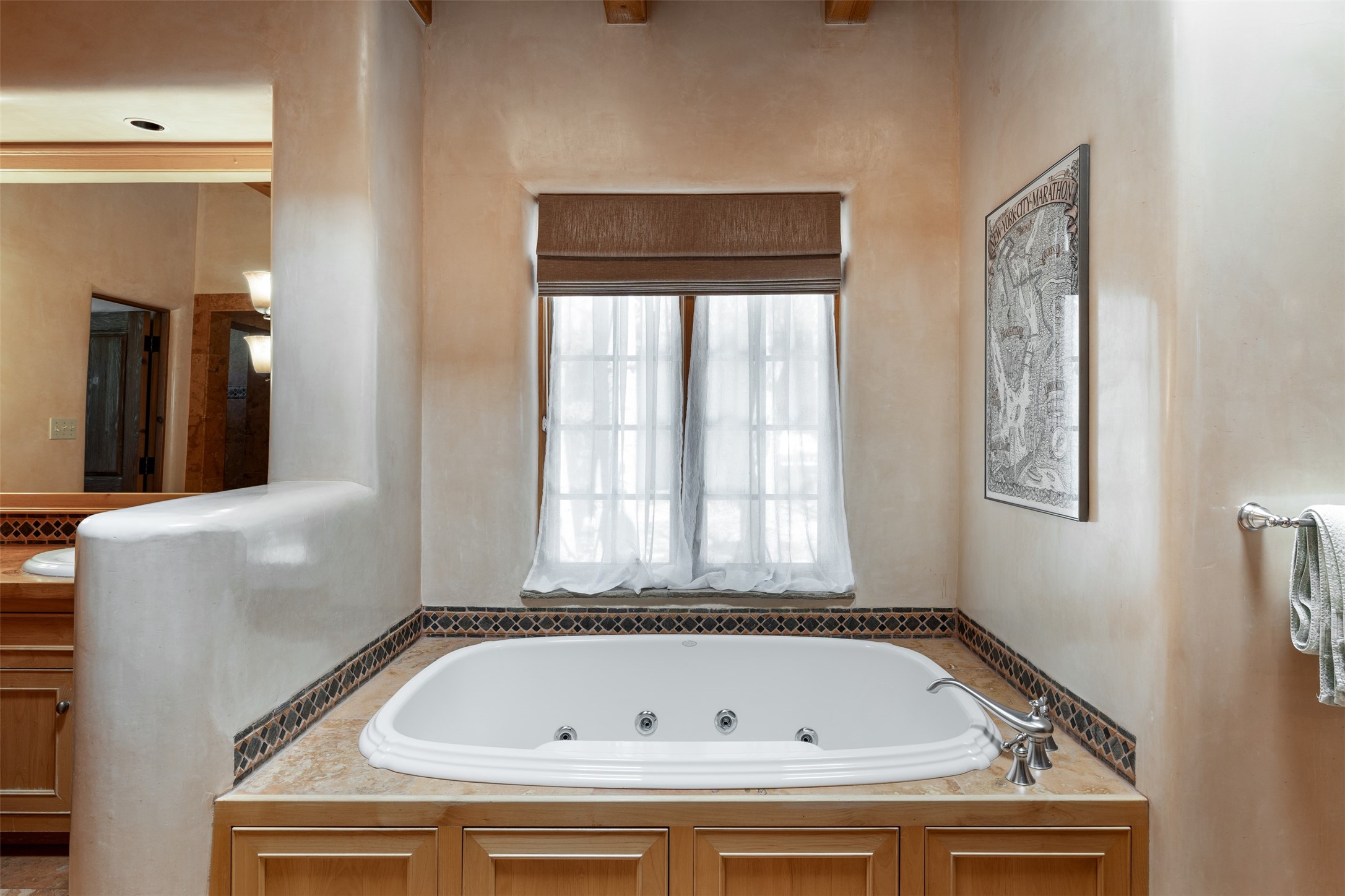 This, Rick Driscoll built, Sierra del Norte estate is perfectly located near the top of the subdivision. The 2.15 acre lot borders county open land, offers western views and can accommodate a casita. This home is a must see for the discerning buyer who wants quality, architectural excellence, privacy, views, and convenient access to the heart of Santa Fe and the ski area. Finishes include diamond polished plaster walls, vigas with coved ceilings, massive beams and reclaimed pine, brick and flagstone floors. The inviting floor plan has separated primary and guest bedrooms in addition to a private office. Each guest suite features, en-suite baths and wood burning fireplaces. The spacious kitchen was completely remodeled by the current owners and features top-notch appliances, Taj Mahal countertops and custom cabinetry. The kitchen is well placed in relation to the living/dining areas, den, and portals to allow for easy entertaining. The spacious primary suite with fireplace opens onto a private portal. The spa like bath features a large shower with separate steam shower, dual sinks, tub, dual toilets and a bidet. The home is fully air conditioned and has radiant in-floor heating, Multiple portals are thoughtfully attached to the various living spaces and bedrooms. The gated driveway leads to an oversized, heated four car garage with lots of storage and EV charger outlet. The grounds are landscaped with rock walls, mature trees, water features and are fenced. An owned photovoltaic system keeps electric bills very low. The membrane roof is under warranty. This is a wonderful, well maintained, home in one of Santa Fe's most sought after neighborhoods. Just move in and enjoy.