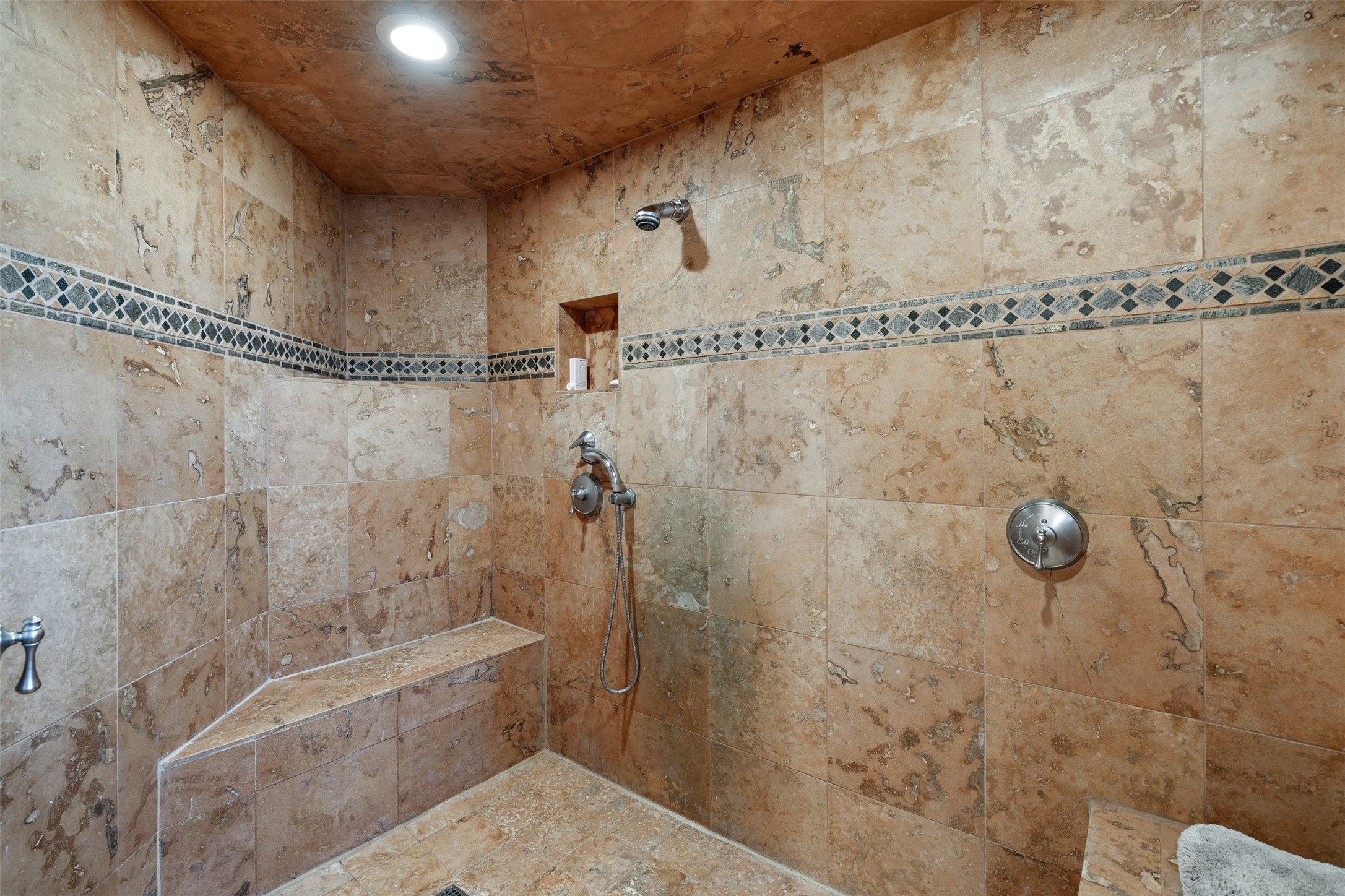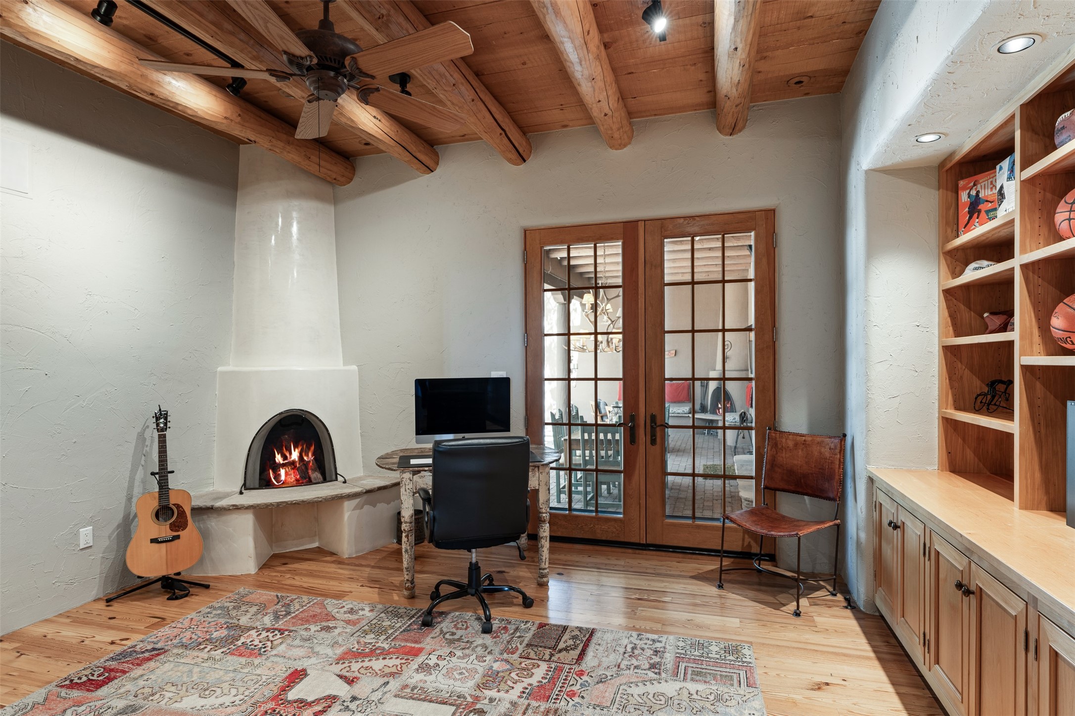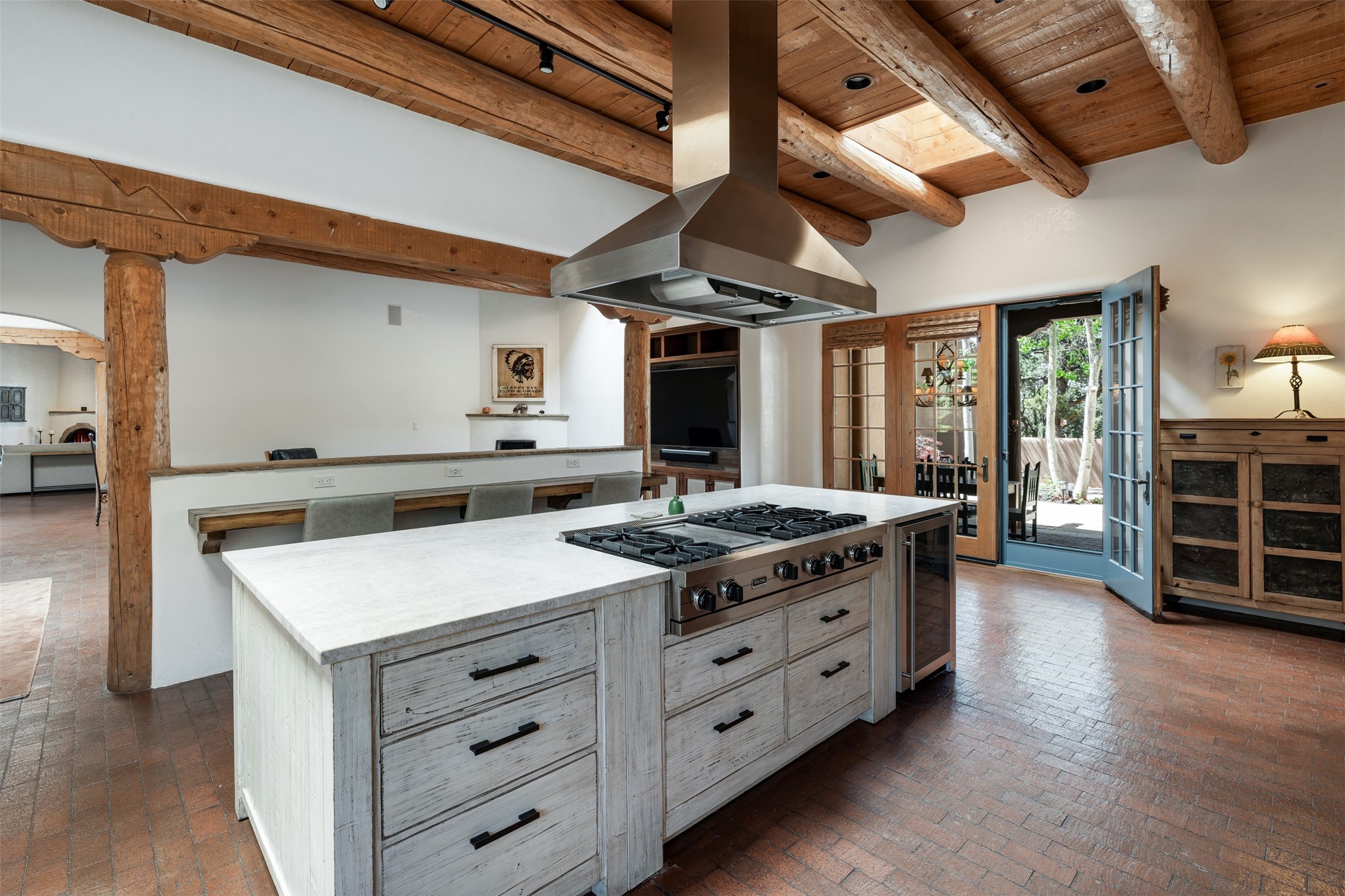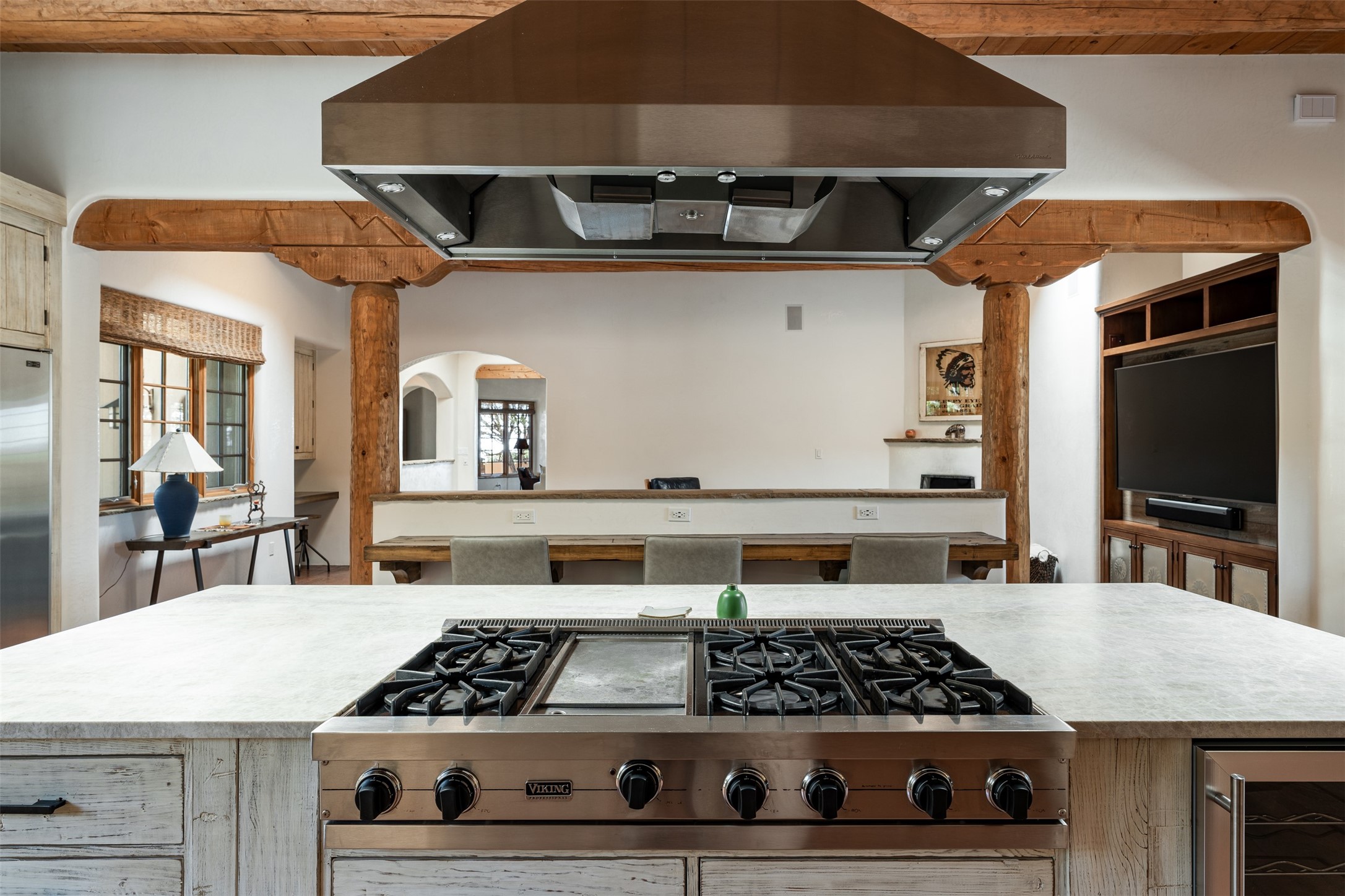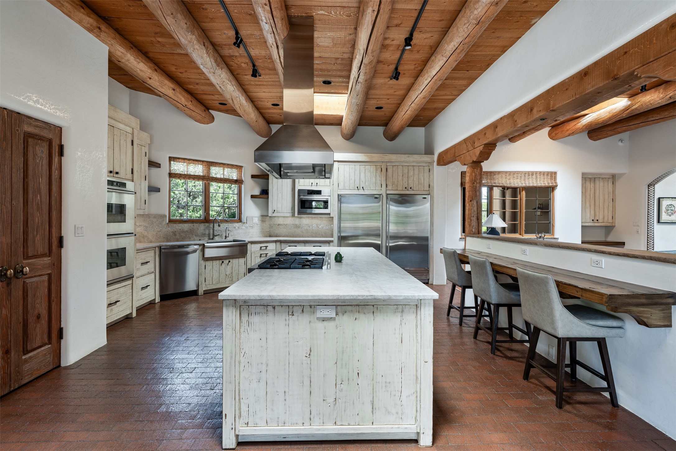 This, Rick Driscoll built, Sierra del Norte estate is perfectly located near the top of the subdivision. The 2.15 acre lot borders county open land, offers western views and can accommodate a casita. This home is a must see for the discerning buyer who wants quality, architectural excellence, privacy, views, and convenient access to the heart of Santa Fe and the ski area. Finishes include diamond polished plaster walls, vigas with coved ceilings, massive beams and reclaimed pine, brick and flagstone floors. The inviting floor plan has separated primary and guest bedrooms in addition to a private office. Each guest suite features, en-suite baths and wood burning fireplaces. The spacious kitchen was completely remodeled by the current owners and features top-notch appliances, Taj Mahal countertops and custom cabinetry. The kitchen is well placed in relation to the living/dining areas, den, and portals to allow for easy entertaining. The spacious primary suite with fireplace opens onto a private portal. The spa like bath features a large shower with separate steam shower, dual sinks, tub, dual toilets and a bidet. The home is fully air conditioned and has radiant in-floor heating, Multiple portals are thoughtfully attached to the various living spaces and bedrooms. The gated driveway leads to an oversized, heated four car garage with lots of storage and EV charger outlet. The grounds are landscaped with rock walls, mature trees, water features and are fenced. An owned photovoltaic system keeps electric bills very low. The membrane roof is under warranty. This is a wonderful, well maintained, home in one of Santa Fe's most sought after neighborhoods. Just move in and enjoy.