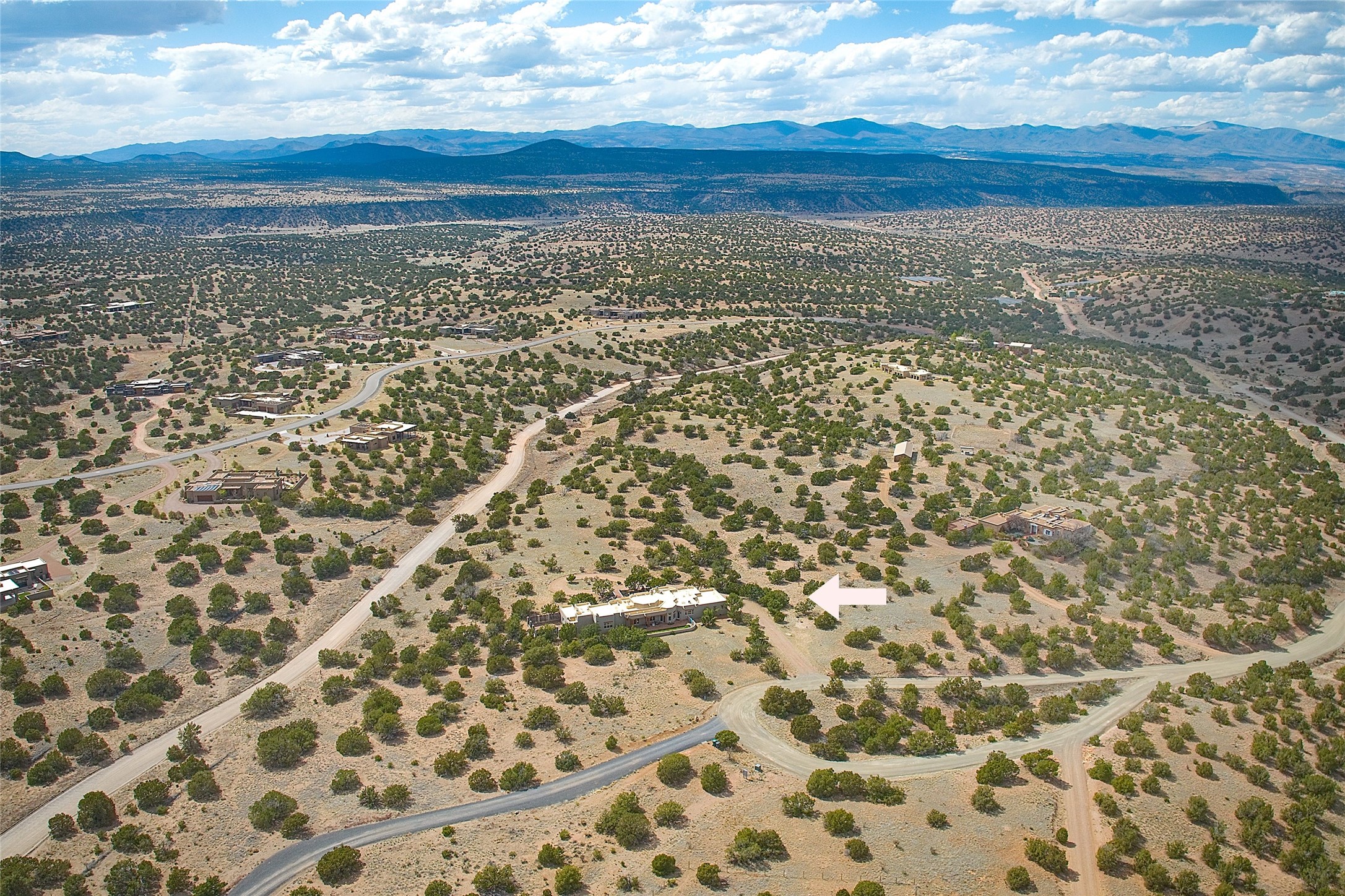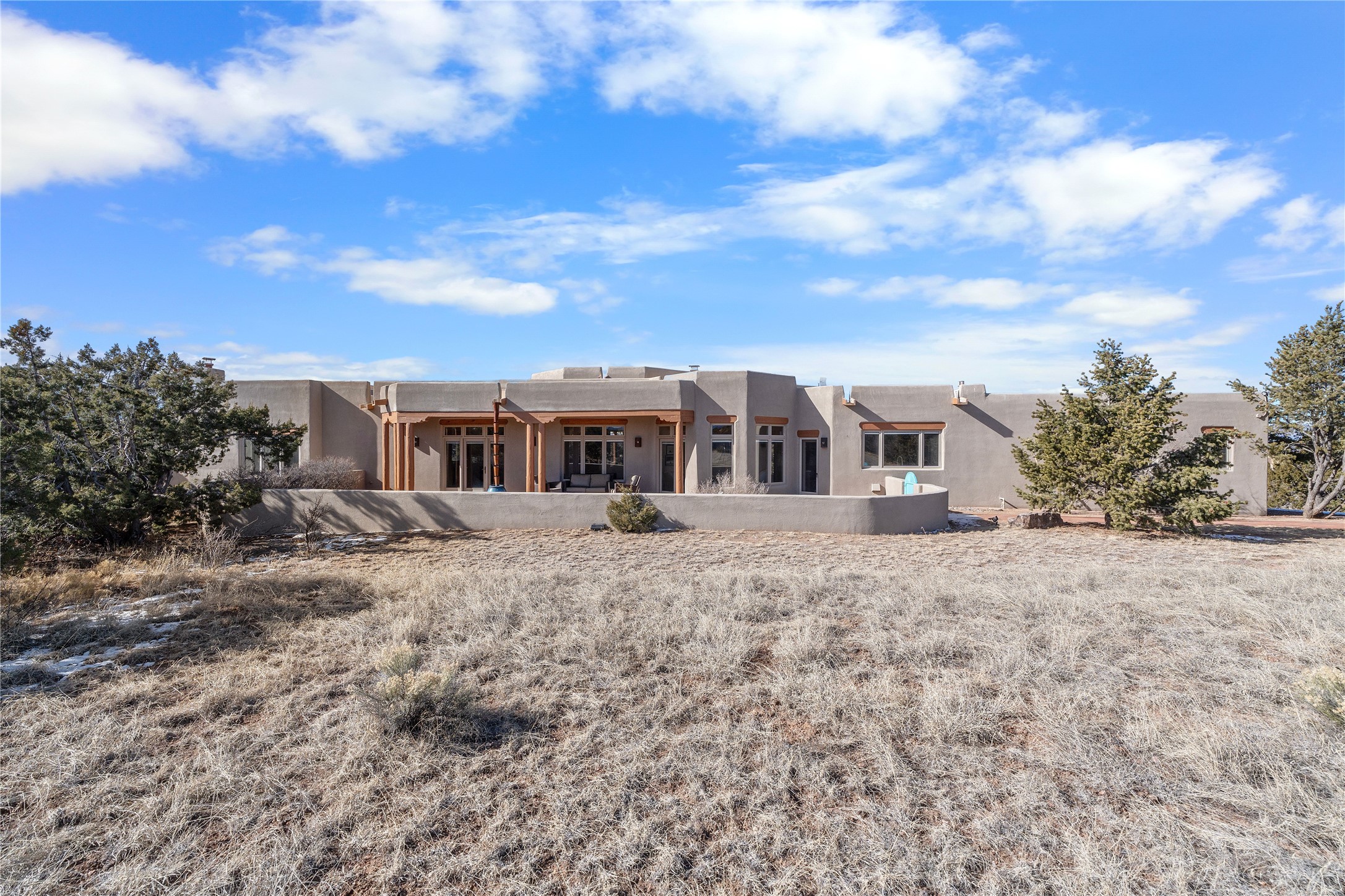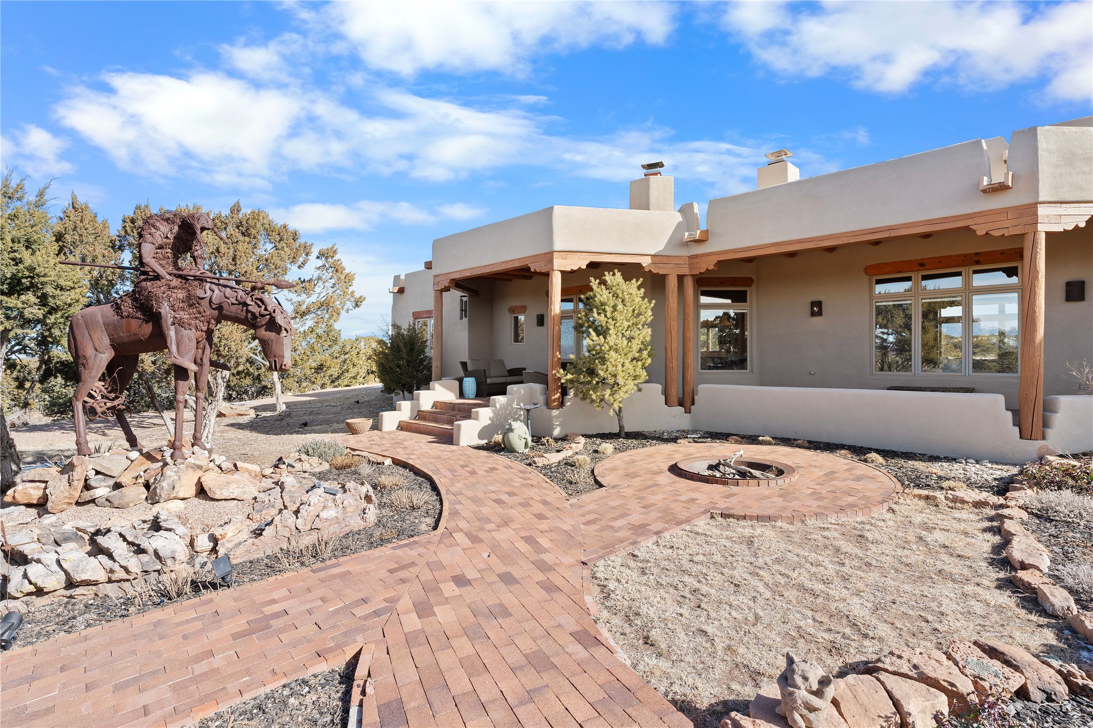Your Private Hideaway Awaits! Amazing architecture and forever mountain views from every room define thisextraordinary custom home in fabulous guard-gated La Tierra Nueva! Enjoy an "other world" feeling in this beautiful location, on 11.9 natural acres only a beautiful 15 minute drive to the Santa Fe Plaza! Featuring a thoughtful single level plan with resort like charm, beautiful architectural details, and spacious rooms with high ceilings, vigas, and abundant windows throughout. Thick plastered walls and a flowing floor plan create a feeling of warmth and belonging. Off the front entry, you'll enter a large and beautiful living room with 11' ceilings, a kiva fireplace, an adjacent glassed dining room, and plenty of space for artwork. A gallery hallway featuring all glass on one side links to the media room/den, with kiva fireplace, built-in seating, and direct access to the front portico. The large island kitchen opens to den, with an oversized island with seating. The luxurious owner's suite features direct access to a private patio, kiva fireplace, spa like bath, jetted soaking tub overlooking the mountains, and a spacious walk in closet. The other end of the home has a private guest suite with it's own views and bathroom. The home's outdoor spaces are equally impressive, with an east-facing portal offering sweeping views of the Sangre de Cristo Mountains, and a west-facing portal takes in the grandeur of the Jemez Mountains. A separately entered studio can easily be transformed into a fourth bedroom/casita. This subdivision is great for horses and their owners, ride on your lot or trot to nearby BLM land. The Club at Las Campanas is nearby. La Tierra Nueva offers a ranch like feel just a short drive to world class art, dining, symphony, opera, culture, museums, golf, tennis, pickleball, biking, skiing, and the clean air and sunny skies that make Santa Fe famous! Watch the property tour video; however, this magnificent property must be experienced in person.