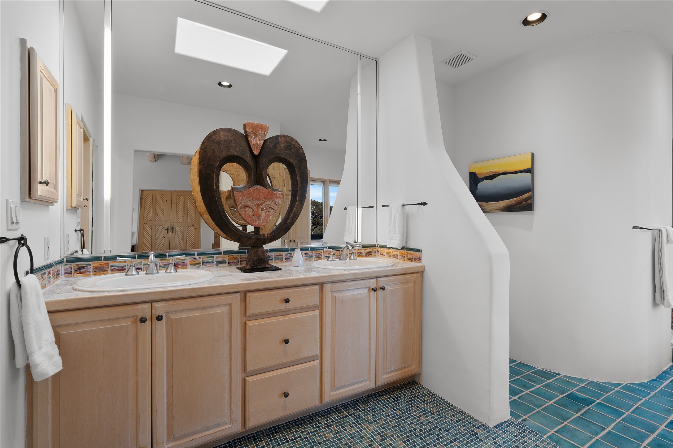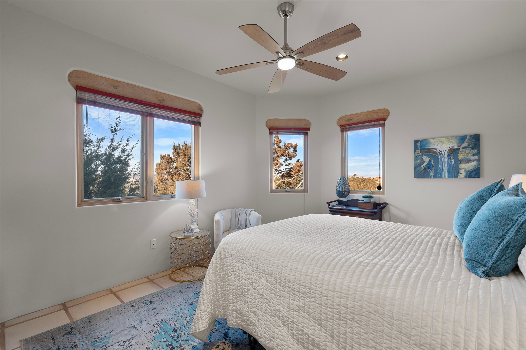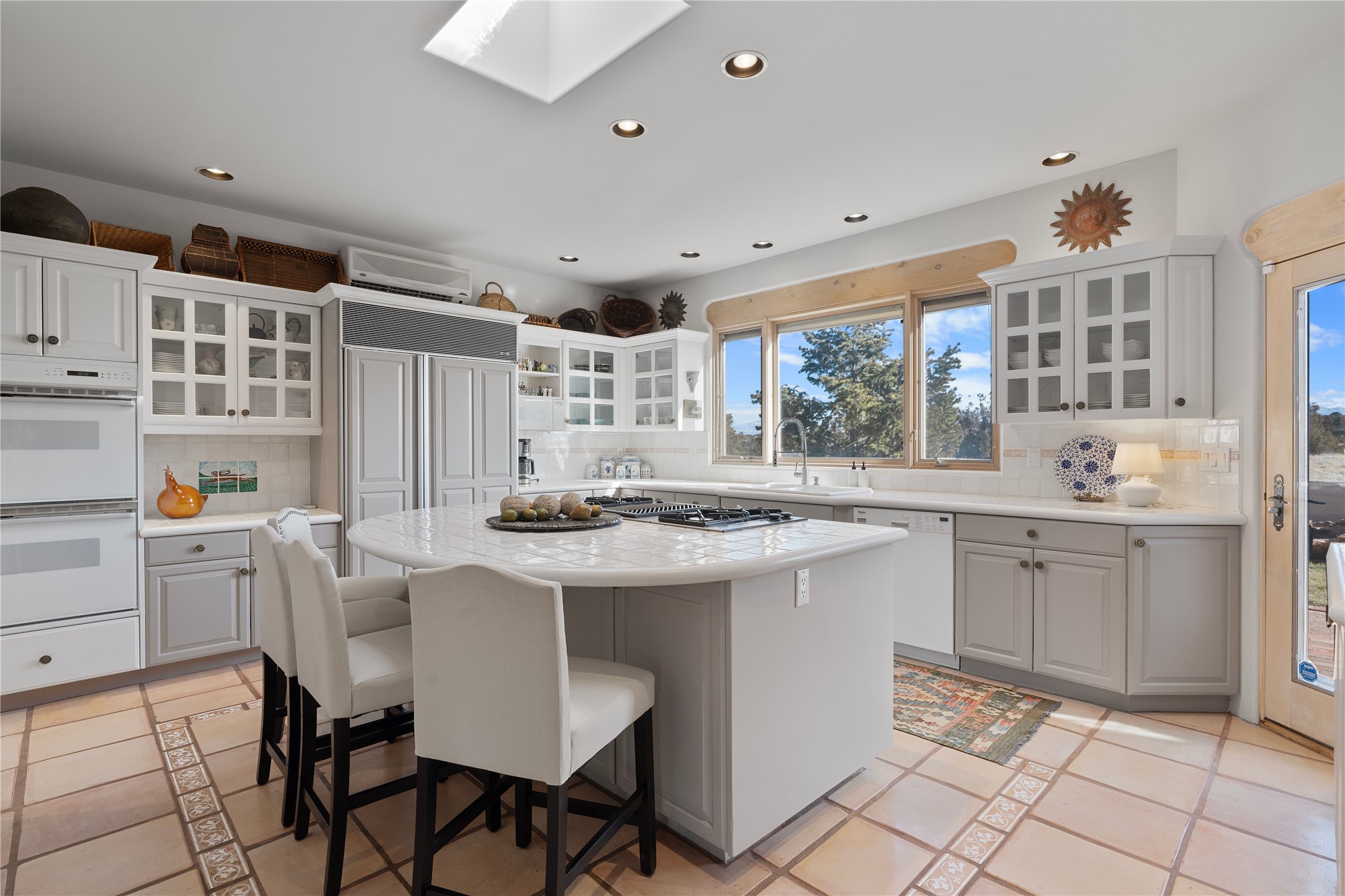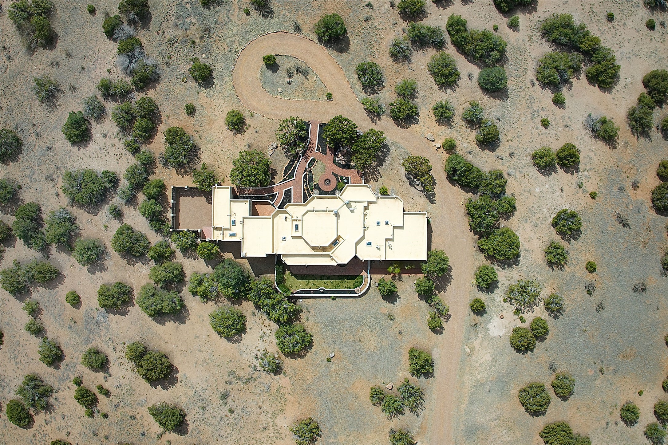 Your Private Hideaway Awaits! Amazing architecture and forever mountain views from every room define thisextraordinary custom home in fabulous guard-gated La Tierra Nueva! Enjoy an "other world" feeling in this beautiful location, on 11.9 natural acres only a beautiful 15 minute drive to the Santa Fe Plaza! Featuring a thoughtful single level plan with resort like charm, beautiful architectural details, and spacious rooms with high ceilings, vigas, and abundant windows throughout. Thick plastered walls and a flowing floor plan create a feeling of warmth and belonging. Off the front entry, you'll enter a large and beautiful living room with 11' ceilings, a kiva fireplace, an adjacent glassed dining room, and plenty of space for artwork. A gallery hallway featuring all glass on one side links to the media room/den, with kiva fireplace, built-in seating, and direct access to the front portico. The large island kitchen opens to den, with an oversized island with seating. The luxurious owner's suite features direct access to a private patio, kiva fireplace, spa like bath, jetted soaking tub overlooking the mountains, and a spacious walk in closet. The other end of the home has a private guest suite with it's own views and bathroom. The home's outdoor spaces are equally impressive, with an east-facing portal offering sweeping views of the Sangre de Cristo Mountains, and a west-facing portal takes in the grandeur of the Jemez Mountains. A separately entered studio can easily be transformed into a fourth bedroom/casita. This subdivision is great for horses and their owners, ride on your lot or trot to nearby BLM land. The Club at Las Campanas is nearby. La Tierra Nueva offers a ranch like feel just a short drive to world class art, dining, symphony, opera, culture, museums, golf, tennis, pickleball, biking, skiing, and the clean air and sunny skies that make Santa Fe famous! Watch the property tour video; however, this magnificent property must be experienced in person.