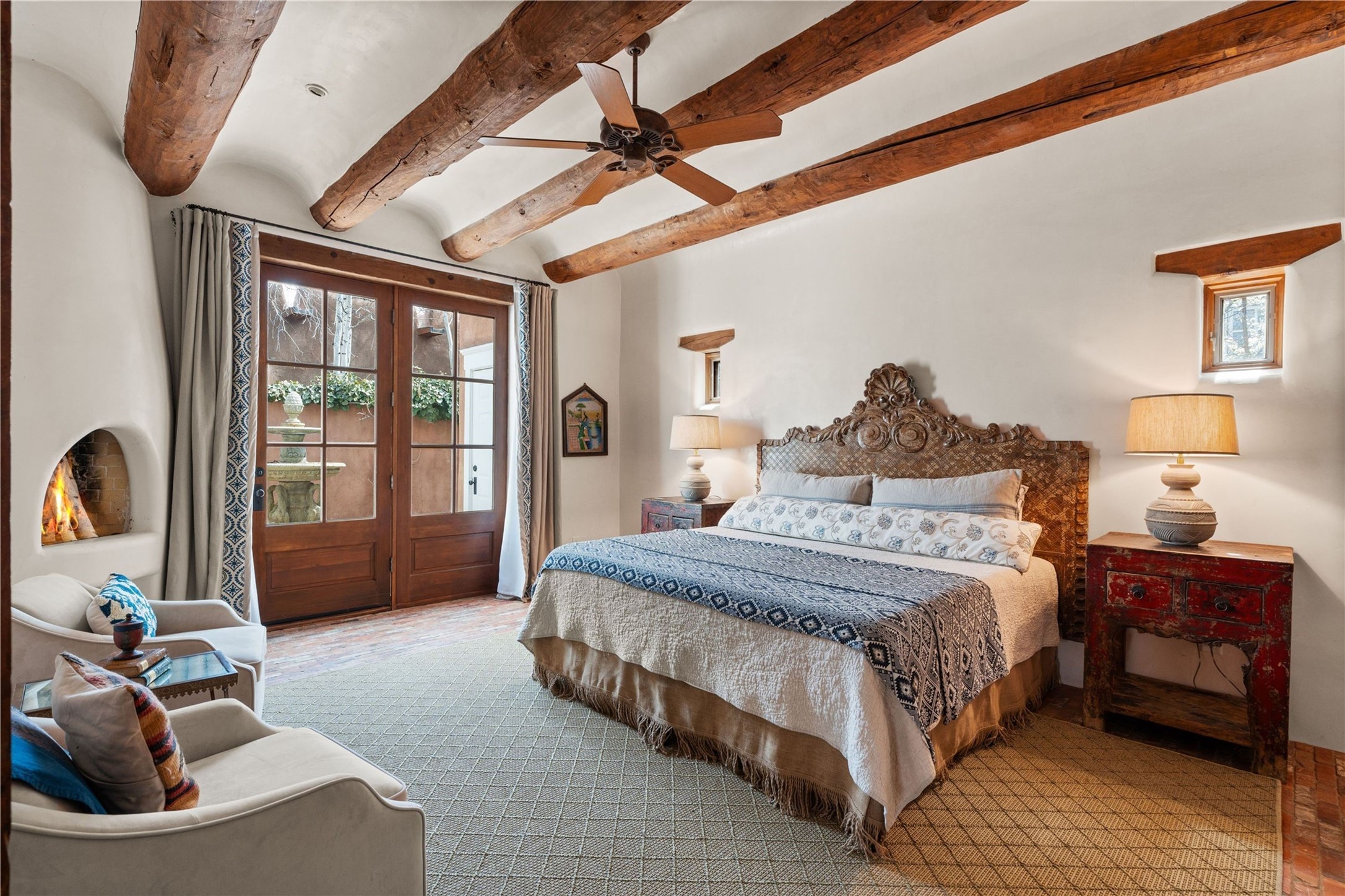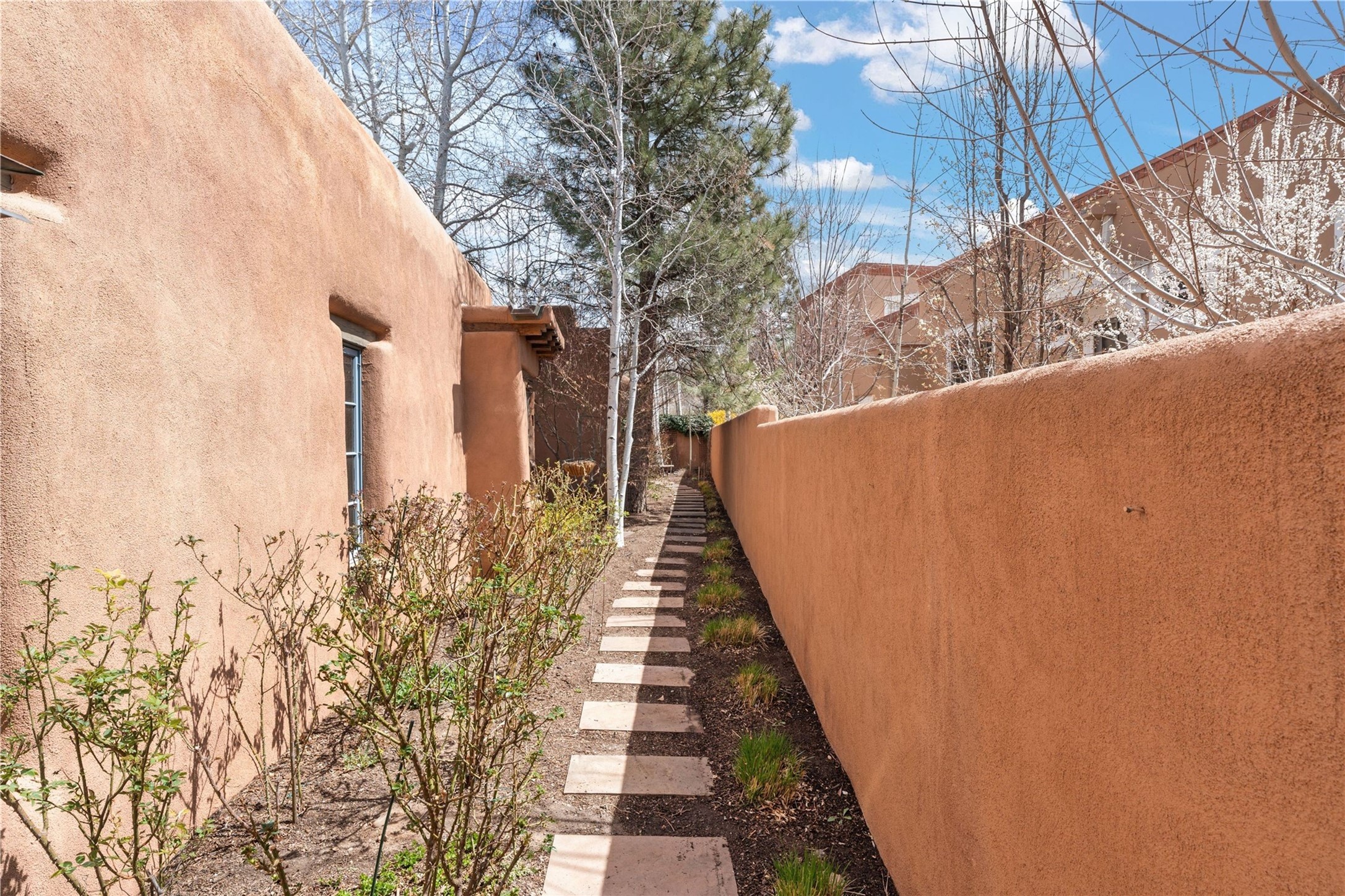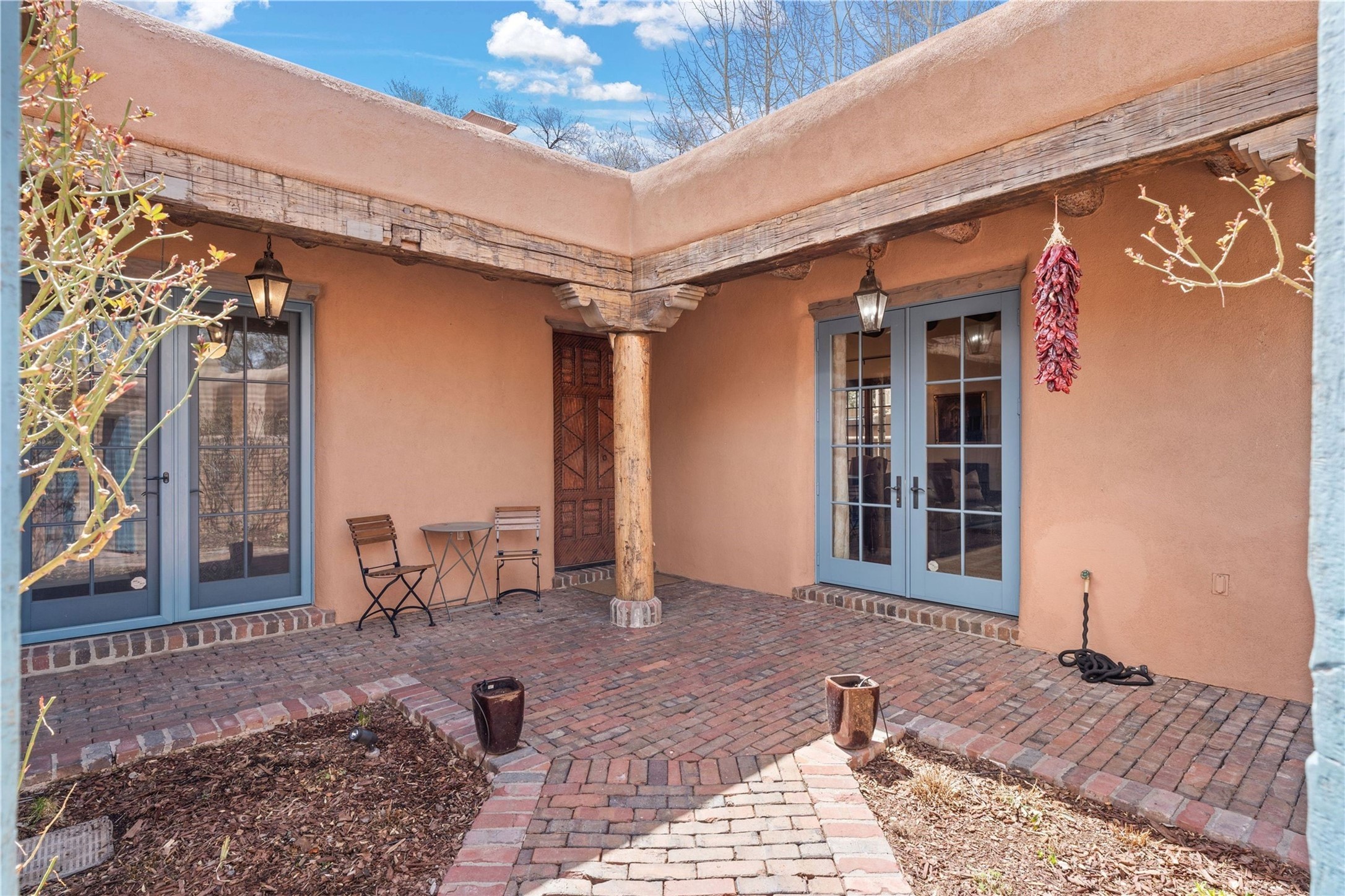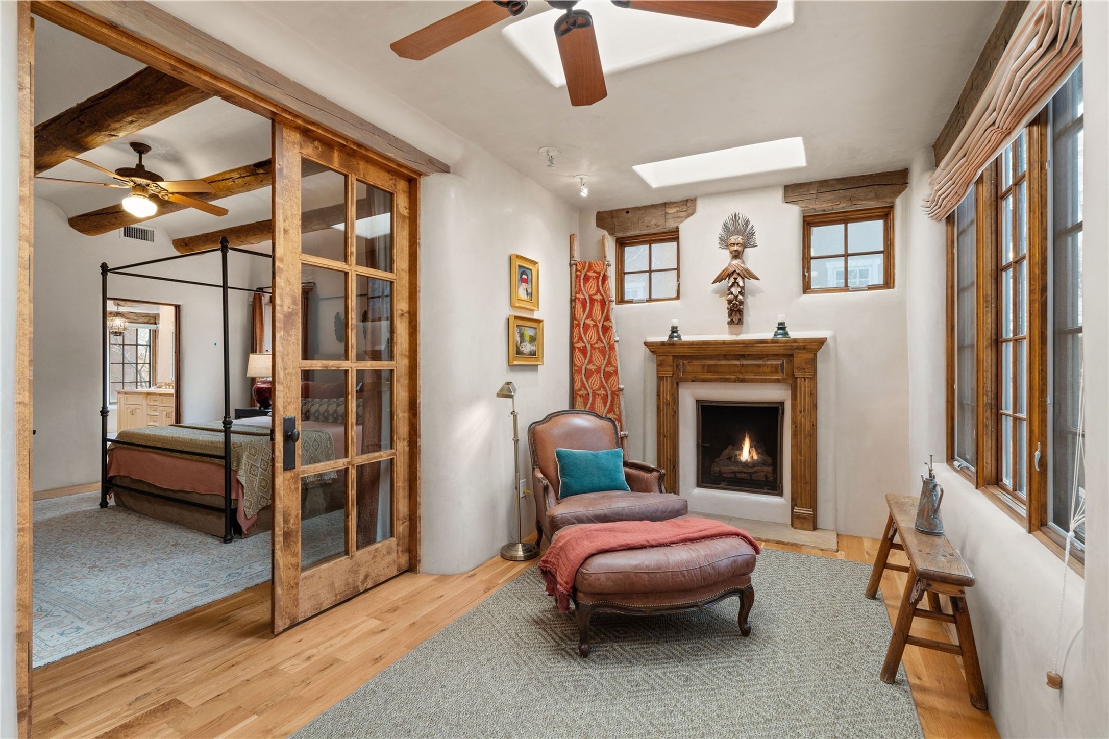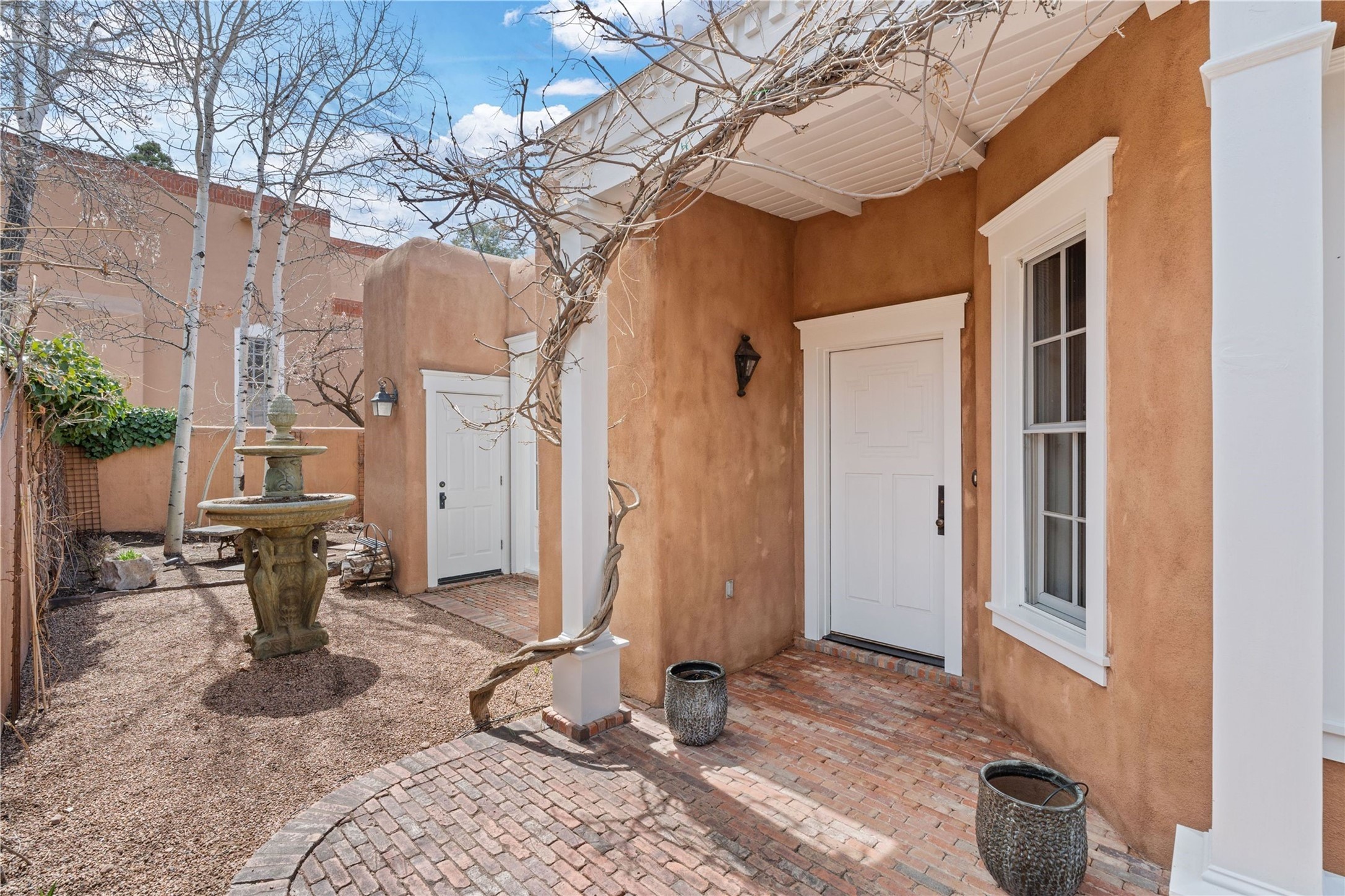 A rare opportunity in the heart of Santa Fe's Historic Eastside, this adobe home and casita-- within the six-unit San Antonio Compound built by renowned builder Jay Parks--offers timeless craftsmanship and thoughtful design in the form of a mini compound. Situated on the wide and peaceful San Antonio Street off of Acequia Madre, the offering comprises two separately deeded condominiums sharing a common courtyard, which provides the owner with a three-bedroom main house and an impeccably charming one-bedroom casita. The main house features white oak flooring, antique wooden beams and doors, custom plastered walls, and five fireplaces, typifying the warmth of classic Santa Fe architecture. A stately living room flows into a kitchen with a copper island and granite countertops. There are two bedroom suites plus a third room (served by a hall bathroom) that either works as another guest bedroom or perfect office. Aspen-lined stone pathways within a walled courtyard connect the home to the guest house, passing by a private hot tub that sits between the two homes. The casita is appointed with brick flooring, wood burning fireplace, a freshly updated kitchen, a decadent bedroom suite and two off-street parking spaces - all ensuring your guests will never want to leave. A two-car garage and additional parking are a rare asset in this sought-after downtown location. Meticulously maintained and thoughtfully designed, this is an exceptional offering just moments from Santa Fe's best dining, galleries on Canyon Road, and the Plaza.