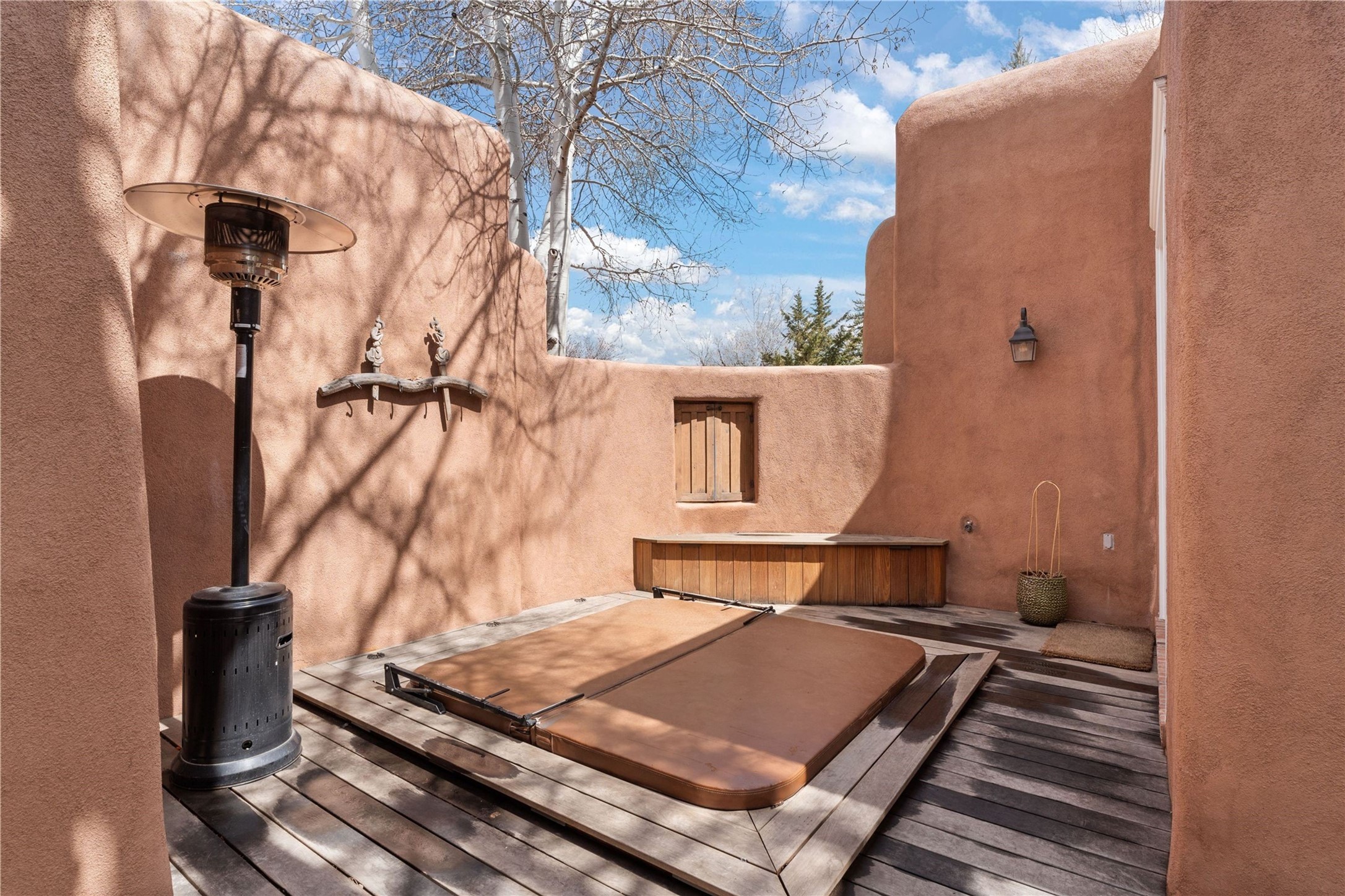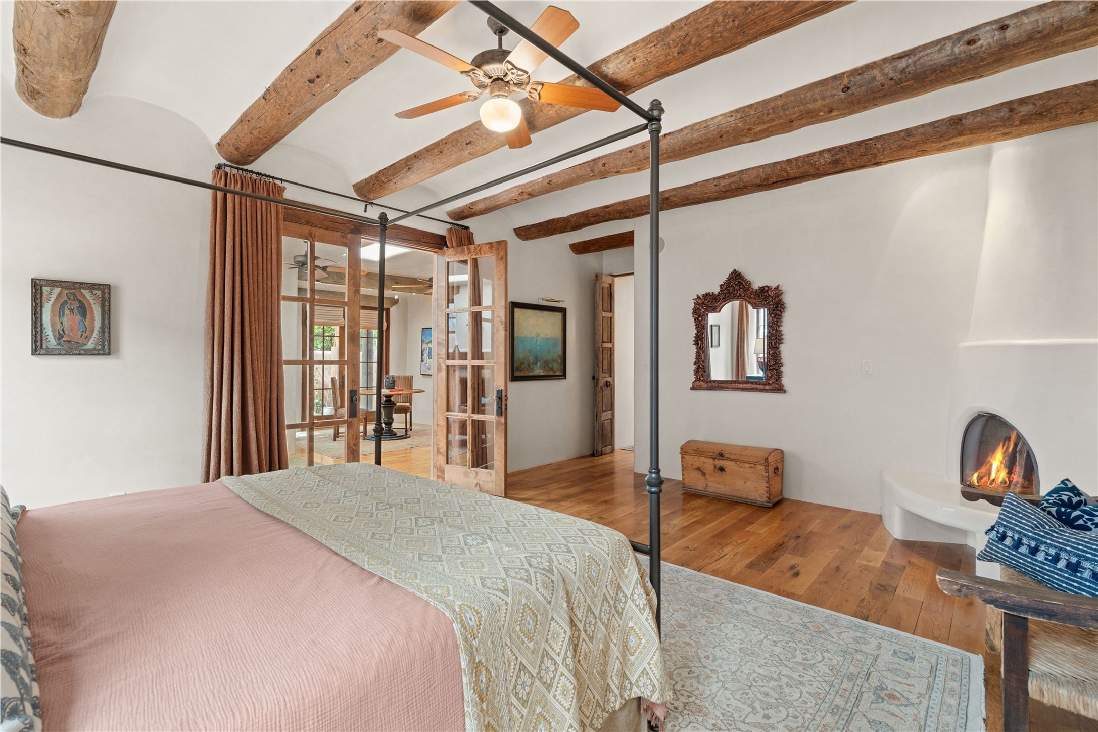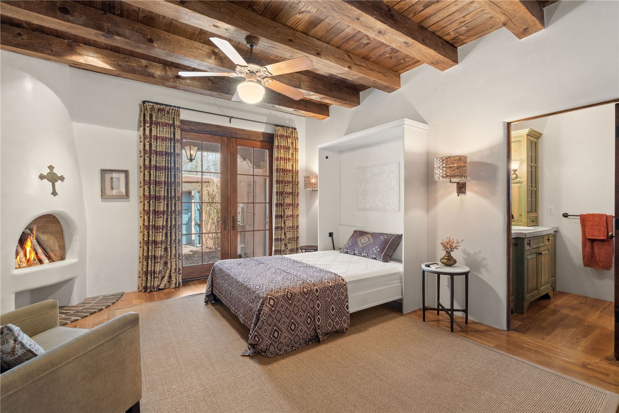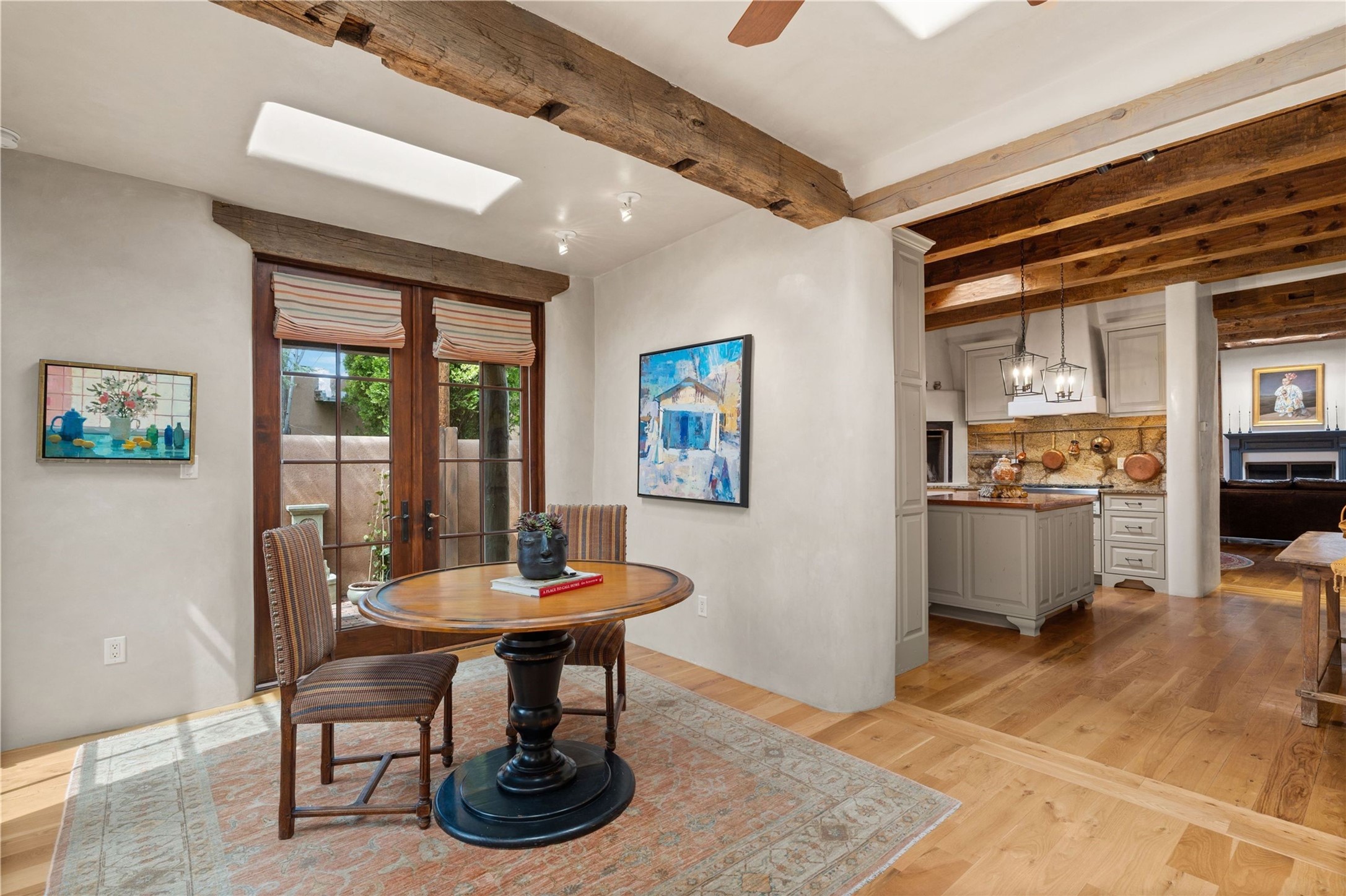 A rare opportunity in the heart of Santa Fe's Historic Eastside, this adobe home and casita-- within the six-unit San Antonio Compound built by renowned builder Jay Parks--offers timeless craftsmanship and thoughtful design in the form of a mini compound. Situated on the wide and peaceful San Antonio Street off of Acequia Madre, the offering comprises two separately deeded condominiums sharing a common courtyard, which provides the owner with a three-bedroom main house and an impeccably charming one-bedroom casita. The main house features white oak flooring, antique wooden beams and doors, custom plastered walls, and five fireplaces, typifying the warmth of classic Santa Fe architecture. A stately living room flows into a kitchen with a copper island and granite countertops. There are two bedroom suites plus a third room (served by a hall bathroom) that either works as another guest bedroom or perfect office. Aspen-lined stone pathways within a walled courtyard connect the home to the guest house, passing by a private hot tub that sits between the two homes. The casita is appointed with brick flooring, wood burning fireplace, a freshly updated kitchen, a decadent bedroom suite and two off-street parking spaces - all ensuring your guests will never want to leave. A two-car garage and additional parking are a rare asset in this sought-after downtown location. Meticulously maintained and thoughtfully designed, this is an exceptional offering just moments from Santa Fe's best dining, galleries on Canyon Road, and the Plaza.