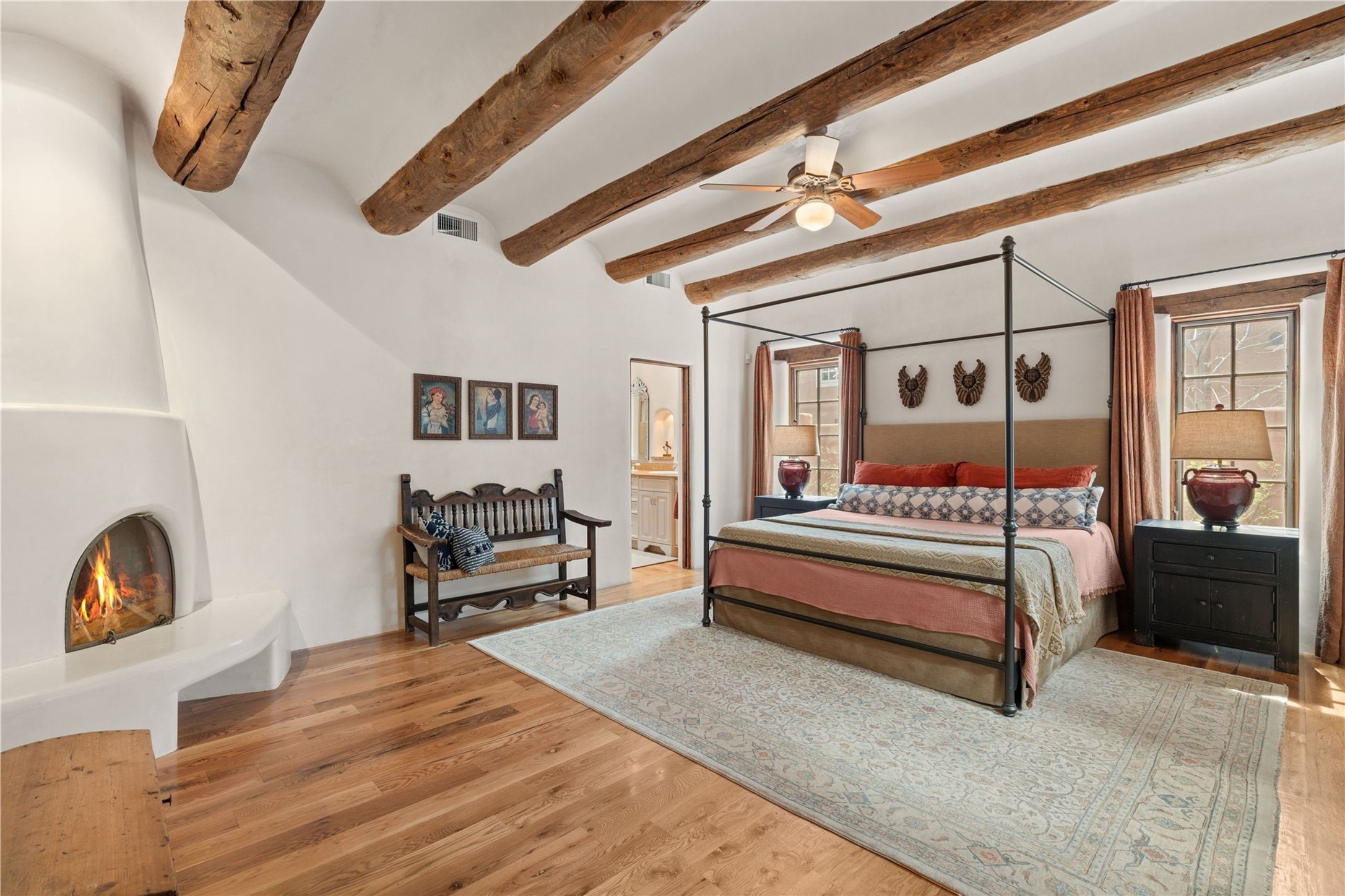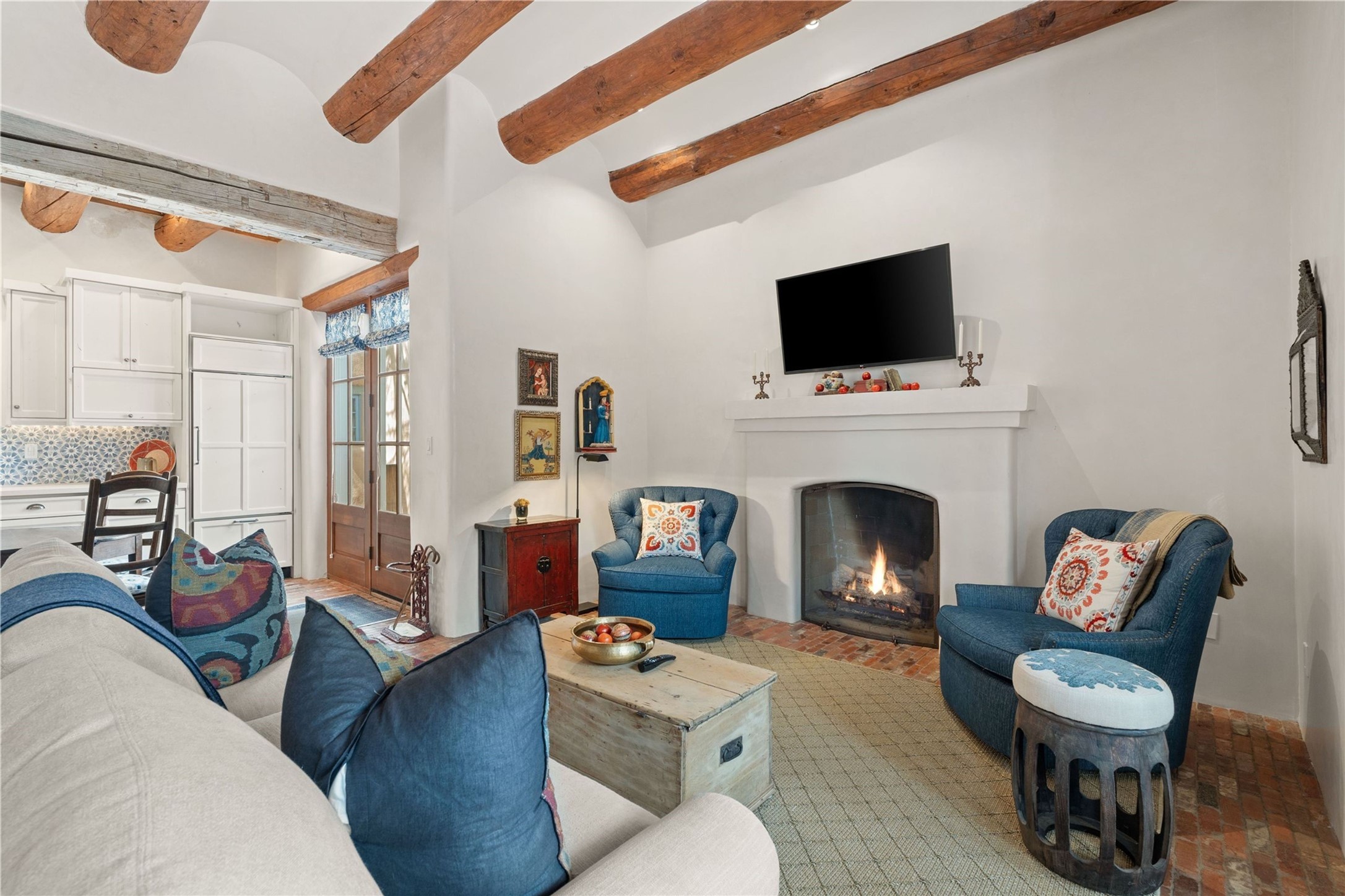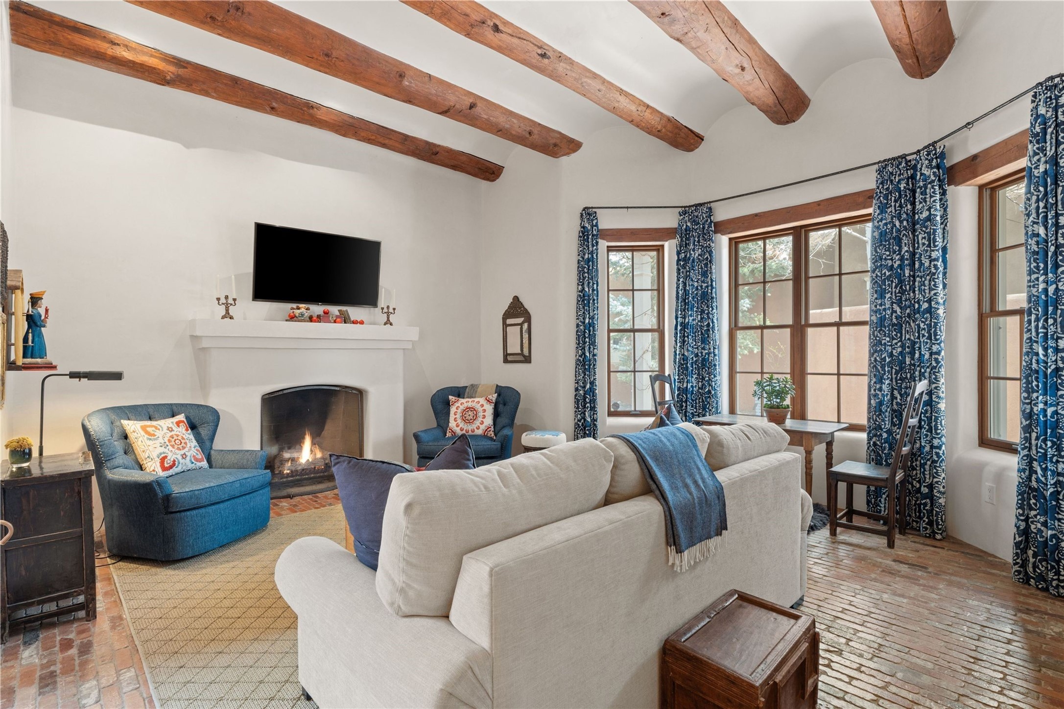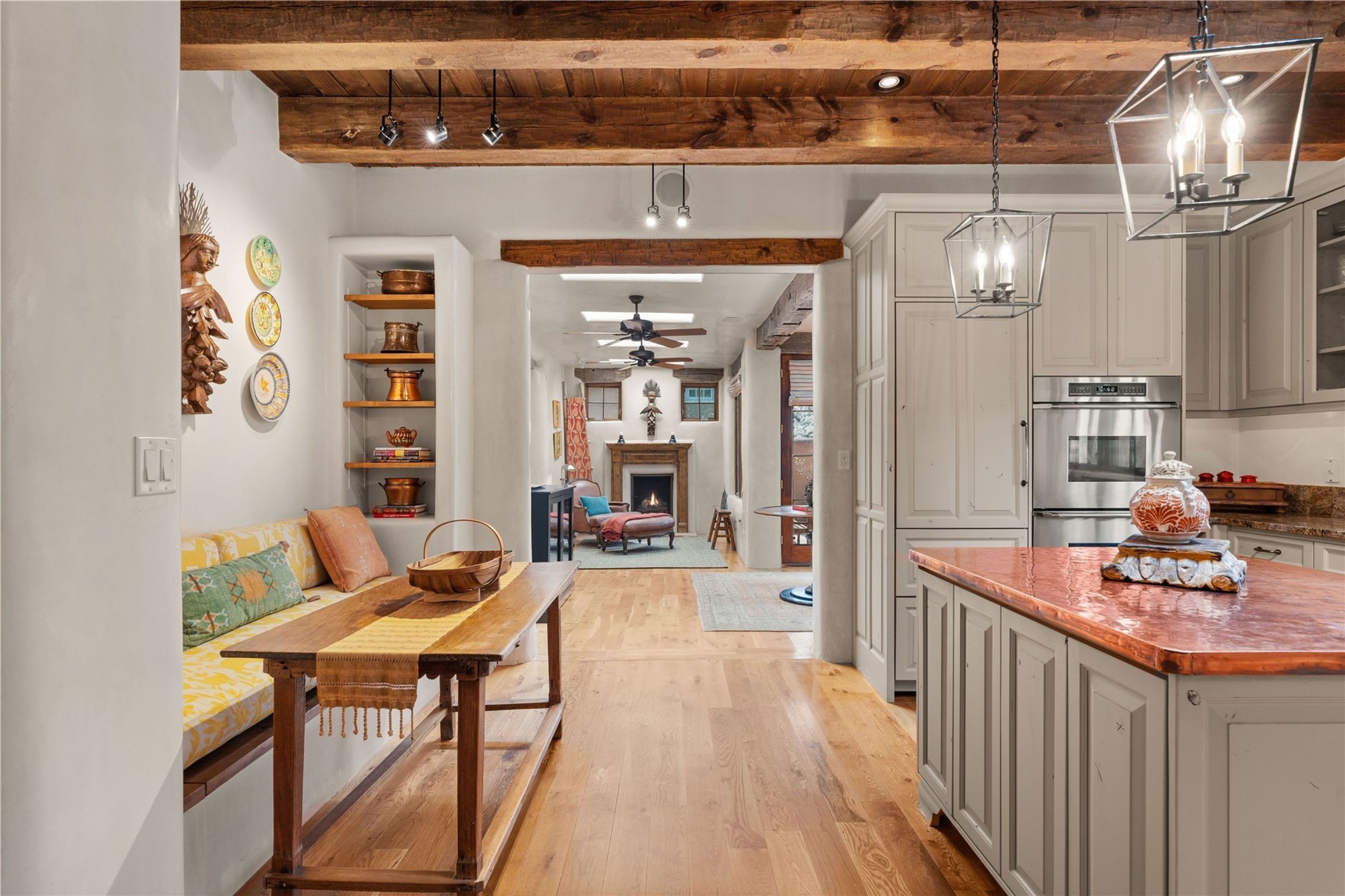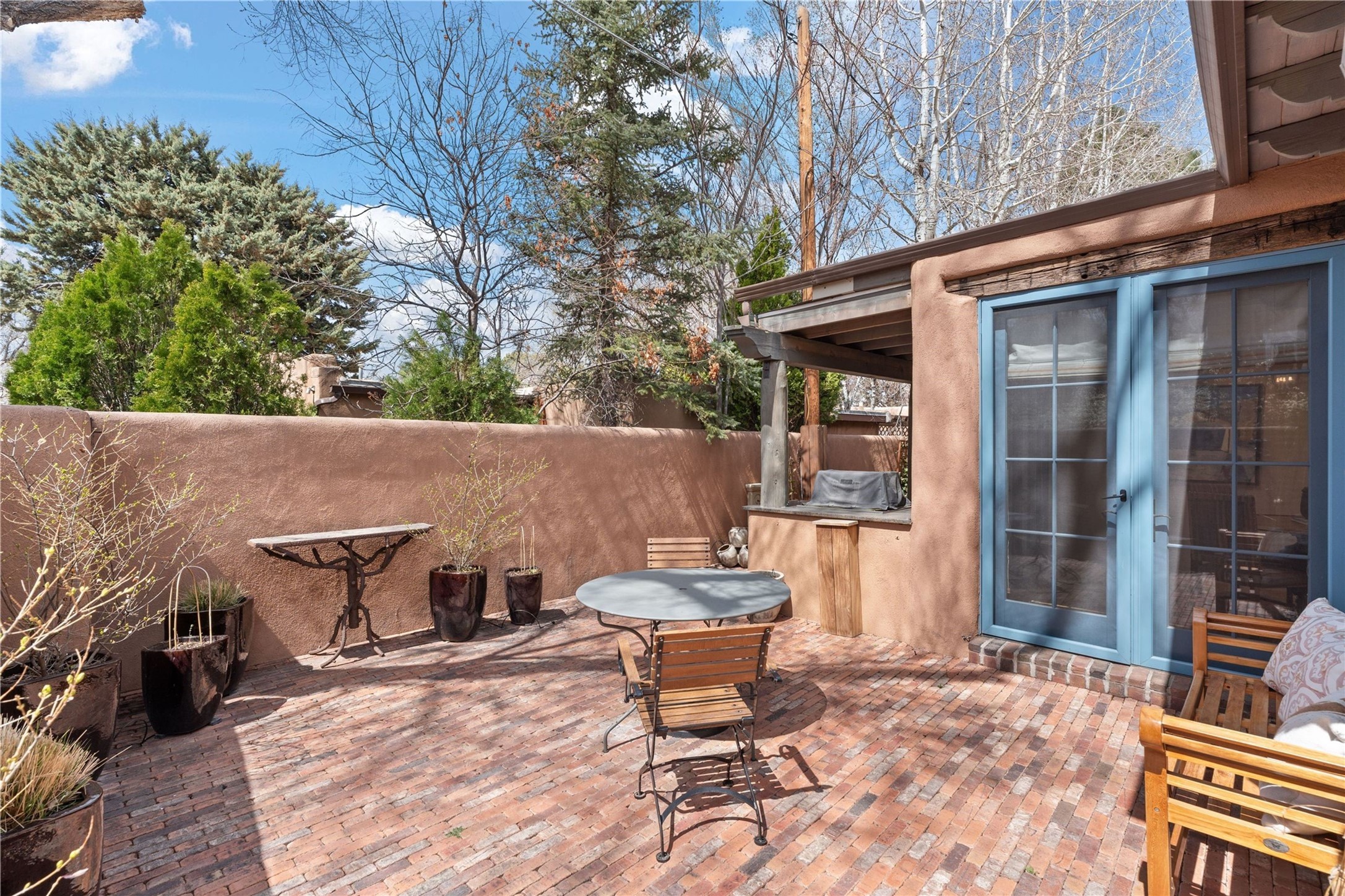 A rare opportunity in the heart of Santa Fe's Historic Eastside, this adobe home and casita-- within the six-unit San Antonio Compound built by renowned builder Jay Parks--offers timeless craftsmanship and thoughtful design in the form of a mini compound. Situated on the wide and peaceful San Antonio Street off of Acequia Madre, the offering comprises two separately deeded condominiums sharing a common courtyard, which provides the owner with a three-bedroom main house and an impeccably charming one-bedroom casita. The main house features white oak flooring, antique wooden beams and doors, custom plastered walls, and five fireplaces, typifying the warmth of classic Santa Fe architecture. A stately living room flows into a kitchen with a copper island and granite countertops. There are two bedroom suites plus a third room (served by a hall bathroom) that either works as another guest bedroom or perfect office. Aspen-lined stone pathways within a walled courtyard connect the home to the guest house, passing by a private hot tub that sits between the two homes. The casita is appointed with brick flooring, wood burning fireplace, a freshly updated kitchen, a decadent bedroom suite and two off-street parking spaces - all ensuring your guests will never want to leave. A two-car garage and additional parking are a rare asset in this sought-after downtown location. Meticulously maintained and thoughtfully designed, this is an exceptional offering just moments from Santa Fe's best dining, galleries on Canyon Road, and the Plaza.