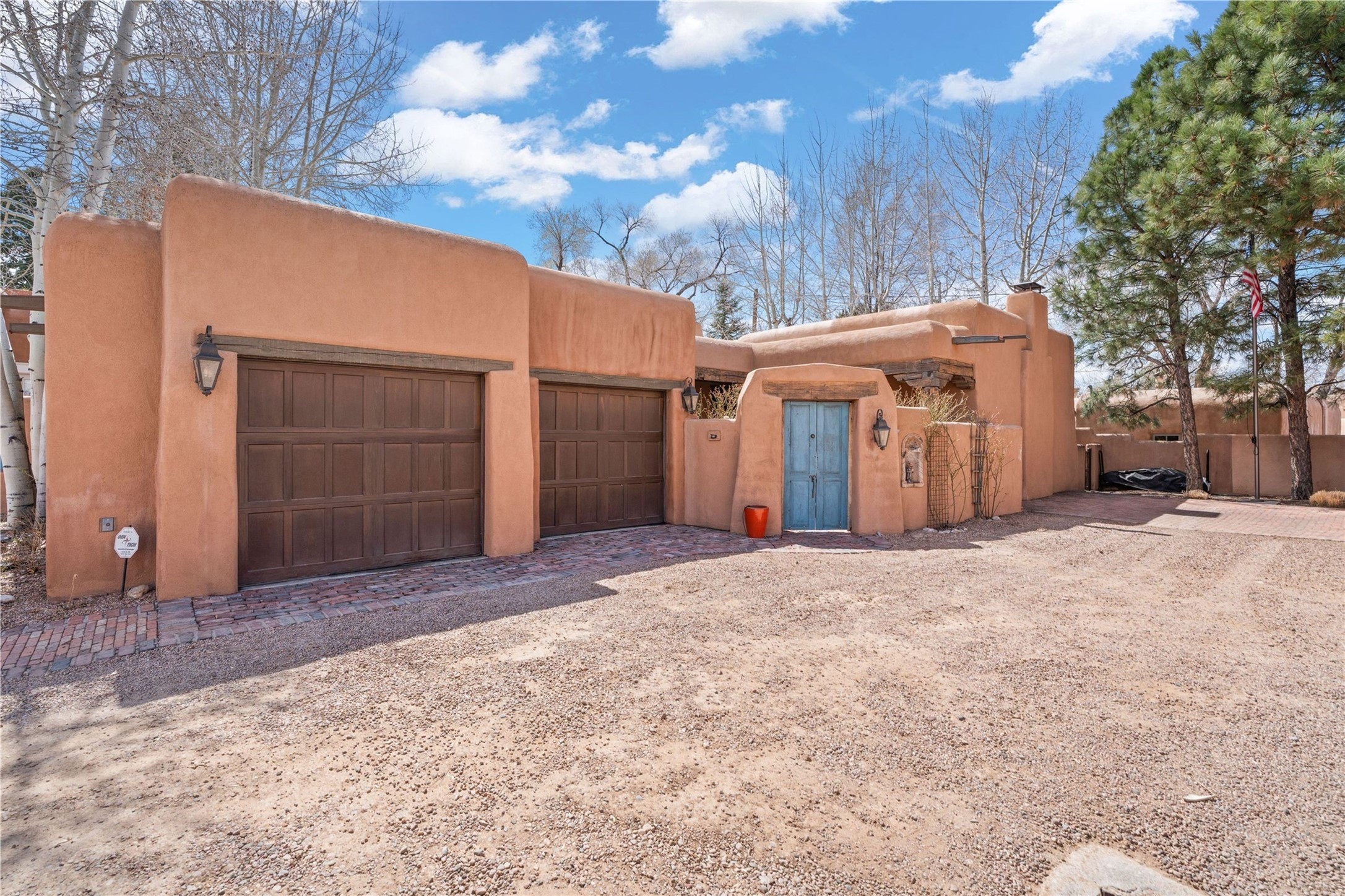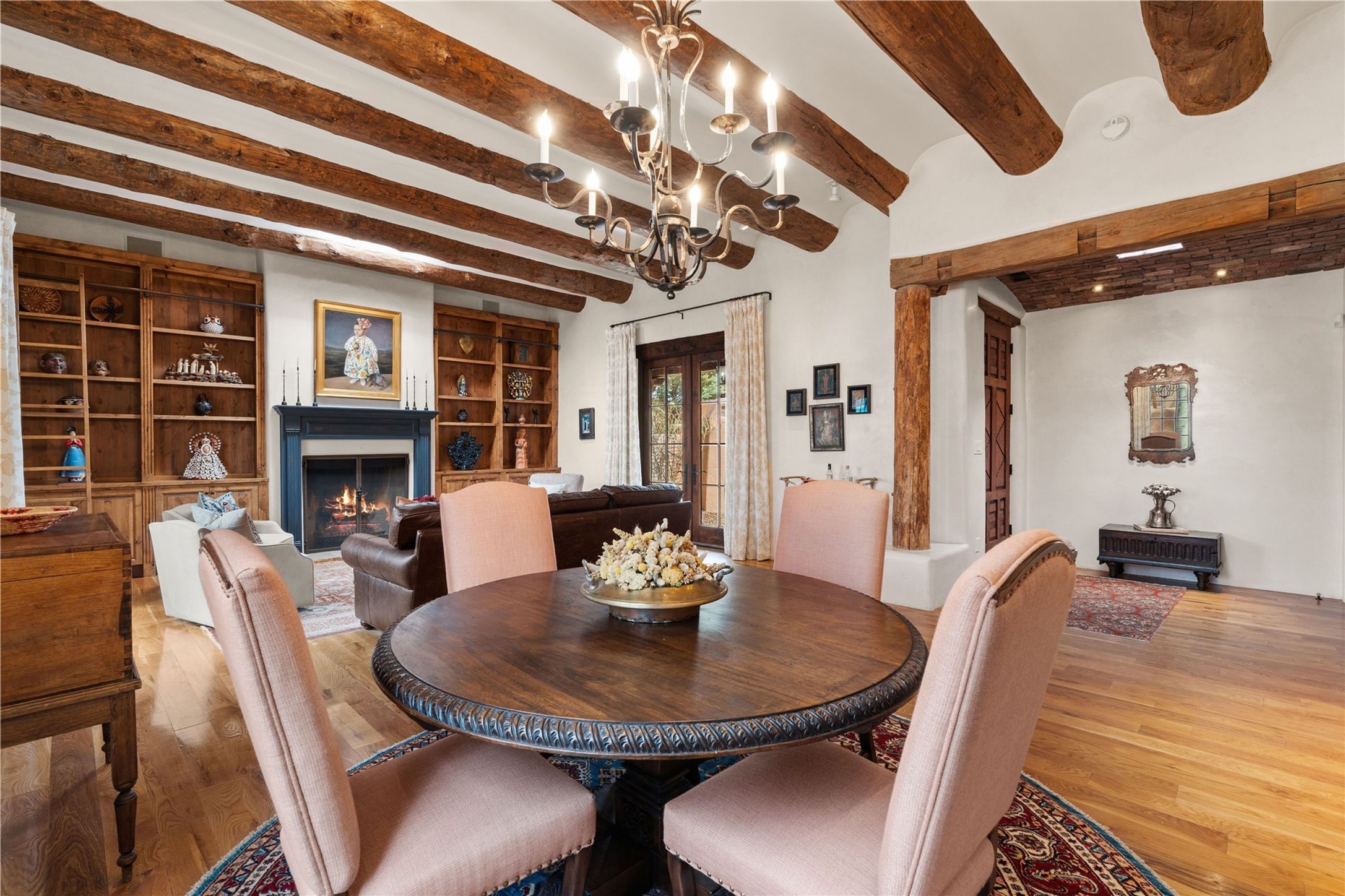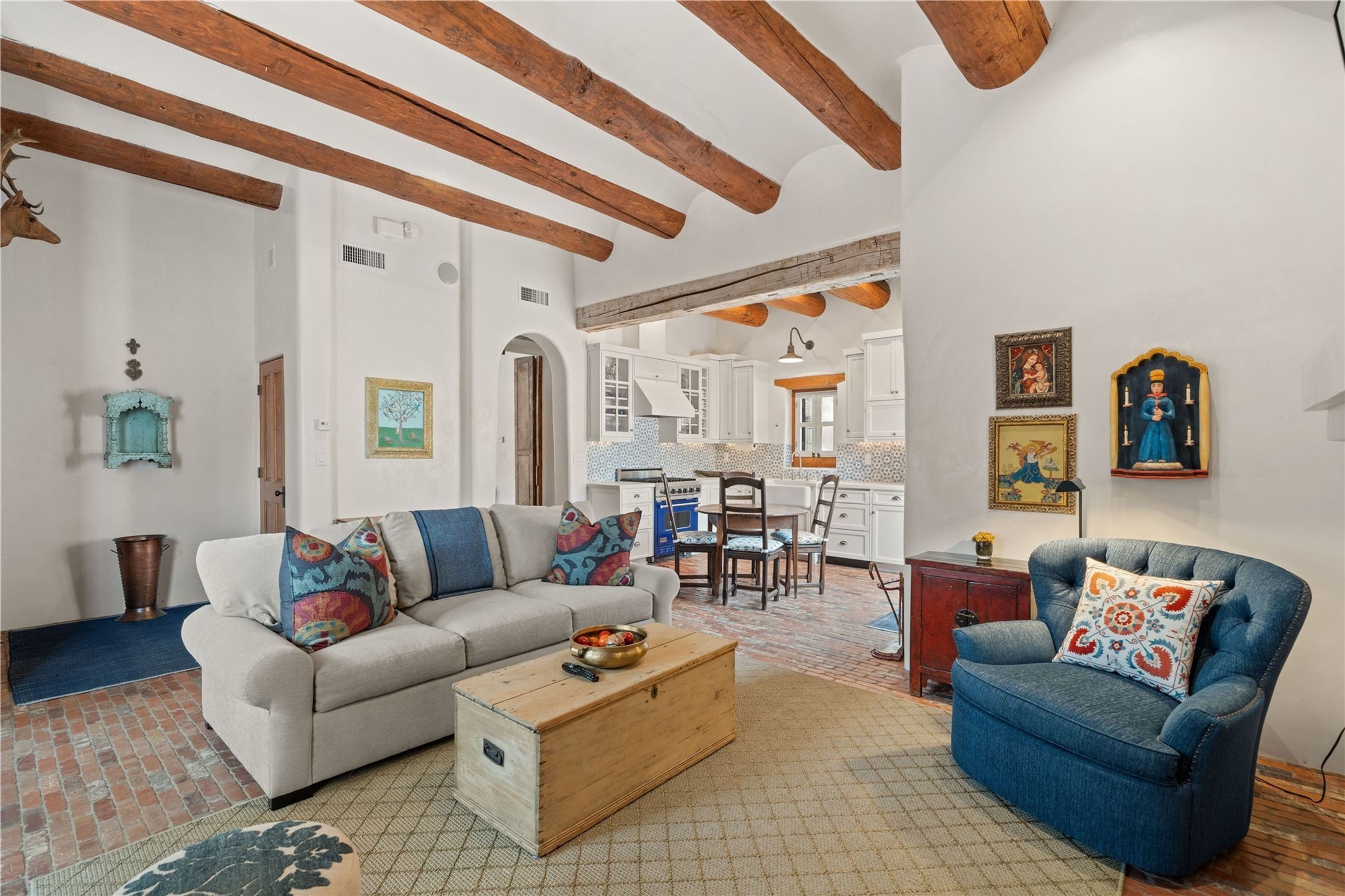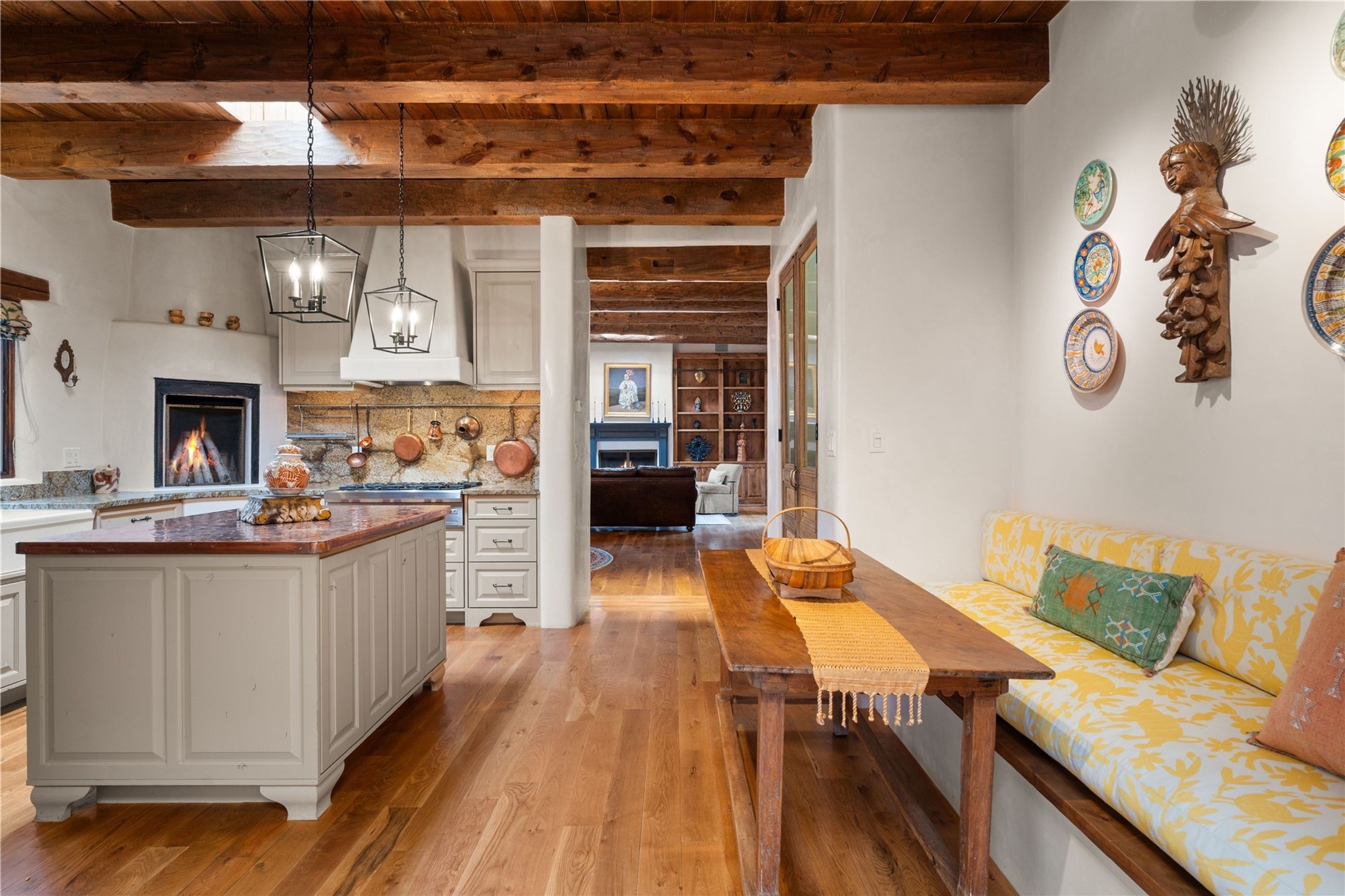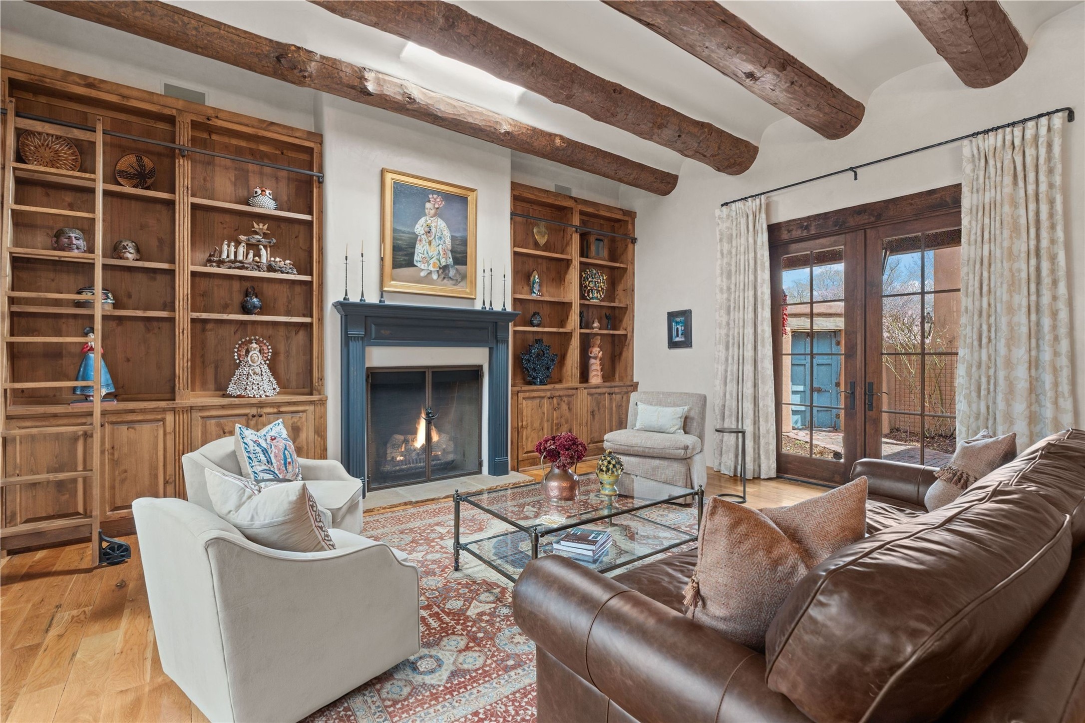 A rare opportunity in the heart of Santa Fe's Historic Eastside, this adobe home and casita-- within the six-unit San Antonio Compound built by renowned builder Jay Parks--offers timeless craftsmanship and thoughtful design in the form of a mini compound. Situated on the wide and peaceful San Antonio Street off of Acequia Madre, the offering comprises two separately deeded condominiums sharing a common courtyard, which provides the owner with a three-bedroom main house and an impeccably charming one-bedroom casita. The main house features white oak flooring, antique wooden beams and doors, custom plastered walls, and five fireplaces, typifying the warmth of classic Santa Fe architecture. A stately living room flows into a kitchen with a copper island and granite countertops. There are two bedroom suites plus a third room (served by a hall bathroom) that either works as another guest bedroom or perfect office. Aspen-lined stone pathways within a walled courtyard connect the home to the guest house, passing by a private hot tub that sits between the two homes. The casita is appointed with brick flooring, wood burning fireplace, a freshly updated kitchen, a decadent bedroom suite and two off-street parking spaces - all ensuring your guests will never want to leave. A two-car garage and additional parking are a rare asset in this sought-after downtown location. Meticulously maintained and thoughtfully designed, this is an exceptional offering just moments from Santa Fe's best dining, galleries on Canyon Road, and the Plaza.