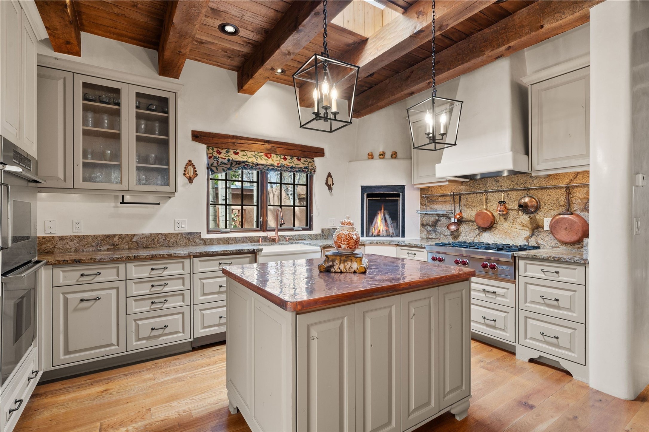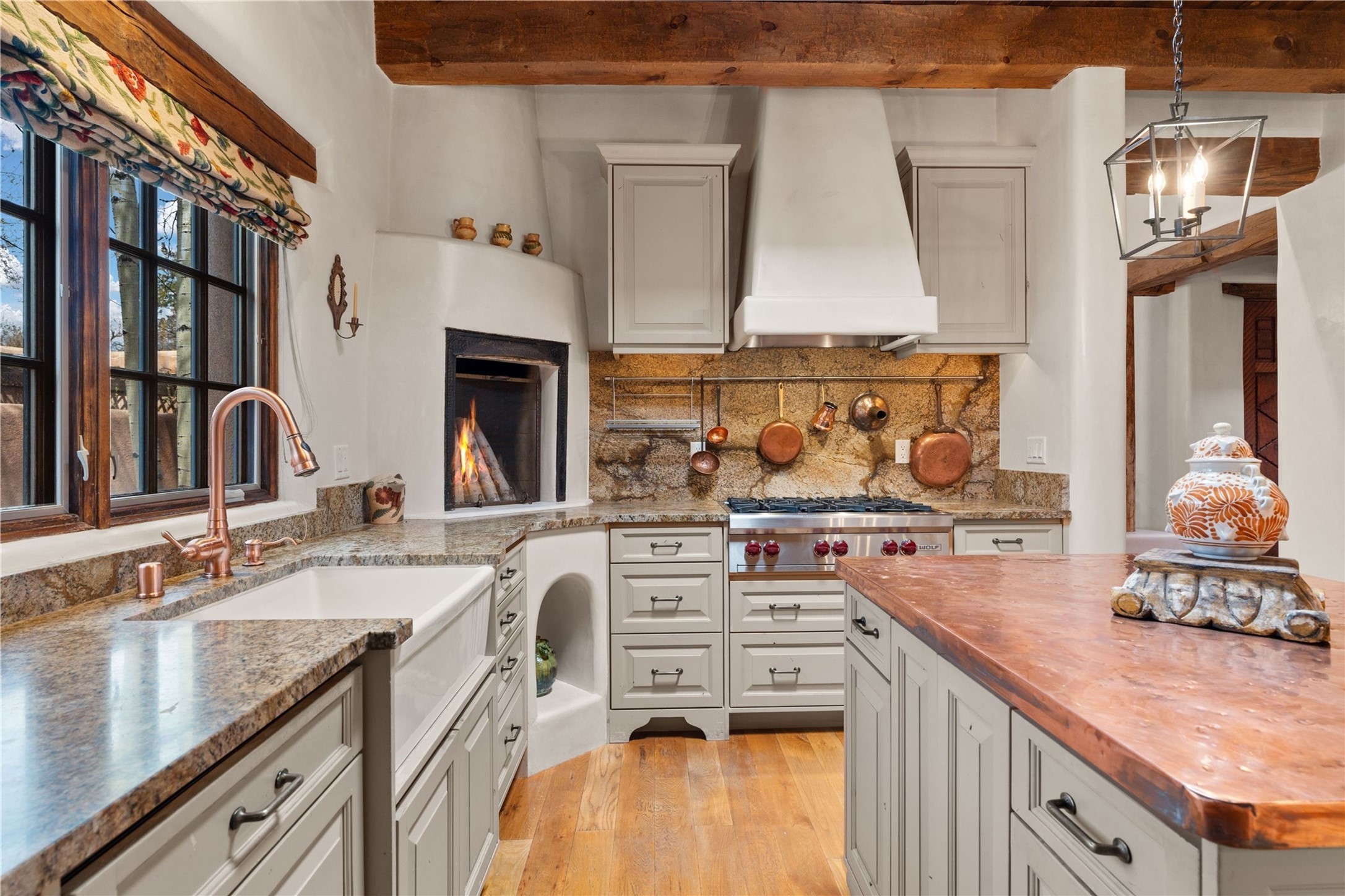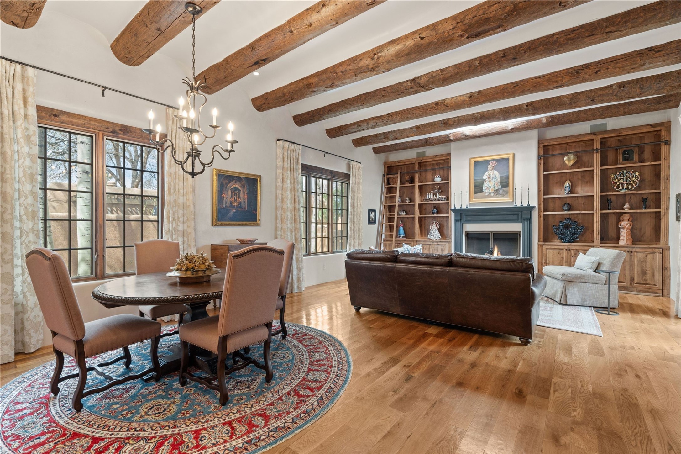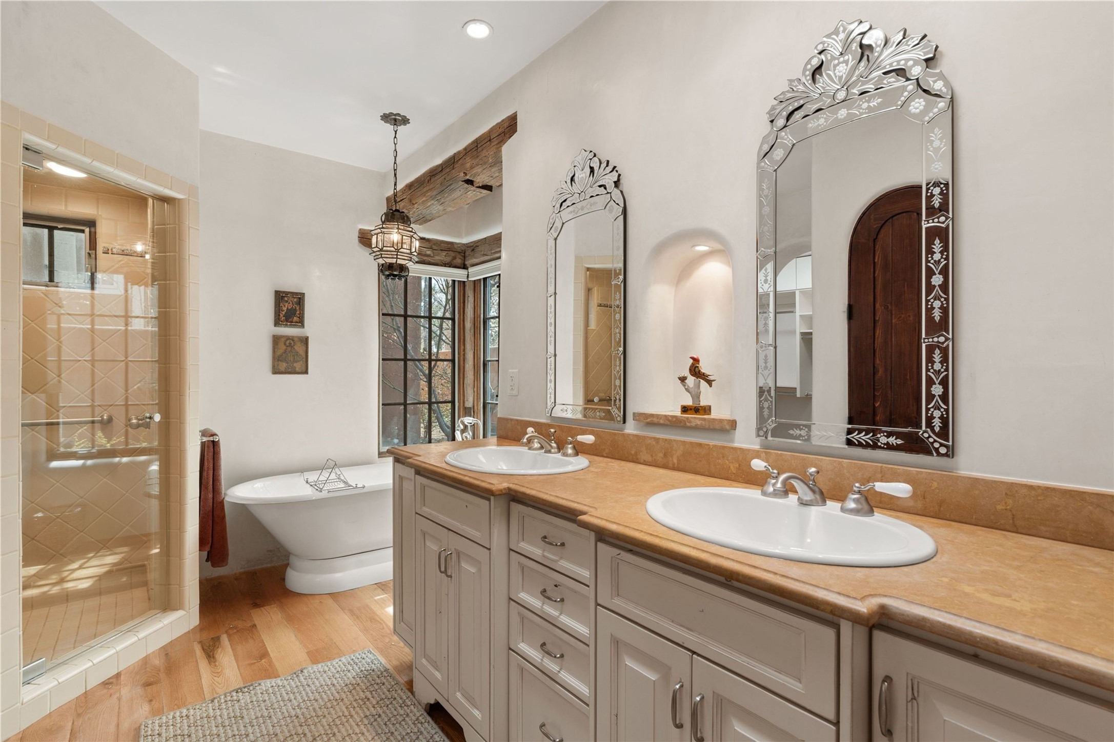 A rare opportunity in the heart of Santa Fe's Historic Eastside, this adobe home and casita-- within the six-unit San Antonio Compound built by renowned builder Jay Parks--offers timeless craftsmanship and thoughtful design in the form of a mini compound. Situated on the wide and peaceful San Antonio Street off of Acequia Madre, the offering comprises two separately deeded condominiums sharing a common courtyard, which provides the owner with a three-bedroom main house and an impeccably charming one-bedroom casita. The main house features white oak flooring, antique wooden beams and doors, custom plastered walls, and five fireplaces, typifying the warmth of classic Santa Fe architecture. A stately living room flows into a kitchen with a copper island and granite countertops. There are two bedroom suites plus a third room (served by a hall bathroom) that either works as another guest bedroom or perfect office. Aspen-lined stone pathways within a walled courtyard connect the home to the guest house, passing by a private hot tub that sits between the two homes. The casita is appointed with brick flooring, wood burning fireplace, a freshly updated kitchen, a decadent bedroom suite and two off-street parking spaces - all ensuring your guests will never want to leave. A two-car garage and additional parking are a rare asset in this sought-after downtown location. Meticulously maintained and thoughtfully designed, this is an exceptional offering just moments from Santa Fe's best dining, galleries on Canyon Road, and the Plaza.