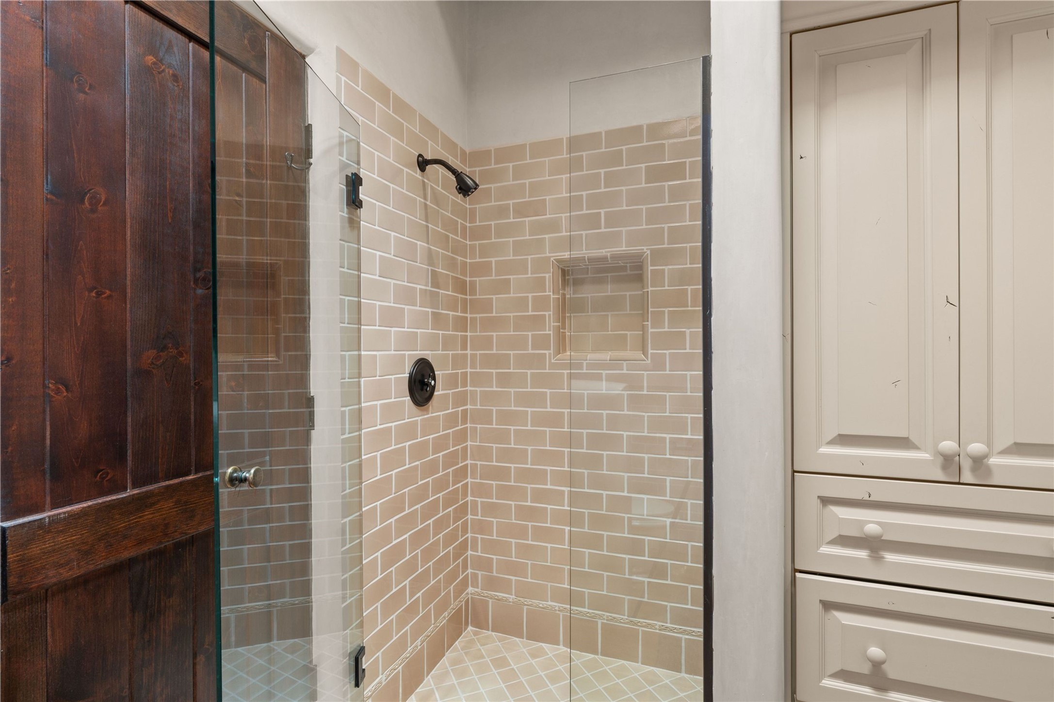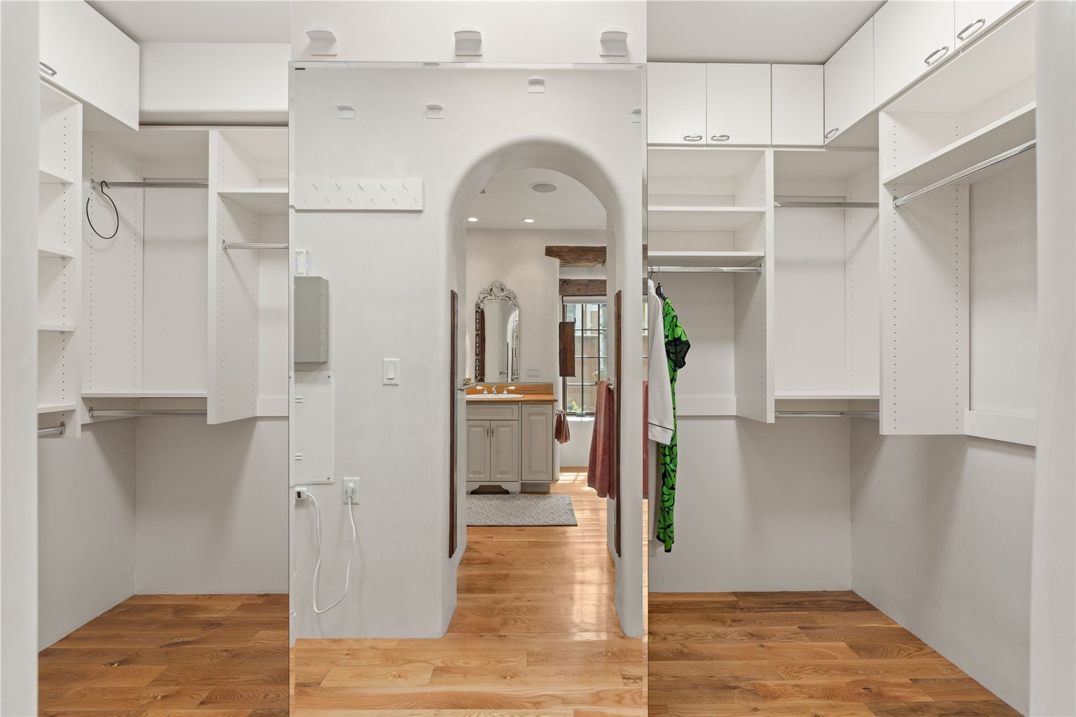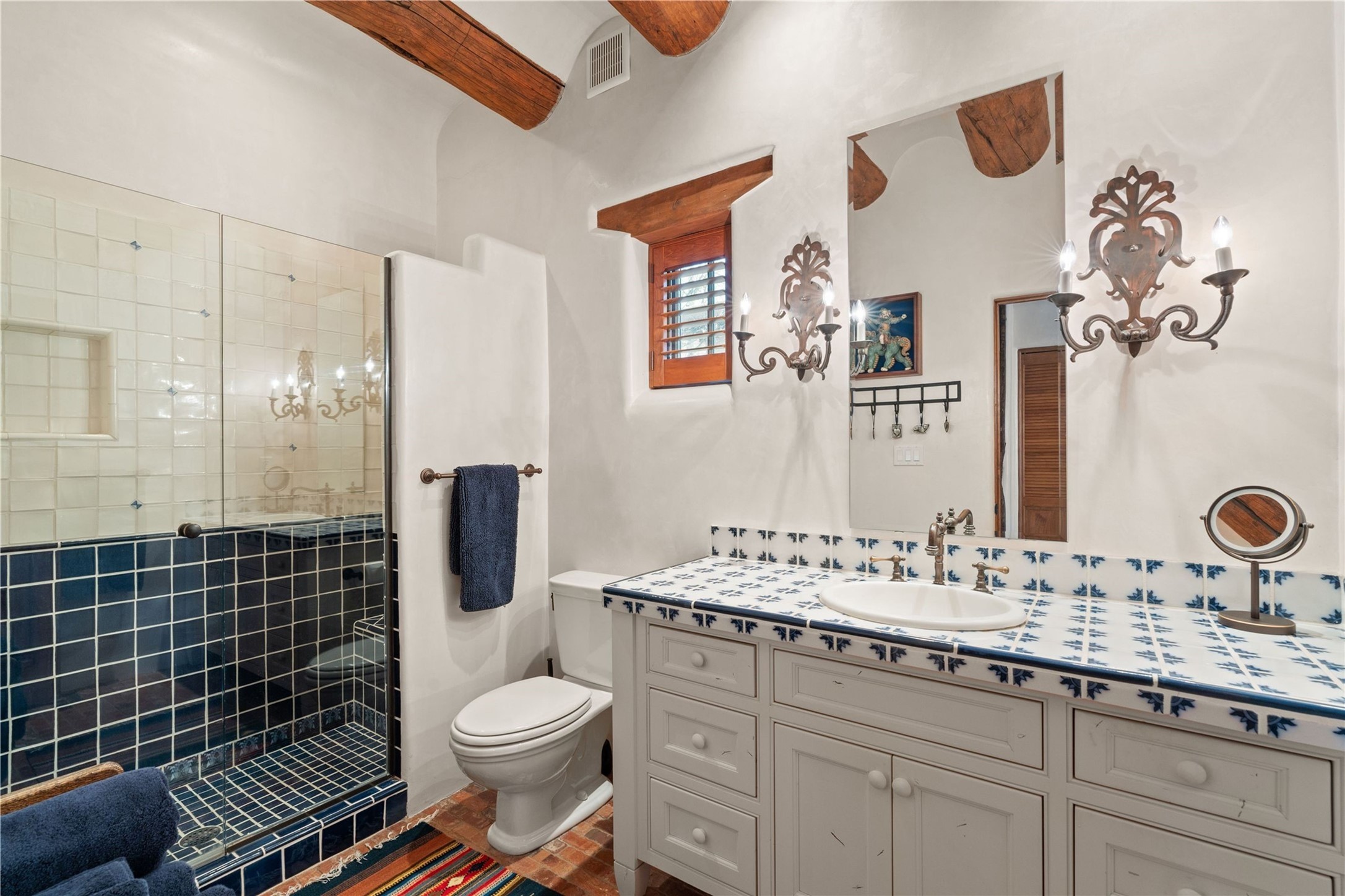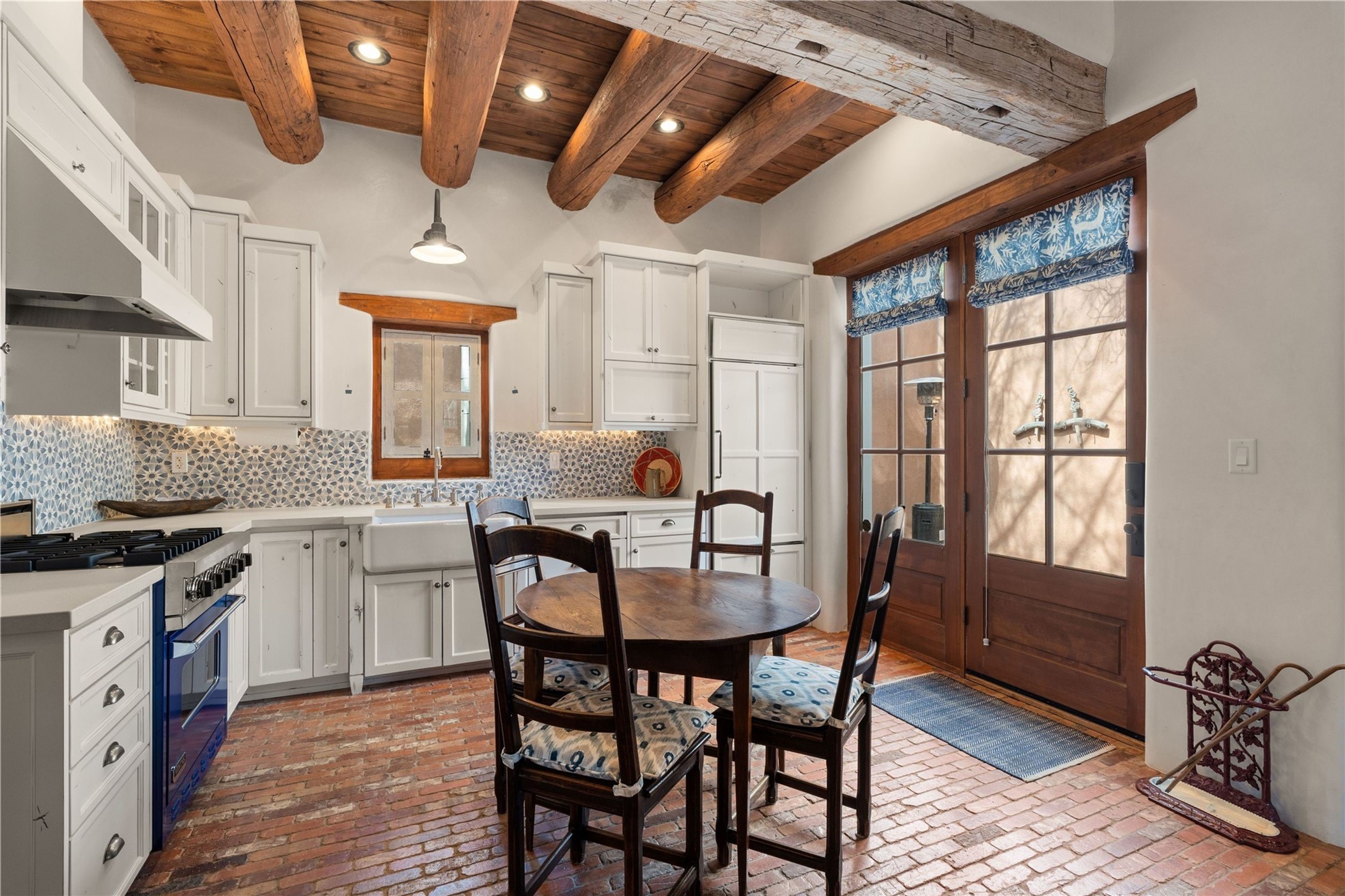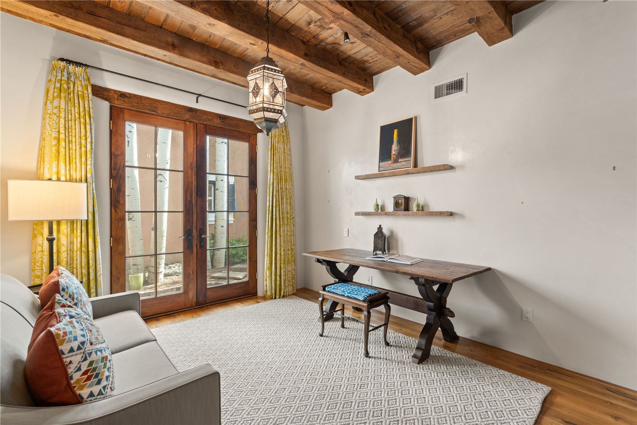 A rare opportunity in the heart of Santa Fe's Historic Eastside, this adobe home and casita-- within the six-unit San Antonio Compound built by renowned builder Jay Parks--offers timeless craftsmanship and thoughtful design in the form of a mini compound. Situated on the wide and peaceful San Antonio Street off of Acequia Madre, the offering comprises two separately deeded condominiums sharing a common courtyard, which provides the owner with a three-bedroom main house and an impeccably charming one-bedroom casita. The main house features white oak flooring, antique wooden beams and doors, custom plastered walls, and five fireplaces, typifying the warmth of classic Santa Fe architecture. A stately living room flows into a kitchen with a copper island and granite countertops. There are two bedroom suites plus a third room (served by a hall bathroom) that either works as another guest bedroom or perfect office. Aspen-lined stone pathways within a walled courtyard connect the home to the guest house, passing by a private hot tub that sits between the two homes. The casita is appointed with brick flooring, wood burning fireplace, a freshly updated kitchen, a decadent bedroom suite and two off-street parking spaces - all ensuring your guests will never want to leave. A two-car garage and additional parking are a rare asset in this sought-after downtown location. Meticulously maintained and thoughtfully designed, this is an exceptional offering just moments from Santa Fe's best dining, galleries on Canyon Road, and the Plaza.