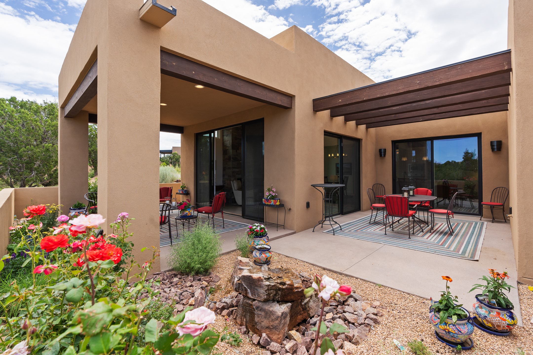This recently constructed, open concept design residence elegantly combines Pueblo Revival and Contemporary architectural styles. It features three outdoor living areas, including a sheltered courtyard perfect for al fresco dining, and a spacious covered portal, making it an inviting space to enjoy the serene water features, meticulously landscaped gardens with flowers galore, and breathtaking sunset vistas. The gourmet kitchen is equipped with exquisite solid wood cabinetry, stainless-steel Viking appliances, quartz countertops, and a walk-in pantry, seamlessly connecting to the dining and gathering areas. The gathering space boasts a substantial gas fireplace adorned with custom stonework. This Energy efficient Home has Solar panels that cover household electricity plus 2 electric vehicles! The primary suite includes a private portal and a generously sized bathroom featuring a curbless walk-in shower, a soaking tub, dual sinks, and a large walk-in closet with convenient access to the laundry room. A shared bathroom serves the two additional bedrooms, one of which is ideally suited for a home office. The homeowners' association fees cover road and common area maintenance, 24-hour roaming security, and on-site emergency medical technicians. Membership to The Club at Las Campanas is optional, offering amenities such as indoor and outdoor swimming pools, tennis courts, a fitness center, equestrian facilities, fine dining options, and two Jack Nicklaus Signature Golf Courses.