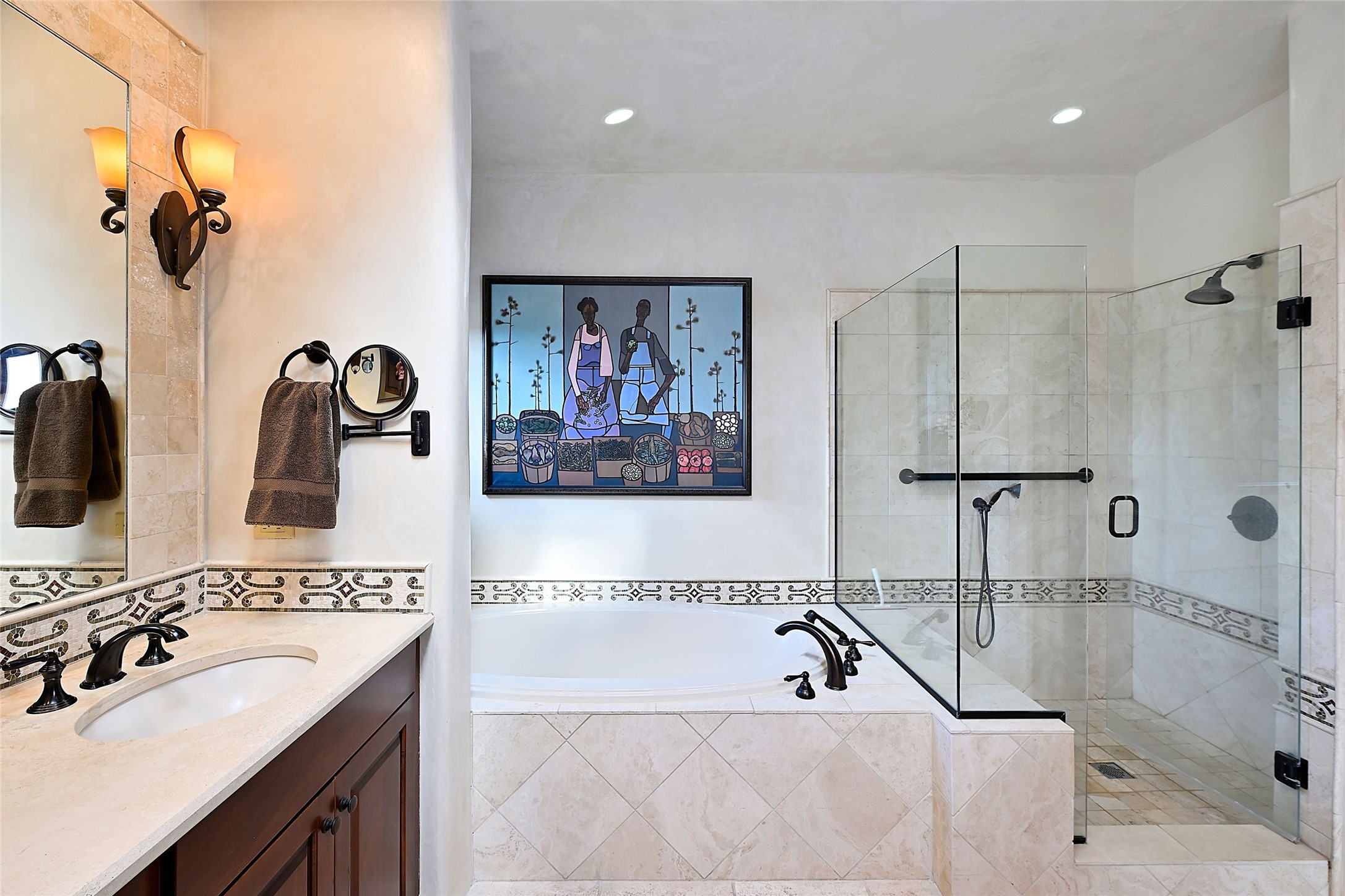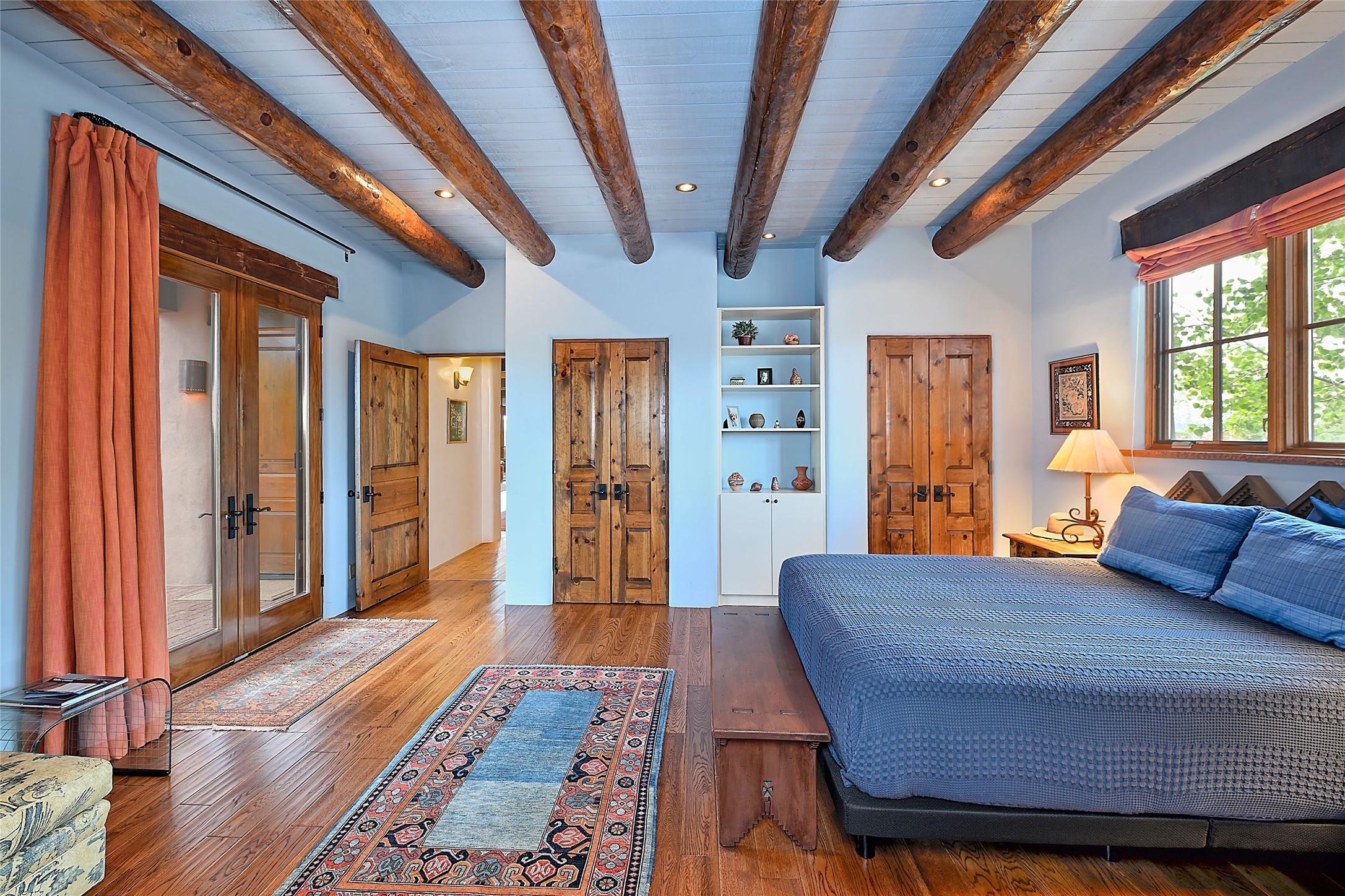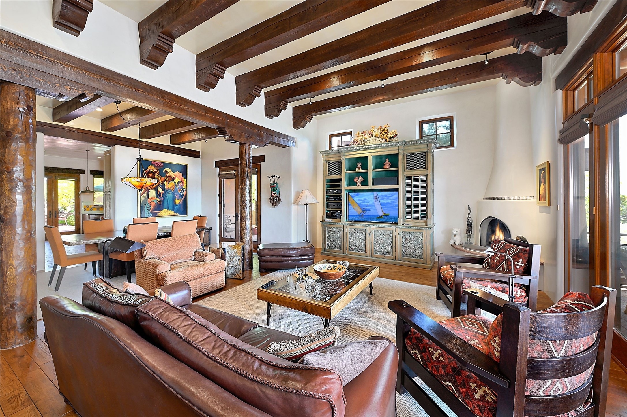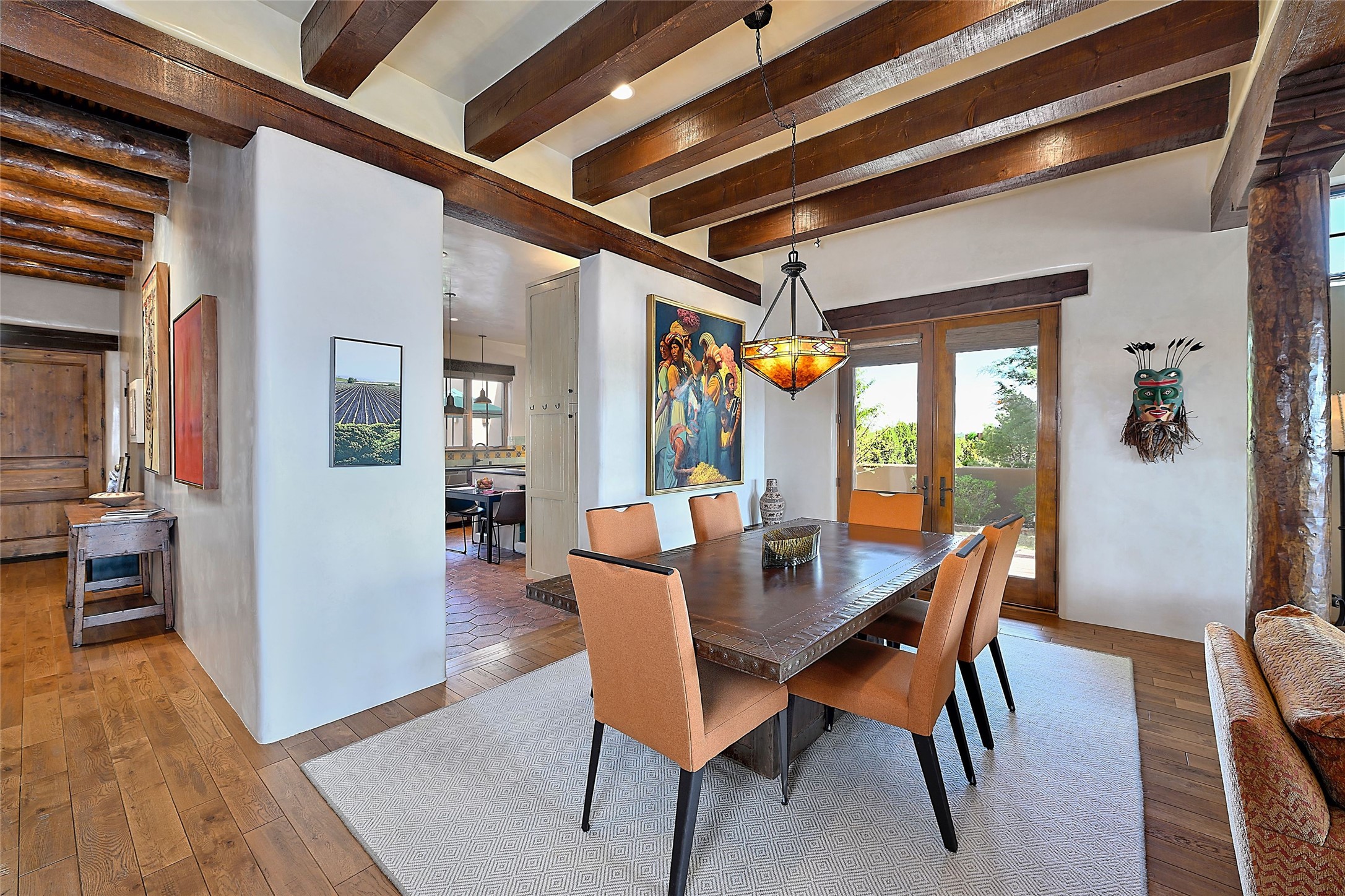 Sited on a scenic hill, this charming New Mexico residence offers breathtaking views and the perfect blend of privacy, comfort, and timeless Southwestern appeal. Surrounded by stunning, low-maintenance gardens and multiple outdoor spaces, this property invites you to relax and soak in the incredible weather and spectacular sunsets. Portals and patios wrap the home, creating a seamless flow between indoor and outdoor living. Whether you're enjoying a quiet morning coffee or entertaining guests under the vast, clear blue skies, every corner is thoughtfully designed for comfort and connection with the outdoors. Inside, the expansive primary suite is a true retreat, featuring two generous walk-in closets and a luxurious bath. A well-appointed guest suite offers ample closet space and a cozy office nook, ideal for working or unwinding. The kitchen is up to the minute in fittings and function while retaining authentic New Mexico charm. It opens to a vast patio and garden area, creating an ideal space for alfresco dining and gatherings. Adding to the property's appeal is a separate casita, complete with a mini kitchen and bath--perfect for guests, extended family, or creative studio use. This exceptional hilltop home offers beauty, serenity, and true New Mexican character at every turn.