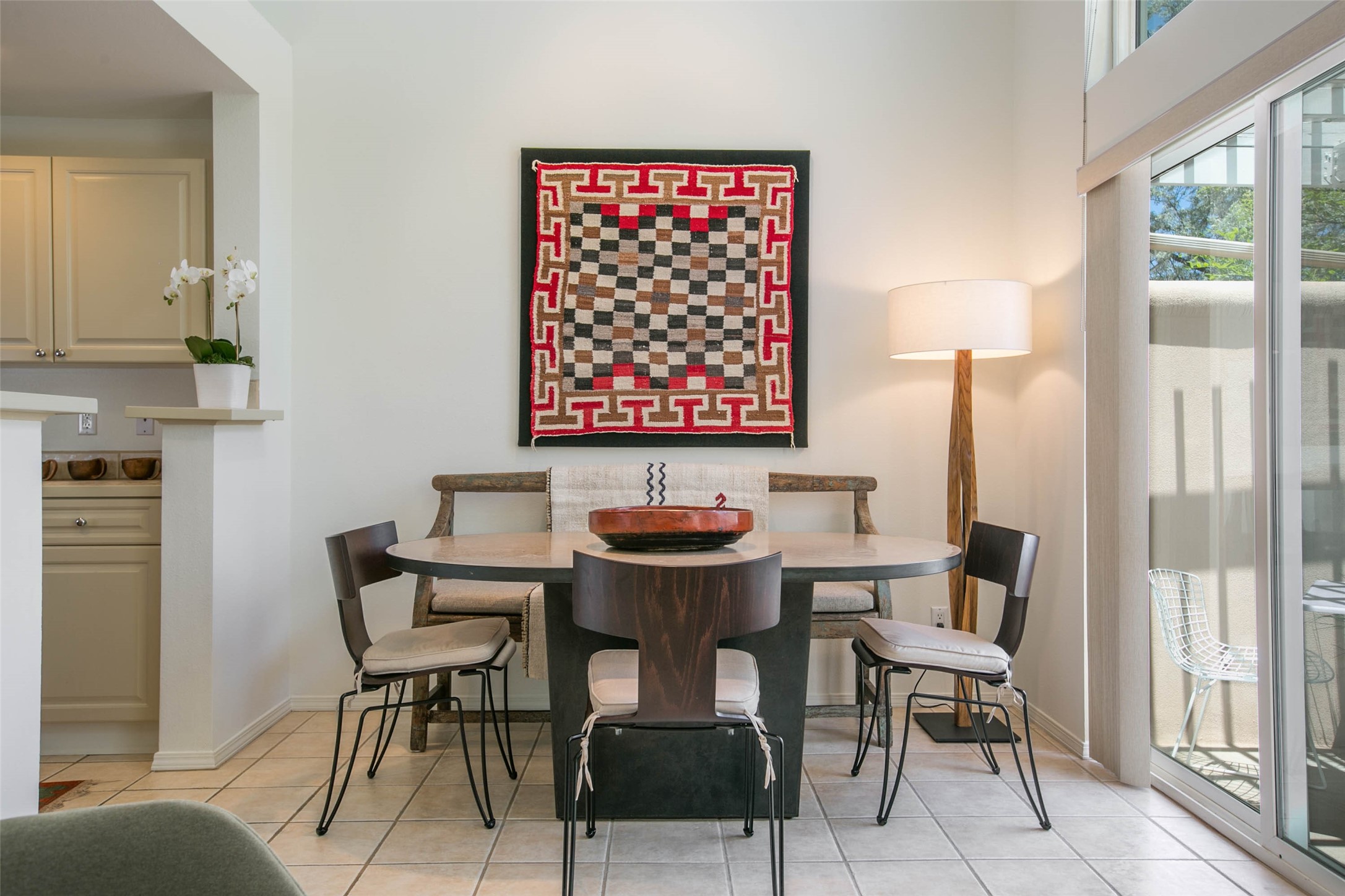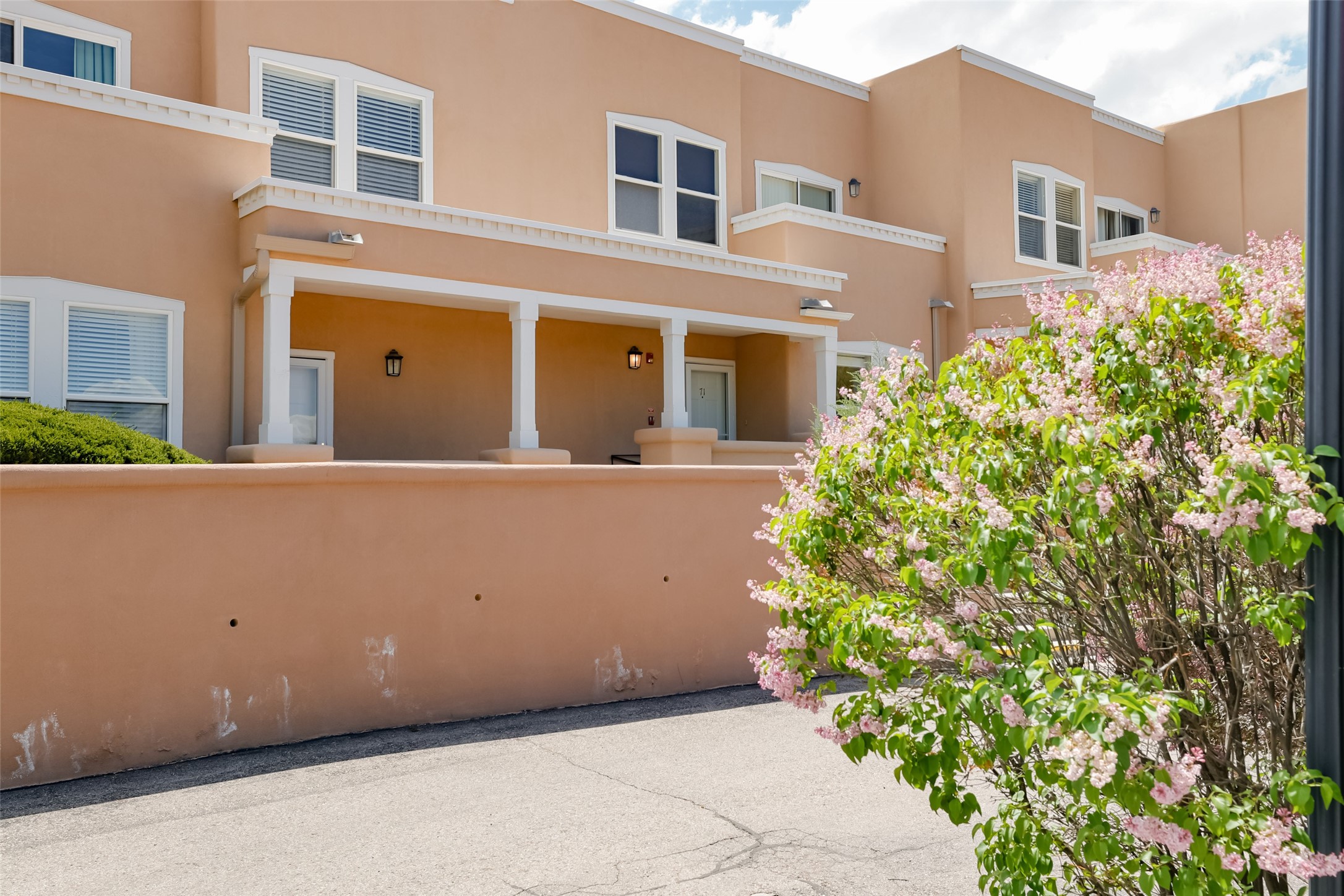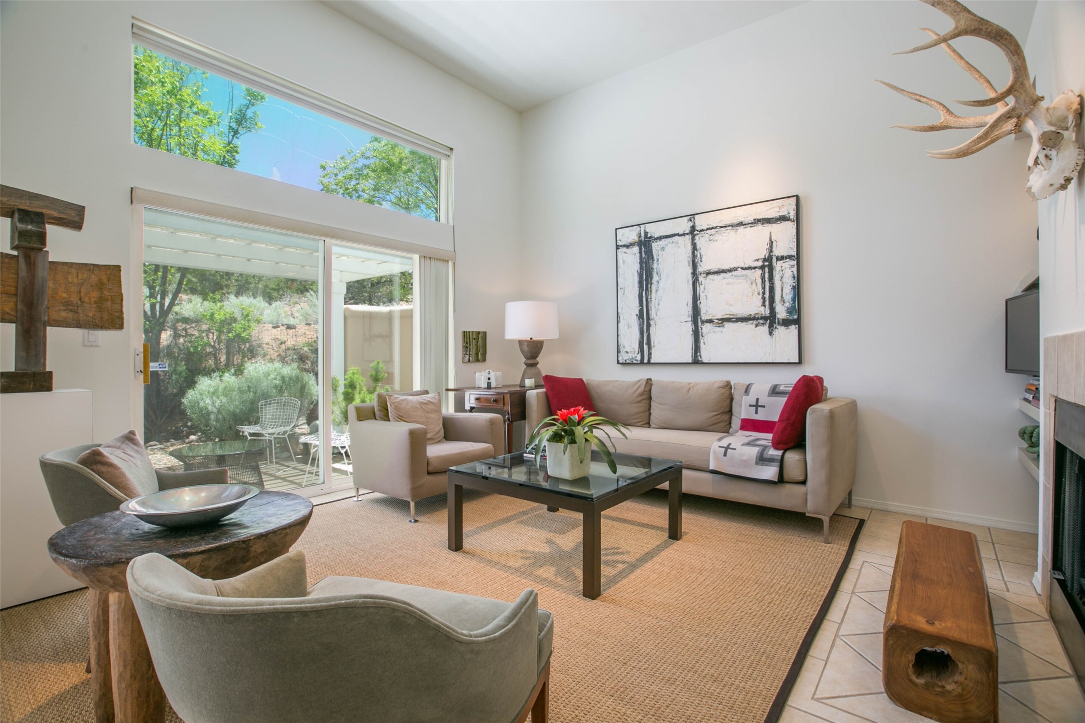 Price now includes all interior and exterior furnishings, This condo is a gem! Its location near the historic downtown district and Fort Marcy Park, along with the nearby hiking trails, shopping, and dining options, makes it a prime spot for leisure and convenience. The natural light flowing into the unit and the double patio doors leading to a cozy outdoor space with views offer a delightful living experience. With two spacious bedrooms, each with a walk-in closets, 2 full bathrooms, and a washer dryer set-up, this home provides comfort and practicality. The open layout of the main floor living area, complete with raised ceilings and a kitchen overlooking the living space with fireplace, adds to the charm of the property. The inclusion of tile floors, carpeted bedrooms, and a luxury feel throughout the home creates a comfortable and inviting atmosphere. Additionally, all furniture, dcor, artwork, and essentials for a "lock and leave" home adds further convenience for potential buyers. Steel sculpture outside does not convey. One private covered parking space and additional parking is available. It sounds like an ideal place for anyone seeking a private and luxurious living space in Historic Santa Fe!