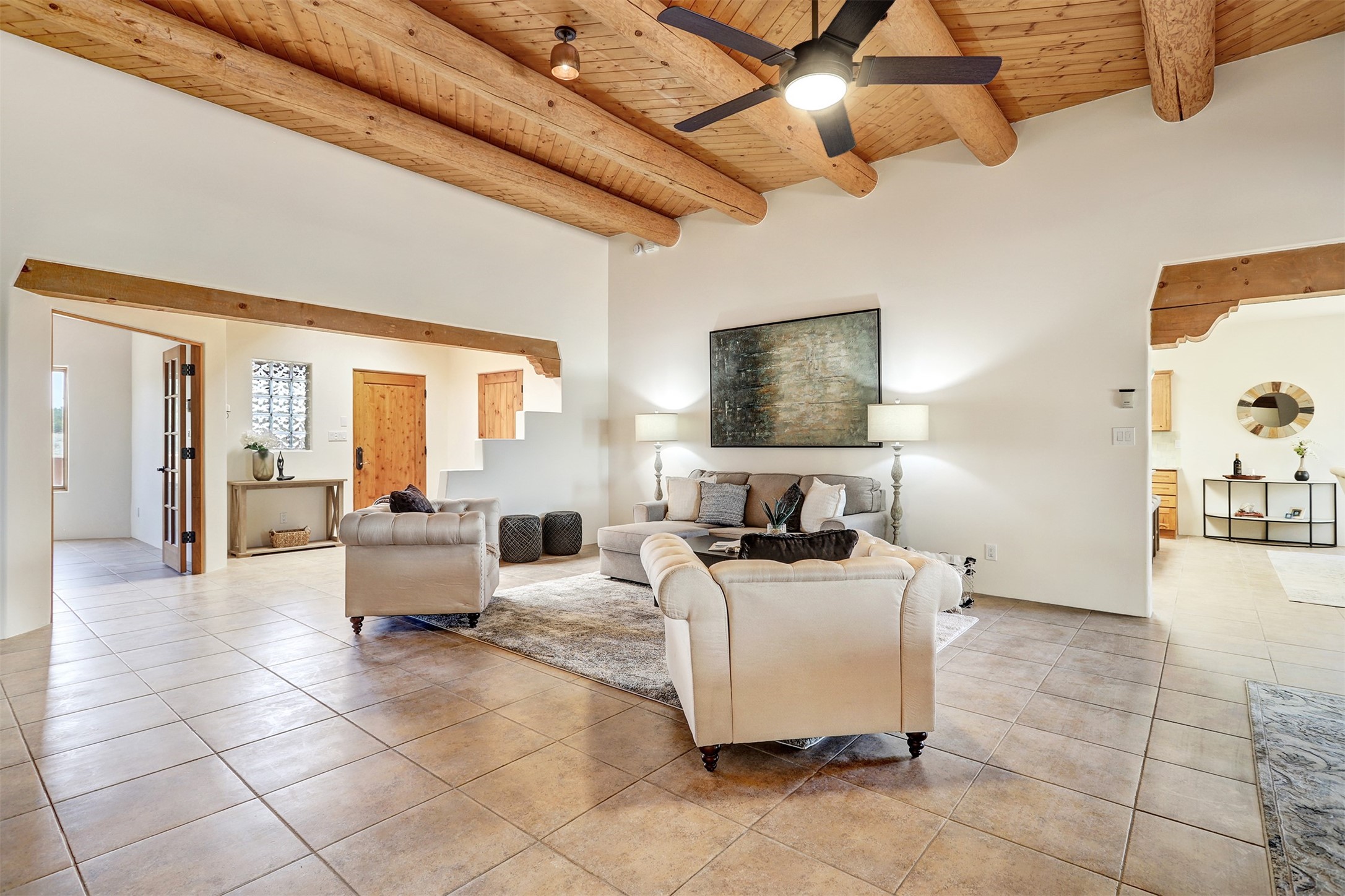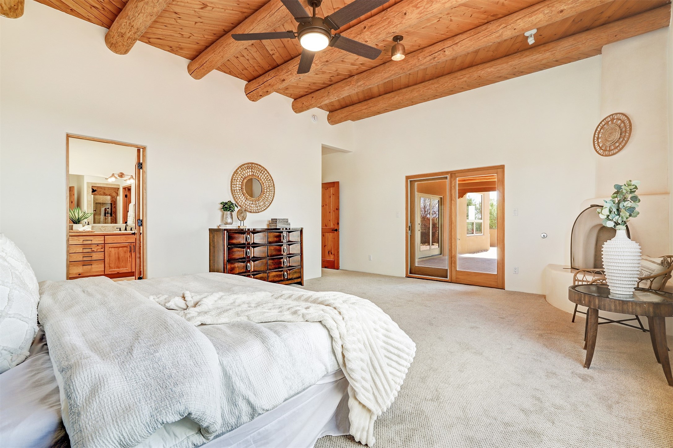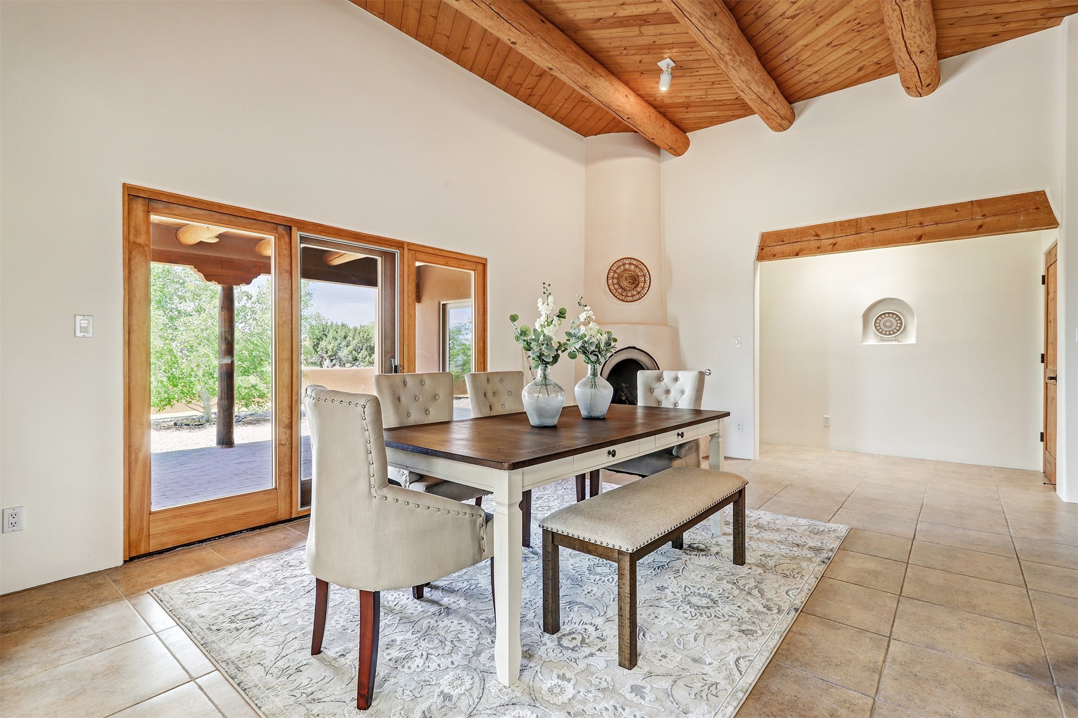 Welcome to this extraordinary residence in the highly desirable Eldorado, where Southwestern elegance meets modern comfort. Upon entering, you're greeted by soaring vaulted ceilings, exquisite tongue-and-groove woodwork, and beautiful vigas, setting the stage for this home's timeless design. The spacious living area, anchored by a traditional kiva fireplace, flows seamlessly into a chef-inspired kitchen. Featuring custom handmade tile backsplash, granite countertops, elegantly designed cabinetry, and brand-new stainless steel appliances, this kitchen is perfect for both everyday living and entertaining. The primary suite is a true retreat, offering a kiva fireplace, a luxurious ensuite, and extraordinary views of the surrounding mountains, providing the perfect sanctuary. Step outside to the private outdoor portal, adorned with tongue-and-groove ceilings and vigas, offering a peaceful setting for relaxation or entertaining. The front and back of the home boast breathtaking mountain views, adding an ever-changing, picturesque backdrop to daily life. This meticulously crafted home has been thoughtfully upgraded to offer a seamless blend of style and functionality. Located in the coveted Eldorado community, this home offers an ideal combination of privacy and convenience. Eldorado is known for its expansive open spaces, dark night skies, and a vibrant, close-knit community. Enjoy miles of walking, biking, and equestrian trails, along with a community center that features a pool, tennis and pickleball courts, and dog parks. Only a short drive to downtown Santa Fe, you'll have access to the city's galleries, fine dining, and cultural events, offering the best of both worlds. This extraordinary home presents a rare opportunity to live in a serene, natural environment while remaining close to the rich culture and amenities of Santa Fe. Schedule your private showing today to experience this exceptional property in person.