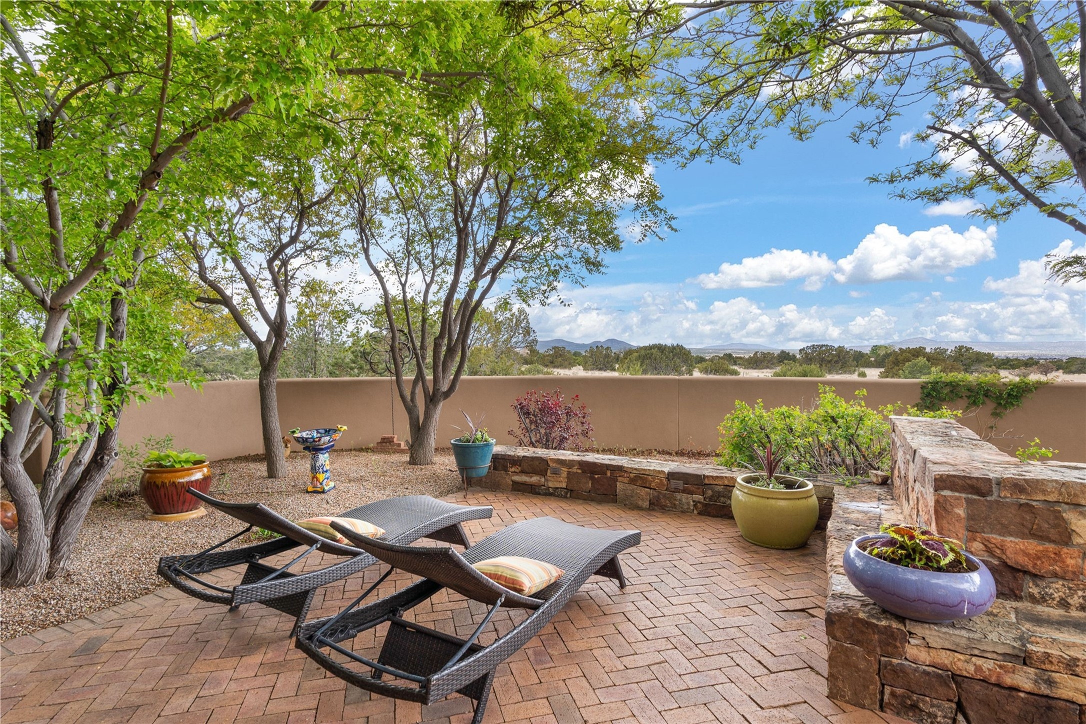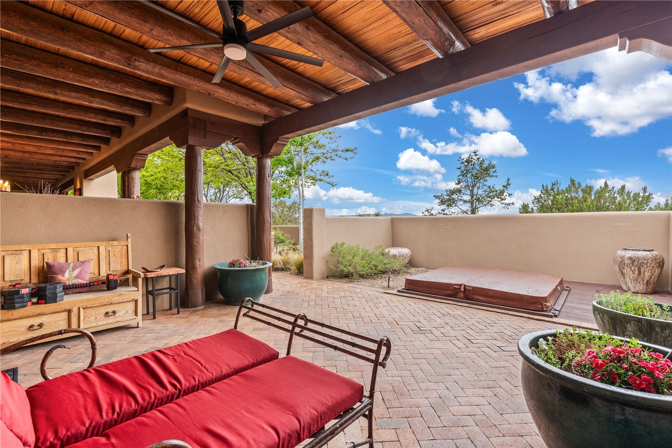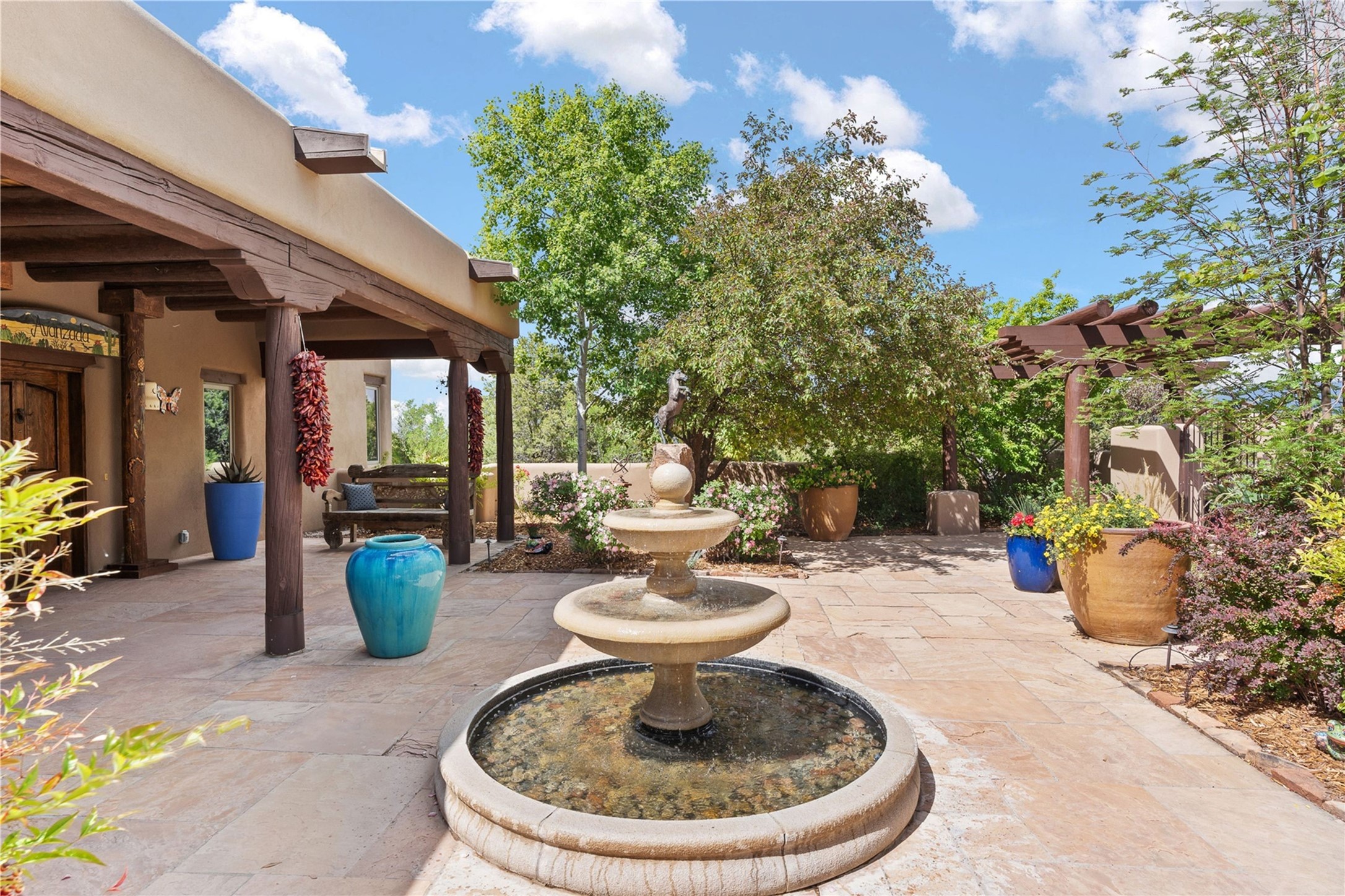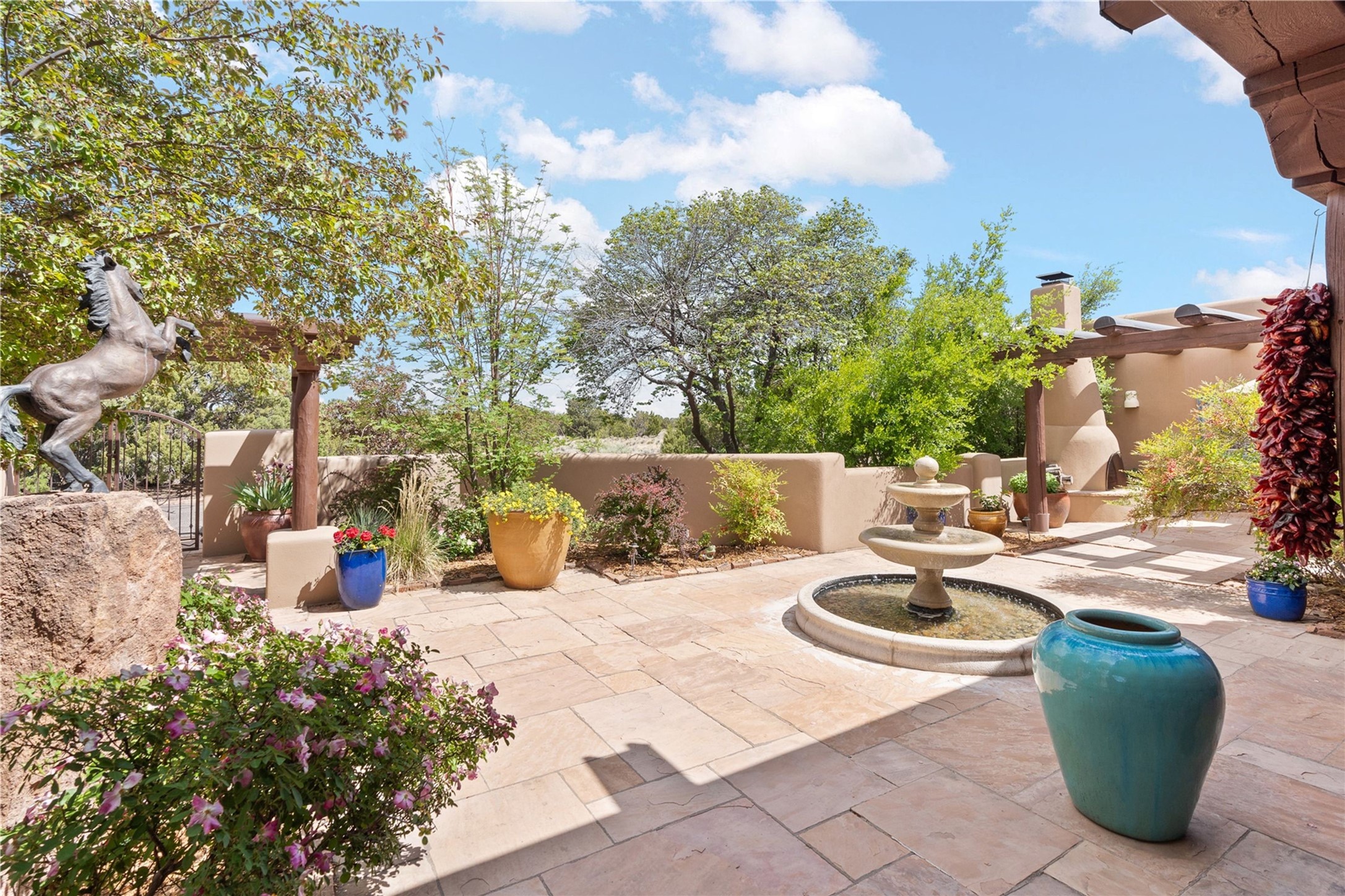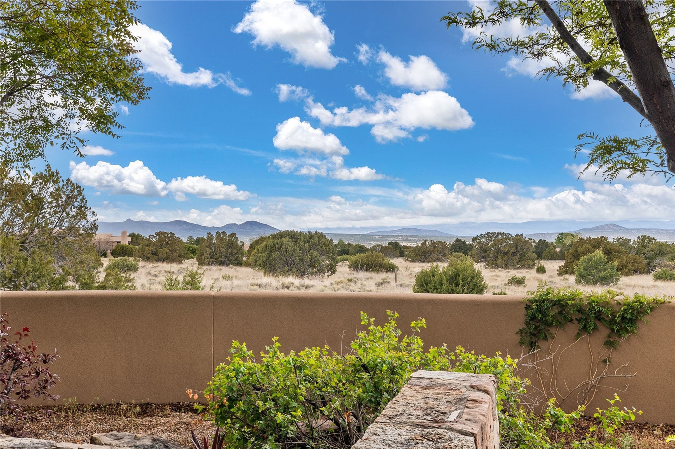 For those seeking the best of Santa Fe, this elegant and classic property delivers quality in every aspect. Set on 2.26 acres in Las Campanas, the 3-bedroom main residence, the beautifully appointed casita, and the masterfully conceived and executed outdoor areas come together to make this a special property. The ideal floorplan sets the grand primary bedroom suite, exercise room, and office opposite the house from the two generous guest suites. Between, are both informal and formal dining and living areas, creating spaces for the spectrum of living with the home. The casita is perfectly distanced to create privacy while providing easy access to the main house through a private courtyard. All the rooms are connected intuitively without a single step. The home is constructed with pumice-crete, a material known for excellent temperature insulation, natural flame resistance, and effective sound dampening. The kitchen serves as a warm and welcoming focal point, while the main living areas (living room, dining room & den) all provide beautiful views of the inspiring sunsets and Jemez Mountains. In addition to the dramatic walled and gated entry courtyard that captures eastern views, the main western portal is one of the most appealing outdoor living/entertaining spaces in all of Santa Fe. Radiant heat, air conditioning, and the three vehicle garage are other details that make this property an ideal primary residence or vacation home. The thoughtfully planned layout, coupled with the impeccable quality create great value for the next owner whether they want to enjoy it as is or bring upon it their own vision. A newly installed roof with a 10-year transferable warranty adds peace of mind for the next owner.