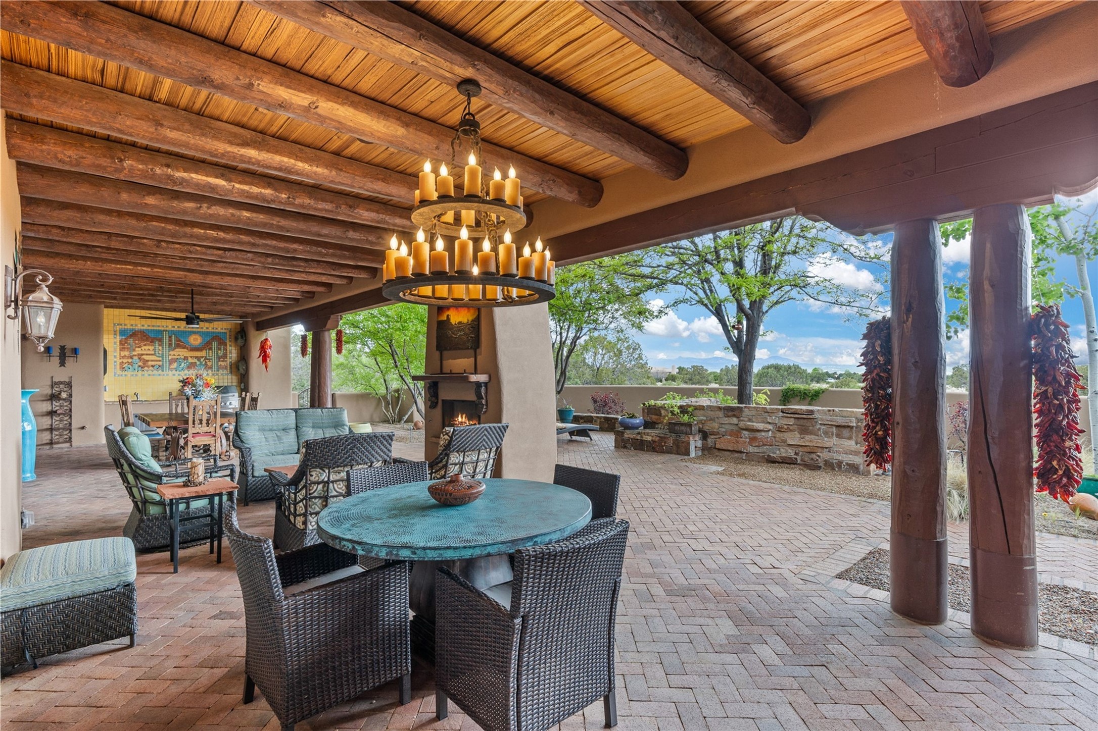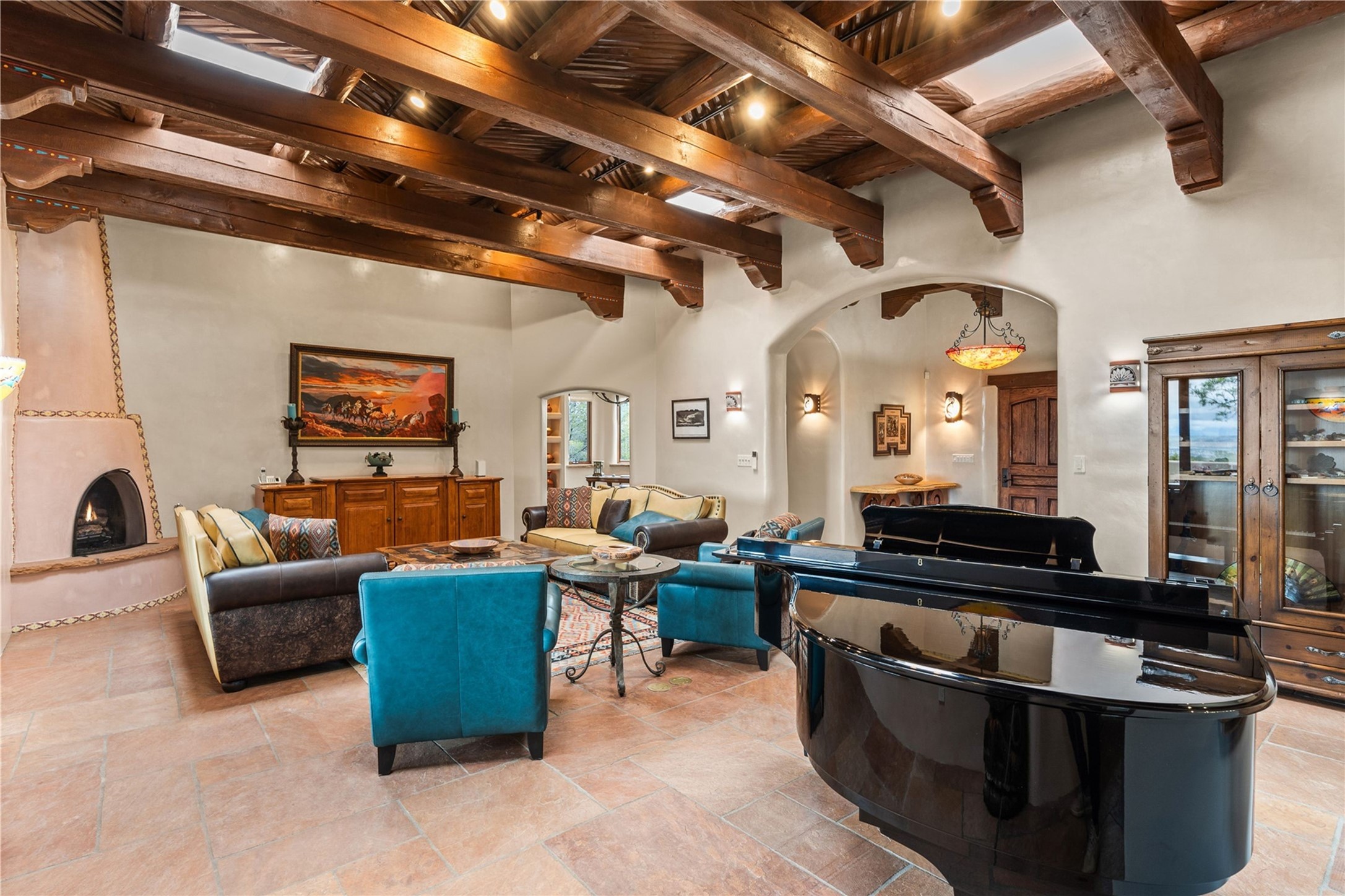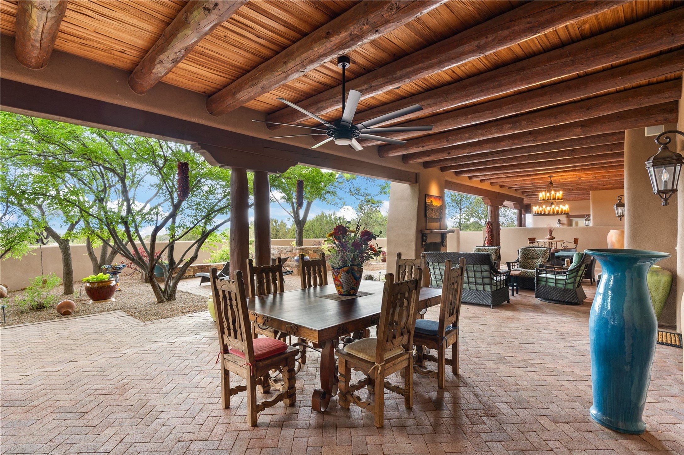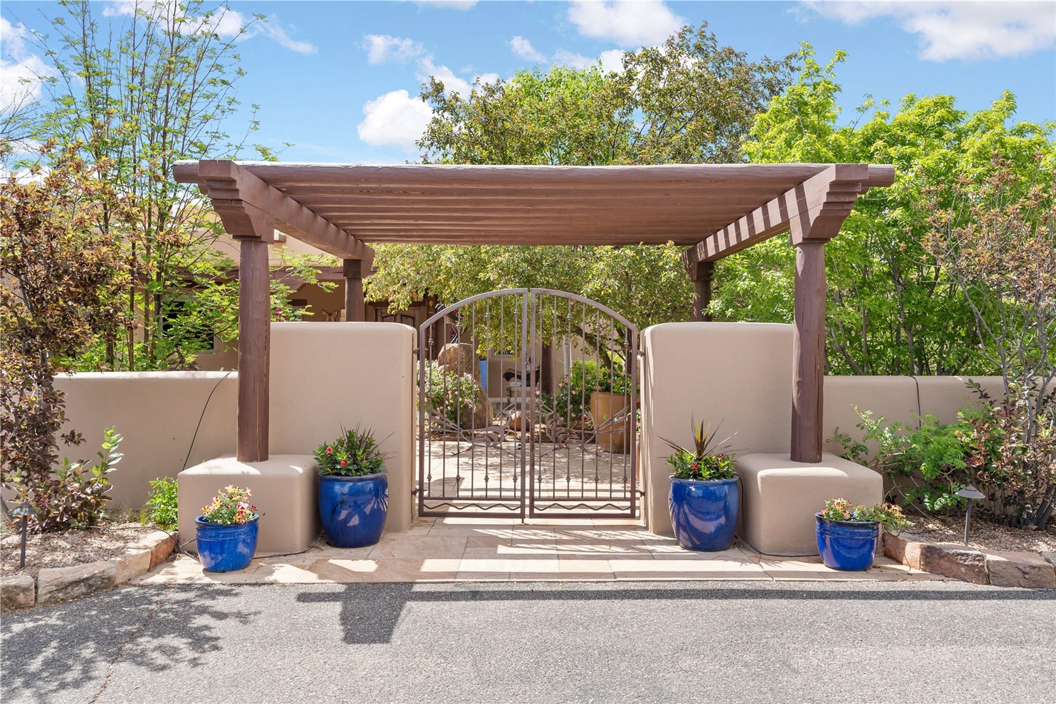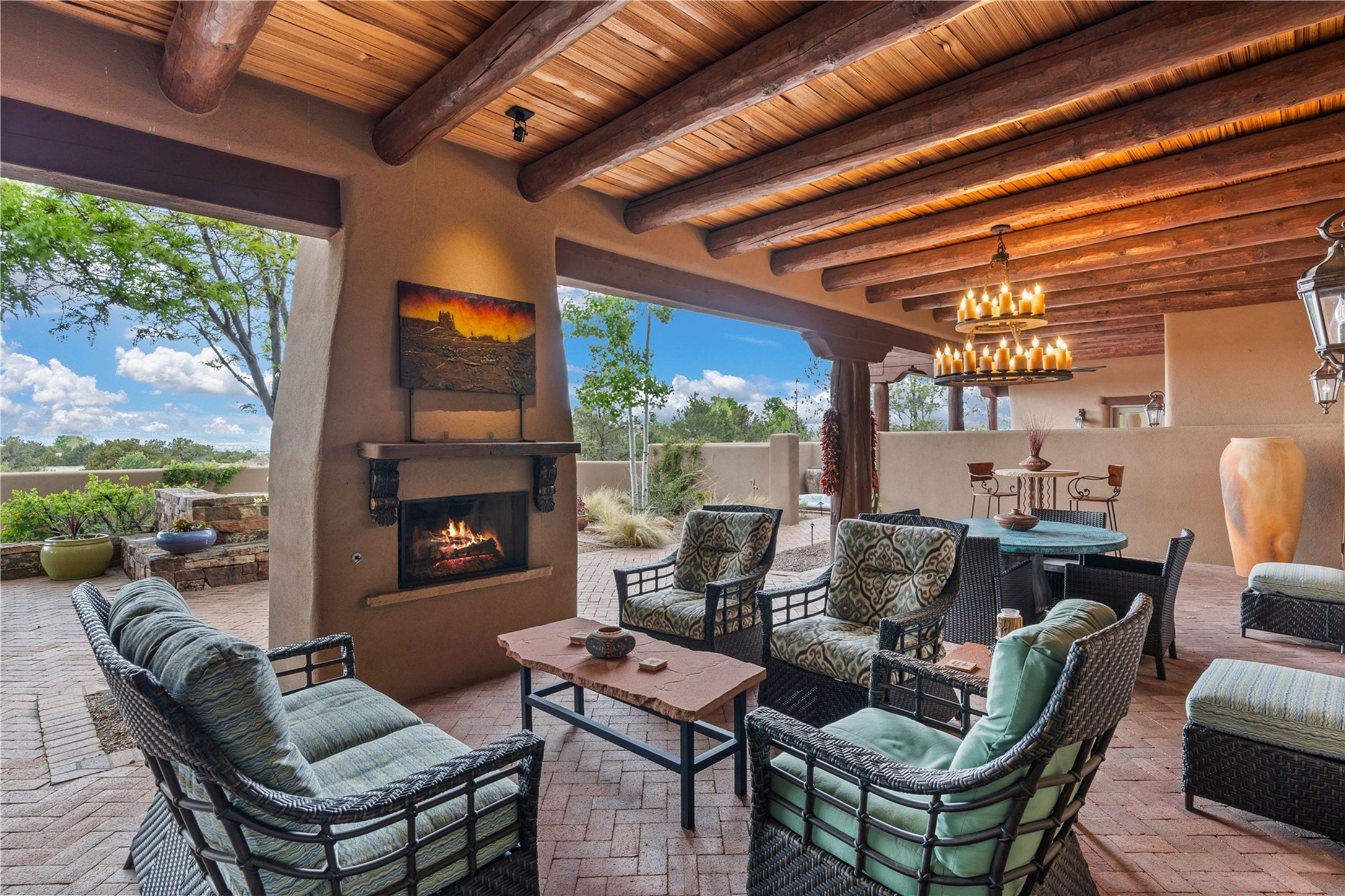For those seeking the best of Santa Fe, this elegant and classic property delivers quality in every aspect. Set on 2.26 acres in Las Campanas, the 3-bedroom main residence, the beautifully appointed casita, and the masterfully conceived and executed outdoor areas come together to make this a special property. The ideal floorplan sets the grand primary bedroom suite, exercise room, and office opposite the house from the two generous guest suites. Between, are both informal and formal dining and living areas, creating spaces for the spectrum of living with the home. The casita is perfectly distanced to create privacy while providing easy access to the main house through a private courtyard. All the rooms are connected intuitively without a single step. The home is constructed with pumice-crete, a material known for excellent temperature insulation, natural flame resistance, and effective sound dampening. The kitchen serves as a warm and welcoming focal point, while the main living areas (living room, dining room & den) all provide beautiful views of the inspiring sunsets and Jemez Mountains. In addition to the dramatic walled and gated entry courtyard that captures eastern views, the main western portal is one of the most appealing outdoor living/entertaining spaces in all of Santa Fe. Radiant heat, air conditioning, and the three vehicle garage are other details that make this property an ideal primary residence or vacation home. The thoughtfully planned layout, coupled with the impeccable quality create great value for the next owner whether they want to enjoy it as is or bring upon it their own vision. A newly installed roof with a 10-year transferable warranty adds peace of mind for the next owner.