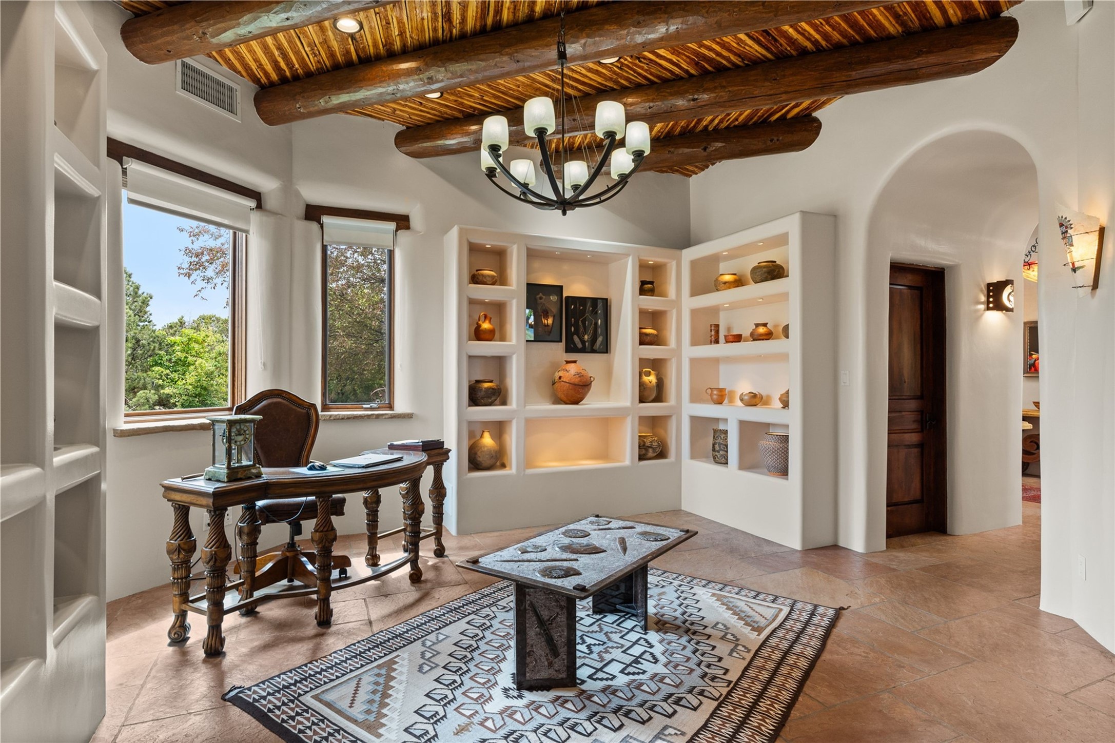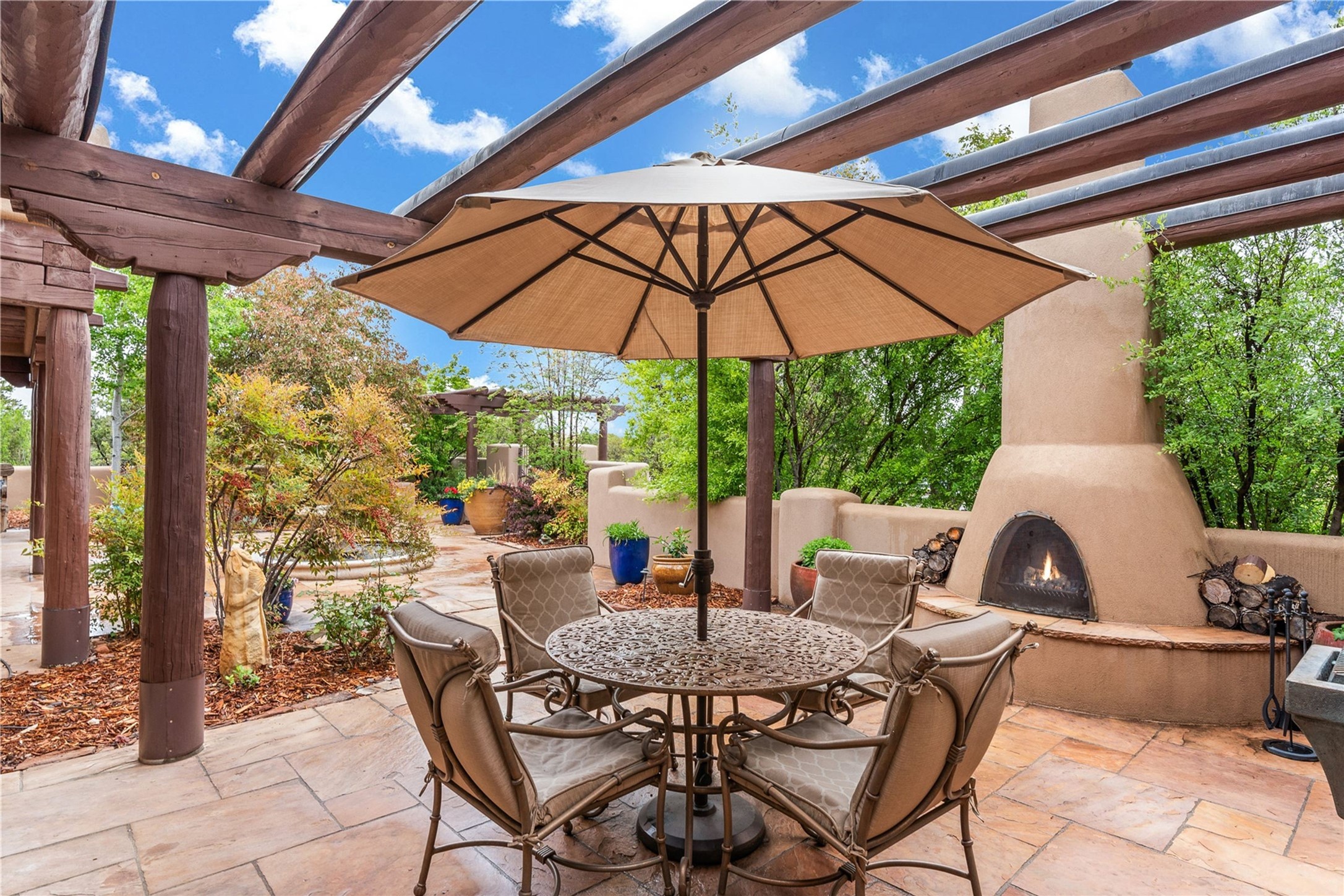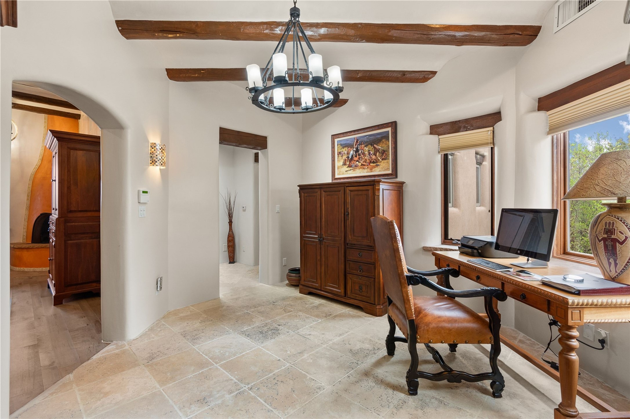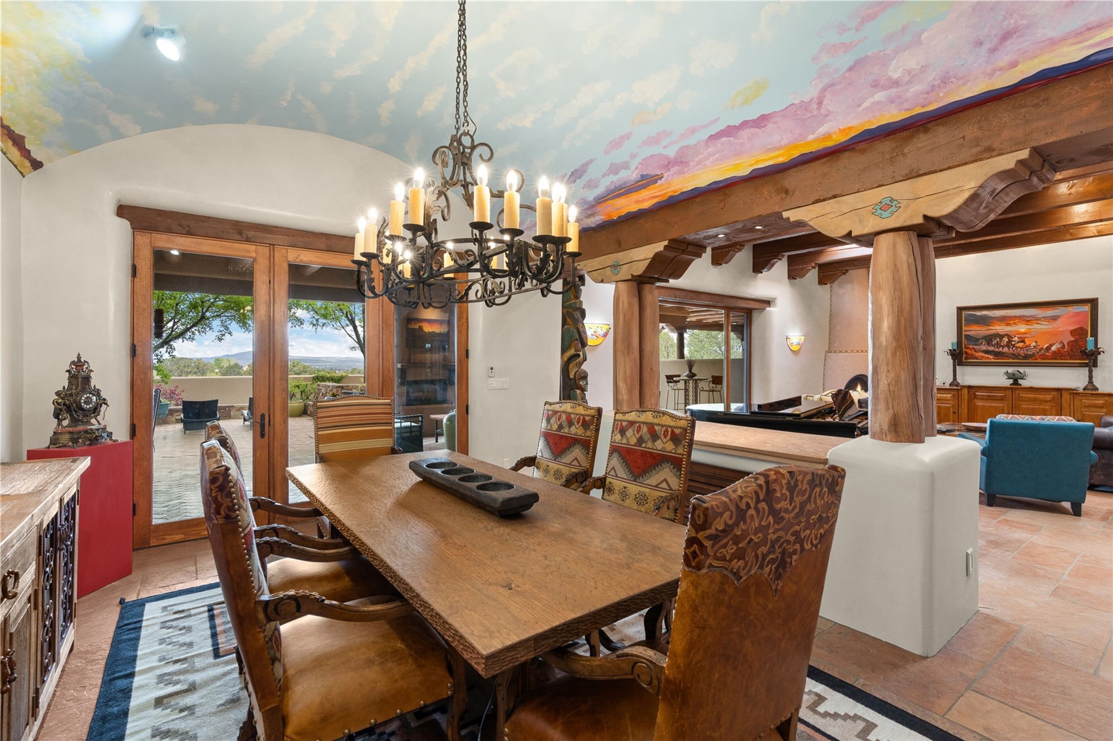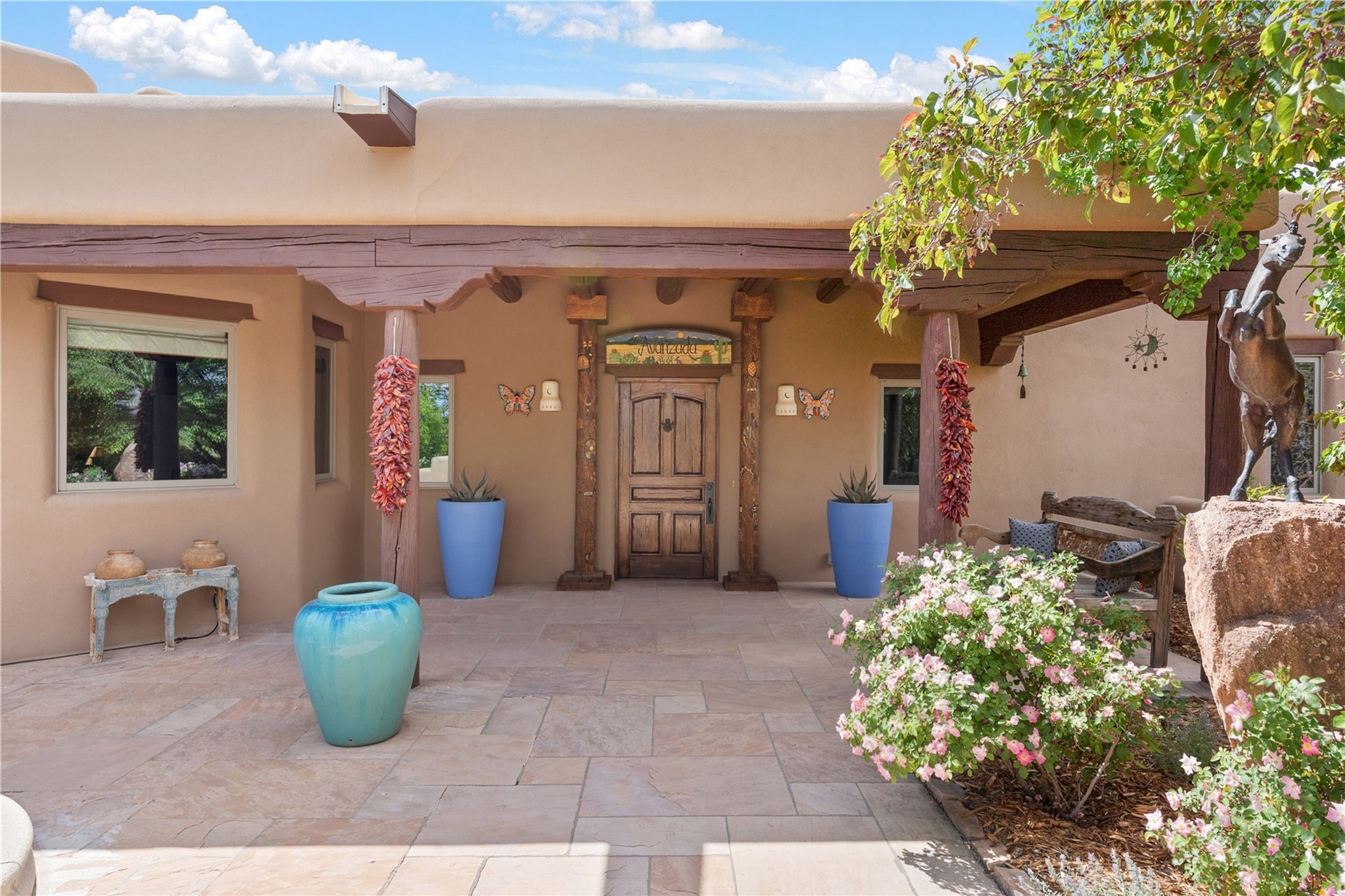 For those seeking the best of Santa Fe, this elegant and classic property delivers quality in every aspect. Set on 2.26 acres in Las Campanas, the 3-bedroom main residence, the beautifully appointed casita, and the masterfully conceived and executed outdoor areas come together to make this a special property. The ideal floorplan sets the grand primary bedroom suite, exercise room, and office opposite the house from the two generous guest suites. Between, are both informal and formal dining and living areas, creating spaces for the spectrum of living with the home. The casita is perfectly distanced to create privacy while providing easy access to the main house through a private courtyard. All the rooms are connected intuitively without a single step. The home is constructed with pumice-crete, a material known for excellent temperature insulation, natural flame resistance, and effective sound dampening. The kitchen serves as a warm and welcoming focal point, while the main living areas (living room, dining room & den) all provide beautiful views of the inspiring sunsets and Jemez Mountains. In addition to the dramatic walled and gated entry courtyard that captures eastern views, the main western portal is one of the most appealing outdoor living/entertaining spaces in all of Santa Fe. Radiant heat, air conditioning, and the three vehicle garage are other details that make this property an ideal primary residence or vacation home. The thoughtfully planned layout, coupled with the impeccable quality create great value for the next owner whether they want to enjoy it as is or bring upon it their own vision. A newly installed roof with a 10-year transferable warranty adds peace of mind for the next owner.