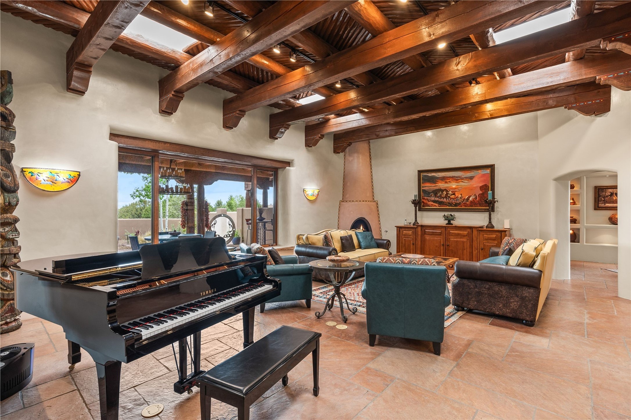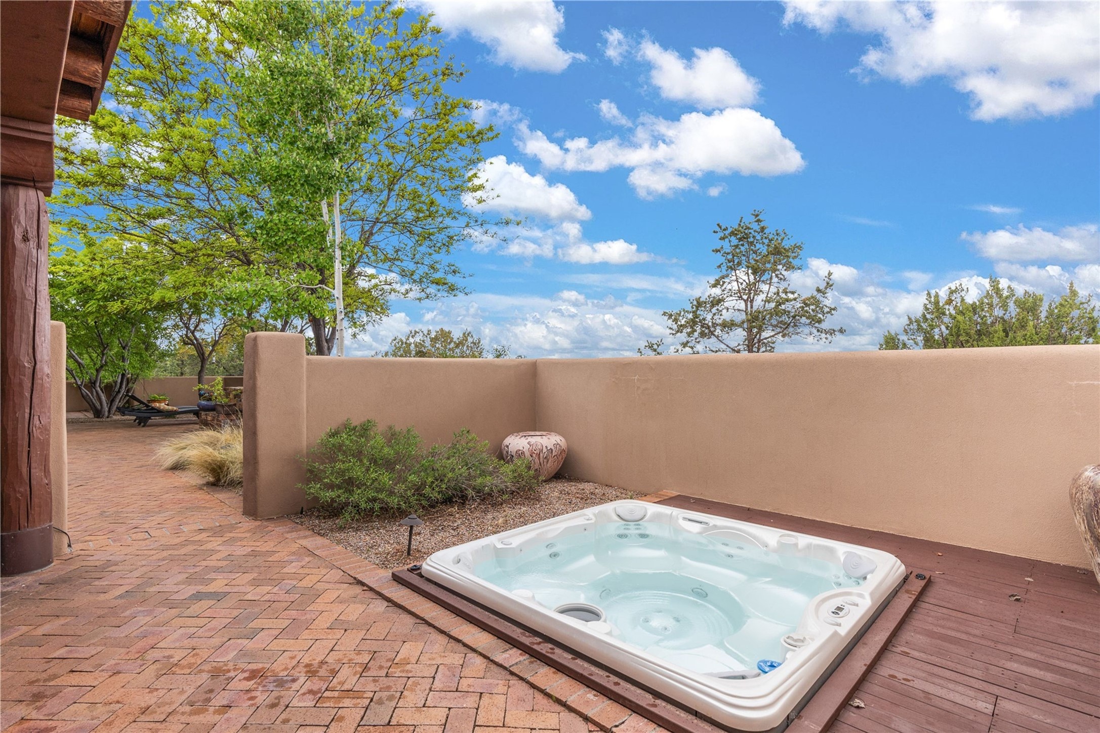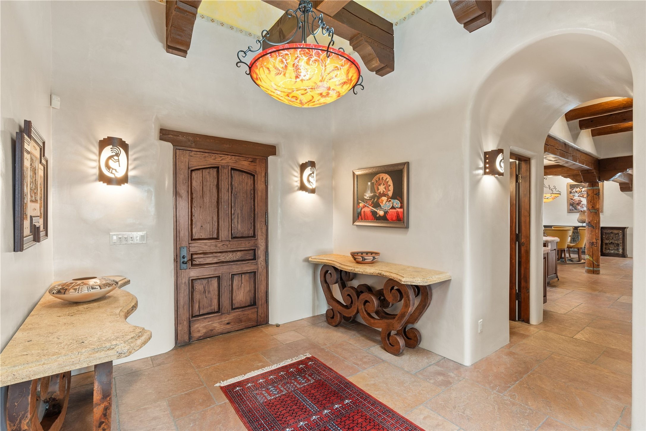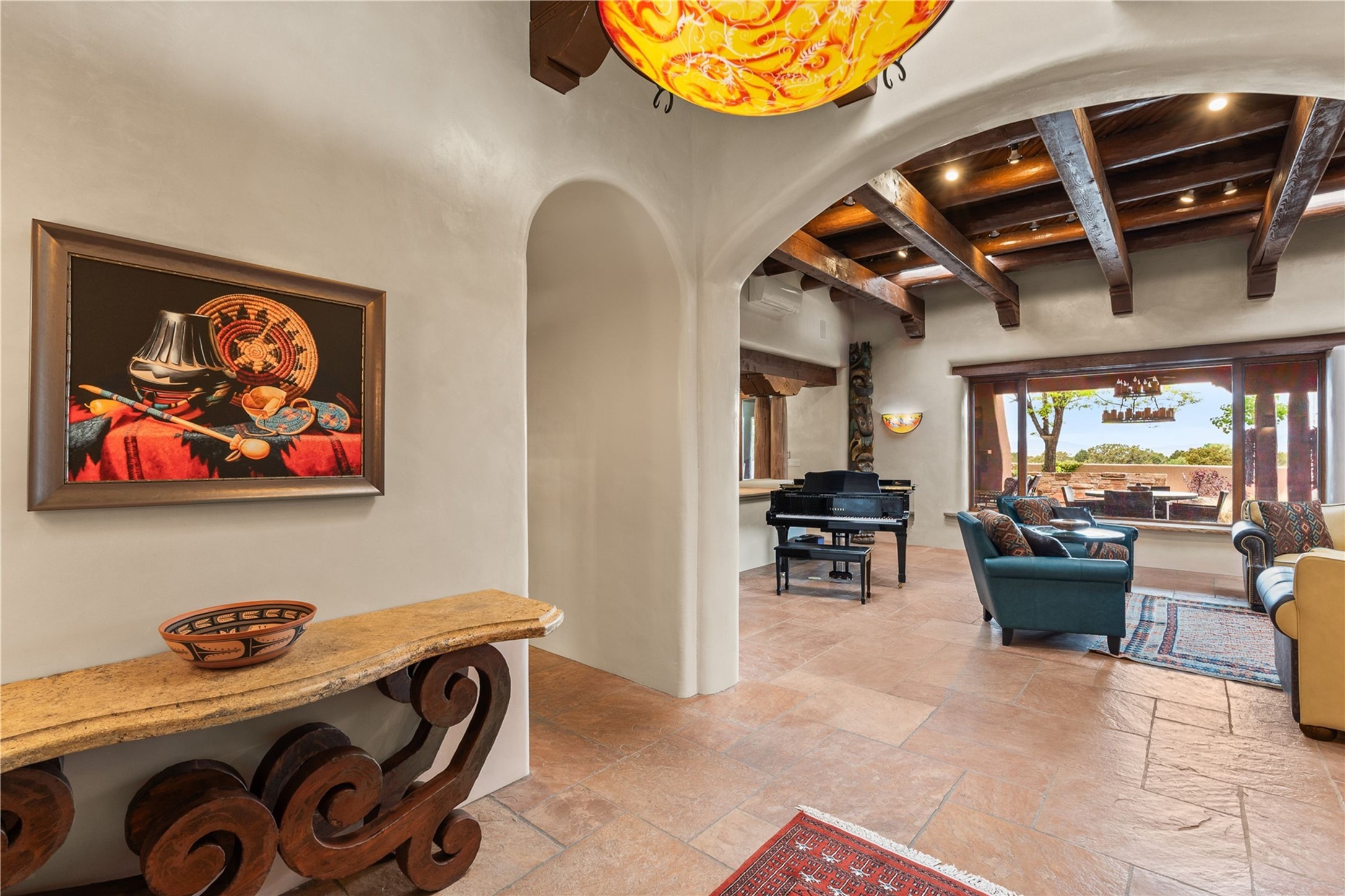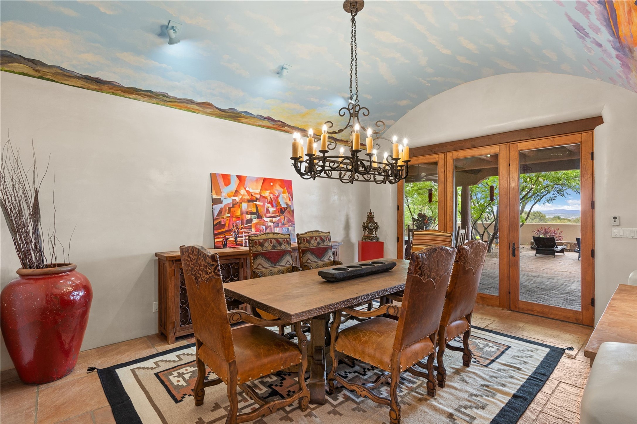 For those seeking the best of Santa Fe, this elegant and classic property delivers quality in every aspect. Set on 2.26 acres in Las Campanas, the 3-bedroom main residence, the beautifully appointed casita, and the masterfully conceived and executed outdoor areas come together to make this a special property. The ideal floorplan sets the grand primary bedroom suite, exercise room, and office opposite the house from the two generous guest suites. Between, are both informal and formal dining and living areas, creating spaces for the spectrum of living with the home. The casita is perfectly distanced to create privacy while providing easy access to the main house through a private courtyard. All the rooms are connected intuitively without a single step. The home is constructed with pumice-crete, a material known for excellent temperature insulation, natural flame resistance, and effective sound dampening. The kitchen serves as a warm and welcoming focal point, while the main living areas (living room, dining room & den) all provide beautiful views of the inspiring sunsets and Jemez Mountains. In addition to the dramatic walled and gated entry courtyard that captures eastern views, the main western portal is one of the most appealing outdoor living/entertaining spaces in all of Santa Fe. Radiant heat, air conditioning, and the three vehicle garage are other details that make this property an ideal primary residence or vacation home. The thoughtfully planned layout, coupled with the impeccable quality create great value for the next owner whether they want to enjoy it as is or bring upon it their own vision. A newly installed roof with a 10-year transferable warranty adds peace of mind for the next owner.