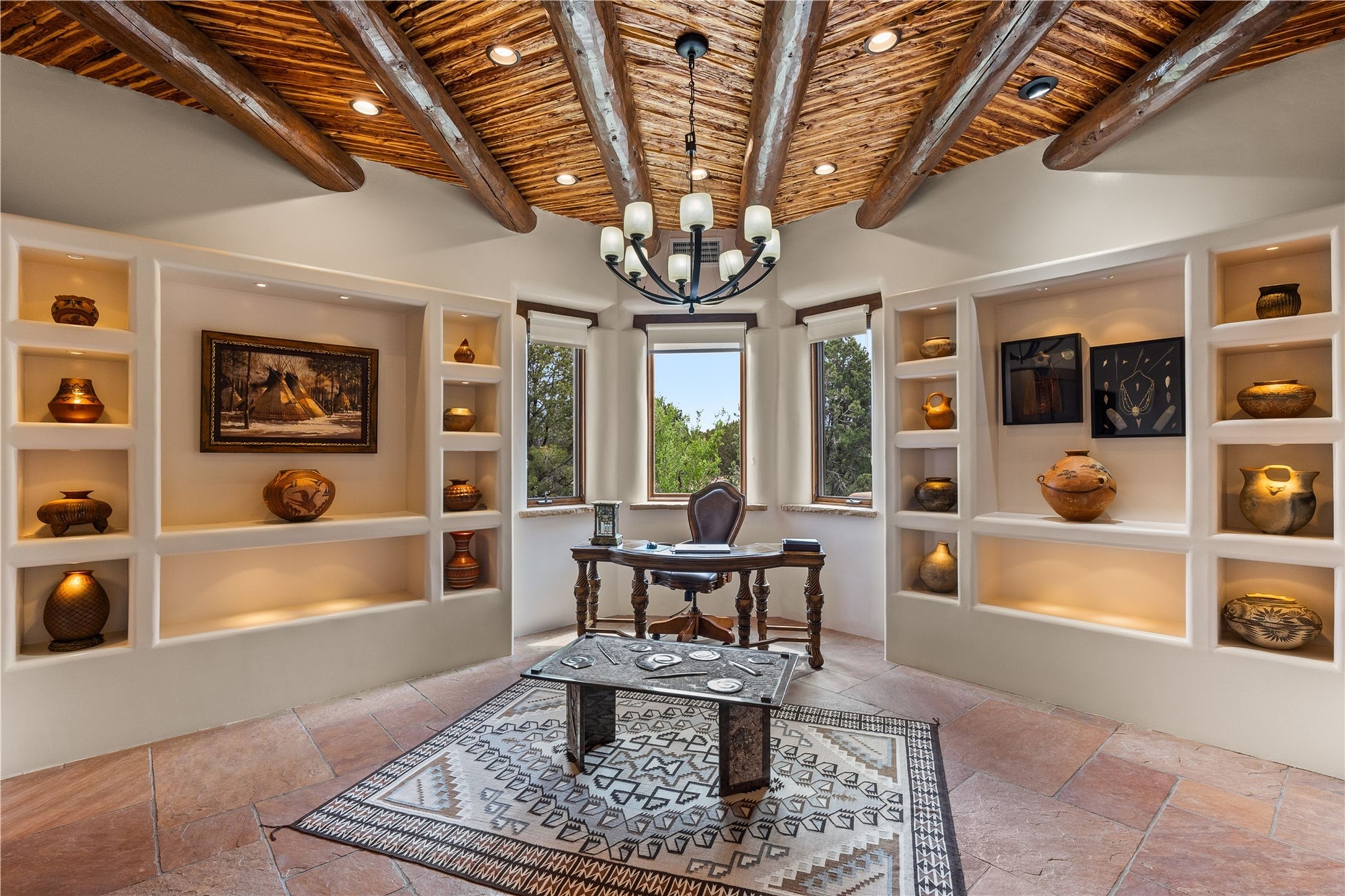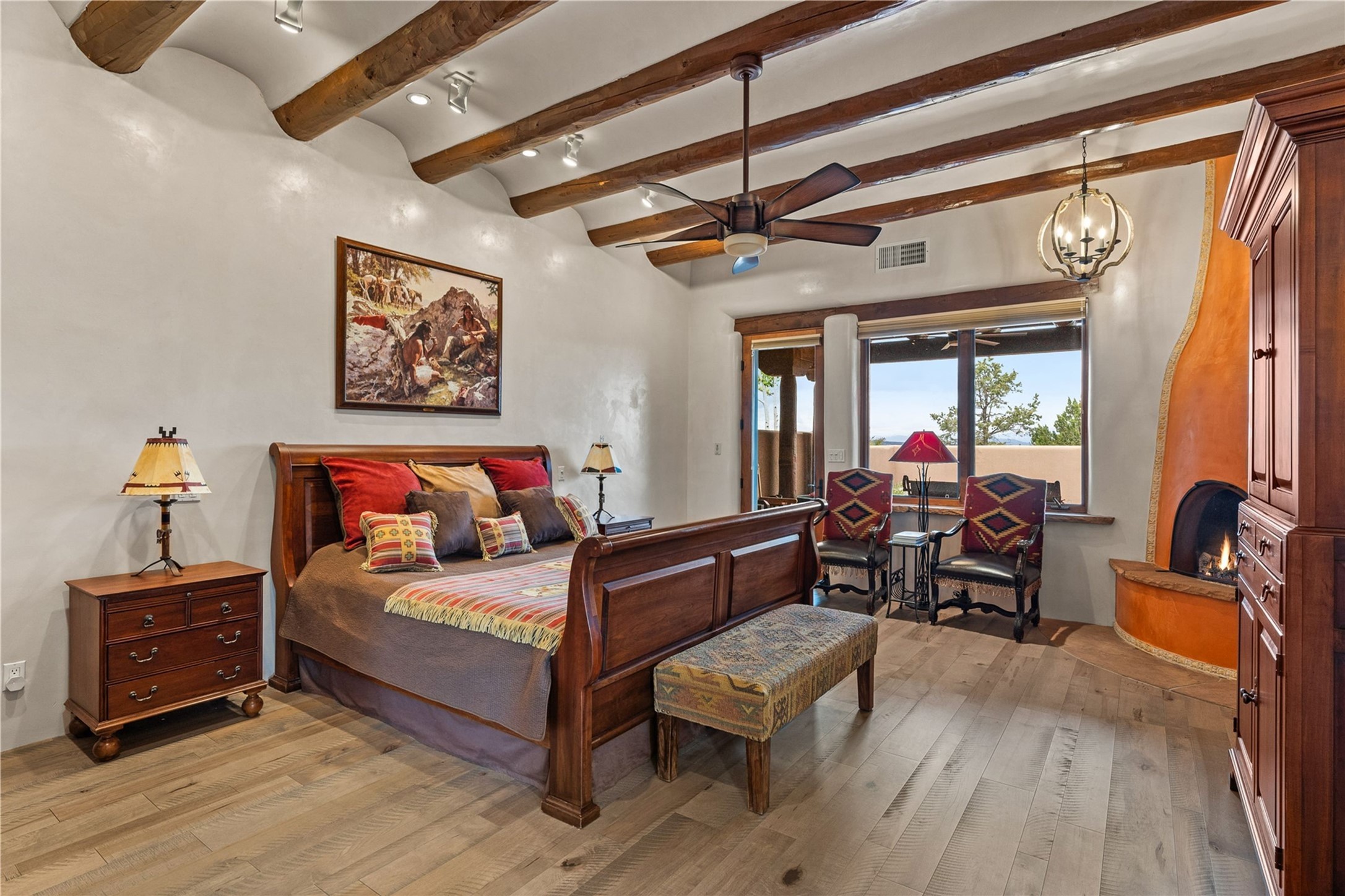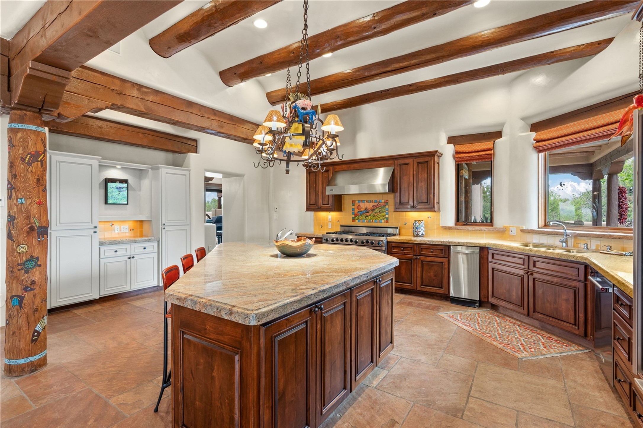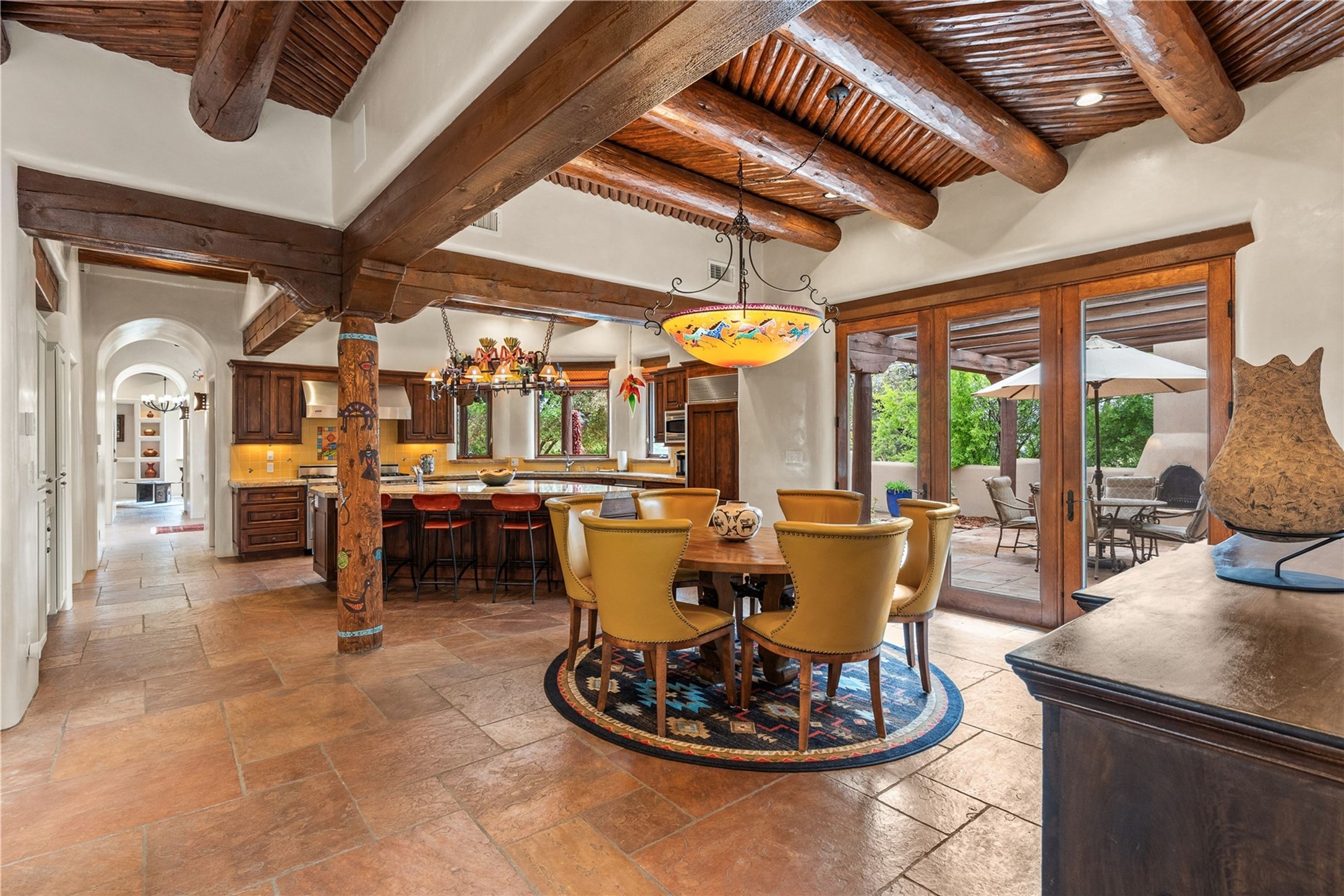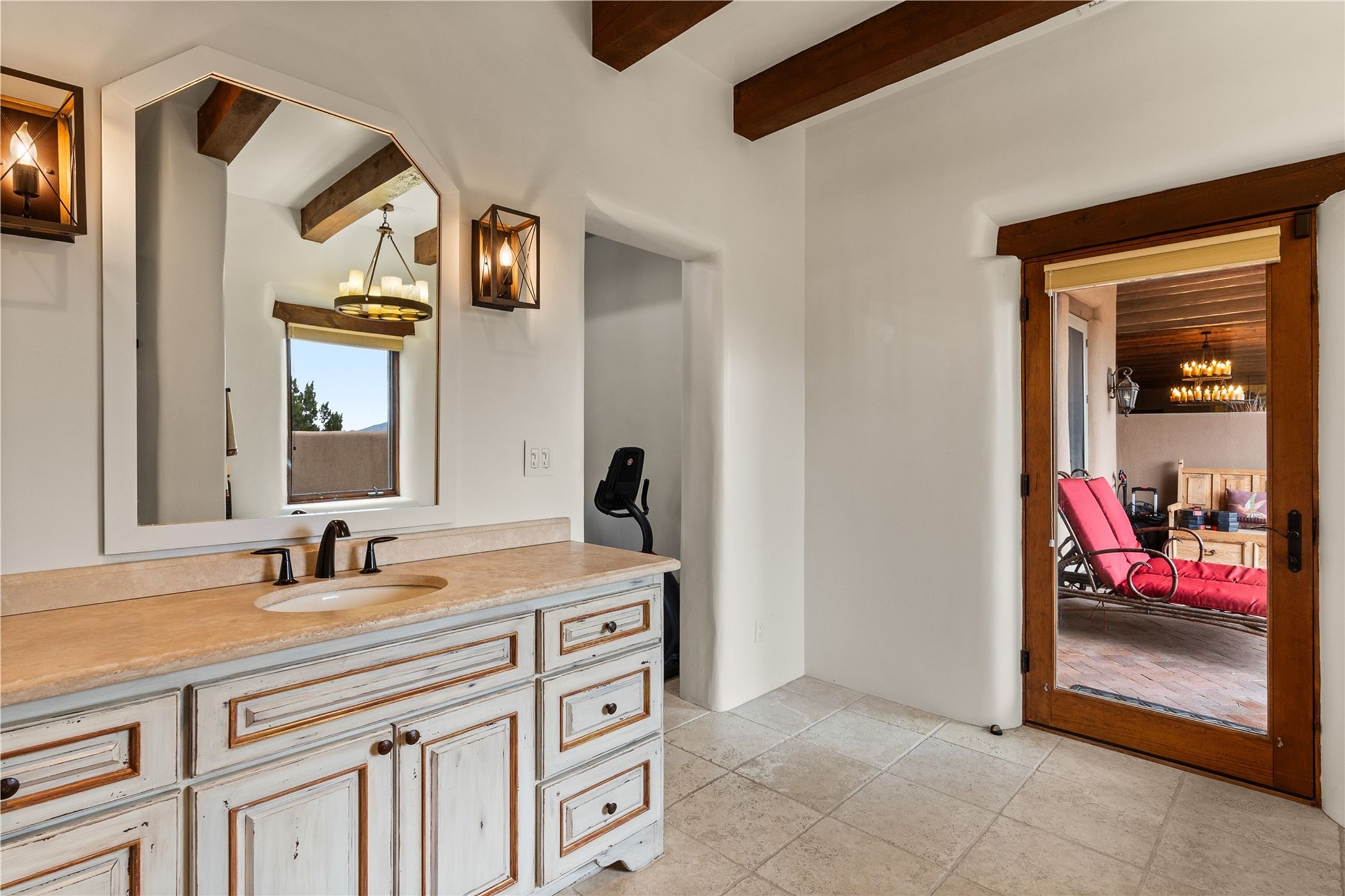 For those seeking the best of Santa Fe, this elegant and classic property delivers quality in every aspect. Set on 2.26 acres in Las Campanas, the 3-bedroom main residence, the beautifully appointed casita, and the masterfully conceived and executed outdoor areas come together to make this a special property. The ideal floorplan sets the grand primary bedroom suite, exercise room, and office opposite the house from the two generous guest suites. Between, are both informal and formal dining and living areas, creating spaces for the spectrum of living with the home. The casita is perfectly distanced to create privacy while providing easy access to the main house through a private courtyard. All the rooms are connected intuitively without a single step. The home is constructed with pumice-crete, a material known for excellent temperature insulation, natural flame resistance, and effective sound dampening. The kitchen serves as a warm and welcoming focal point, while the main living areas (living room, dining room & den) all provide beautiful views of the inspiring sunsets and Jemez Mountains. In addition to the dramatic walled and gated entry courtyard that captures eastern views, the main western portal is one of the most appealing outdoor living/entertaining spaces in all of Santa Fe. Radiant heat, air conditioning, and the three vehicle garage are other details that make this property an ideal primary residence or vacation home. The thoughtfully planned layout, coupled with the impeccable quality create great value for the next owner whether they want to enjoy it as is or bring upon it their own vision. A newly installed roof with a 10-year transferable warranty adds peace of mind for the next owner.