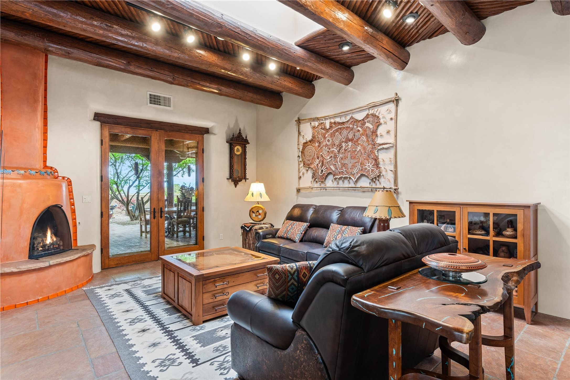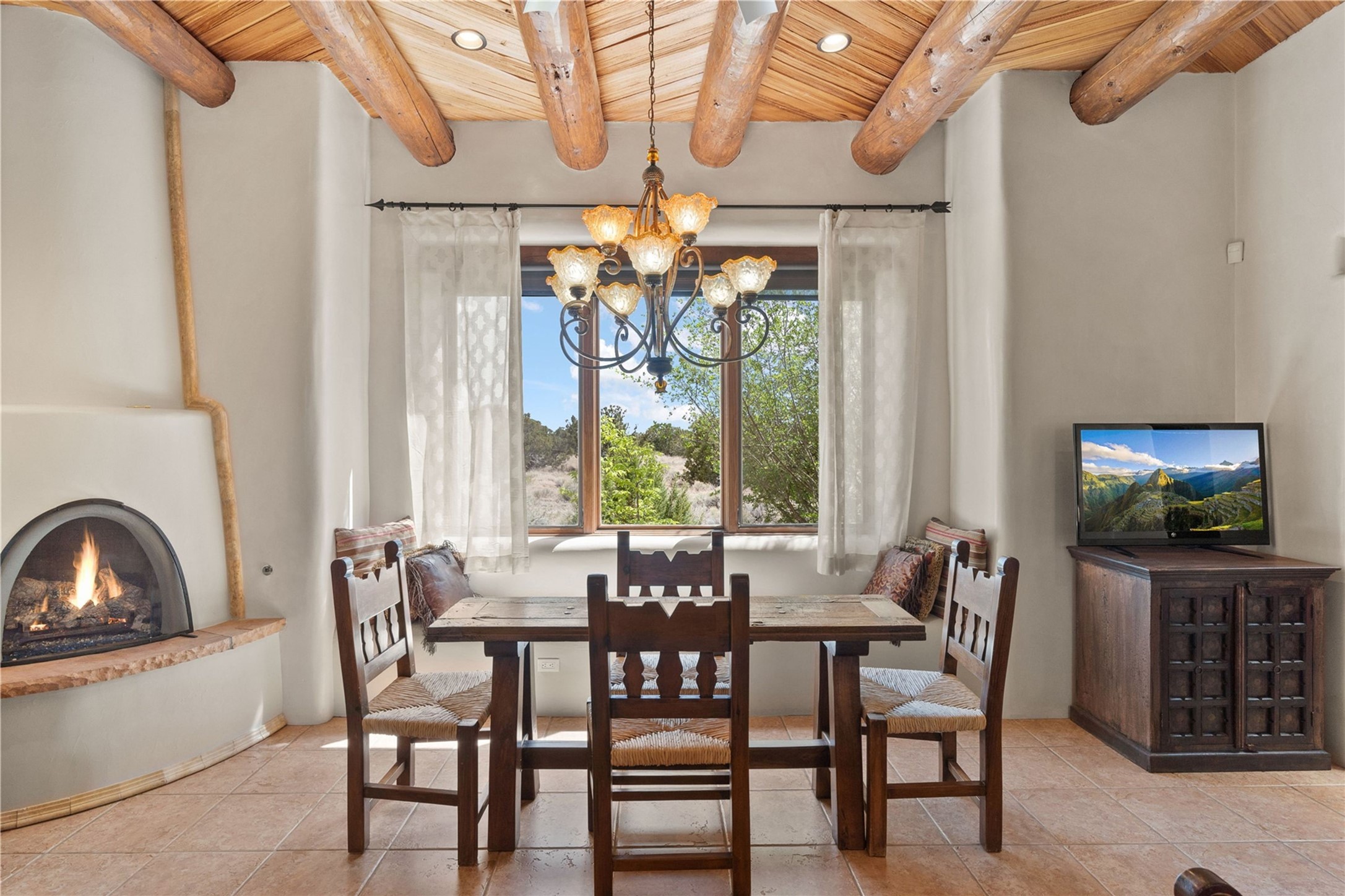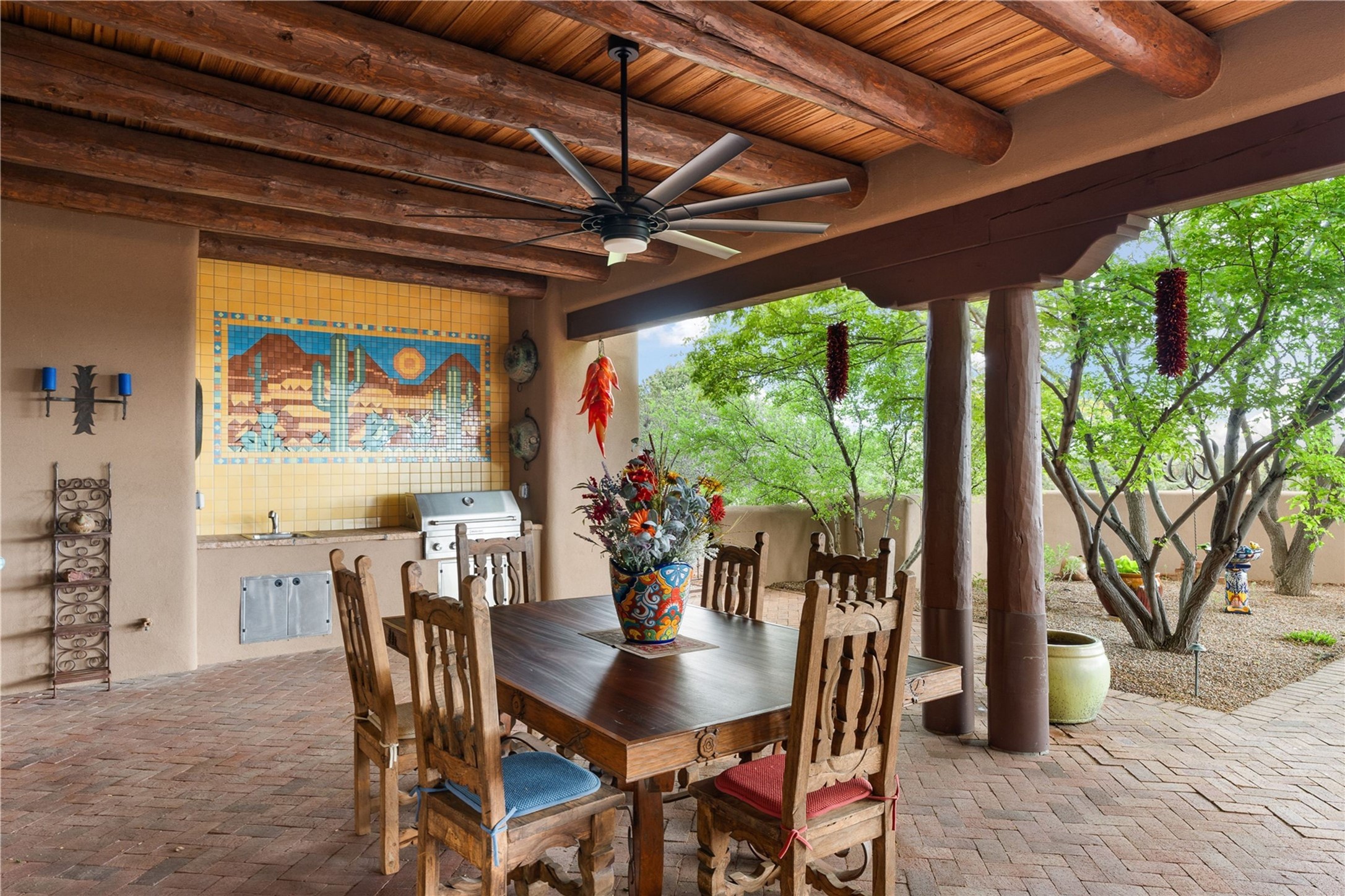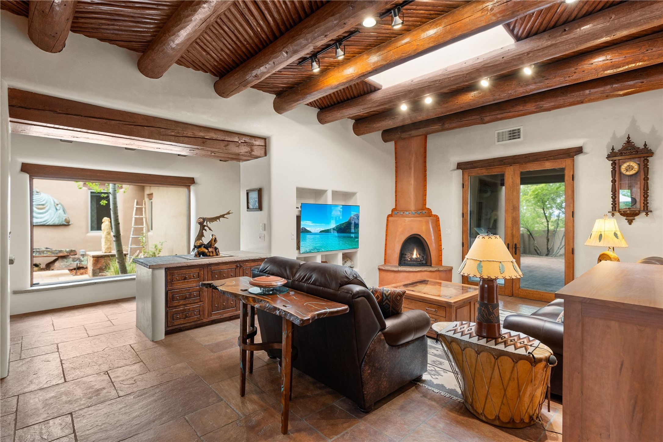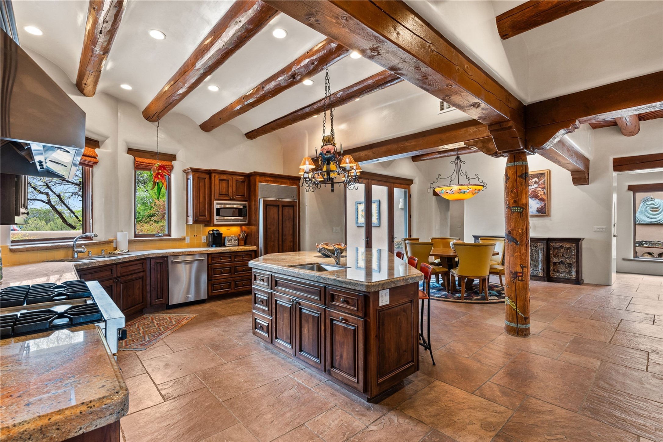 For those seeking the best of Santa Fe, this elegant and classic property delivers quality in every aspect. Set on 2.26 acres in Las Campanas, the 3-bedroom main residence, the beautifully appointed casita, and the masterfully conceived and executed outdoor areas come together to make this a special property. The ideal floorplan sets the grand primary bedroom suite, exercise room, and office opposite the house from the two generous guest suites. Between, are both informal and formal dining and living areas, creating spaces for the spectrum of living with the home. The casita is perfectly distanced to create privacy while providing easy access to the main house through a private courtyard. All the rooms are connected intuitively without a single step. The home is constructed with pumice-crete, a material known for excellent temperature insulation, natural flame resistance, and effective sound dampening. The kitchen serves as a warm and welcoming focal point, while the main living areas (living room, dining room & den) all provide beautiful views of the inspiring sunsets and Jemez Mountains. In addition to the dramatic walled and gated entry courtyard that captures eastern views, the main western portal is one of the most appealing outdoor living/entertaining spaces in all of Santa Fe. Radiant heat, air conditioning, and the three vehicle garage are other details that make this property an ideal primary residence or vacation home. The thoughtfully planned layout, coupled with the impeccable quality create great value for the next owner whether they want to enjoy it as is or bring upon it their own vision. A newly installed roof with a 10-year transferable warranty adds peace of mind for the next owner.