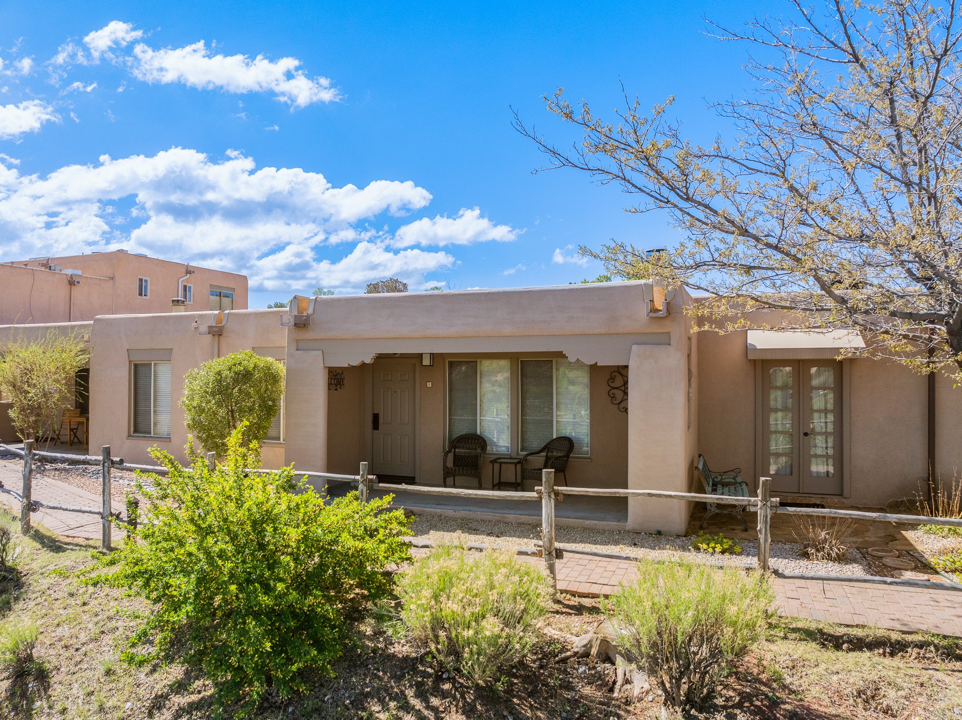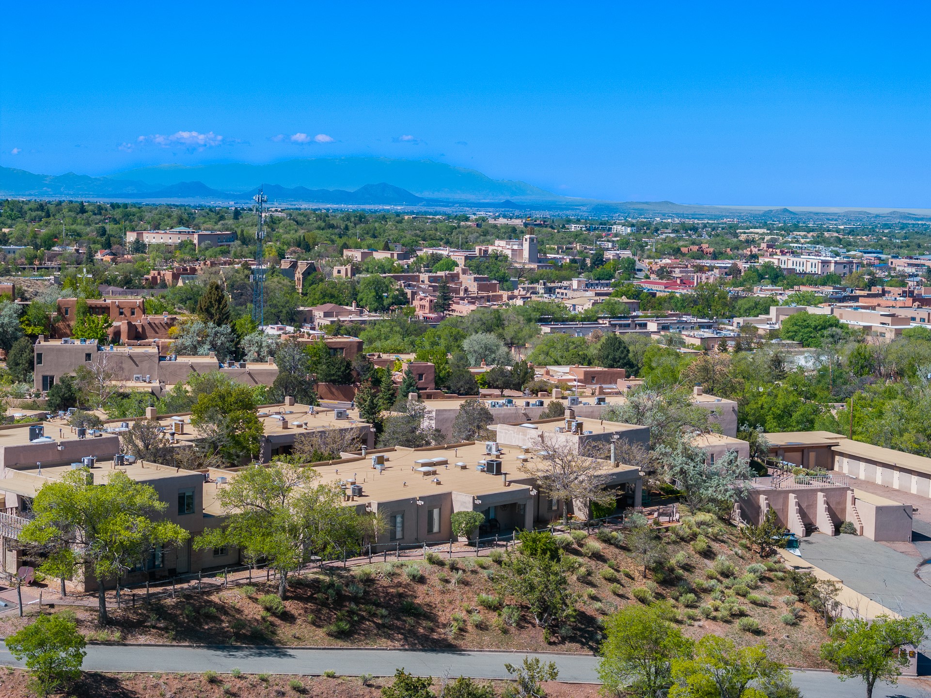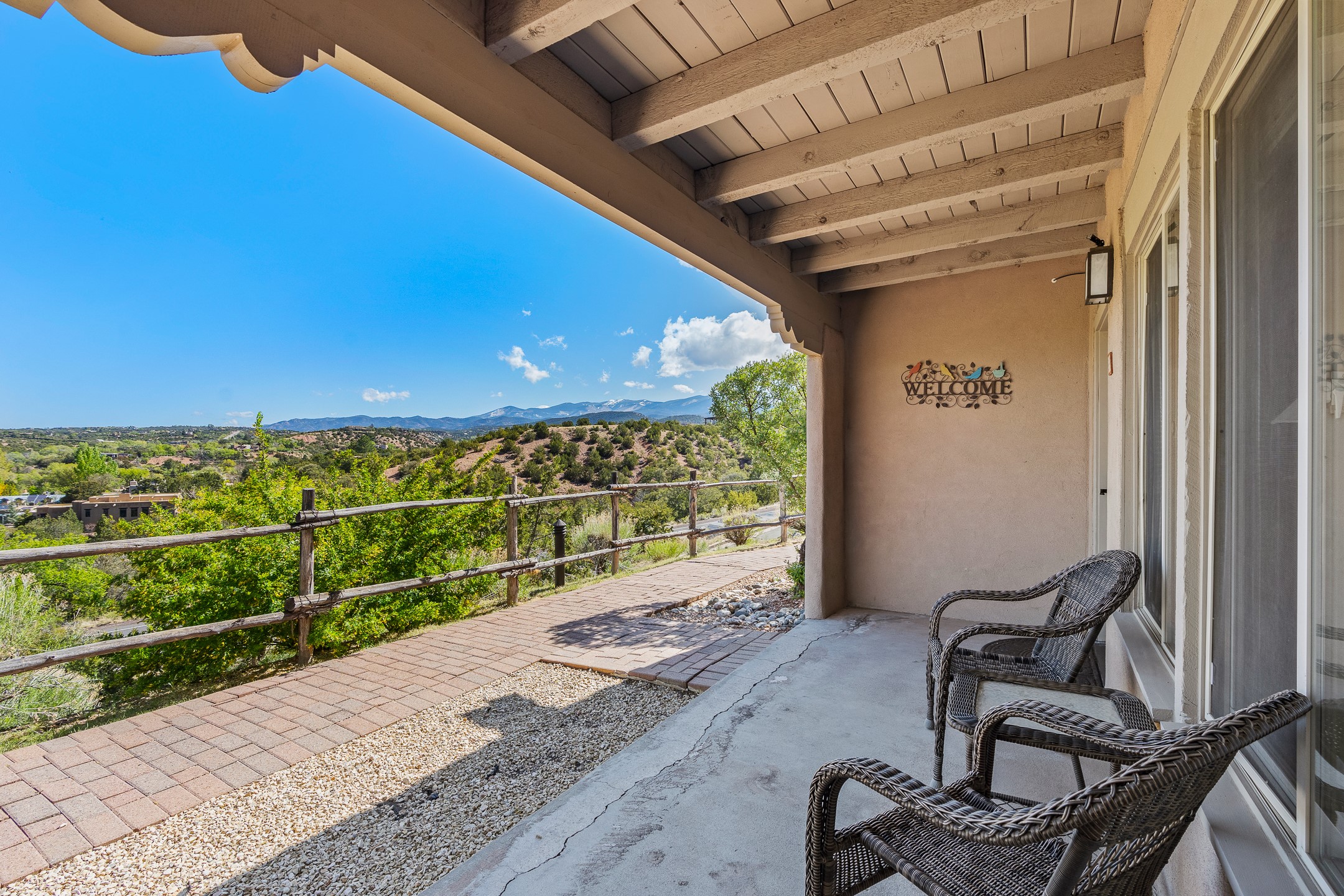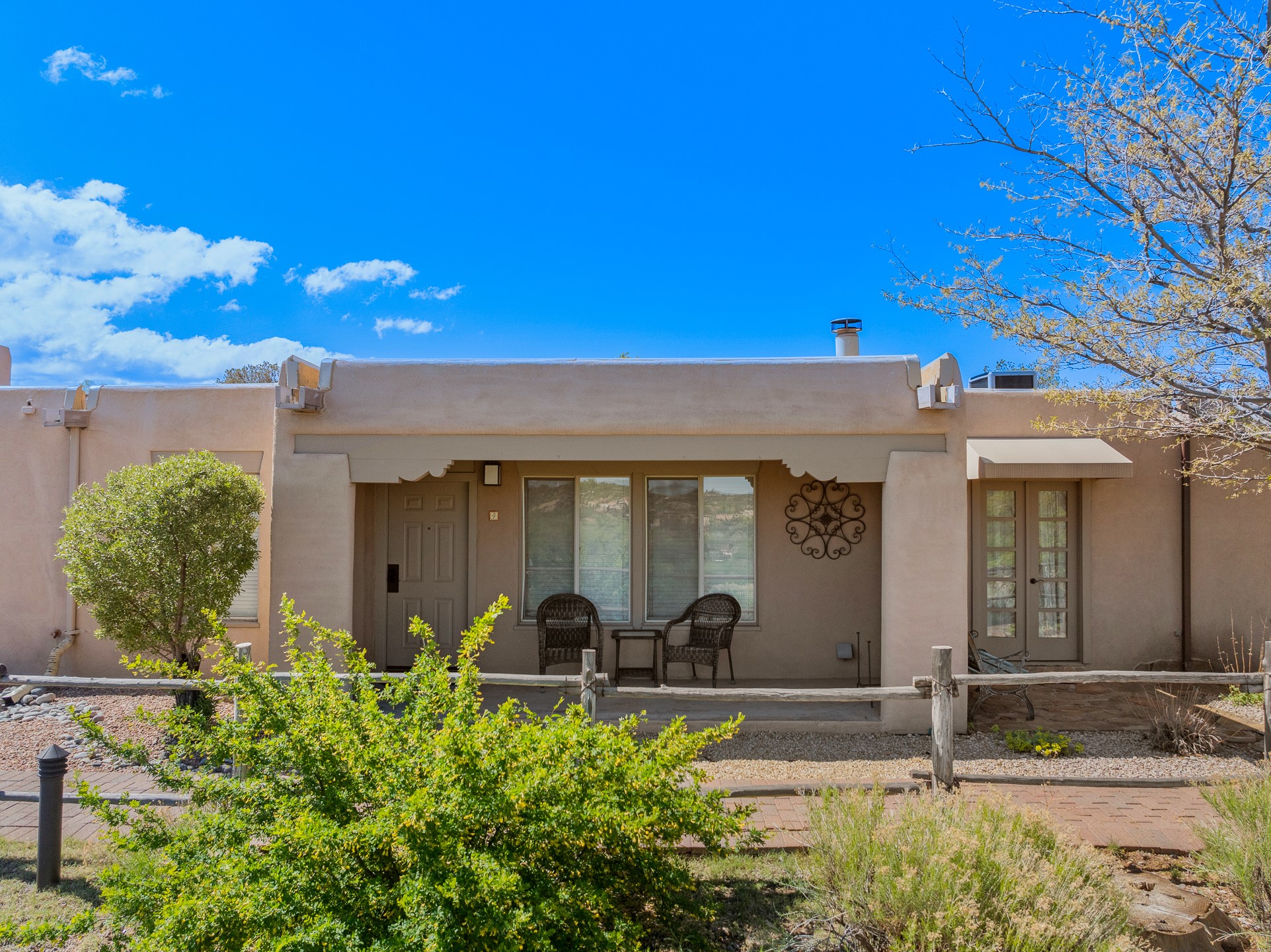 Walk to the plaza from this extremely comfortable single level, 2 bedroom, 2 bath condo with sweeping views! Also has convenient, nearby parking, with NO STEPS! All tile flooring throughout, NO carpeting, beamed ceiling in LR, custom tile countertops and showers. Hand-made cabinets too. Skylights and large, new windows bring in lots of natural light. Stay cozy on cool nights with the wood burning kiva, and cool in the warmer months with the new central refrigerated air-conditioning. This condo offers hard to find amenities in the downtown area: ample parking, easy access, awesome views, single level living, all appliances, including Bosch washer/dryer, and ALL FURNISHINGS INCLUDED!. Perfect vacation home, or full-time residence. On-site management offers a short-term vacation rental program. HOA does not restrict rentals. New roof in 2024. New HVAC in 2025.