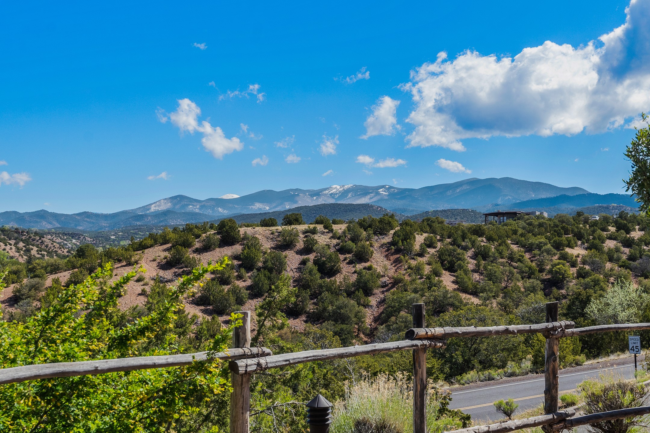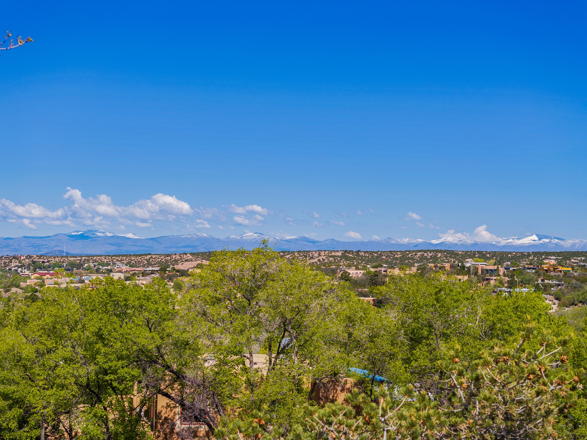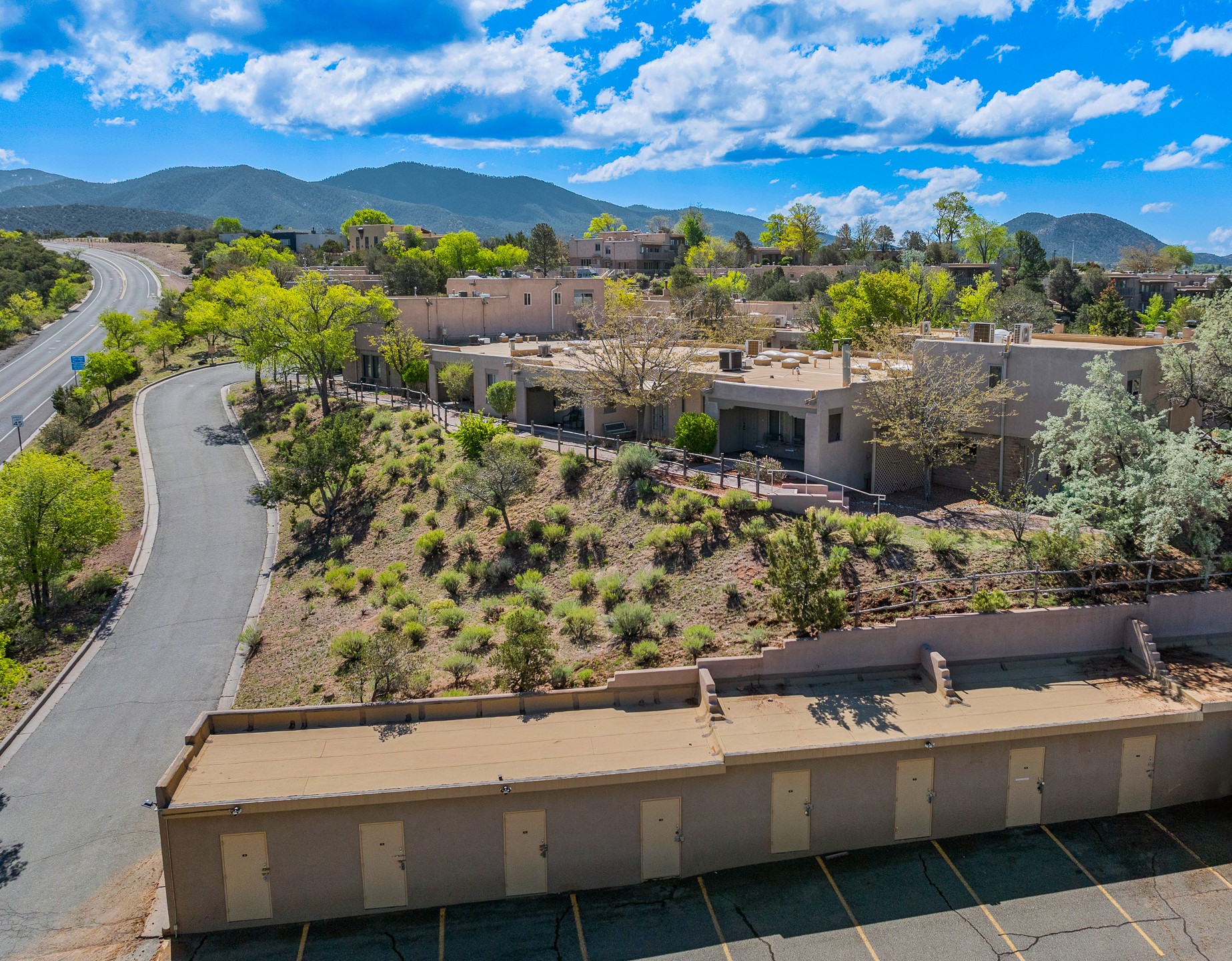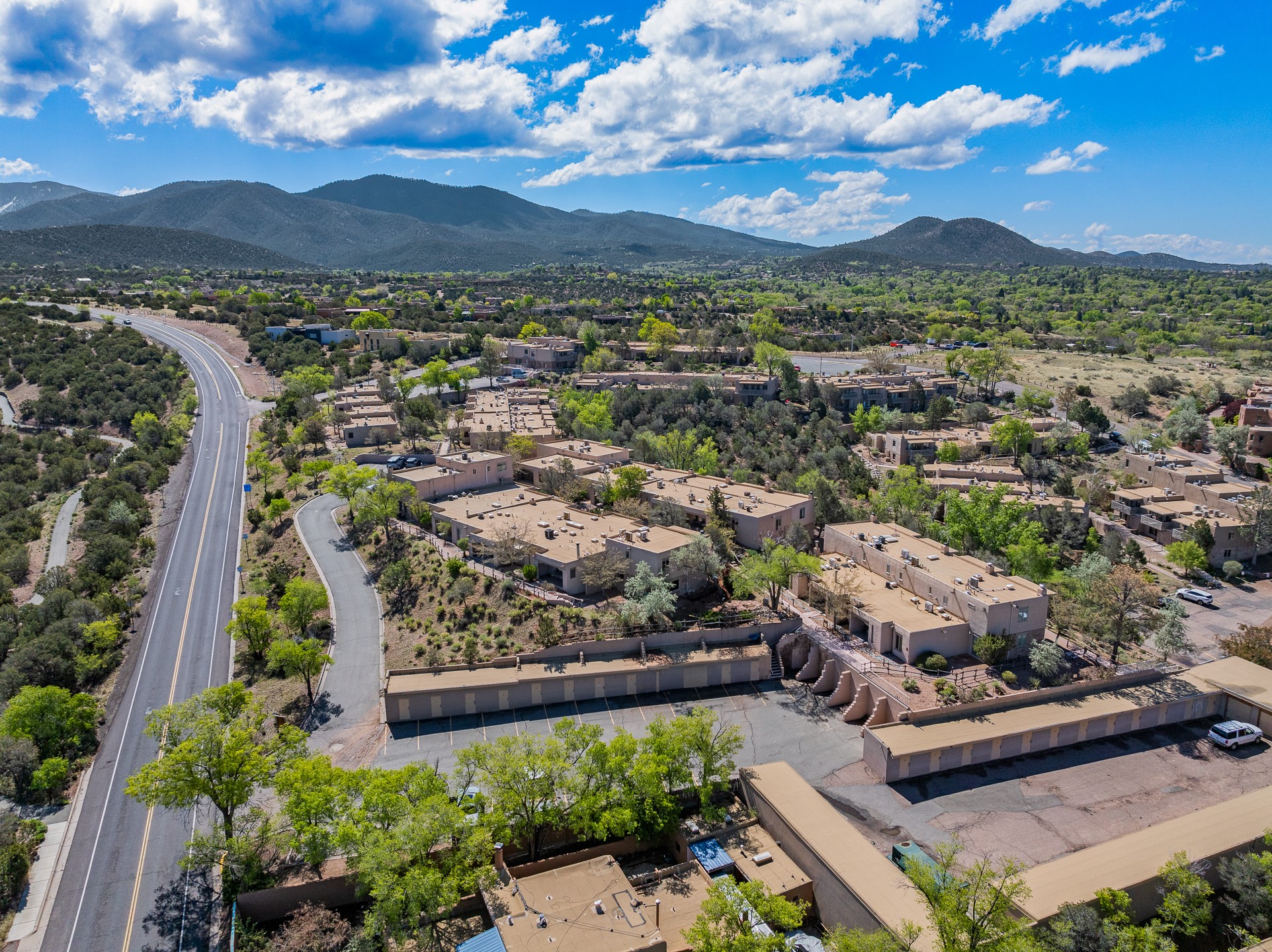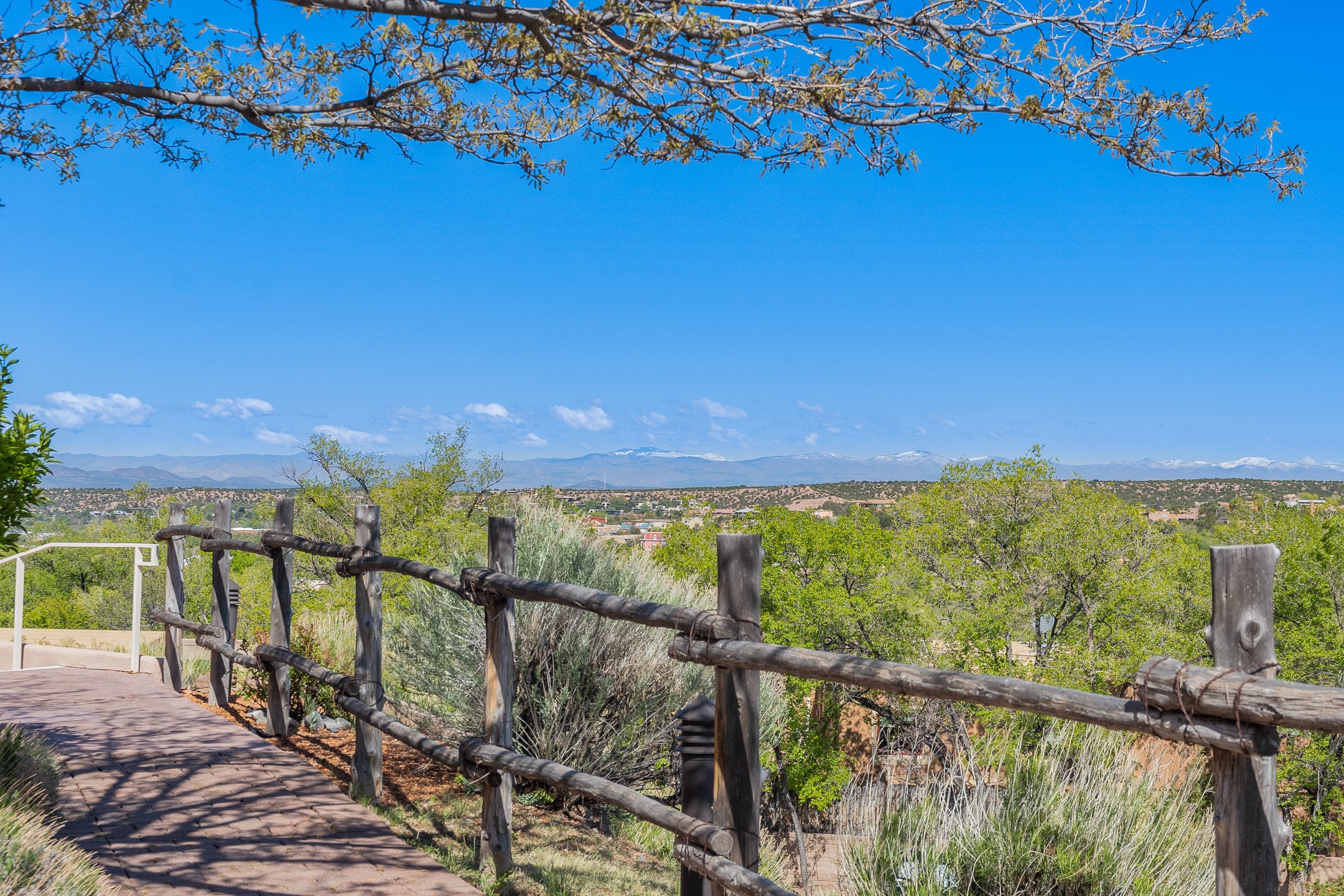 Walk to the plaza from this extremely comfortable single level, 2 bedroom, 2 bath condo with sweeping views! Also has convenient, nearby parking, with NO STEPS! All tile flooring throughout, NO carpeting, beamed ceiling in LR, custom tile countertops and showers. Hand-made cabinets too. Skylights and large, new windows bring in lots of natural light. Stay cozy on cool nights with the wood burning kiva, and cool in the warmer months with the new central refrigerated air-conditioning. This condo offers hard to find amenities in the downtown area: ample parking, easy access, awesome views, single level living, all appliances, including Bosch washer/dryer, and ALL FURNISHINGS INCLUDED!. Perfect vacation home, or full-time residence. On-site management offers a short-term vacation rental program. HOA does not restrict rentals. New roof in 2024. New HVAC in 2025.