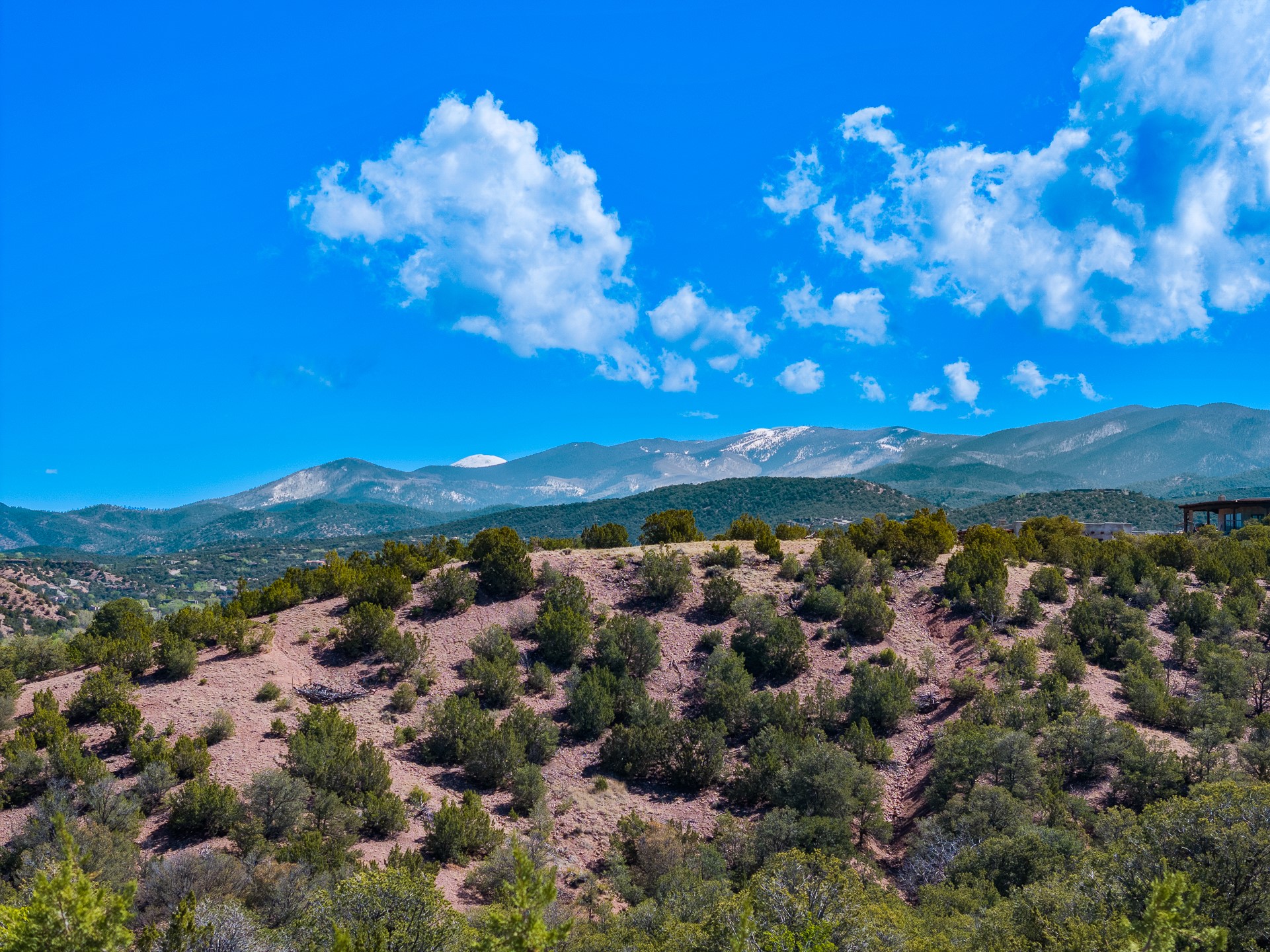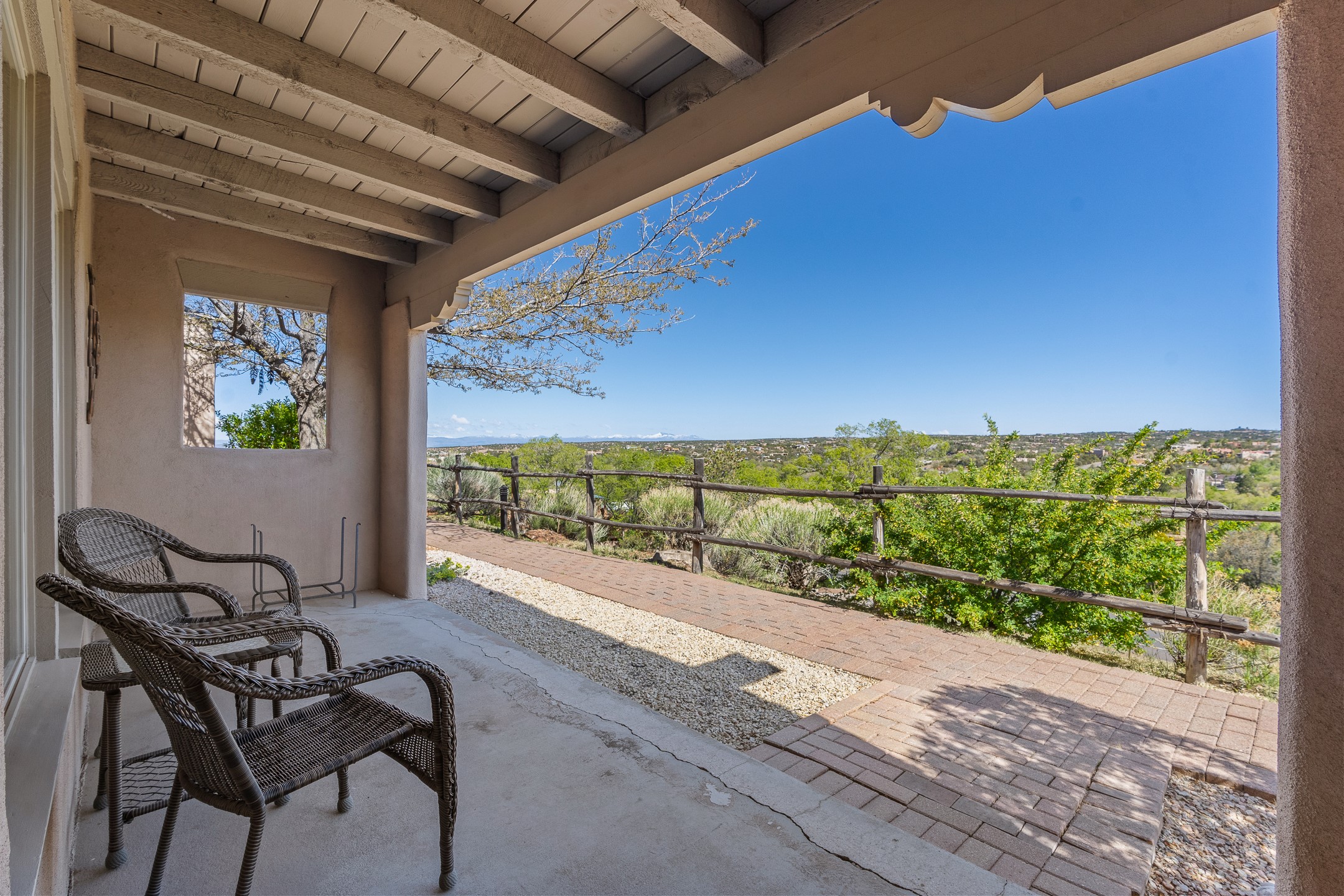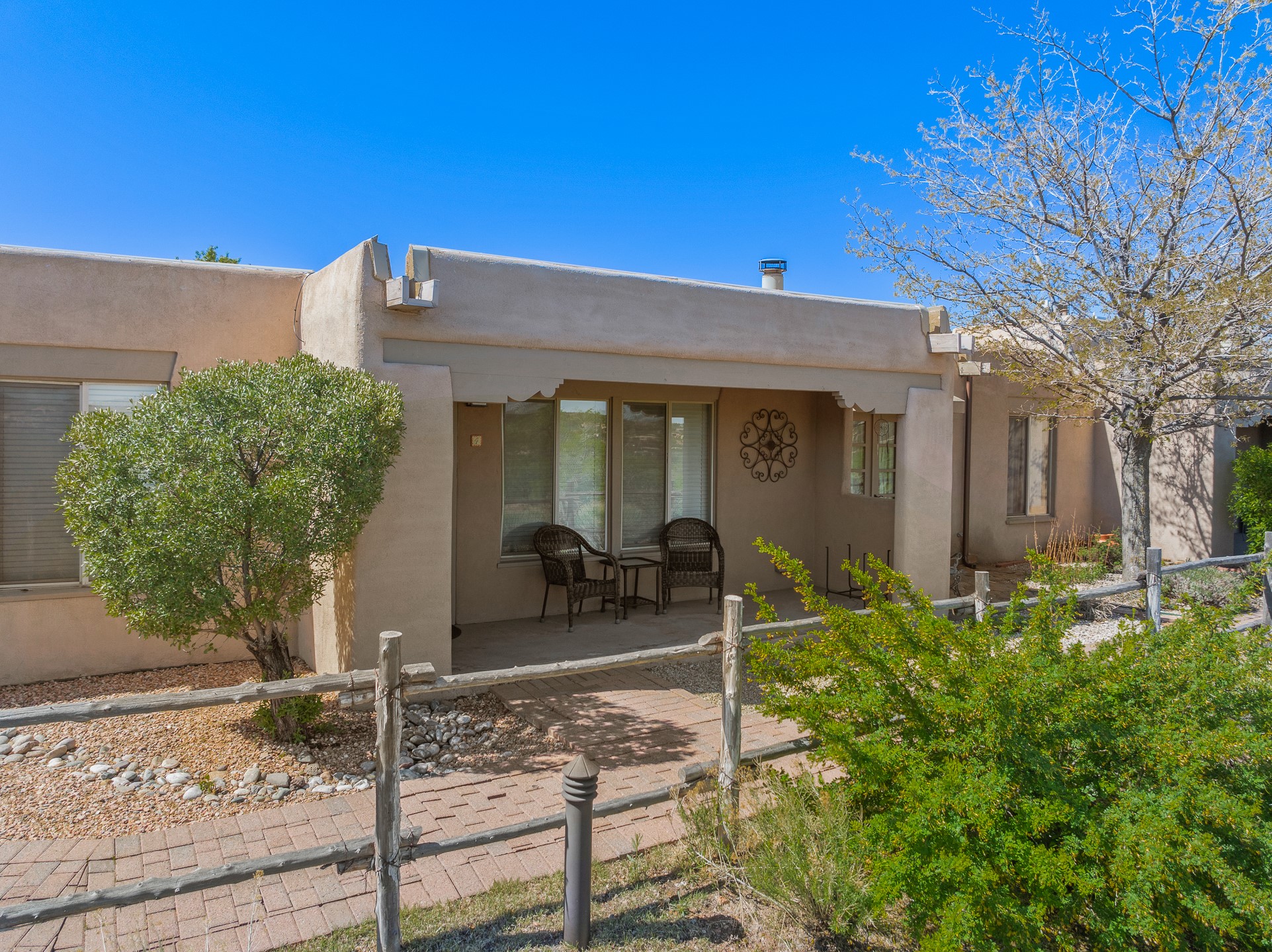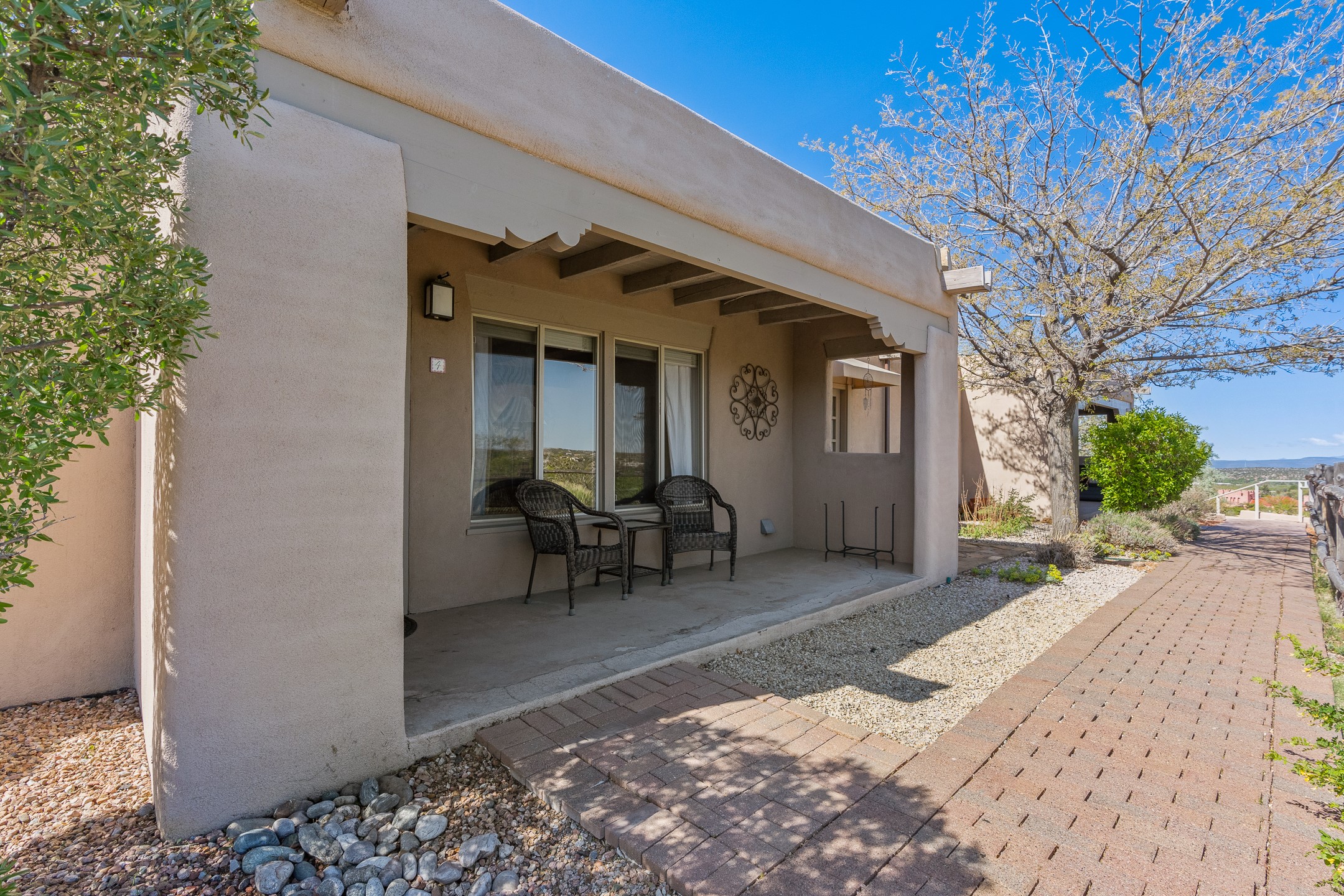 Walk to the plaza from this extremely comfortable single level, 2 bedroom, 2 bath condo with sweeping views! Also has convenient, nearby parking, with NO STEPS! All tile flooring throughout, NO carpeting, beamed ceiling in LR, custom tile countertops and showers. Hand-made cabinets too. Skylights and large, new windows bring in lots of natural light. Stay cozy on cool nights with the wood burning kiva, and cool in the warmer months with the new central refrigerated air-conditioning. This condo offers hard to find amenities in the downtown area: ample parking, easy access, awesome views, single level living, all appliances, including Bosch washer/dryer, and ALL FURNISHINGS INCLUDED!. Perfect vacation home, or full-time residence. On-site management offers a short-term vacation rental program. HOA does not restrict rentals. New roof in 2024. New HVAC in 2025.