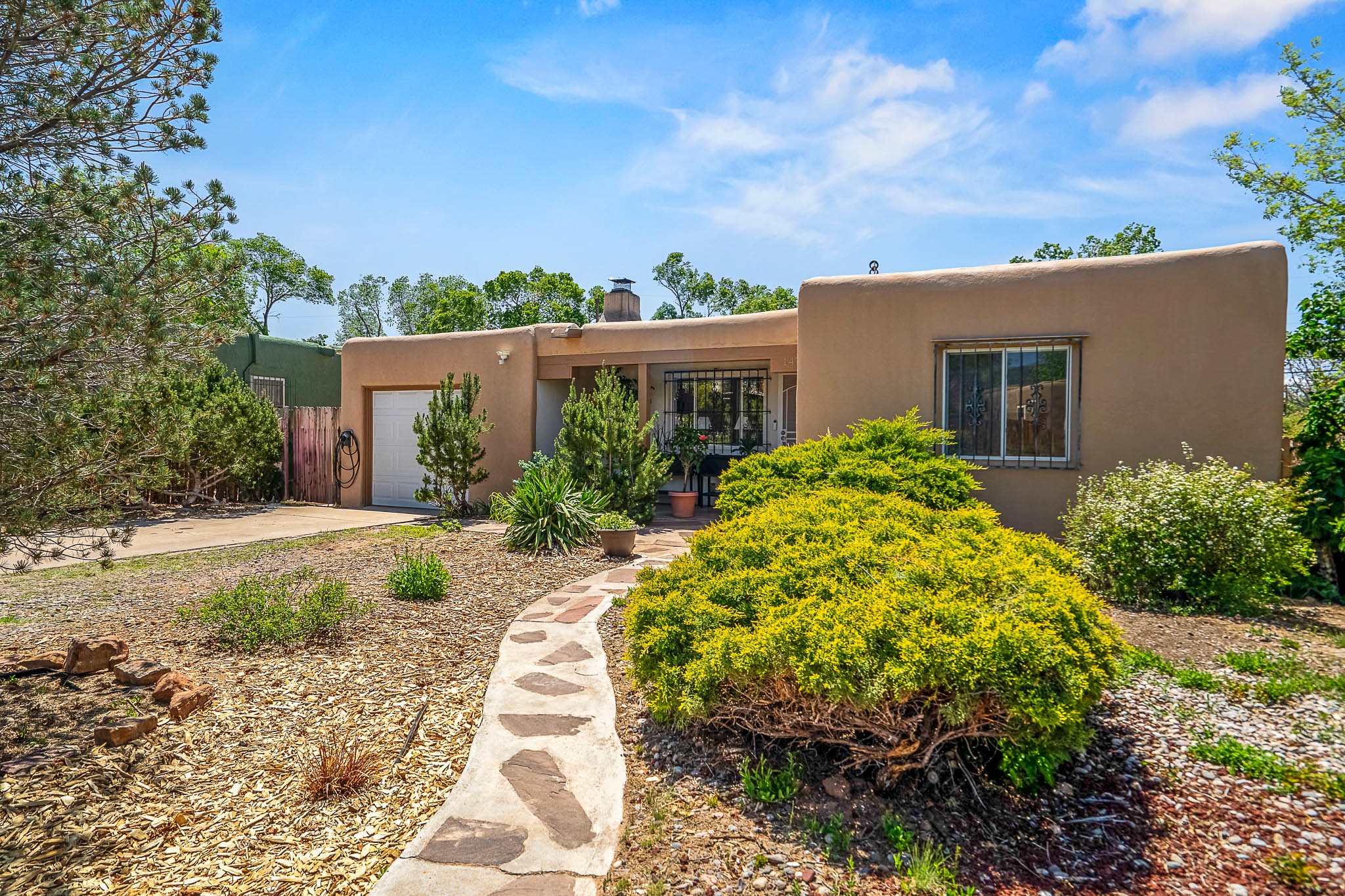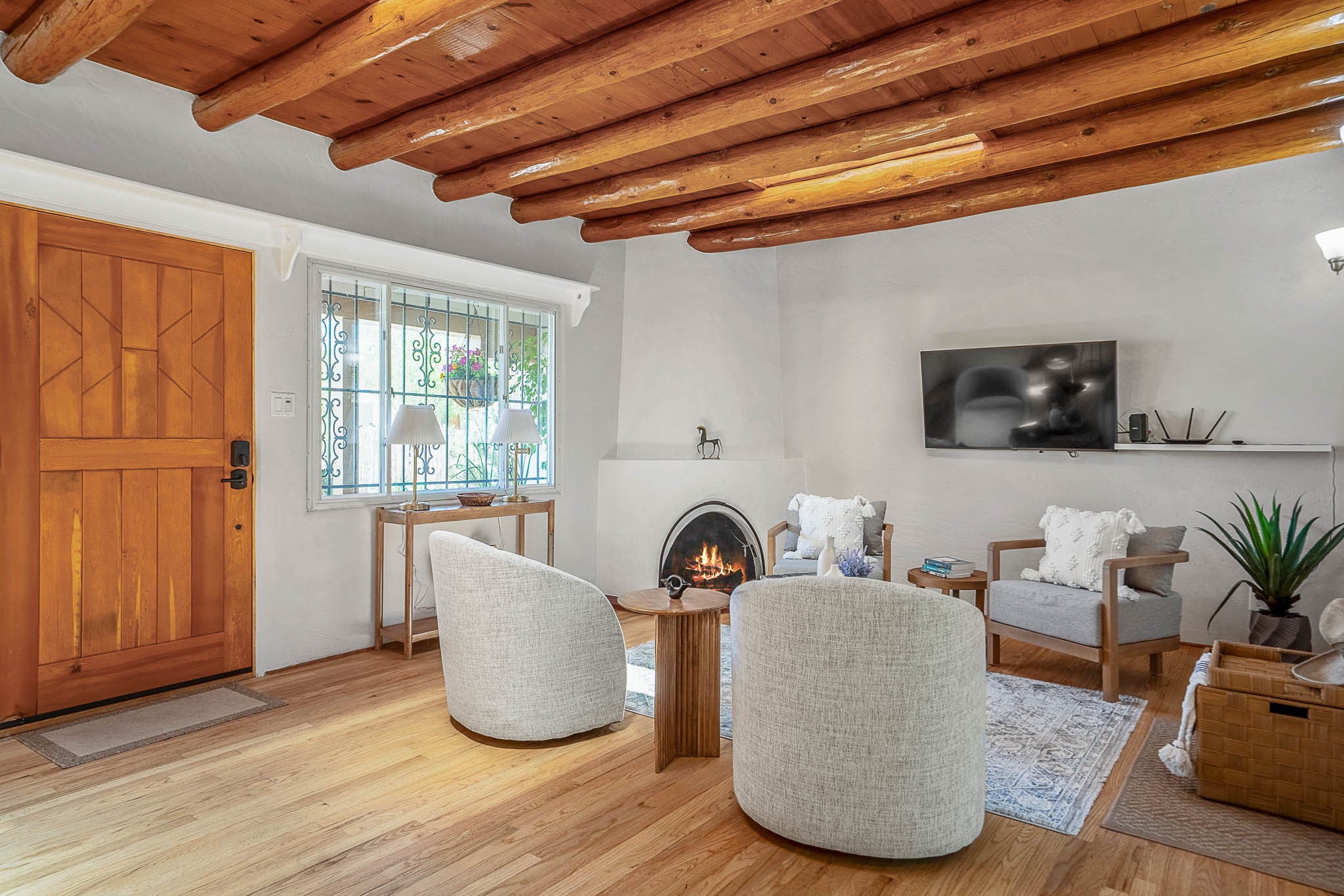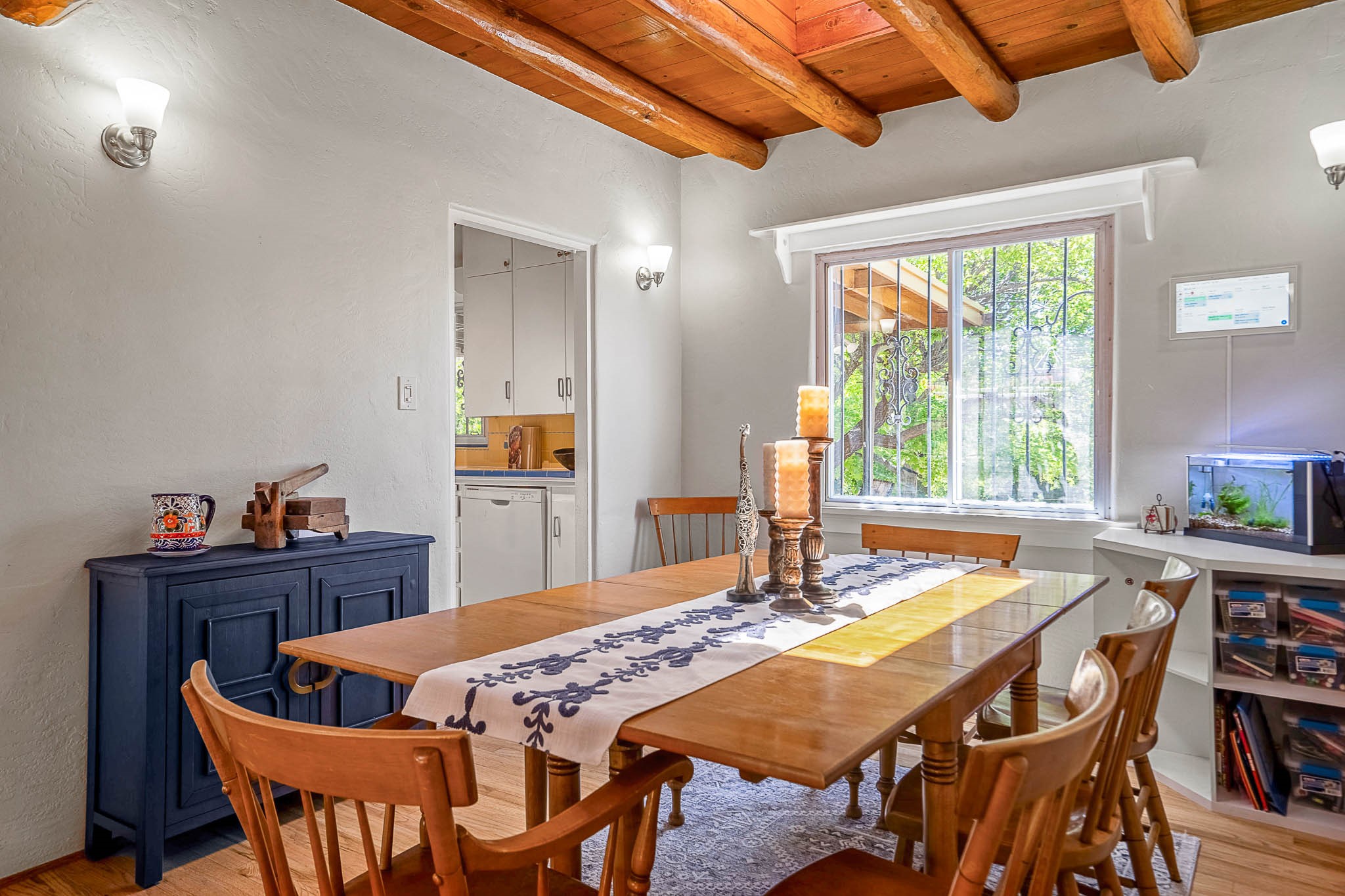 Classic Stamm located in the highly desirable Casa Linda neighborhood. This charming two-bedroom, one-bathroom home is situated within a well established Stamm neighborhood, known for its classic architectural style and central location.Inside, the residence boasts beautiful exposed vigas, original oak hardwood floors throughout (except in the kitchen), and a welcoming kiva wood-burning fireplace, complemented by a traditional nicho. The original solid wood front door has been thoughtfully restored, enhancing the home's unique character and creating a warm and inviting entry.This property also offers modern conveniences such as central cooling, forced air heating, a tankless water heater, and the added benefit of an electric car charger. Recent updates include a newer roof with a transferable 5-year warranty, and for future expansion, blueprints for a primary suite addition & carport are also included. The home is set on a spacious lot, providing ample outdoor living space.Given the desirability of Stamm homes in this area, they tend to be highly sought after and sell quickly. Schedule a showing today!