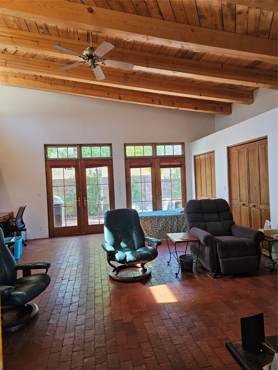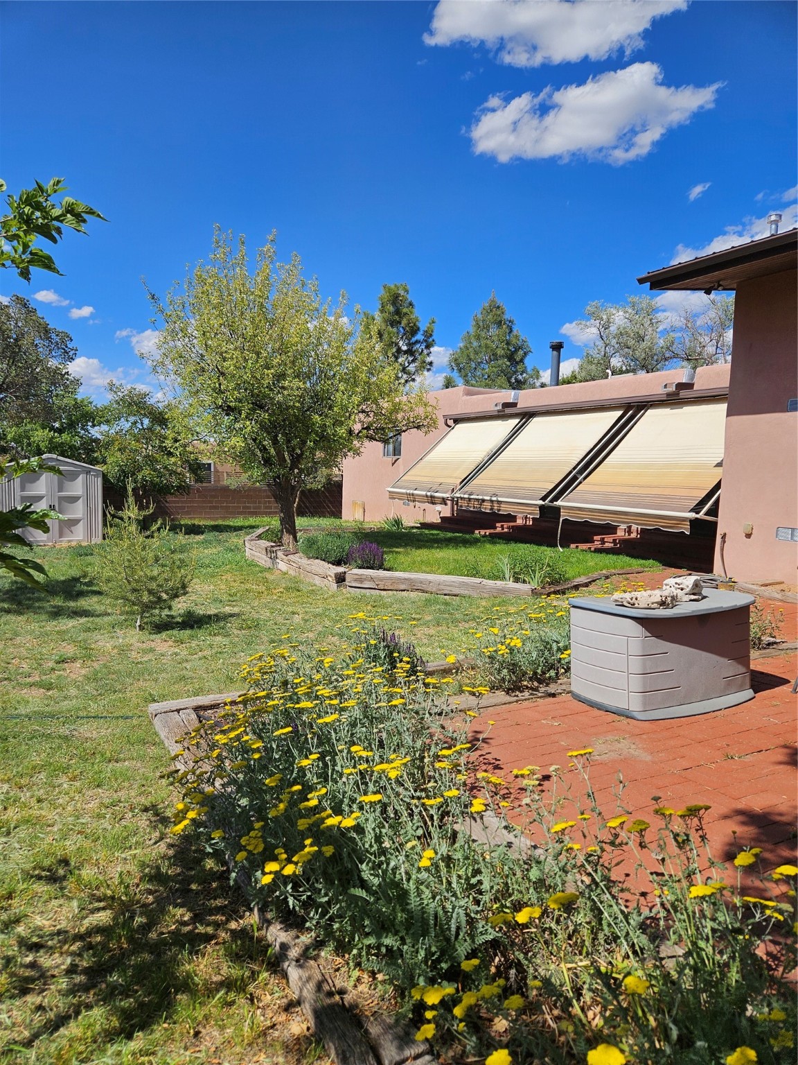 Calling All Investors! Great Location with a great price! Located in Via Caballero on a large, walled lot. Walk through the front door into a great entryway with a tall vigas ceiling, which is great for displaying artwork. This versatile single-level home features 3 bedrooms/2 1/2 baths, a living room, a den/studio/office with a tall beamed ceiling, lots of cabinets and storage with an exterior entrance, a dining room with a wood stove, and a bright eat-in kitchen. The main house has a flat roof over the main house, and a metal pitch roof on the mother-in-law quarters. Additionally, a laundry room with a new washer. The 2-car garage offers direct entry to the large entryway. Solar Panels (leased) keep the electric bill reasonable. Mature trees and a metal shed are a bonus! Enjoy the 2 apricot and 1 apple tree on .287 acres!
