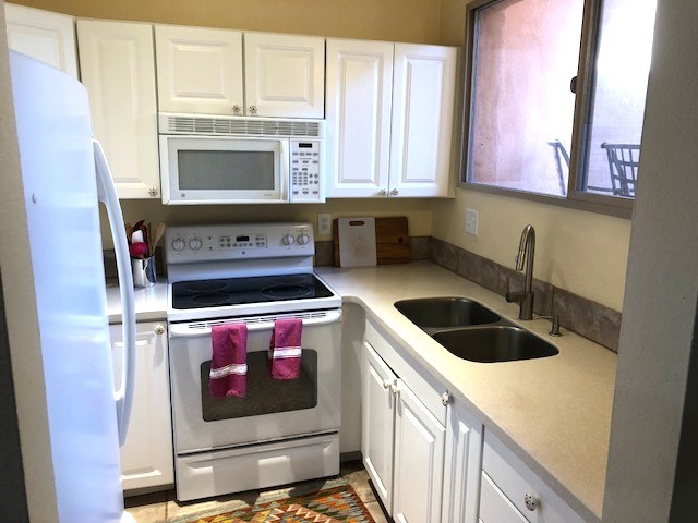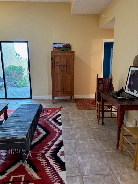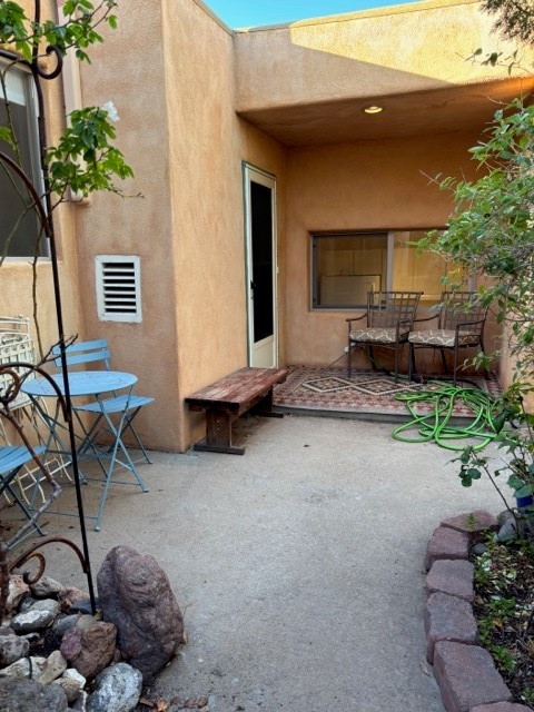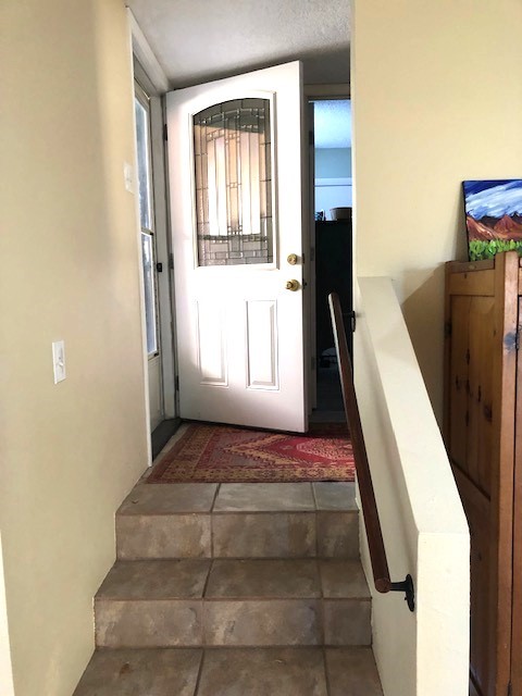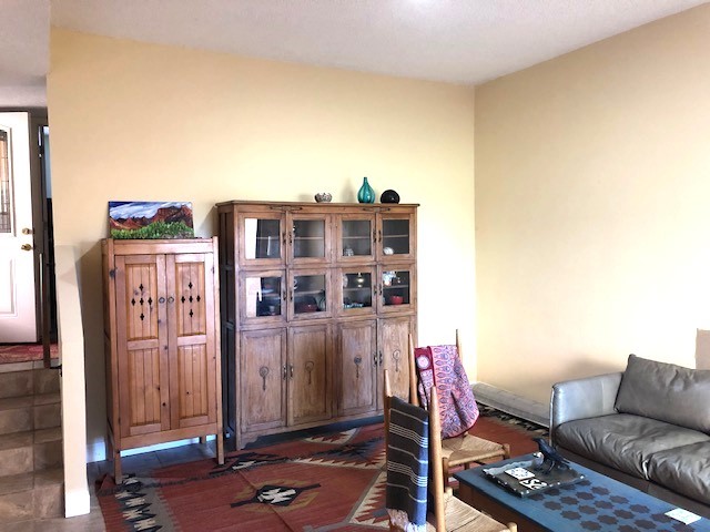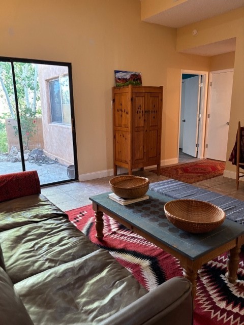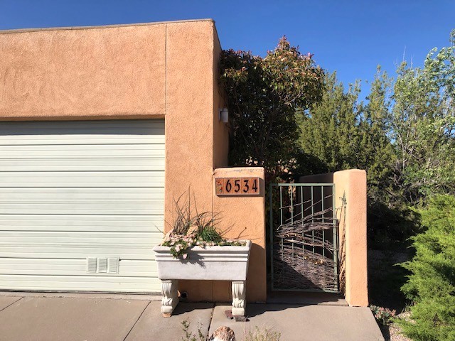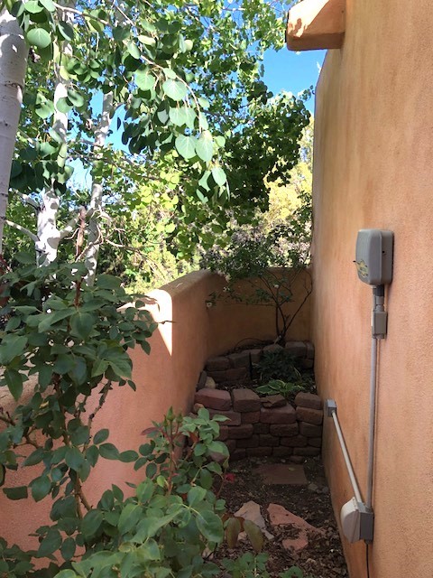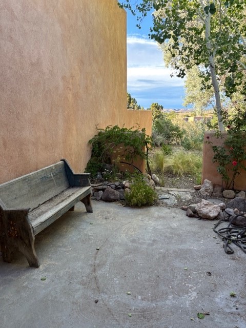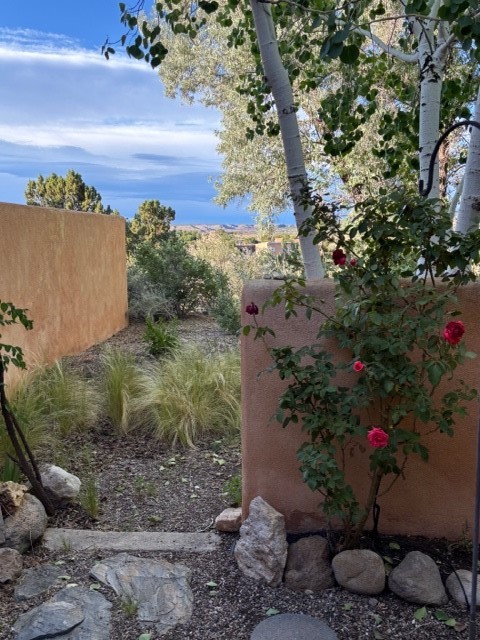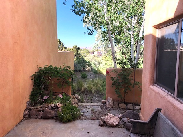 Located in the small, quiet community of Cochiti Lake, this townhouse is near the end of a cul-de-sac, with open space behind and beautiful views of the surrounding landscape. The two-car garage (where the laundry is) fronts on Tahawash, and you enter the home through a pedestrian gate by the garage or a door from the garage to the sidewalk. A sidewalk leads down to a small porch and landscaped sitting area outside the front door. Step into a foyer with one bedroom and a bathroom to the left. A couple of steps down take you to the kitchen and living area, and another bedroom and bathroom. The living room has high ceilings and an exit to a back semi-enclosed patio with views of open space. The community of Cochiti Lake is small but about halfway between Santa Fe and Albuquerque. It has its own library and golf course, and Cochiti Lake is less than a mile from the community.