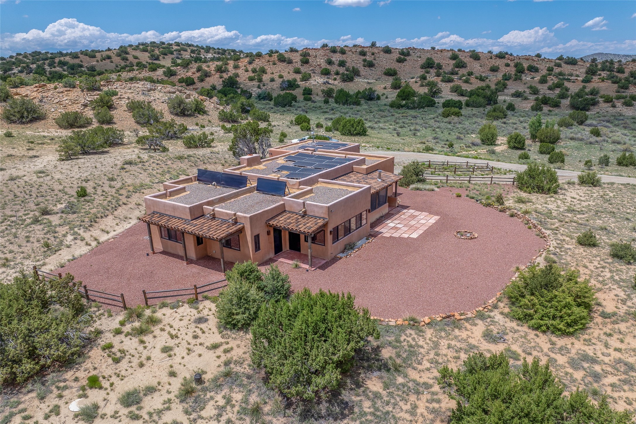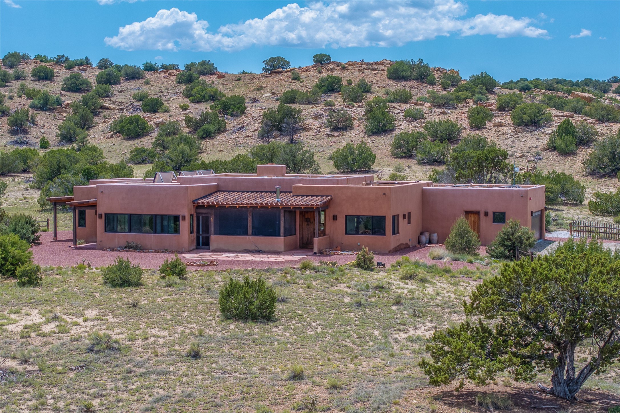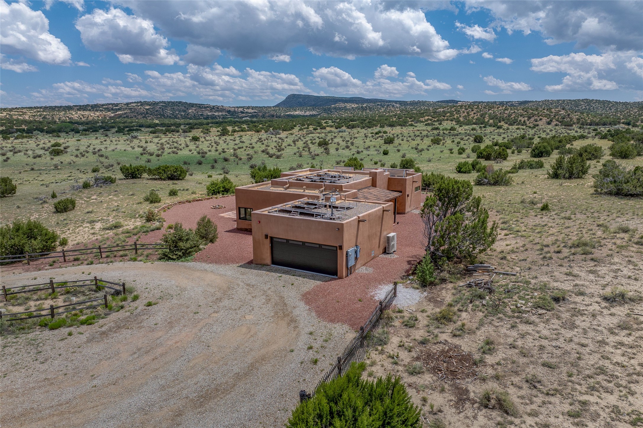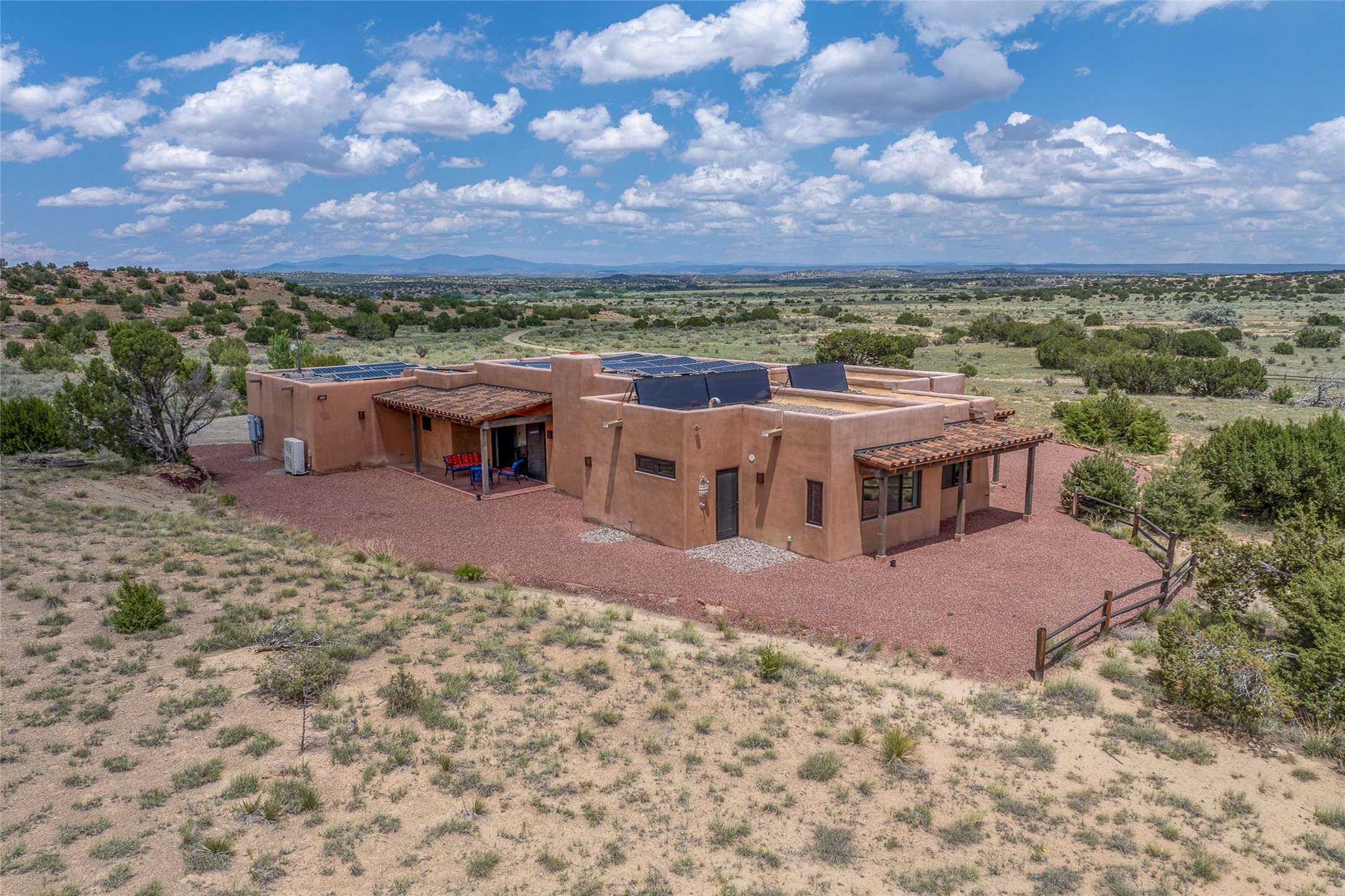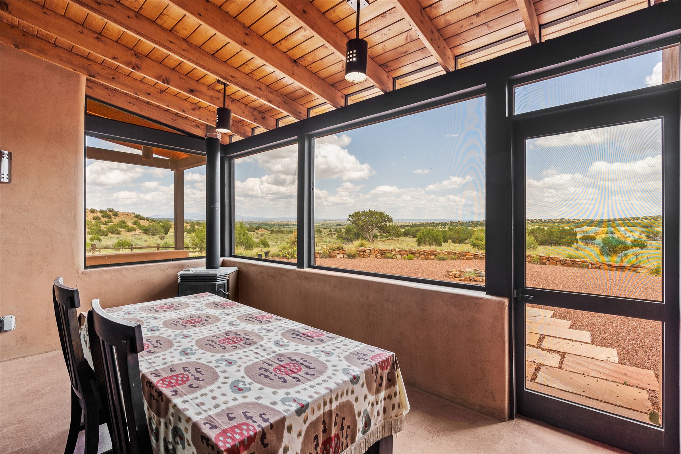 Nestled on 140 acres off the breathtaking scenic Turquoise Trail, this exceptional home blends modern elegance with serene pastoral beauty. Surrounded by expansive ranch land, it offers privacy and tranquility, where horses are welcome. The sweeping views, stunning rock formations, and pristine night skies create a truly peaceful retreat. Built in 2017, this "smart" home is designed for efficiency and comfort, featuring solar electric panels, solar radiant heating, and a grid connection. Mini-splits provide heating and cooling throughout, while stained concrete floors, handmade doors and beams from La Puerta Originals, and sleek design elements enhance the home's tranquil, minimalist aesthetic. The third bedroom, full of natural light, presents a perfect space for an artist's studio. The generously sized living area boasts an open floor plan, an inviting eat-in kitchen with sophisticated wine cooler, and a cozy kiva fireplace. Seamless indoor-outdoor living is achieved with multiple patios--both open and enclosed--including a screened-in dining space with a wood stove and patio heaters, along with an outdoor shower. Located south of Santa Fe, this rural haven offers convenient access to both Santa Fe and Albuquerque. It's also near the charming and historic villages of Madrid and Cerrillos, where vibrant restaurants, art galleries, summer farmers' markets, and two general stores bring local culture to life.