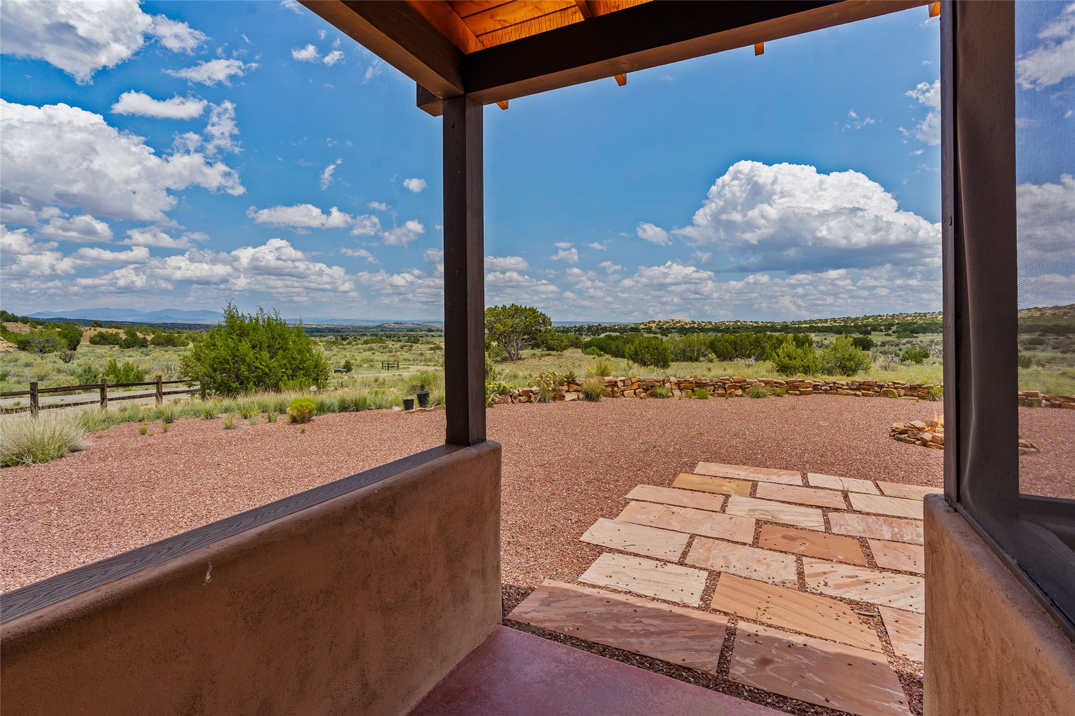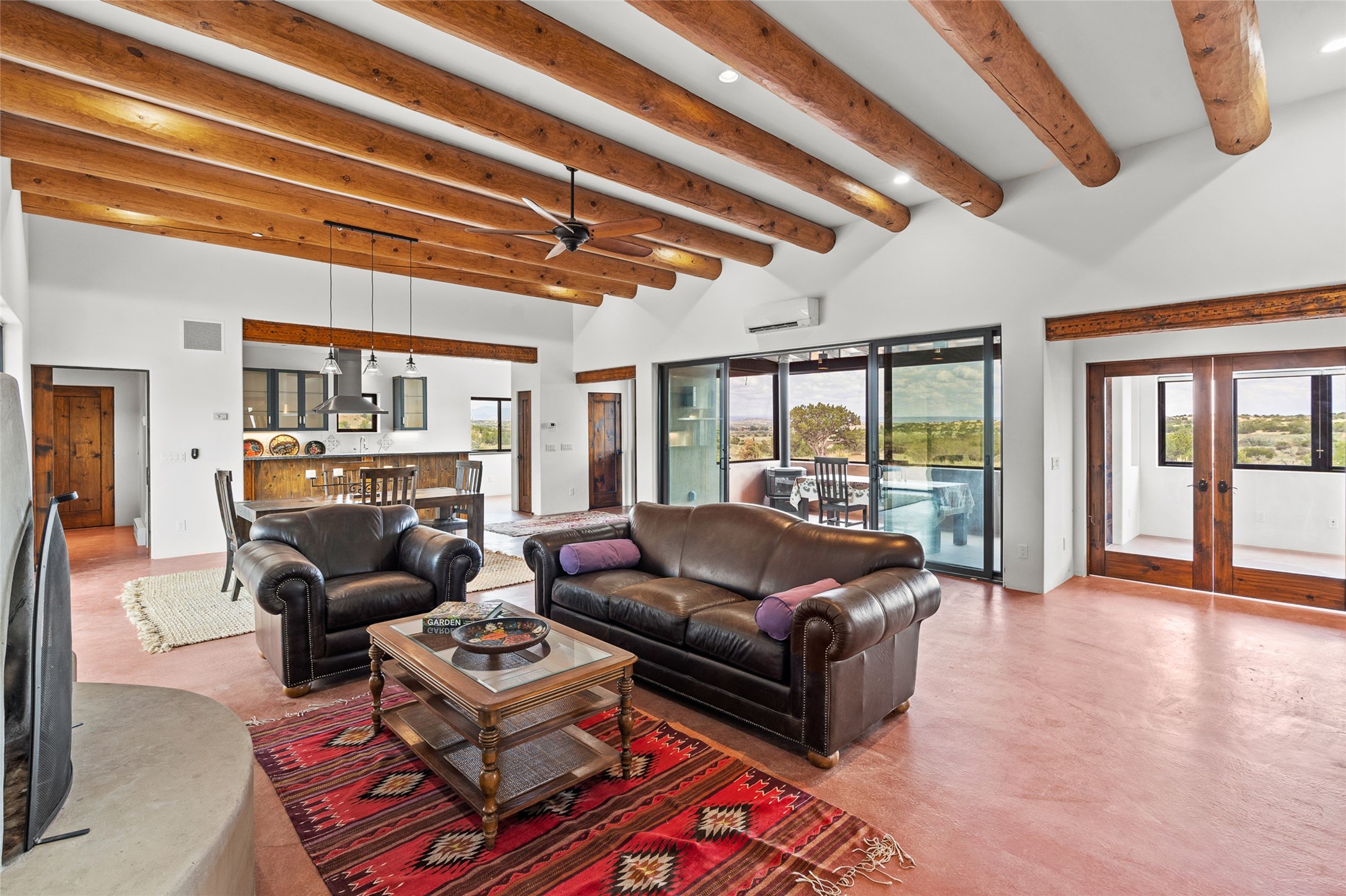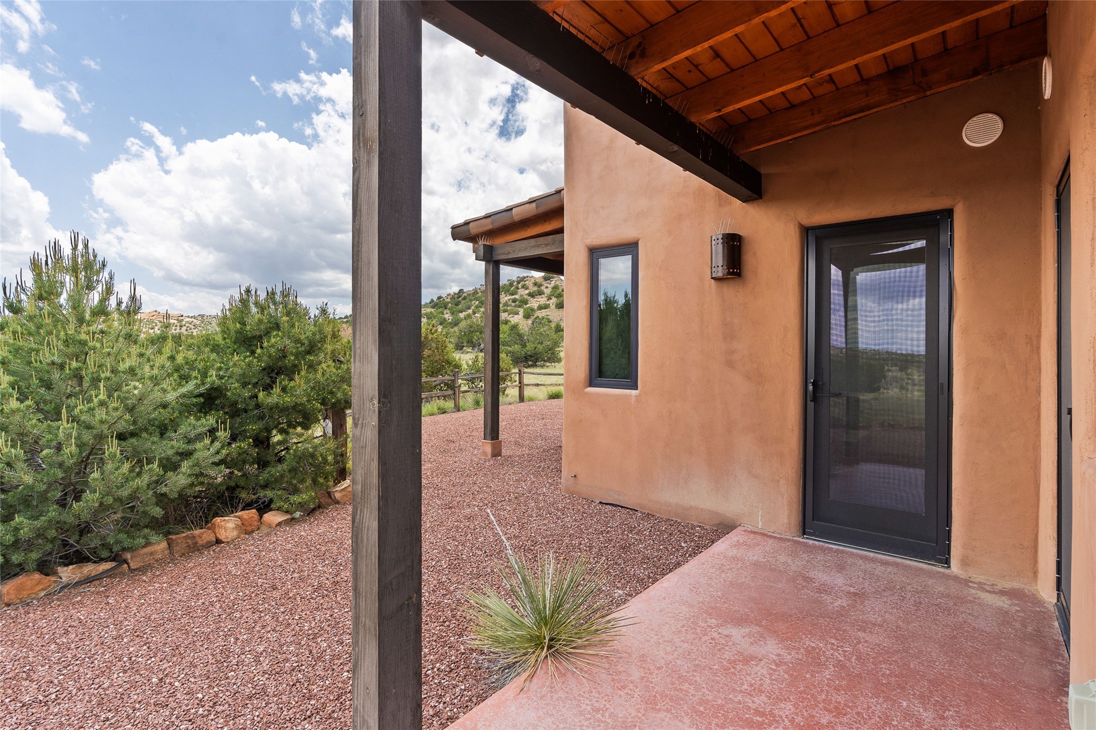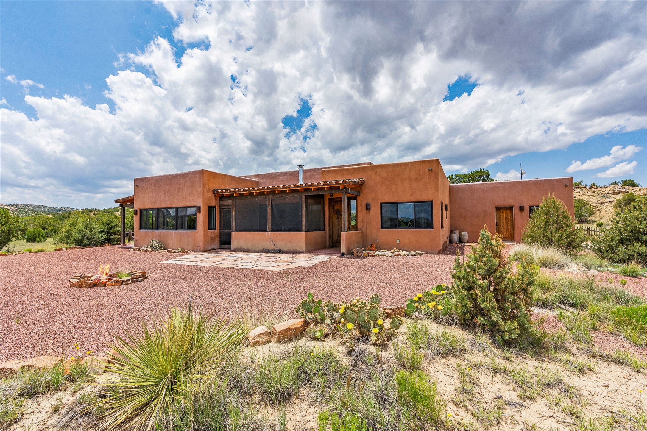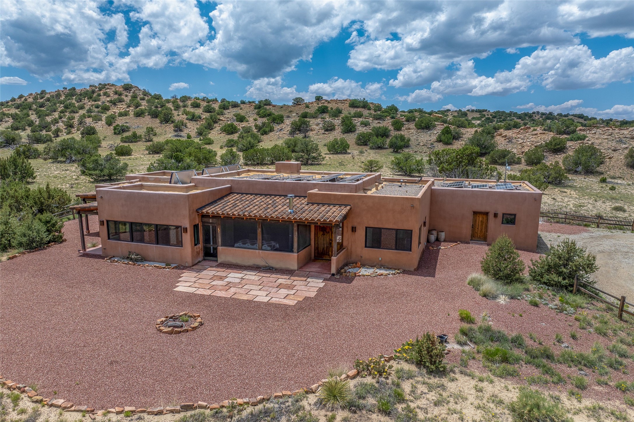 Nestled on 140 acres off the breathtaking scenic Turquoise Trail, this exceptional home blends modern elegance with serene pastoral beauty. Surrounded by expansive ranch land, it offers privacy and tranquility, where horses are welcome. The sweeping views, stunning rock formations, and pristine night skies create a truly peaceful retreat. Built in 2017, this "smart" home is designed for efficiency and comfort, featuring solar electric panels, solar radiant heating, and a grid connection. Mini-splits provide heating and cooling throughout, while stained concrete floors, handmade doors and beams from La Puerta Originals, and sleek design elements enhance the home's tranquil, minimalist aesthetic. The third bedroom, full of natural light, presents a perfect space for an artist's studio. The generously sized living area boasts an open floor plan, an inviting eat-in kitchen with sophisticated wine cooler, and a cozy kiva fireplace. Seamless indoor-outdoor living is achieved with multiple patios--both open and enclosed--including a screened-in dining space with a wood stove and patio heaters, along with an outdoor shower. Located south of Santa Fe, this rural haven offers convenient access to both Santa Fe and Albuquerque. It's also near the charming and historic villages of Madrid and Cerrillos, where vibrant restaurants, art galleries, summer farmers' markets, and two general stores bring local culture to life.