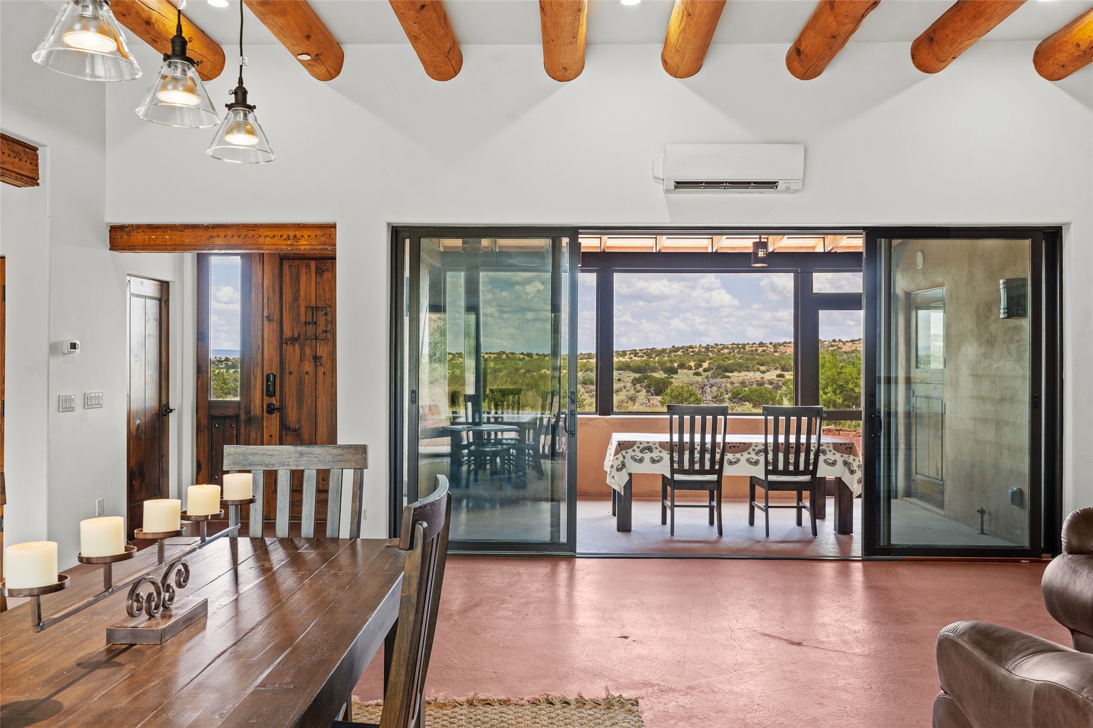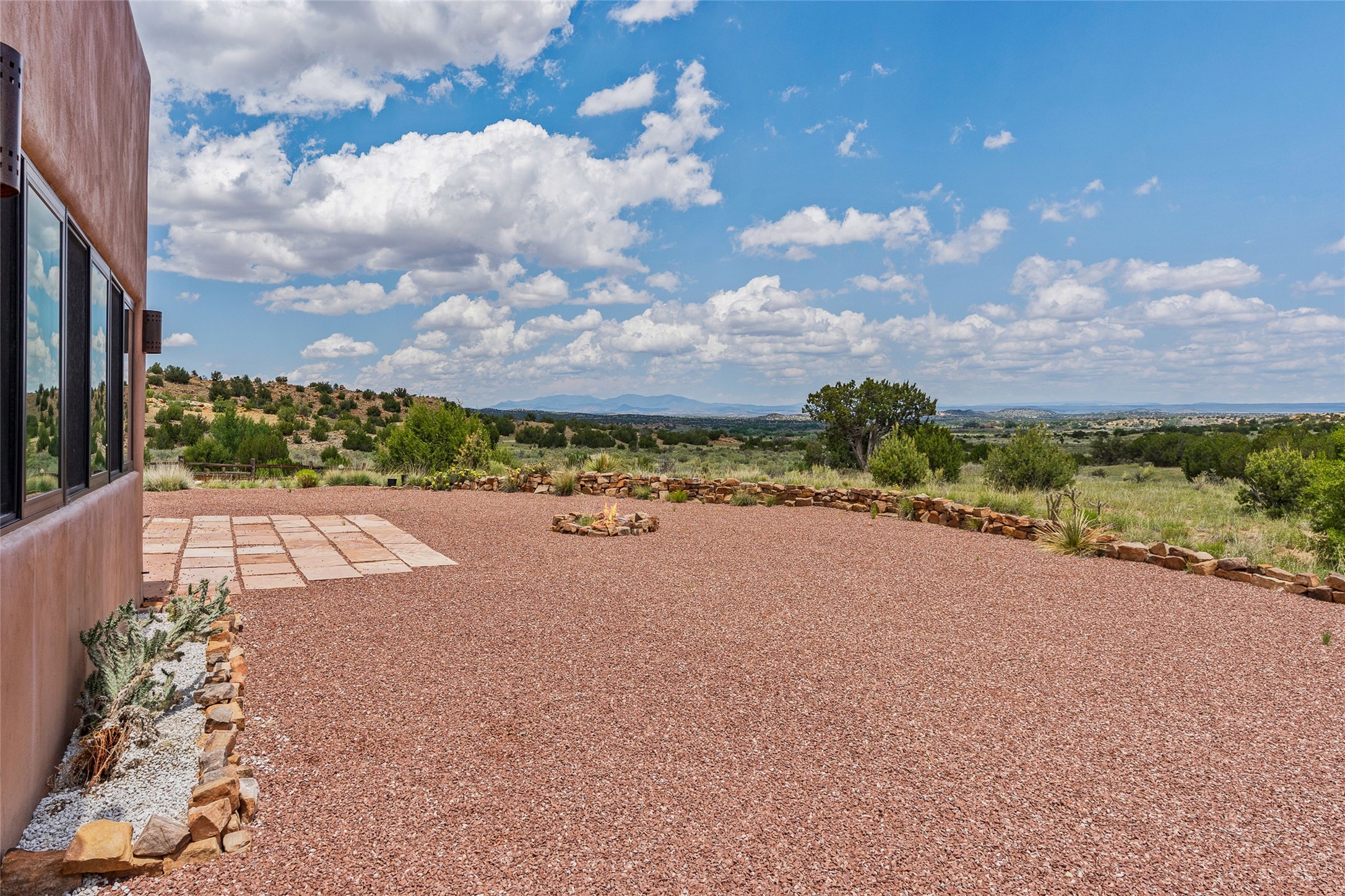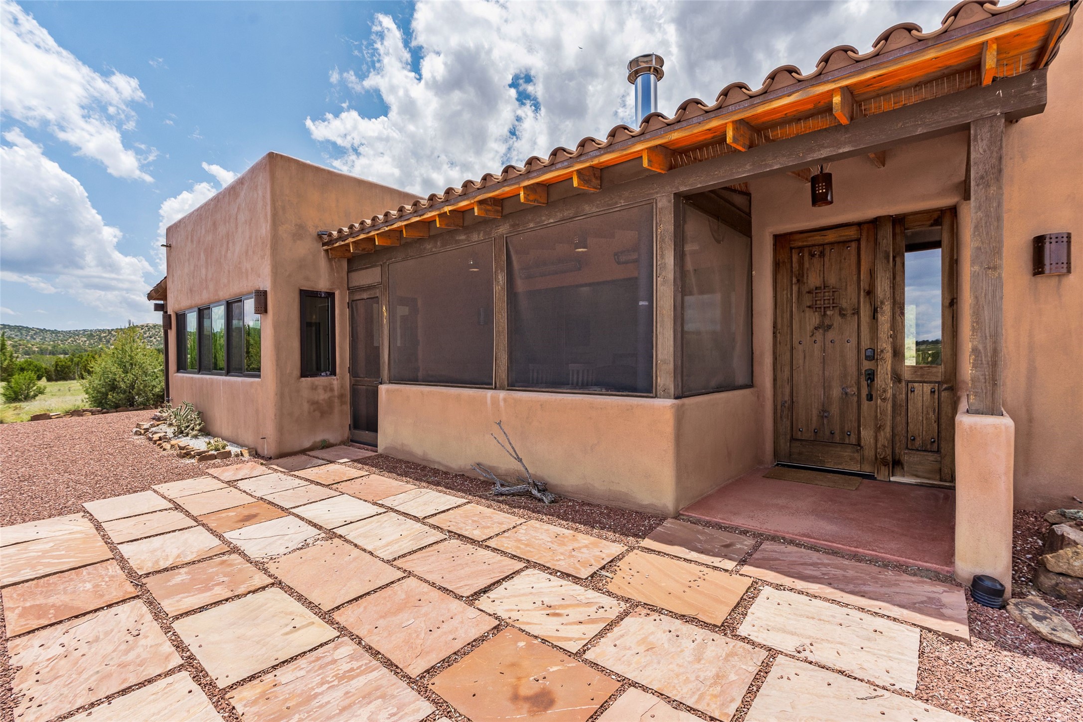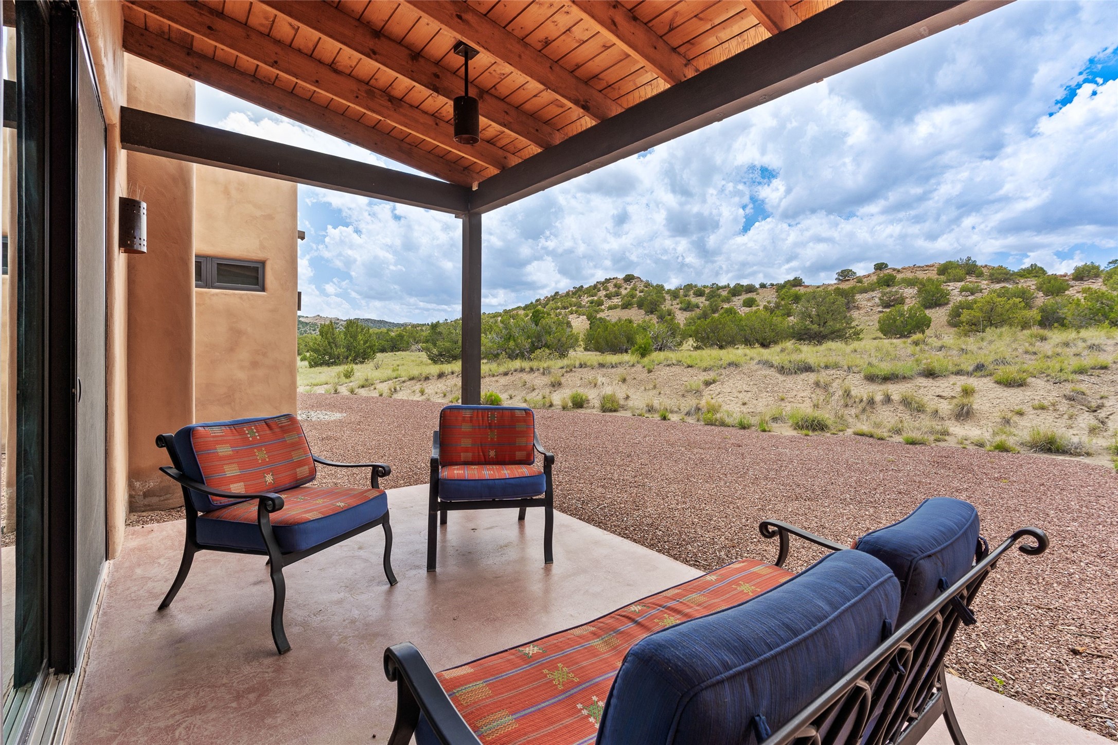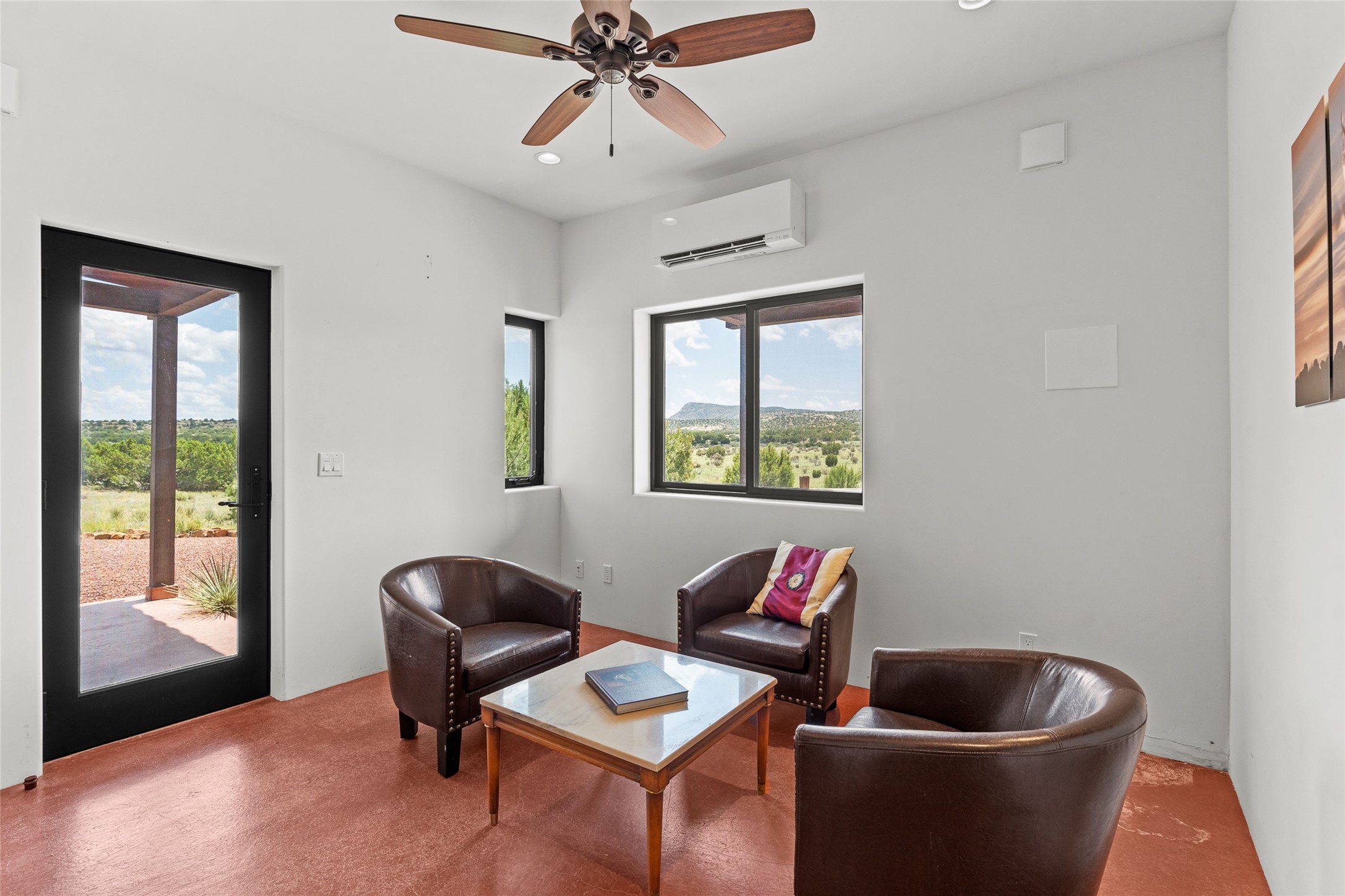 Nestled on 140 acres off the breathtaking scenic Turquoise Trail, this exceptional home blends modern elegance with serene pastoral beauty. Surrounded by expansive ranch land, it offers privacy and tranquility, where horses are welcome. The sweeping views, stunning rock formations, and pristine night skies create a truly peaceful retreat. Built in 2017, this "smart" home is designed for efficiency and comfort, featuring solar electric panels, solar radiant heating, and a grid connection. Mini-splits provide heating and cooling throughout, while stained concrete floors, handmade doors and beams from La Puerta Originals, and sleek design elements enhance the home's tranquil, minimalist aesthetic. The third bedroom, full of natural light, presents a perfect space for an artist's studio. The generously sized living area boasts an open floor plan, an inviting eat-in kitchen with sophisticated wine cooler, and a cozy kiva fireplace. Seamless indoor-outdoor living is achieved with multiple patios--both open and enclosed--including a screened-in dining space with a wood stove and patio heaters, along with an outdoor shower. Located south of Santa Fe, this rural haven offers convenient access to both Santa Fe and Albuquerque. It's also near the charming and historic villages of Madrid and Cerrillos, where vibrant restaurants, art galleries, summer farmers' markets, and two general stores bring local culture to life.