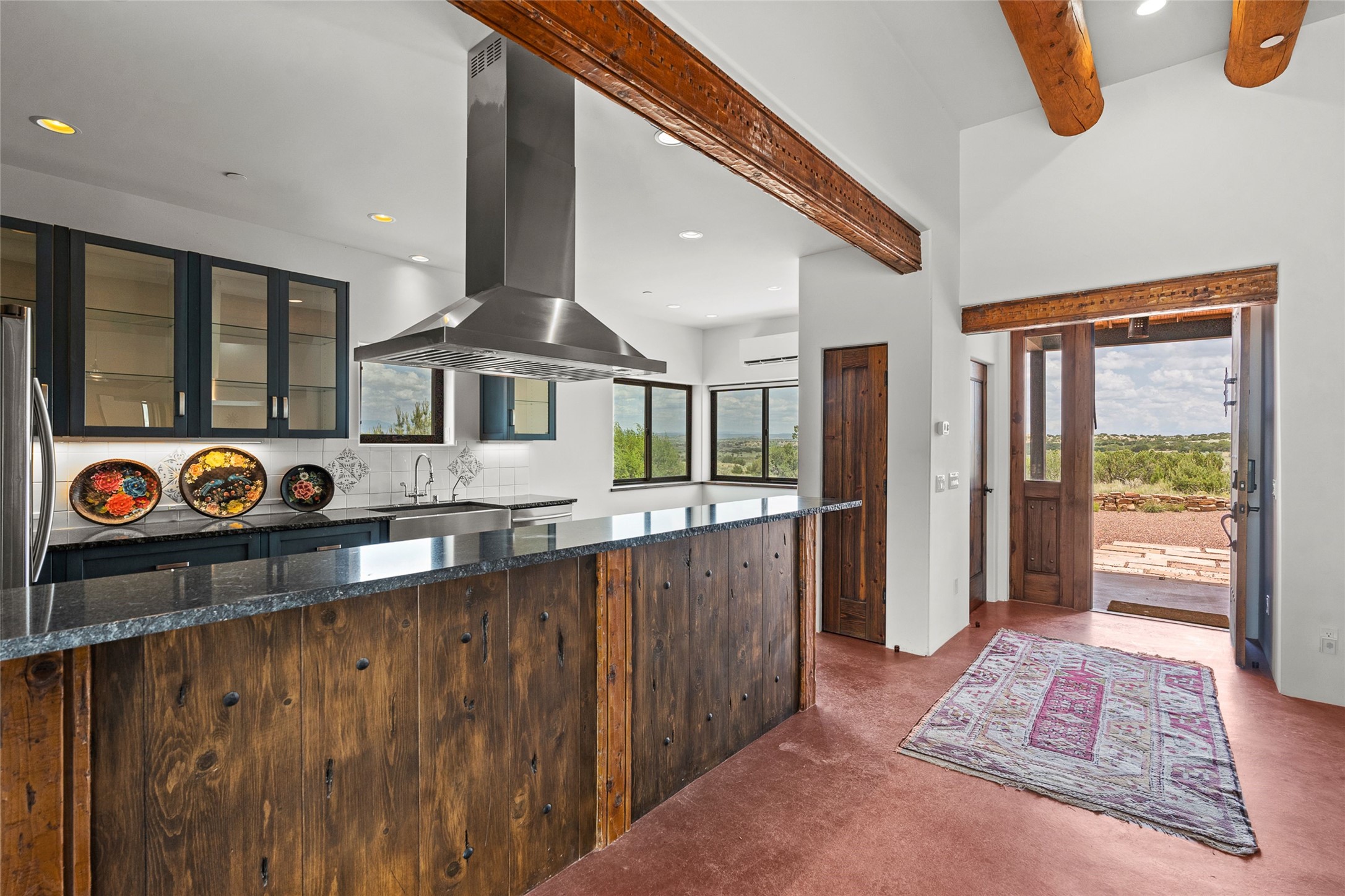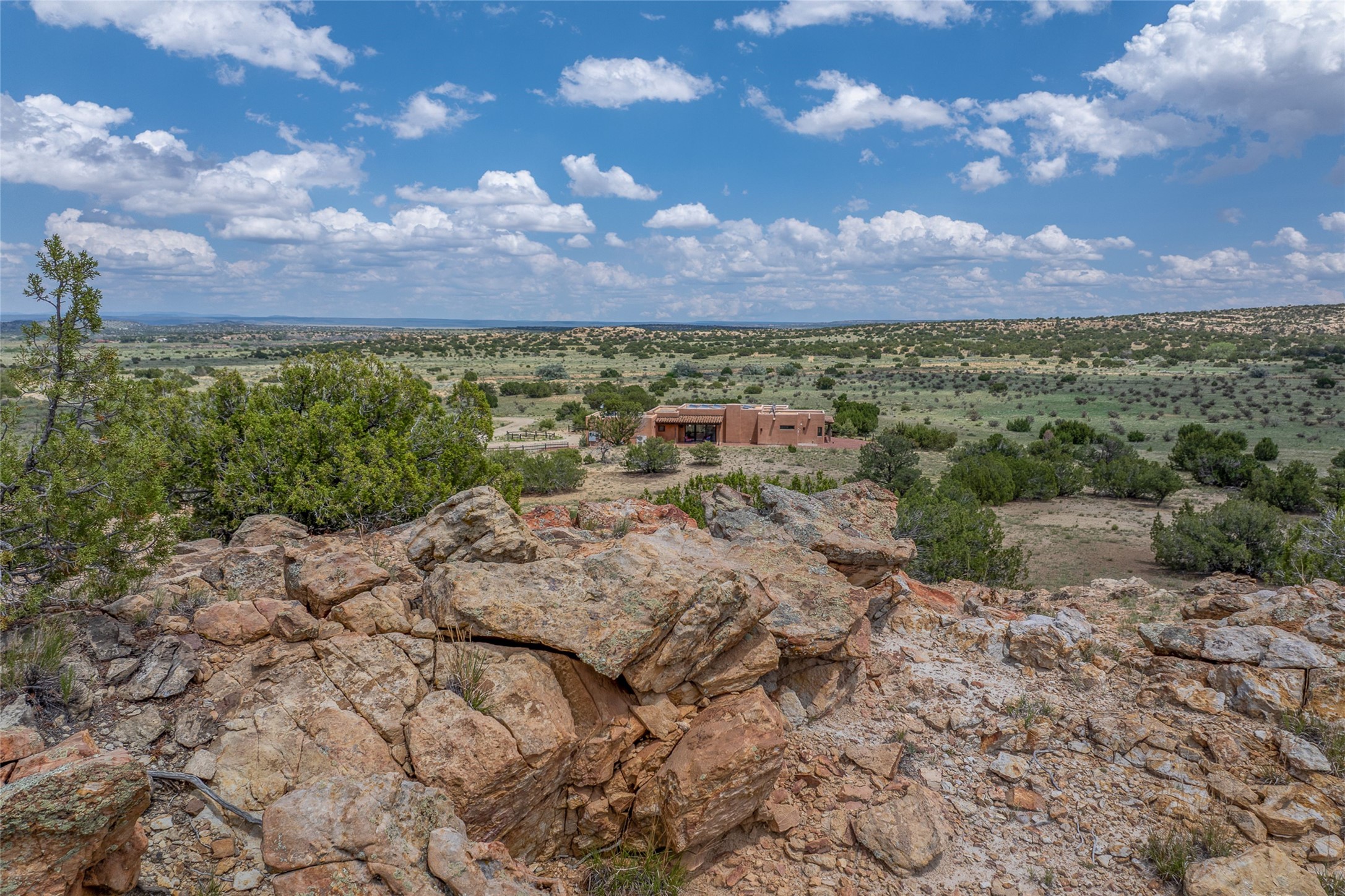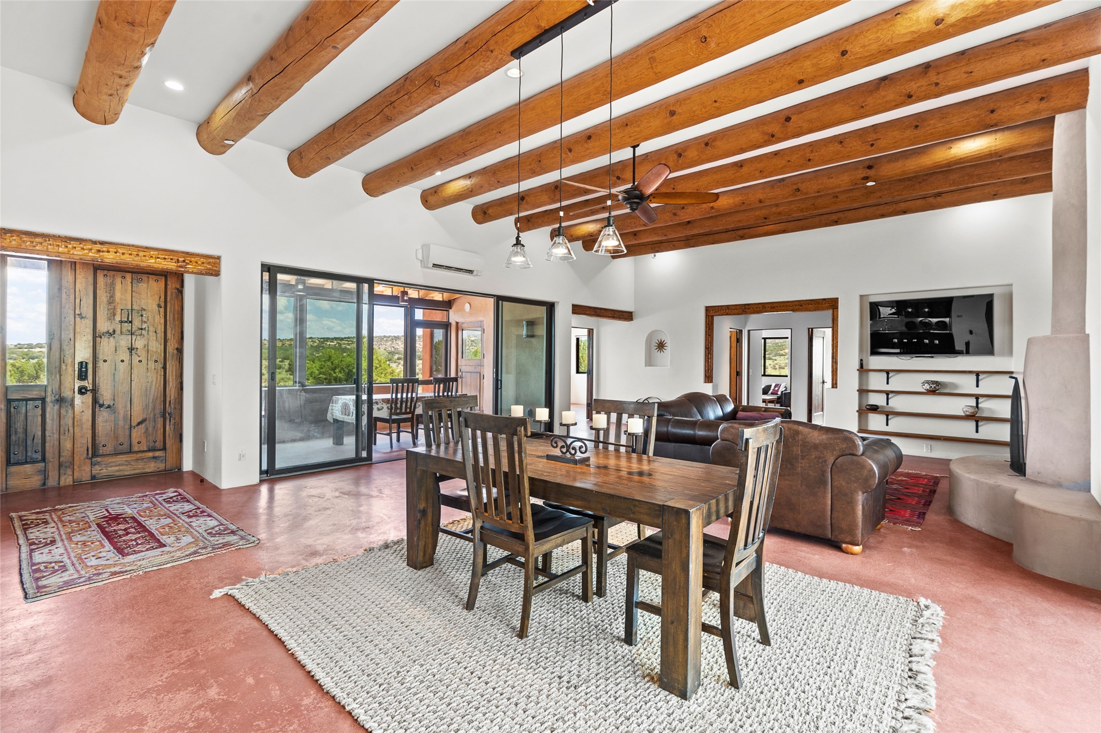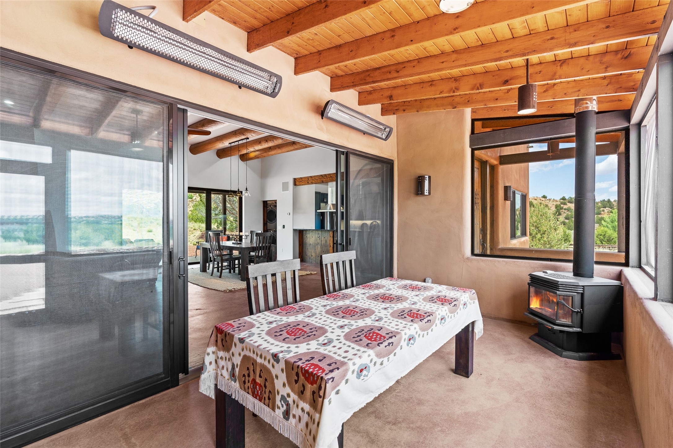 Nestled on 140 acres off the breathtaking scenic Turquoise Trail, this exceptional home blends modern elegance with serene pastoral beauty. Surrounded by expansive ranch land, it offers privacy and tranquility, where horses are welcome. The sweeping views, stunning rock formations, and pristine night skies create a truly peaceful retreat. Built in 2017, this "smart" home is designed for efficiency and comfort, featuring solar electric panels, solar radiant heating, and a grid connection. Mini-splits provide heating and cooling throughout, while stained concrete floors, handmade doors and beams from La Puerta Originals, and sleek design elements enhance the home's tranquil, minimalist aesthetic. The third bedroom, full of natural light, presents a perfect space for an artist's studio. The generously sized living area boasts an open floor plan, an inviting eat-in kitchen with sophisticated wine cooler, and a cozy kiva fireplace. Seamless indoor-outdoor living is achieved with multiple patios--both open and enclosed--including a screened-in dining space with a wood stove and patio heaters, along with an outdoor shower. Located south of Santa Fe, this rural haven offers convenient access to both Santa Fe and Albuquerque. It's also near the charming and historic villages of Madrid and Cerrillos, where vibrant restaurants, art galleries, summer farmers' markets, and two general stores bring local culture to life.
