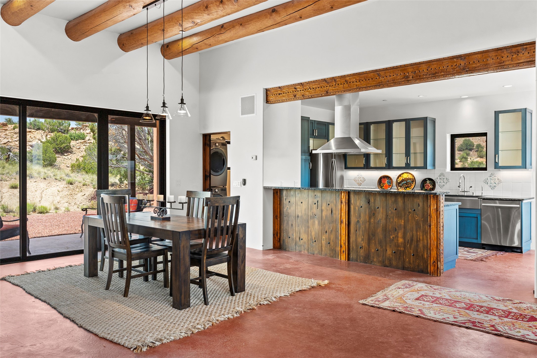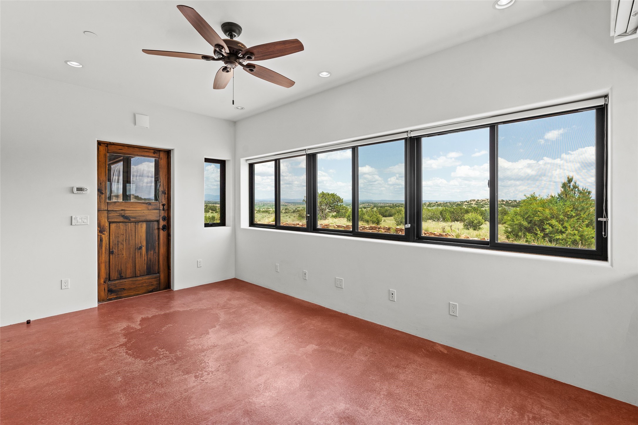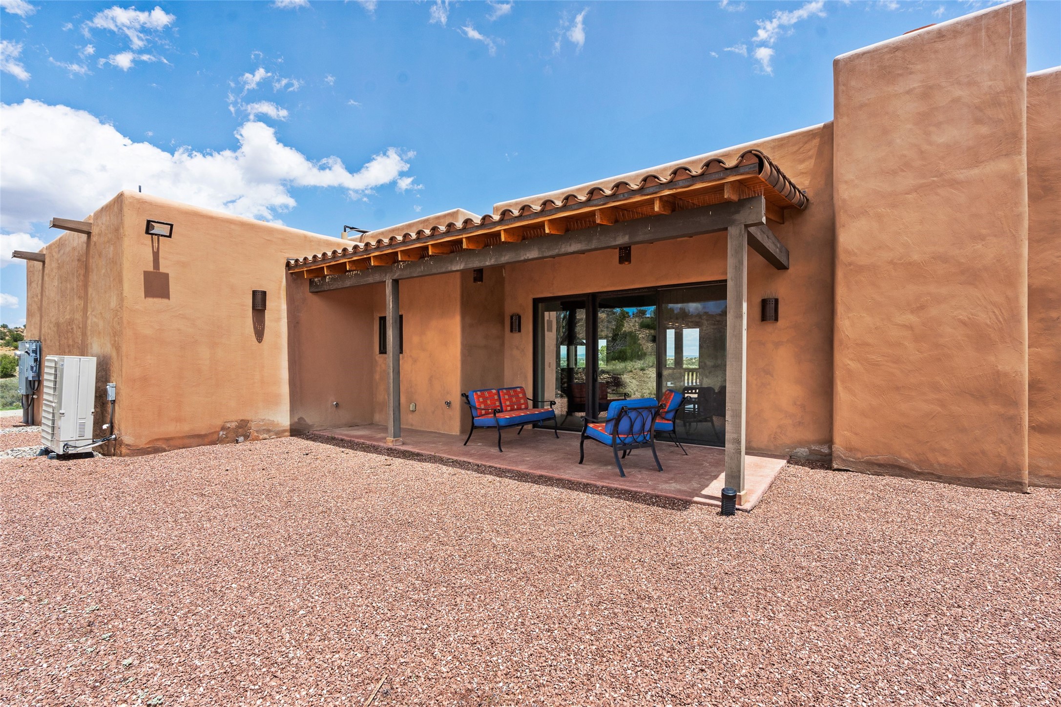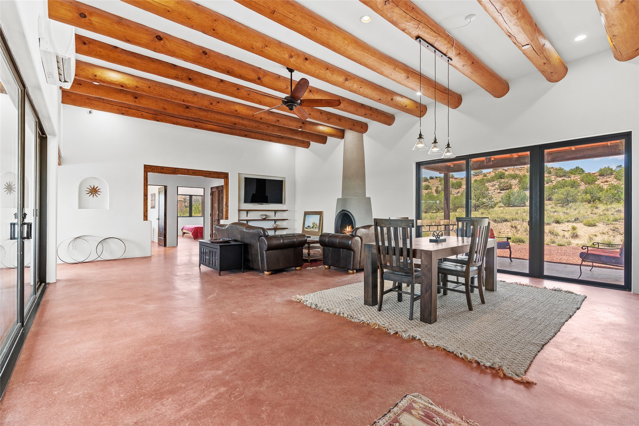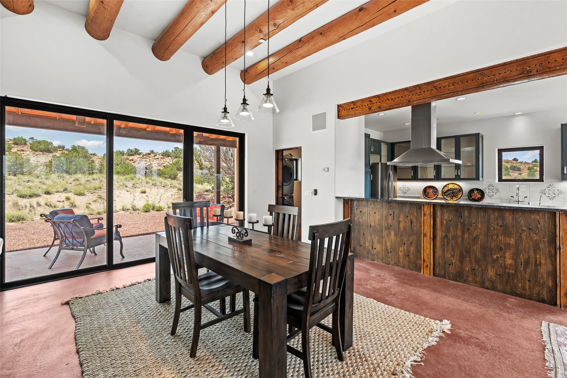 Nestled on 140 acres off the breathtaking scenic Turquoise Trail, this exceptional home blends modern elegance with serene pastoral beauty. Surrounded by expansive ranch land, it offers privacy and tranquility, where horses are welcome. The sweeping views, stunning rock formations, and pristine night skies create a truly peaceful retreat. Built in 2017, this "smart" home is designed for efficiency and comfort, featuring solar electric panels, solar radiant heating, and a grid connection. Mini-splits provide heating and cooling throughout, while stained concrete floors, handmade doors and beams from La Puerta Originals, and sleek design elements enhance the home's tranquil, minimalist aesthetic. The third bedroom, full of natural light, presents a perfect space for an artist's studio. The generously sized living area boasts an open floor plan, an inviting eat-in kitchen with sophisticated wine cooler, and a cozy kiva fireplace. Seamless indoor-outdoor living is achieved with multiple patios--both open and enclosed--including a screened-in dining space with a wood stove and patio heaters, along with an outdoor shower. Located south of Santa Fe, this rural haven offers convenient access to both Santa Fe and Albuquerque. It's also near the charming and historic villages of Madrid and Cerrillos, where vibrant restaurants, art galleries, summer farmers' markets, and two general stores bring local culture to life.