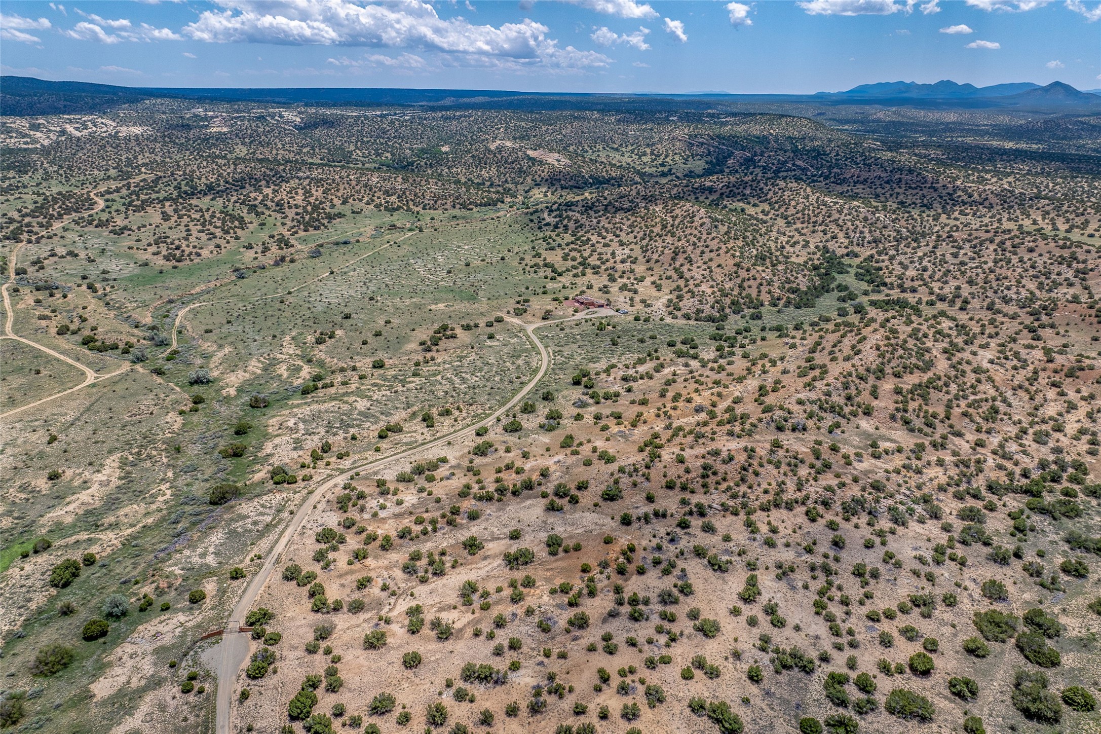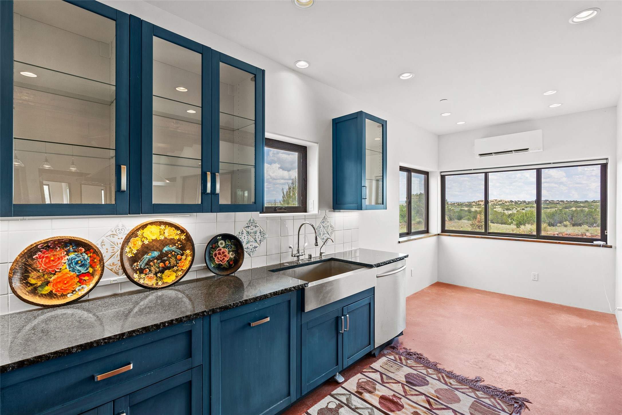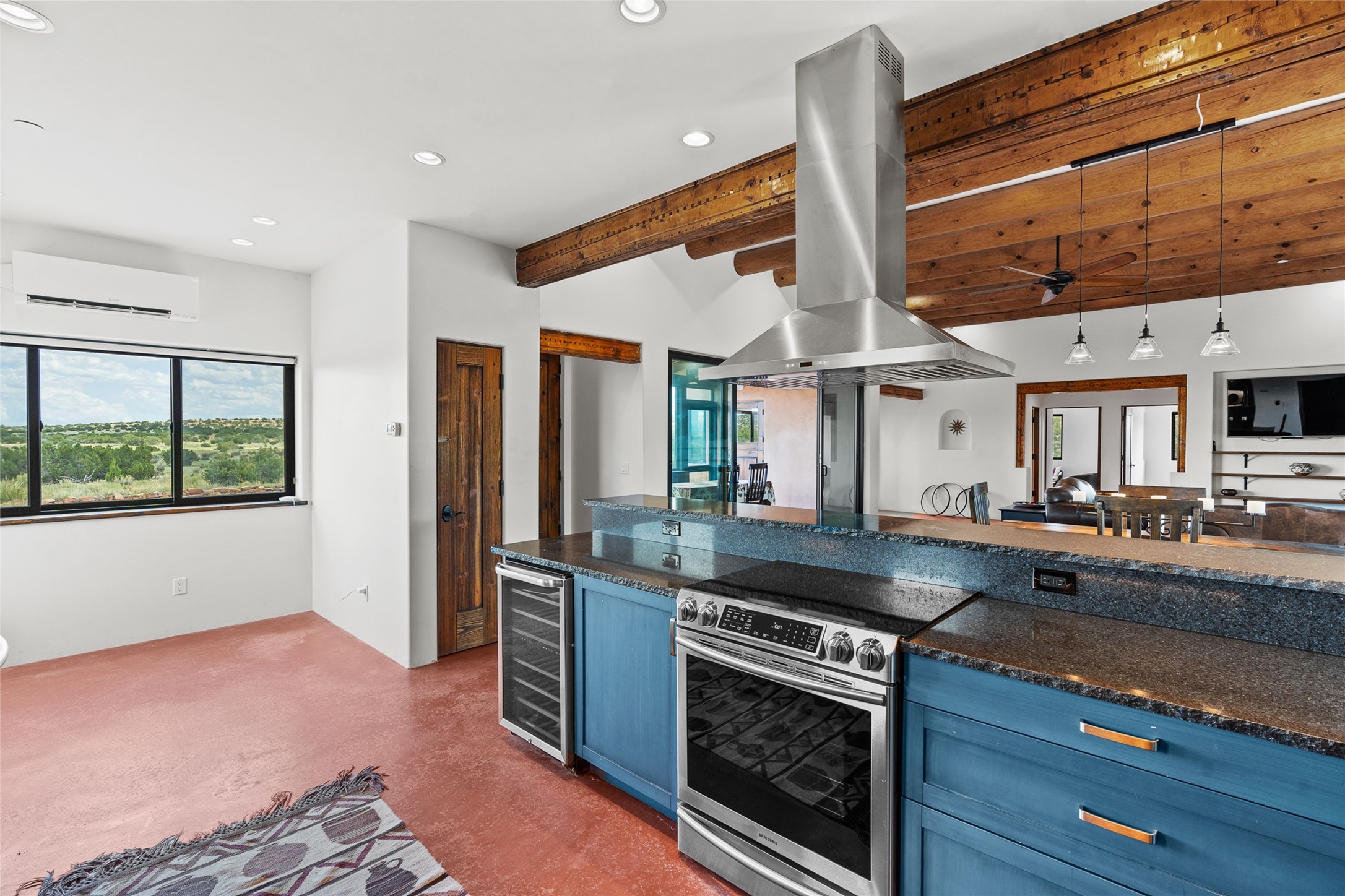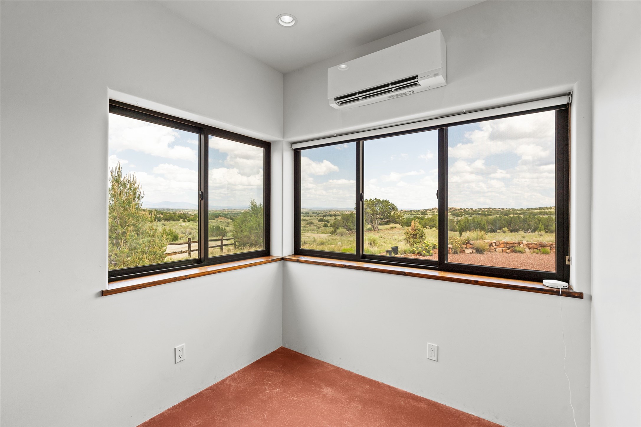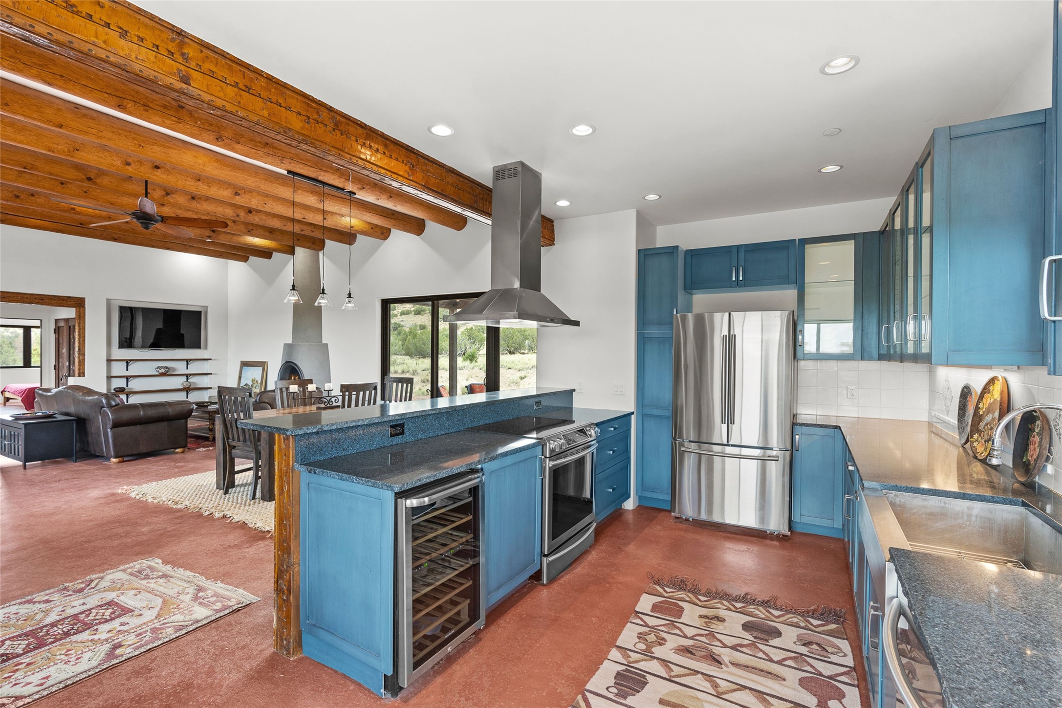 Nestled on 140 acres off the breathtaking scenic Turquoise Trail, this exceptional home blends modern elegance with serene pastoral beauty. Surrounded by expansive ranch land, it offers privacy and tranquility, where horses are welcome. The sweeping views, stunning rock formations, and pristine night skies create a truly peaceful retreat. Built in 2017, this "smart" home is designed for efficiency and comfort, featuring solar electric panels, solar radiant heating, and a grid connection. Mini-splits provide heating and cooling throughout, while stained concrete floors, handmade doors and beams from La Puerta Originals, and sleek design elements enhance the home's tranquil, minimalist aesthetic. The third bedroom, full of natural light, presents a perfect space for an artist's studio. The generously sized living area boasts an open floor plan, an inviting eat-in kitchen with sophisticated wine cooler, and a cozy kiva fireplace. Seamless indoor-outdoor living is achieved with multiple patios--both open and enclosed--including a screened-in dining space with a wood stove and patio heaters, along with an outdoor shower. Located south of Santa Fe, this rural haven offers convenient access to both Santa Fe and Albuquerque. It's also near the charming and historic villages of Madrid and Cerrillos, where vibrant restaurants, art galleries, summer farmers' markets, and two general stores bring local culture to life.