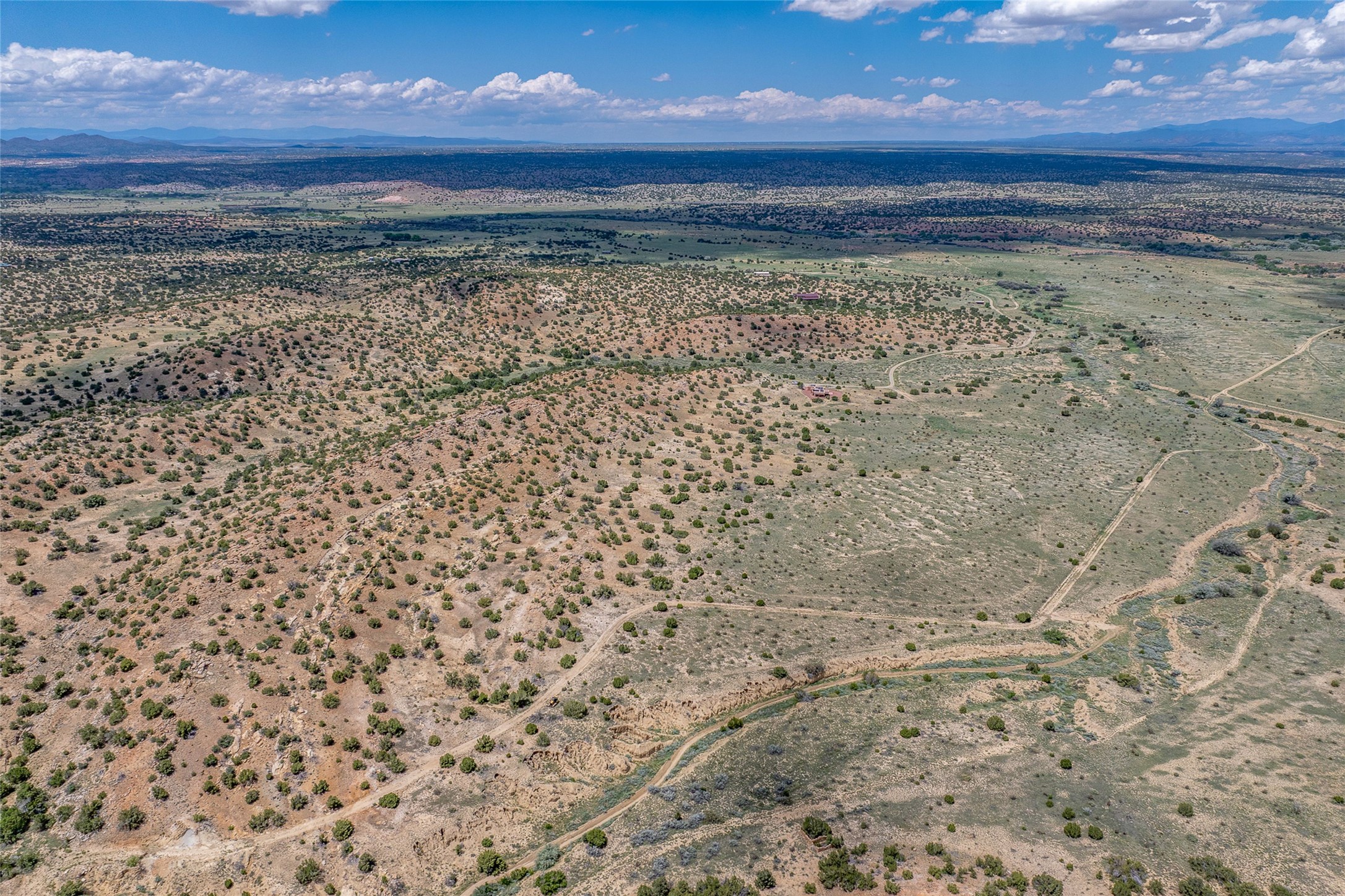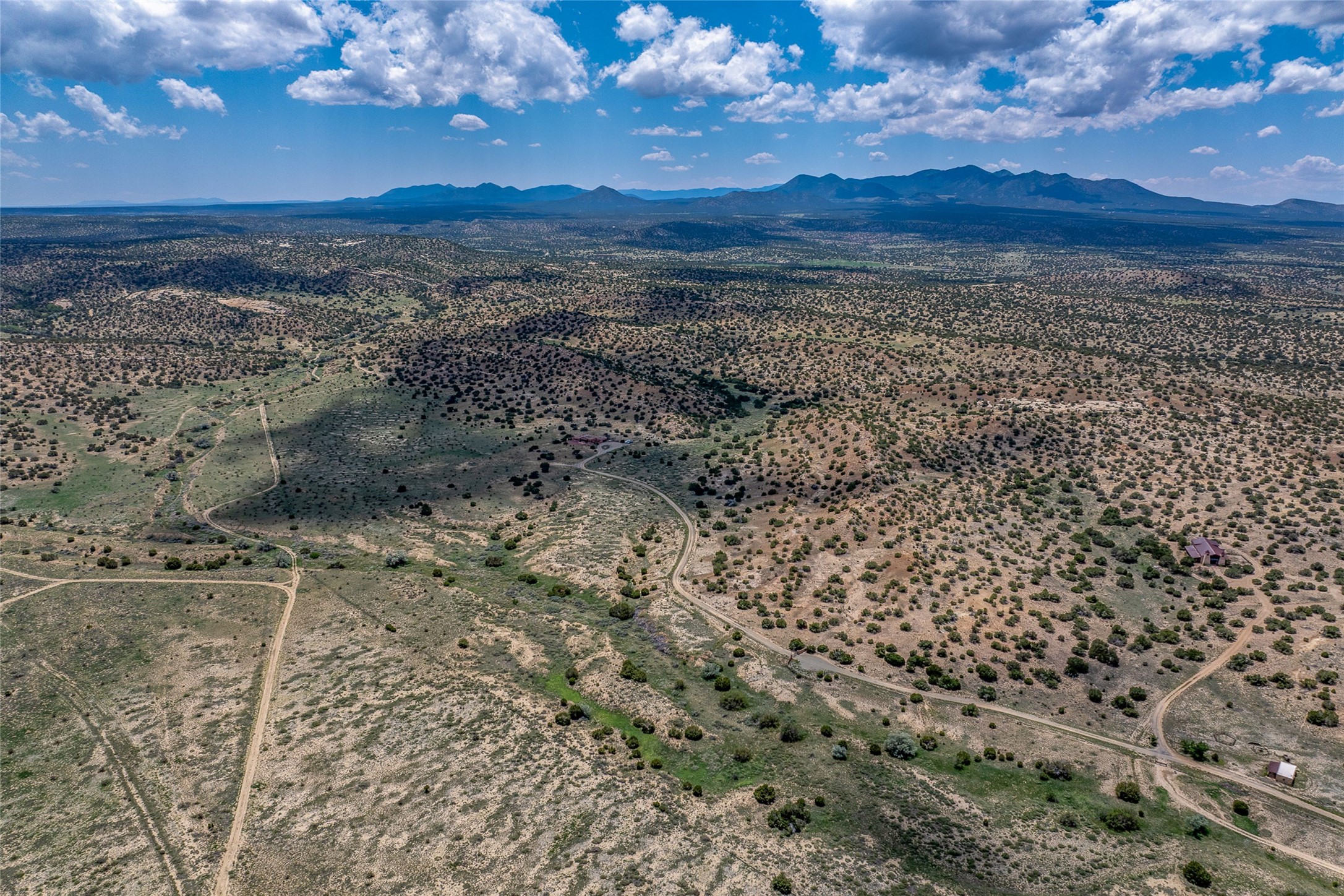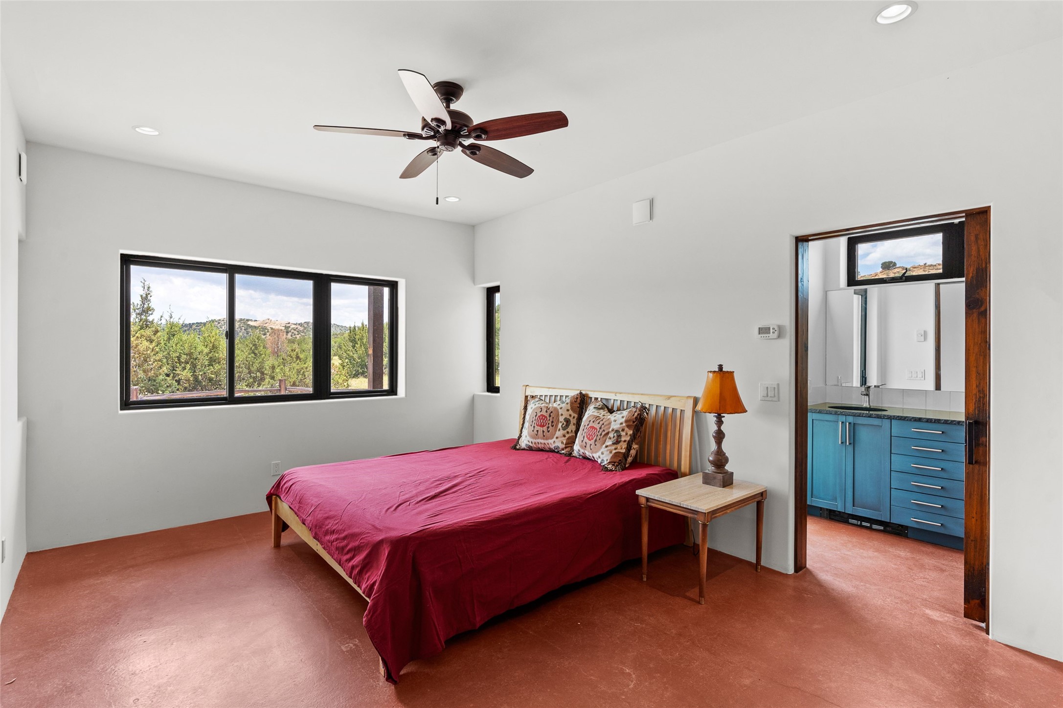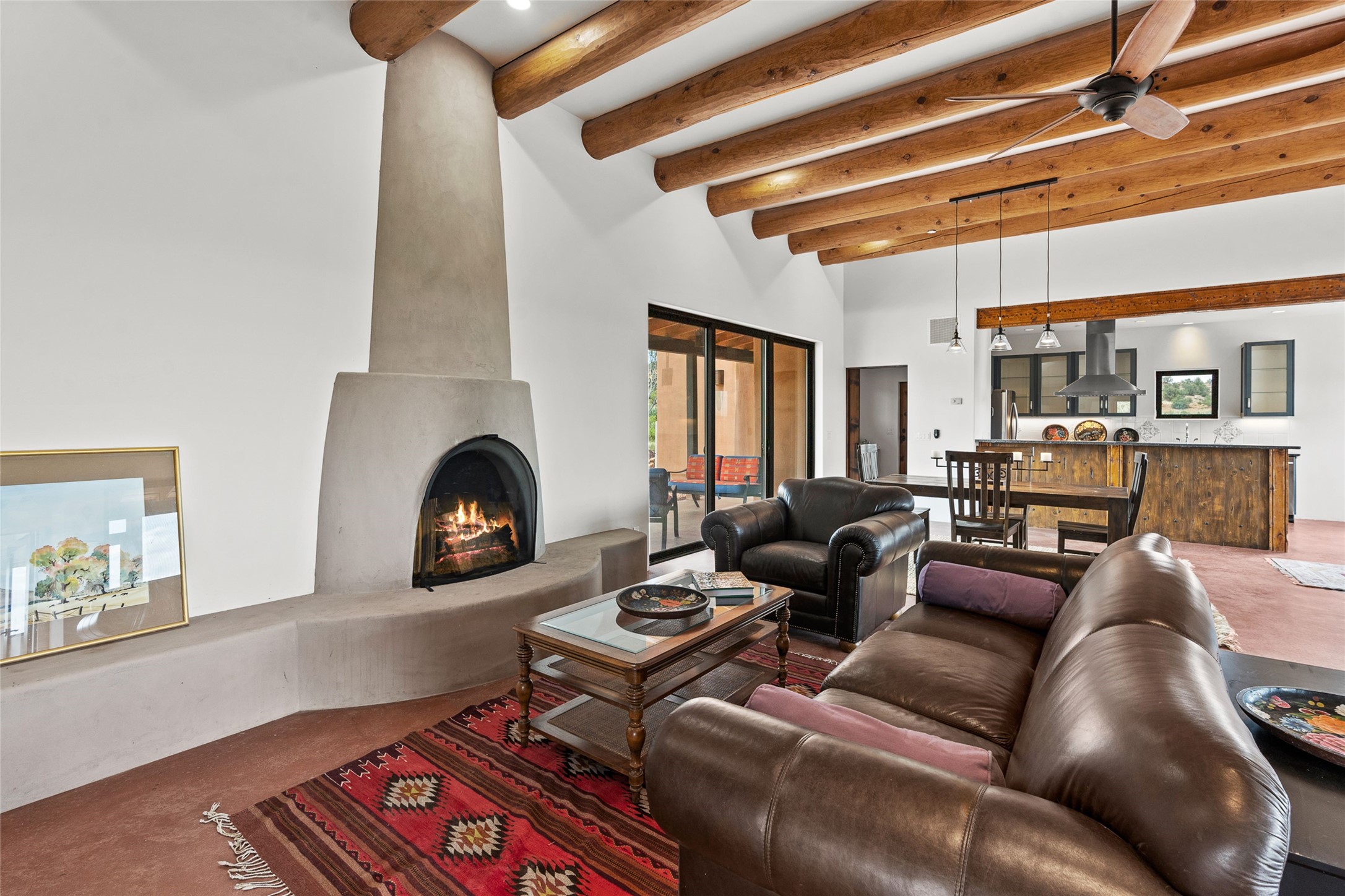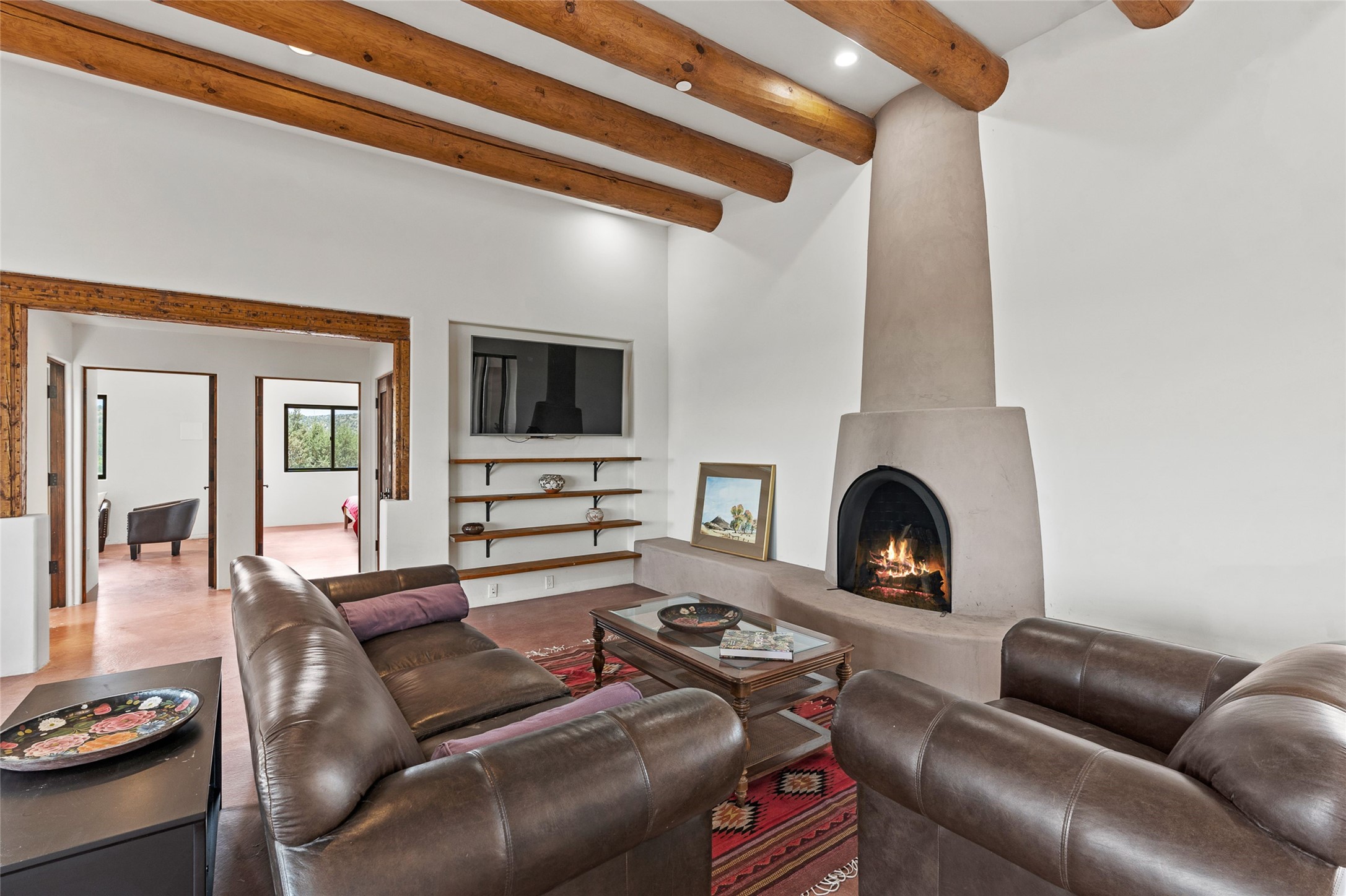 Nestled on 140 acres off the breathtaking scenic Turquoise Trail, this exceptional home blends modern elegance with serene pastoral beauty. Surrounded by expansive ranch land, it offers privacy and tranquility, where horses are welcome. The sweeping views, stunning rock formations, and pristine night skies create a truly peaceful retreat. Built in 2017, this "smart" home is designed for efficiency and comfort, featuring solar electric panels, solar radiant heating, and a grid connection. Mini-splits provide heating and cooling throughout, while stained concrete floors, handmade doors and beams from La Puerta Originals, and sleek design elements enhance the home's tranquil, minimalist aesthetic. The third bedroom, full of natural light, presents a perfect space for an artist's studio. The generously sized living area boasts an open floor plan, an inviting eat-in kitchen with sophisticated wine cooler, and a cozy kiva fireplace. Seamless indoor-outdoor living is achieved with multiple patios--both open and enclosed--including a screened-in dining space with a wood stove and patio heaters, along with an outdoor shower. Located south of Santa Fe, this rural haven offers convenient access to both Santa Fe and Albuquerque. It's also near the charming and historic villages of Madrid and Cerrillos, where vibrant restaurants, art galleries, summer farmers' markets, and two general stores bring local culture to life.