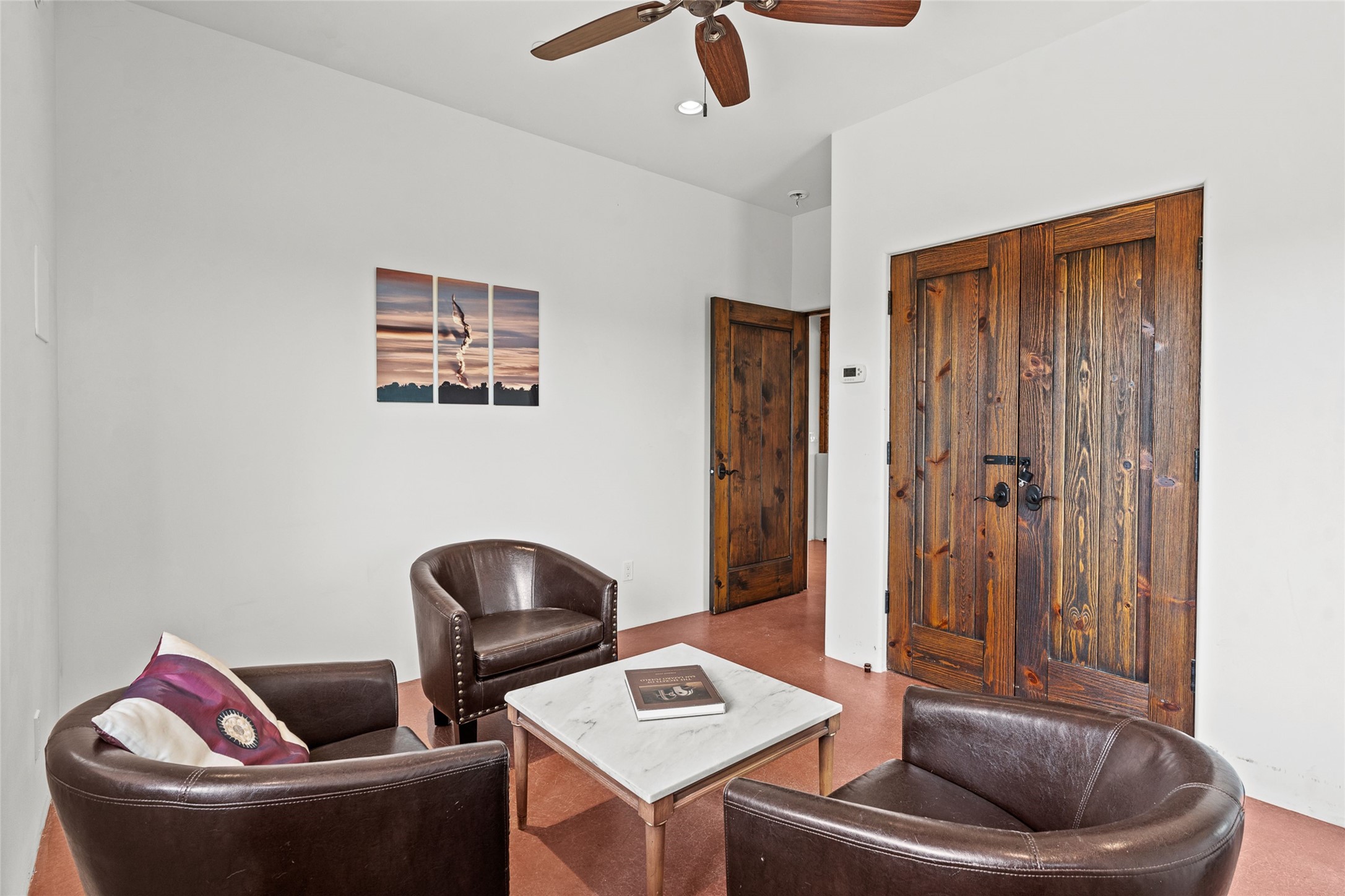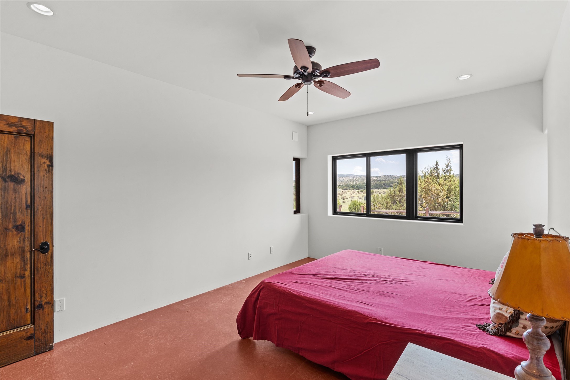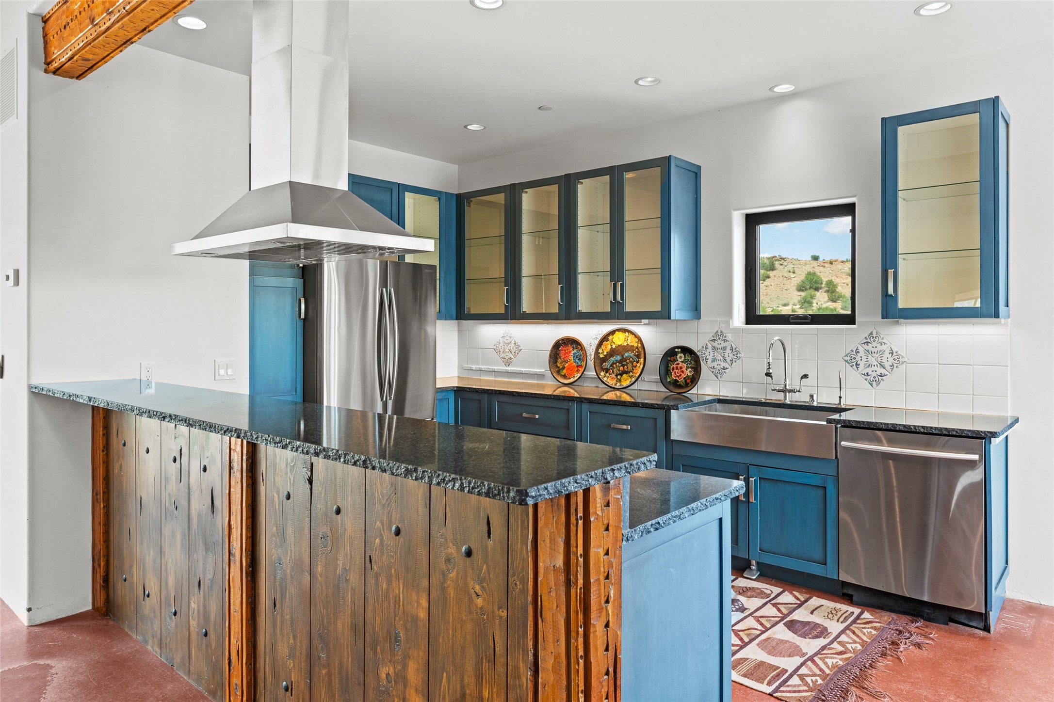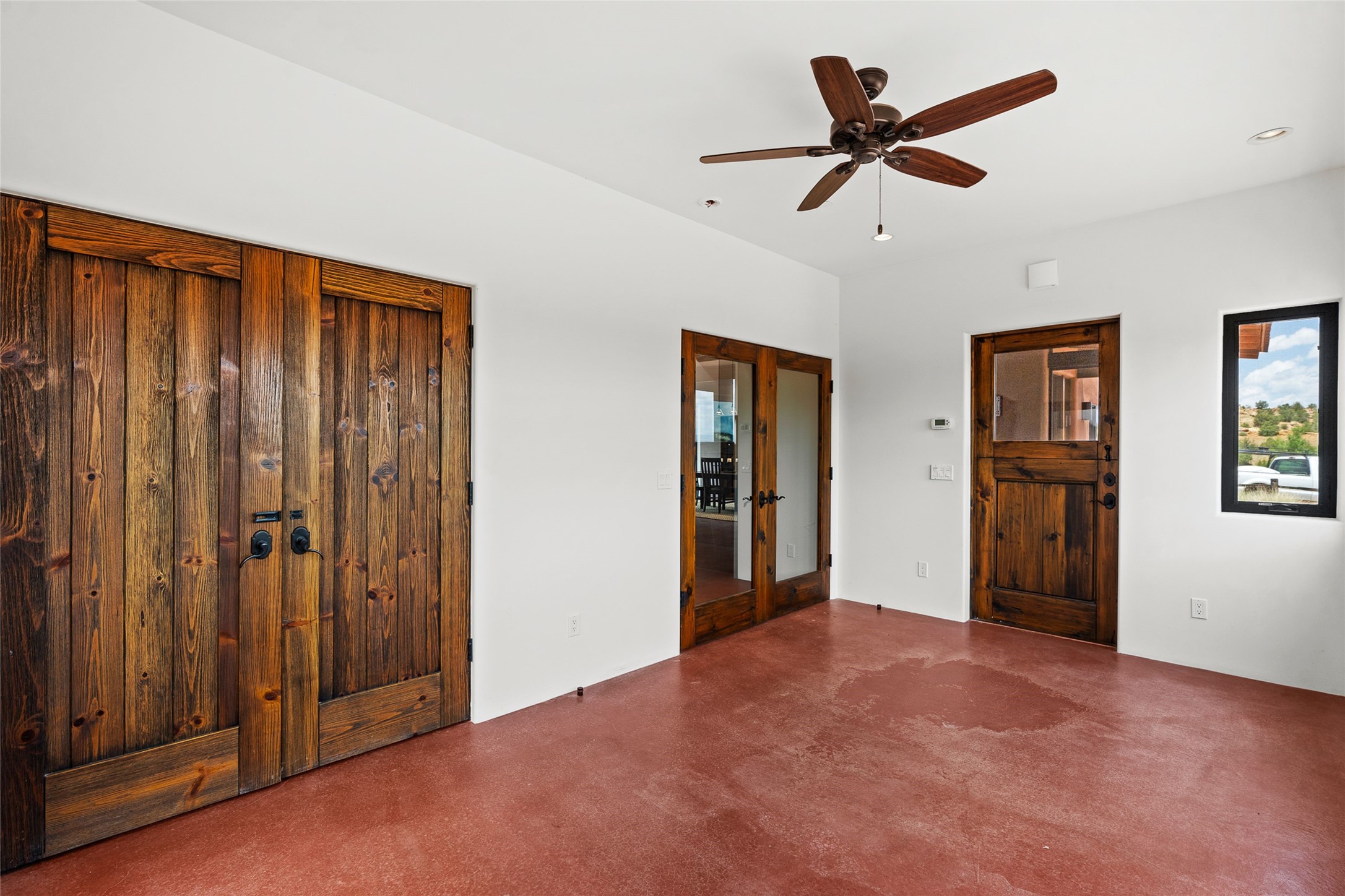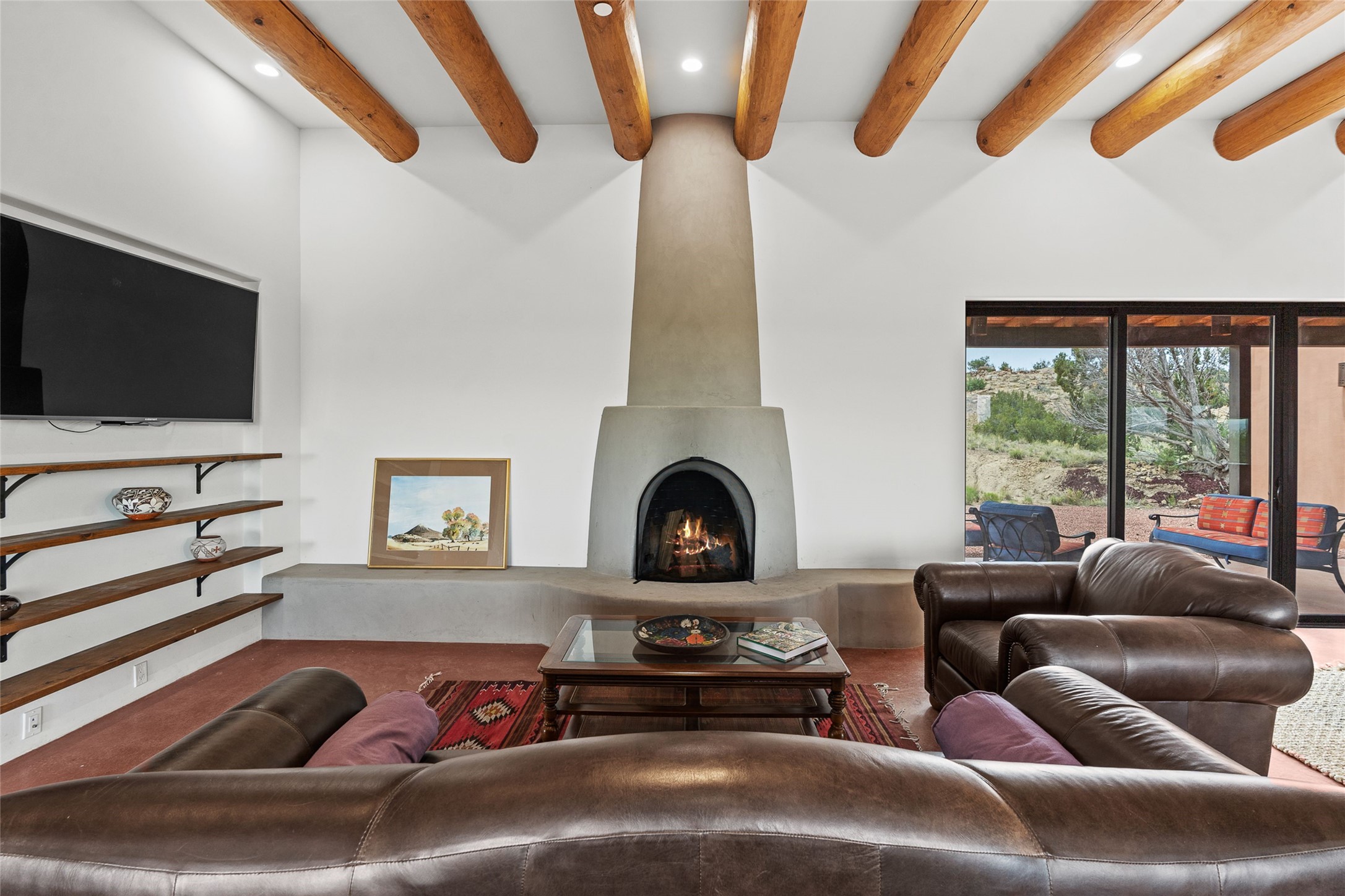 Nestled on 140 acres off the breathtaking scenic Turquoise Trail, this exceptional home blends modern elegance with serene pastoral beauty. Surrounded by expansive ranch land, it offers privacy and tranquility, where horses are welcome. The sweeping views, stunning rock formations, and pristine night skies create a truly peaceful retreat. Built in 2017, this "smart" home is designed for efficiency and comfort, featuring solar electric panels, solar radiant heating, and a grid connection. Mini-splits provide heating and cooling throughout, while stained concrete floors, handmade doors and beams from La Puerta Originals, and sleek design elements enhance the home's tranquil, minimalist aesthetic. The third bedroom, full of natural light, presents a perfect space for an artist's studio. The generously sized living area boasts an open floor plan, an inviting eat-in kitchen with sophisticated wine cooler, and a cozy kiva fireplace. Seamless indoor-outdoor living is achieved with multiple patios--both open and enclosed--including a screened-in dining space with a wood stove and patio heaters, along with an outdoor shower. Located south of Santa Fe, this rural haven offers convenient access to both Santa Fe and Albuquerque. It's also near the charming and historic villages of Madrid and Cerrillos, where vibrant restaurants, art galleries, summer farmers' markets, and two general stores bring local culture to life.