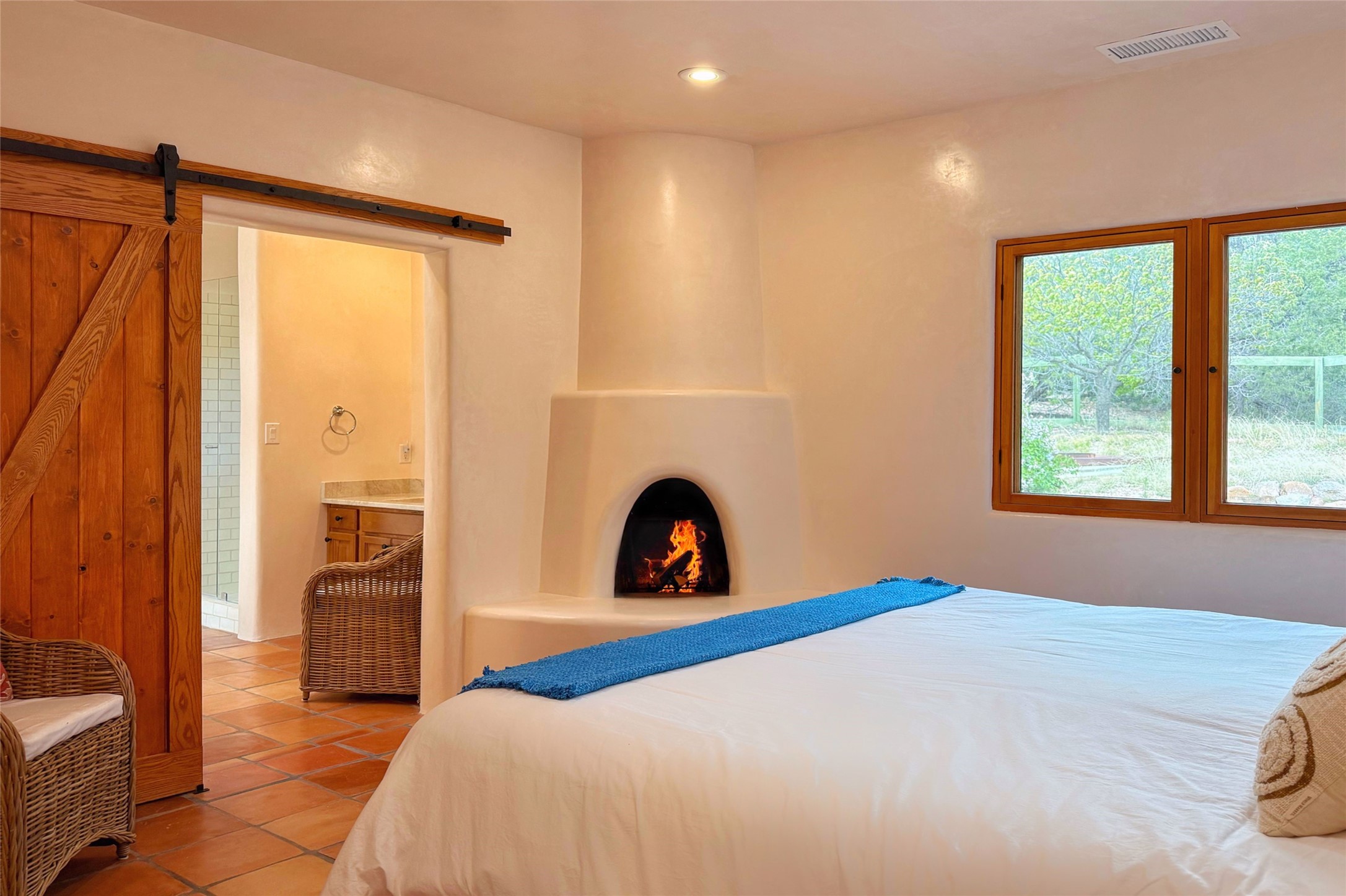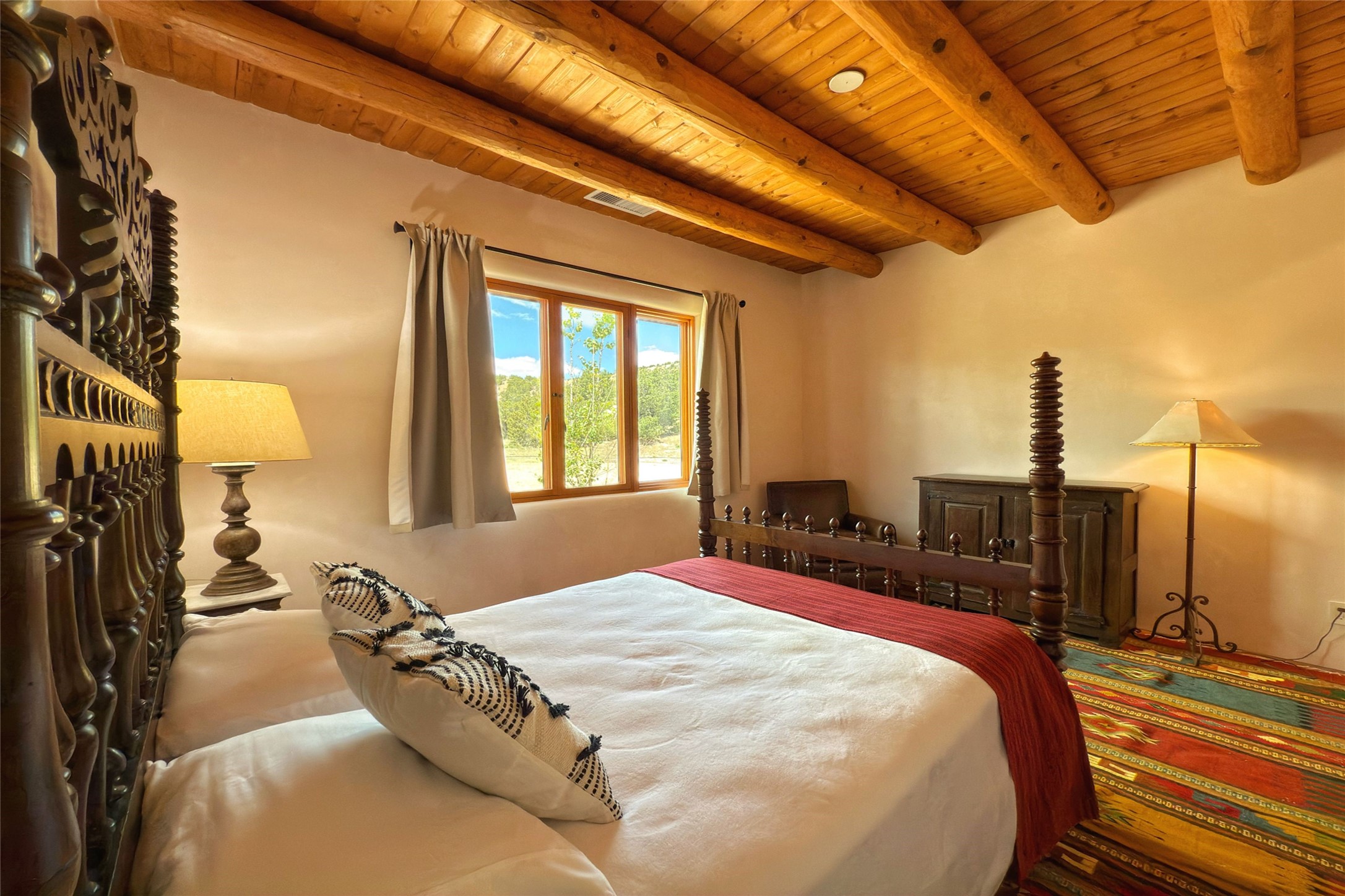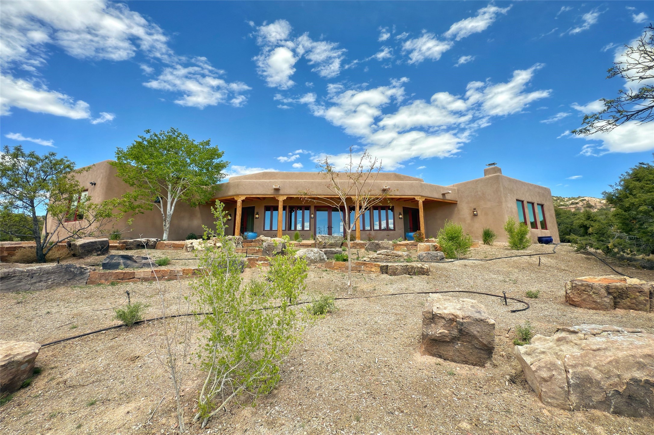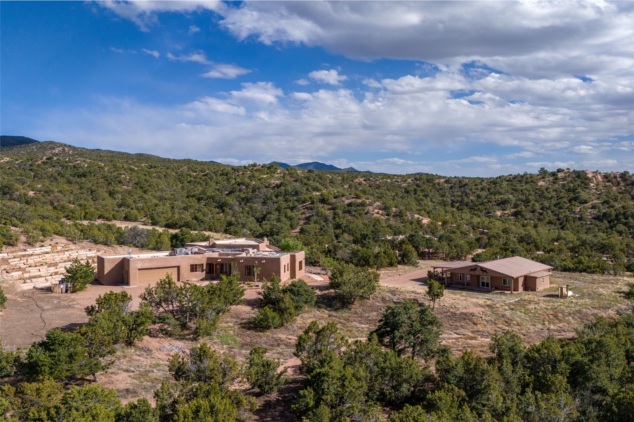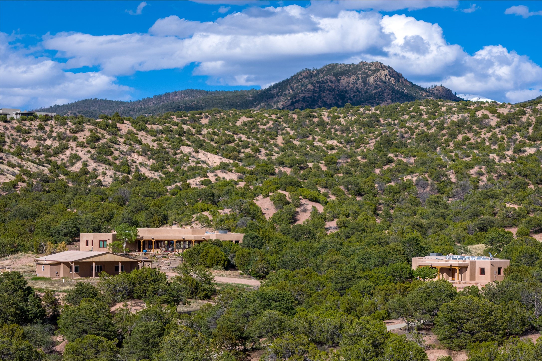 Southwest Elegance Meets Modern Luxury - Tesuque Estate Near Santa FeExperience timeless charm and refined upgrades in this exceptional Tesuque estate just 15 minutes from downtown Santa Fe. The property includes a beautifully renovated main house, a private guesthouse, and a versatile third structure ideal as a studio, barn, or additional guest quarters.The main residence showcases superior craftsmanship with diamond plaster walls, Loewen windows and doors, and Saltillo tile floors. The chef's kitchen features SubZero and Wolf appliances, an Asko dishwasher, an imported porcelain farmhouse sink, and striking Taj Mahal quartz countertops. The great room impresses with soaring ceilings, dual chandeliers, a wood-burning fireplace, and expansive western views, flowing onto two covered flagstone patios--perfect for indoor-outdoor living.The primary suite offers a luxurious retreat with its own fireplace, a spa-like bath with soaking tub, walk-in shower, dual pedestal sinks, and an adjacent study with fireplace and patio access. Two additional bedrooms complete the home--one with ensuite bath, the other with access to a nearby half bath. Comforts include radiant floor heating and central A/C.The guesthouse offers two bedrooms and two baths, with upgrades mirroring the main home: diamond plaster walls, quartz countertops, radiant heating, central A/C, and Loewen windows. Its primary suite features a kiva fireplace, soaking tub, and walk-in shower, while the second bedroom enjoys tranquil western views. A cozy living/dining area with kiva fireplace and a private flagstone patio complete the space.Set on a beautifully landscaped lot with mature junipers, fenced areas, and irrigated gardens, this private estate offers peace and elegance just minutes from the heart of Santa Fe.
