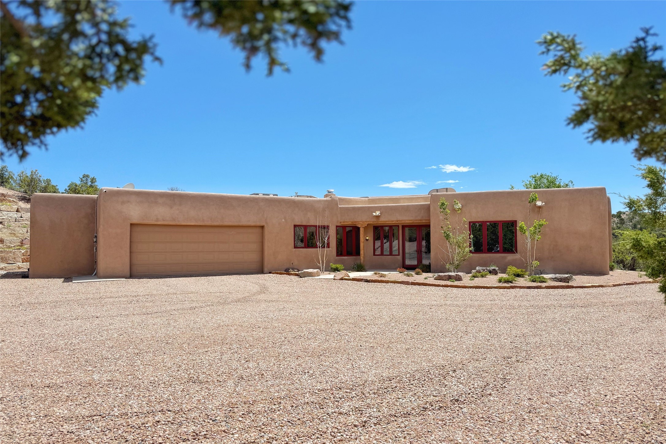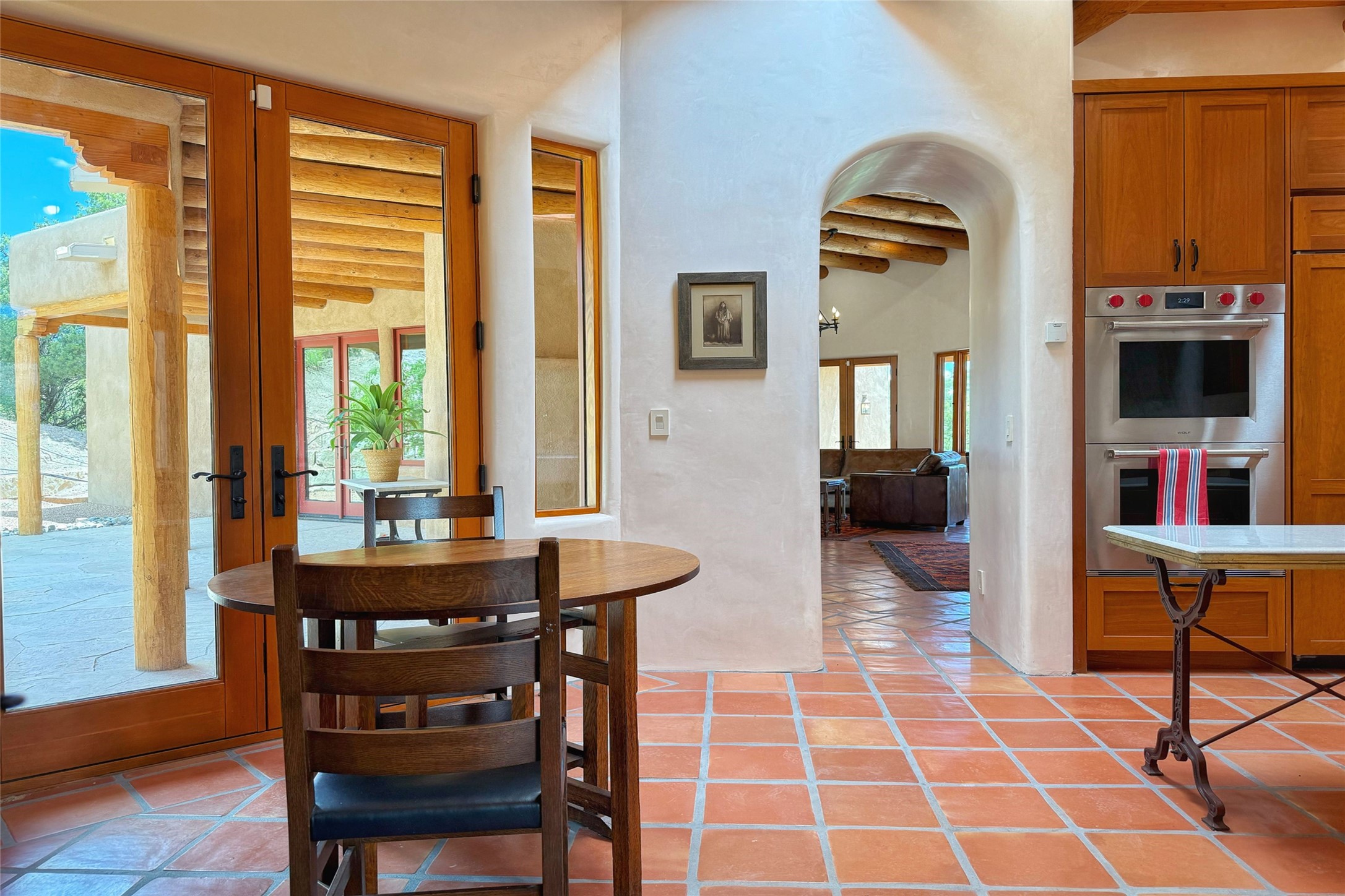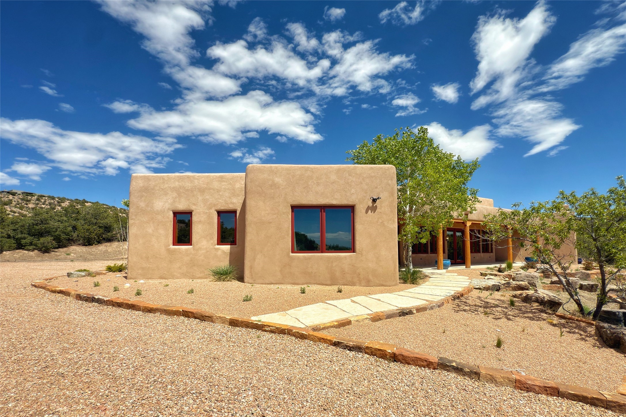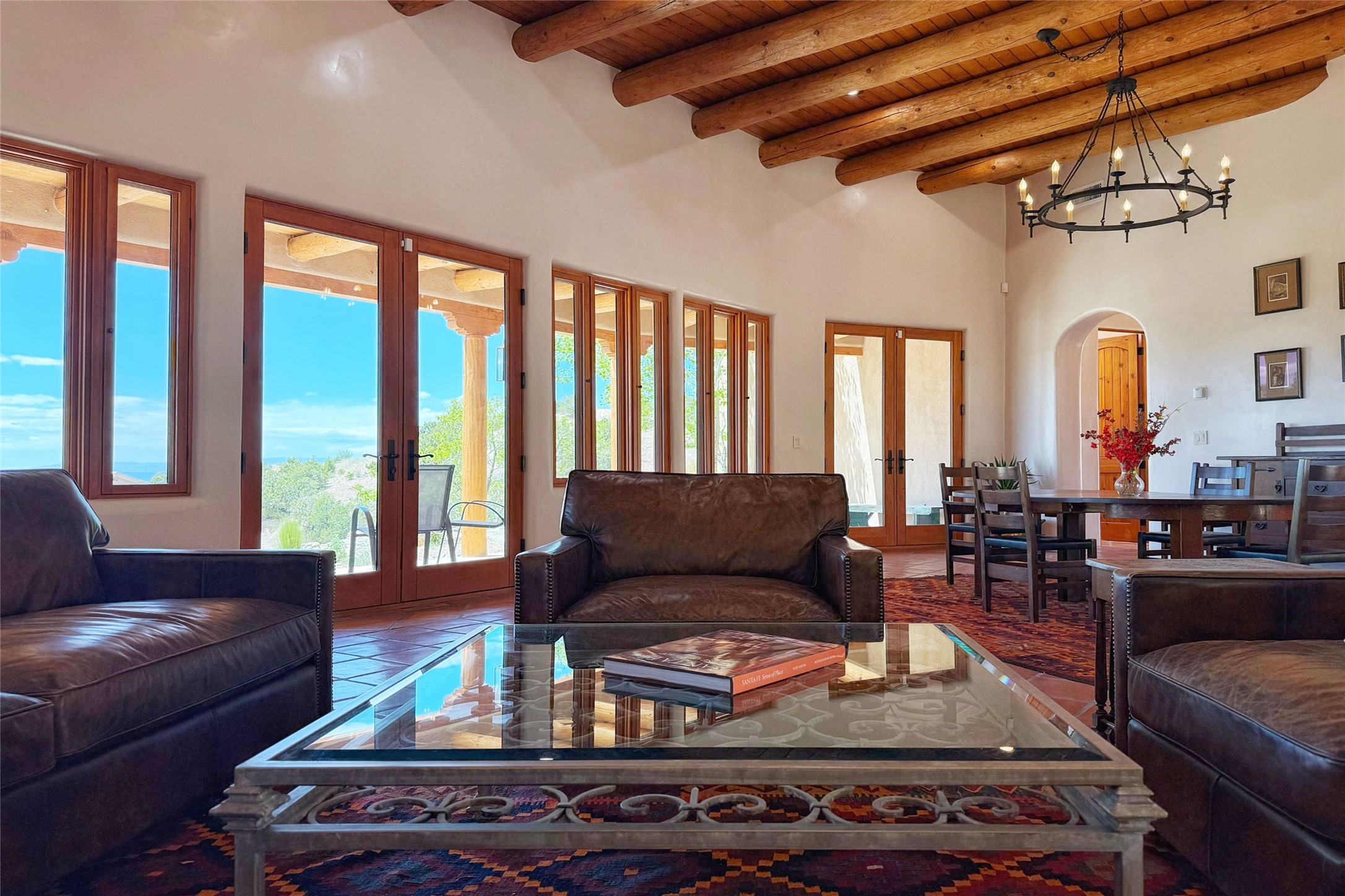 Southwest Elegance Meets Modern Luxury - Tesuque Estate Near Santa FeExperience timeless charm and refined upgrades in this exceptional Tesuque estate just 15 minutes from downtown Santa Fe. The property includes a beautifully renovated main house, a private guesthouse, and a versatile third structure ideal as a studio, barn, or additional guest quarters.The main residence showcases superior craftsmanship with diamond plaster walls, Loewen windows and doors, and Saltillo tile floors. The chef's kitchen features SubZero and Wolf appliances, an Asko dishwasher, an imported porcelain farmhouse sink, and striking Taj Mahal quartz countertops. The great room impresses with soaring ceilings, dual chandeliers, a wood-burning fireplace, and expansive western views, flowing onto two covered flagstone patios--perfect for indoor-outdoor living.The primary suite offers a luxurious retreat with its own fireplace, a spa-like bath with soaking tub, walk-in shower, dual pedestal sinks, and an adjacent study with fireplace and patio access. Two additional bedrooms complete the home--one with ensuite bath, the other with access to a nearby half bath. Comforts include radiant floor heating and central A/C.The guesthouse offers two bedrooms and two baths, with upgrades mirroring the main home: diamond plaster walls, quartz countertops, radiant heating, central A/C, and Loewen windows. Its primary suite features a kiva fireplace, soaking tub, and walk-in shower, while the second bedroom enjoys tranquil western views. A cozy living/dining area with kiva fireplace and a private flagstone patio complete the space.Set on a beautifully landscaped lot with mature junipers, fenced areas, and irrigated gardens, this private estate offers peace and elegance just minutes from the heart of Santa Fe.