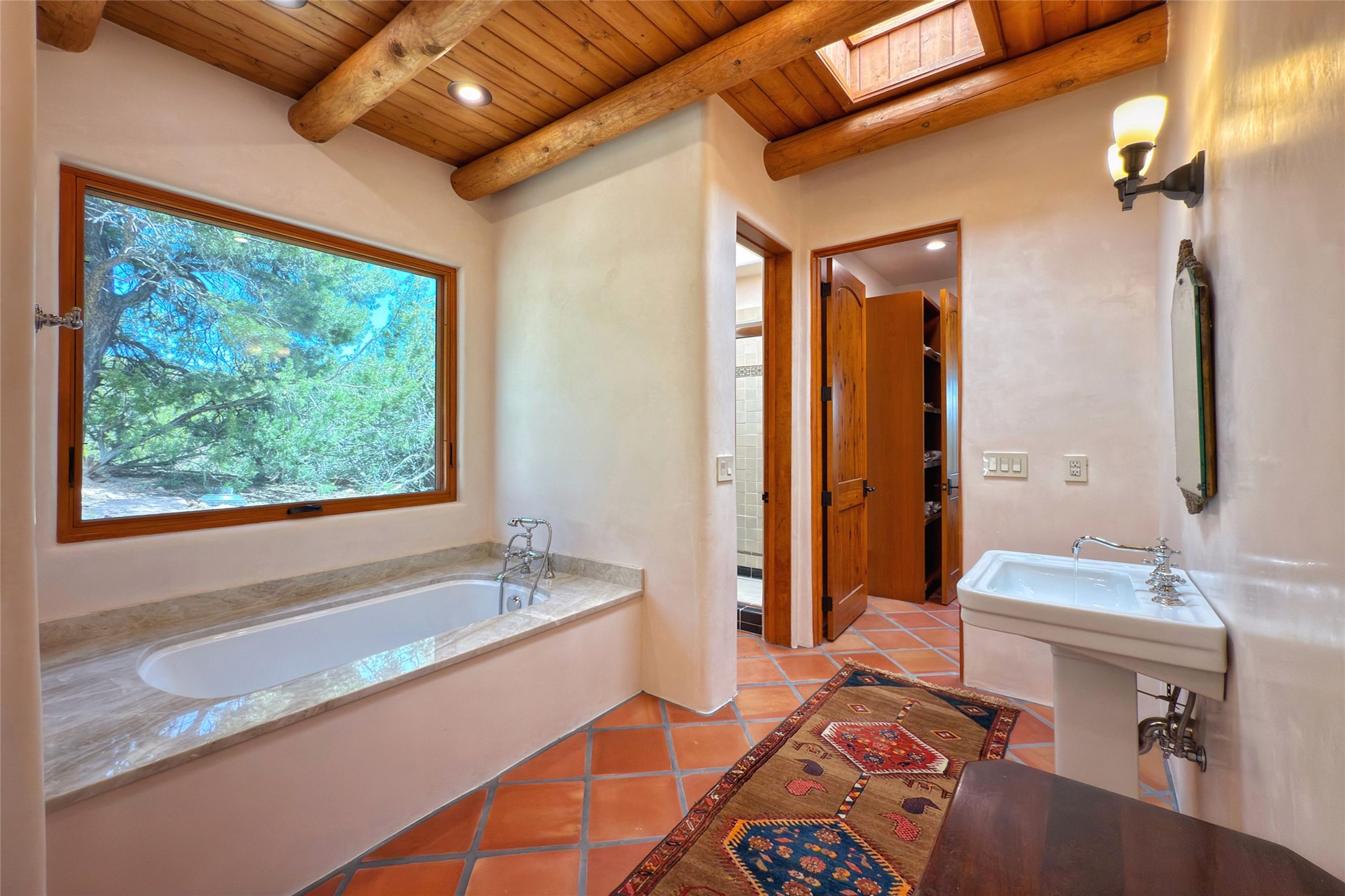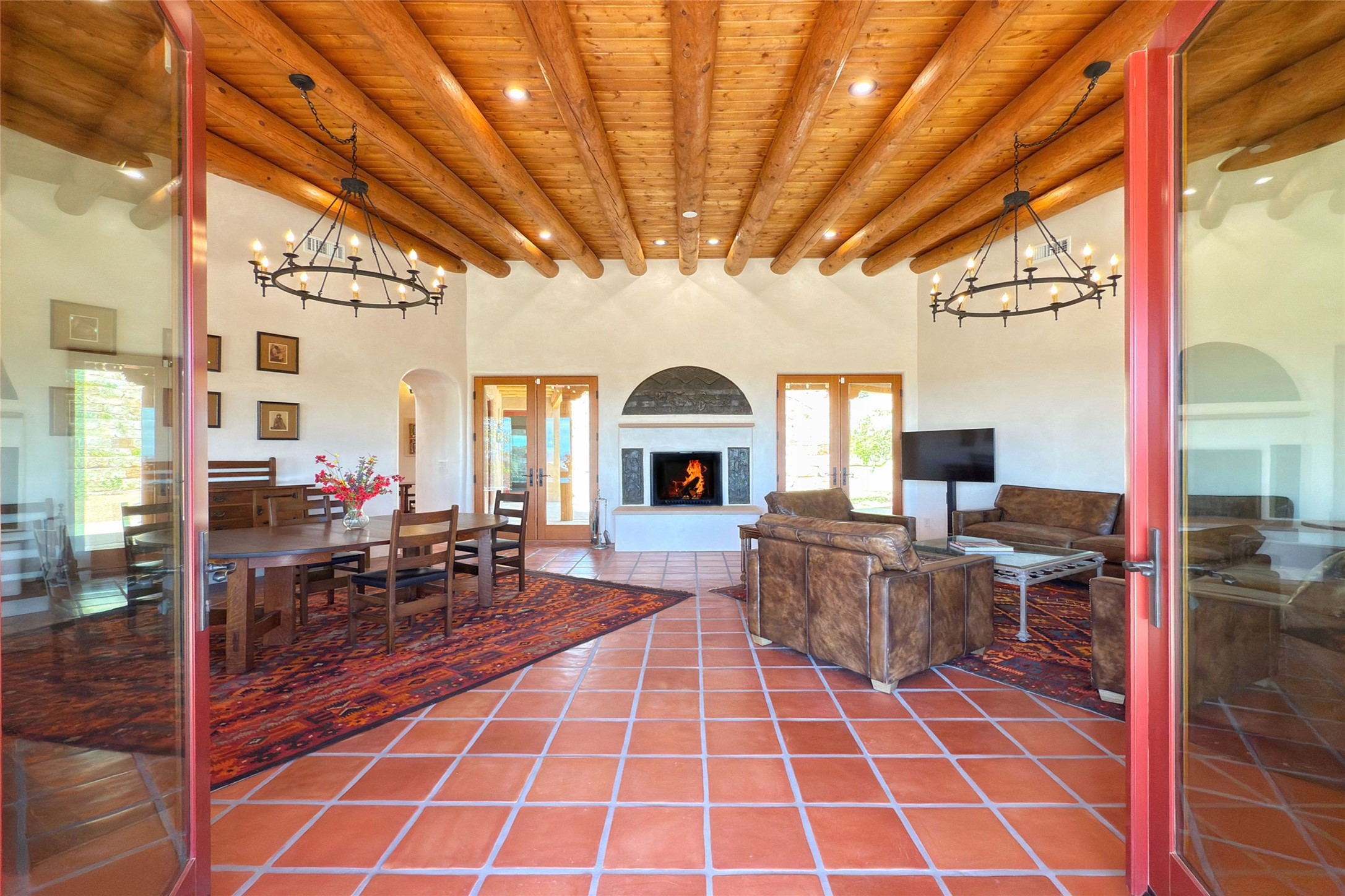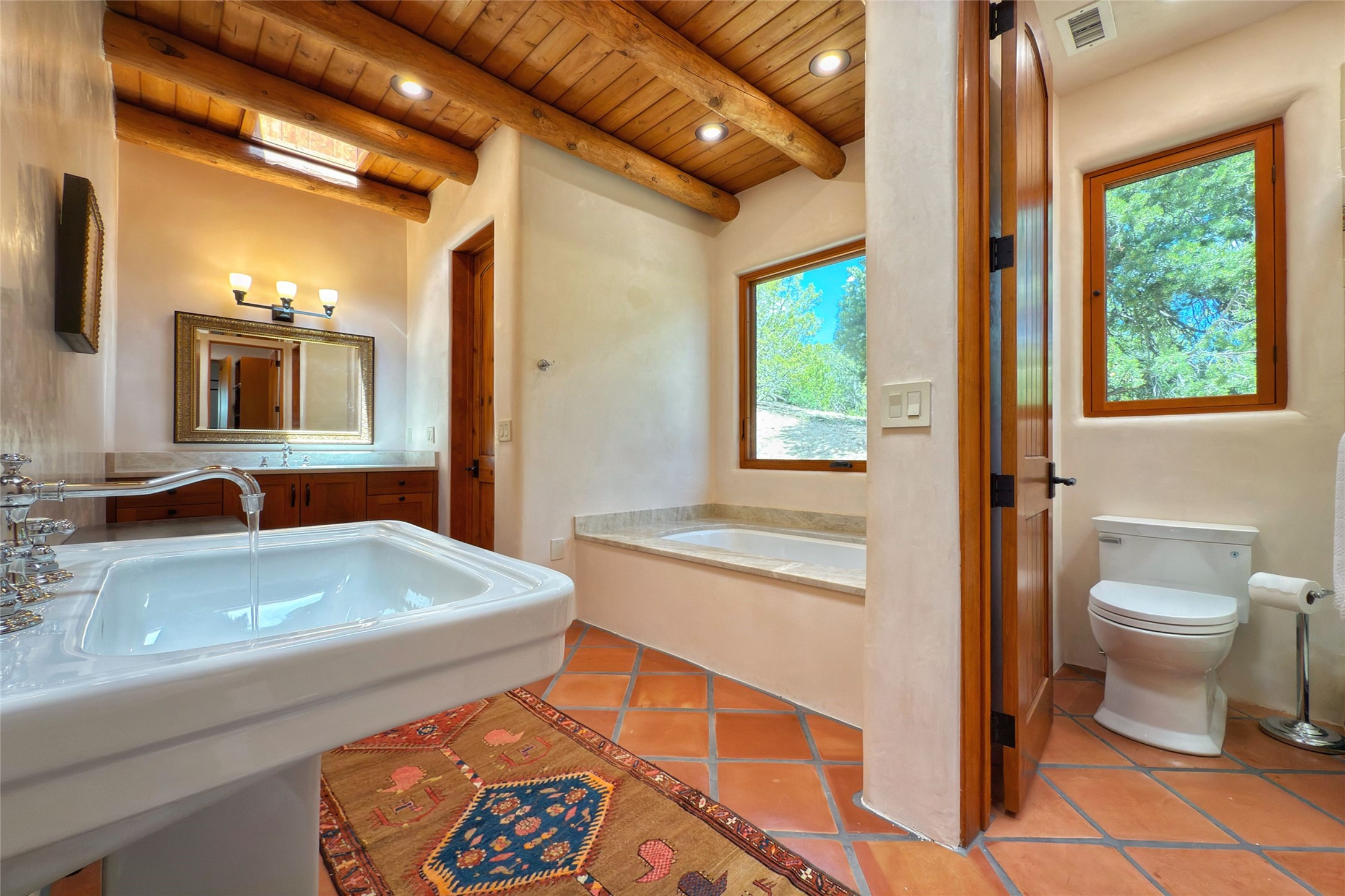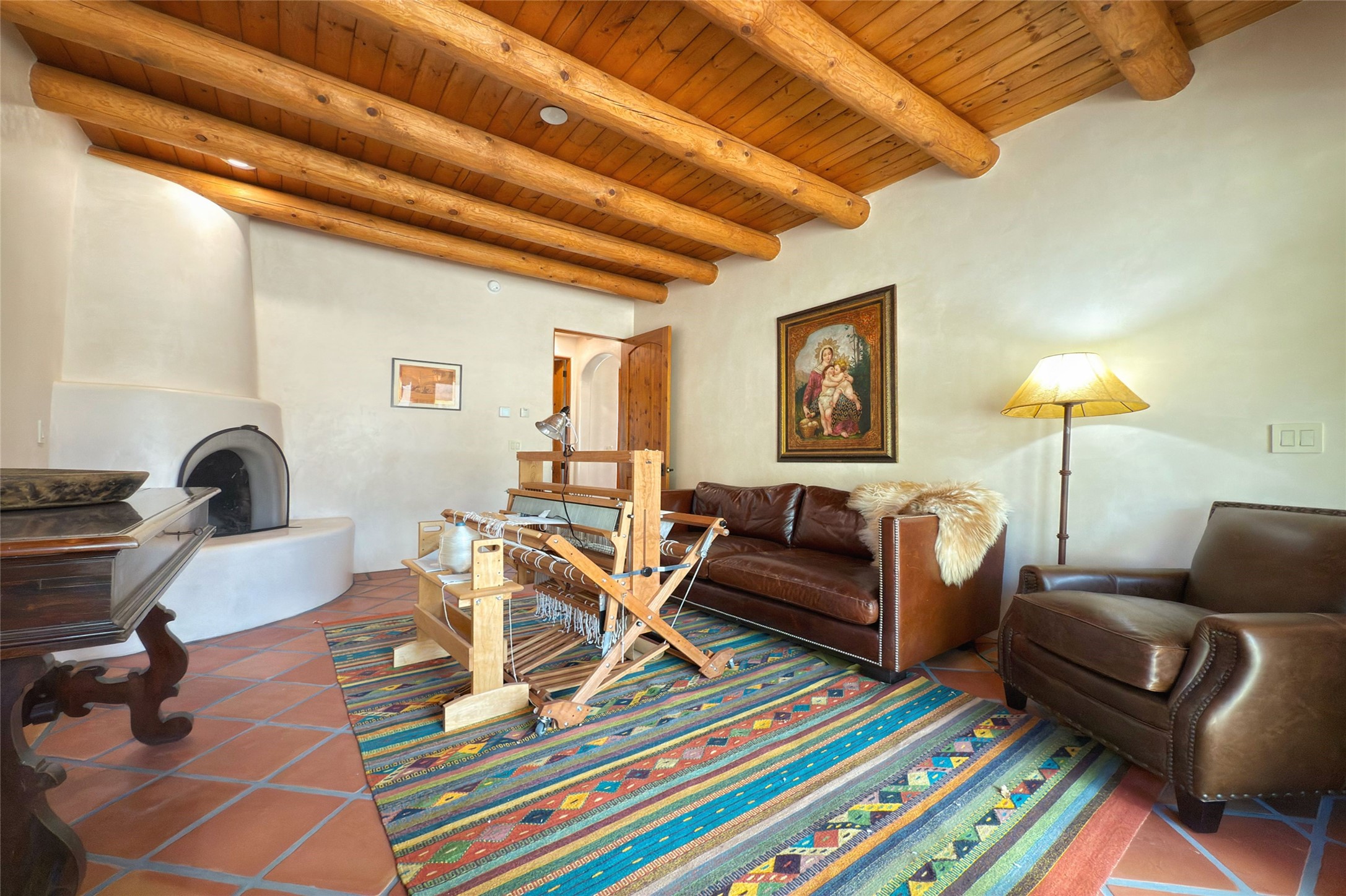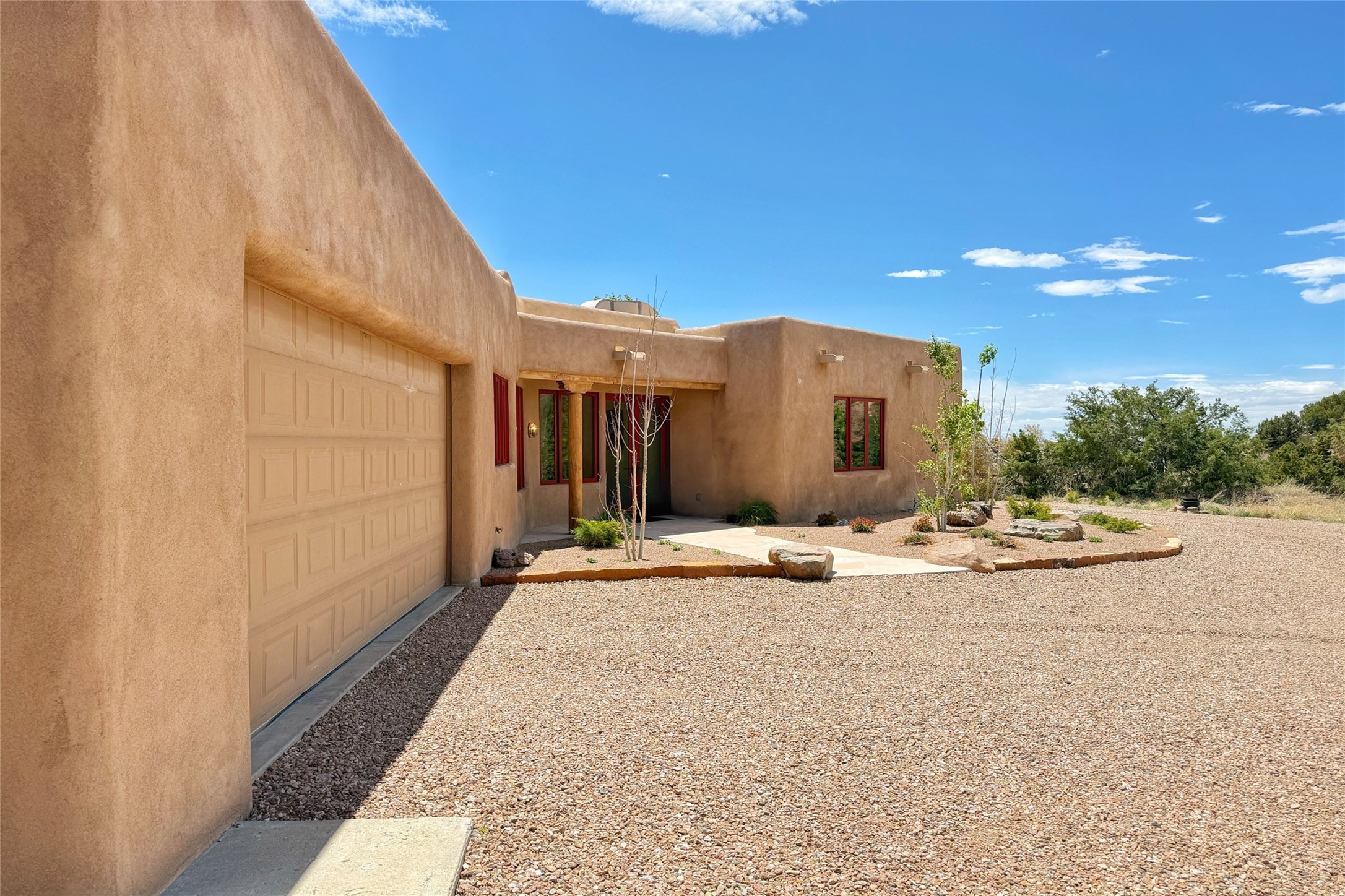 Southwest Elegance Meets Modern Luxury - Tesuque Estate Near Santa FeExperience timeless charm and refined upgrades in this exceptional Tesuque estate just 15 minutes from downtown Santa Fe. The property includes a beautifully renovated main house, a private guesthouse, and a versatile third structure ideal as a studio, barn, or additional guest quarters.The main residence showcases superior craftsmanship with diamond plaster walls, Loewen windows and doors, and Saltillo tile floors. The chef's kitchen features SubZero and Wolf appliances, an Asko dishwasher, an imported porcelain farmhouse sink, and striking Taj Mahal quartz countertops. The great room impresses with soaring ceilings, dual chandeliers, a wood-burning fireplace, and expansive western views, flowing onto two covered flagstone patios--perfect for indoor-outdoor living.The primary suite offers a luxurious retreat with its own fireplace, a spa-like bath with soaking tub, walk-in shower, dual pedestal sinks, and an adjacent study with fireplace and patio access. Two additional bedrooms complete the home--one with ensuite bath, the other with access to a nearby half bath. Comforts include radiant floor heating and central A/C.The guesthouse offers two bedrooms and two baths, with upgrades mirroring the main home: diamond plaster walls, quartz countertops, radiant heating, central A/C, and Loewen windows. Its primary suite features a kiva fireplace, soaking tub, and walk-in shower, while the second bedroom enjoys tranquil western views. A cozy living/dining area with kiva fireplace and a private flagstone patio complete the space.Set on a beautifully landscaped lot with mature junipers, fenced areas, and irrigated gardens, this private estate offers peace and elegance just minutes from the heart of Santa Fe.