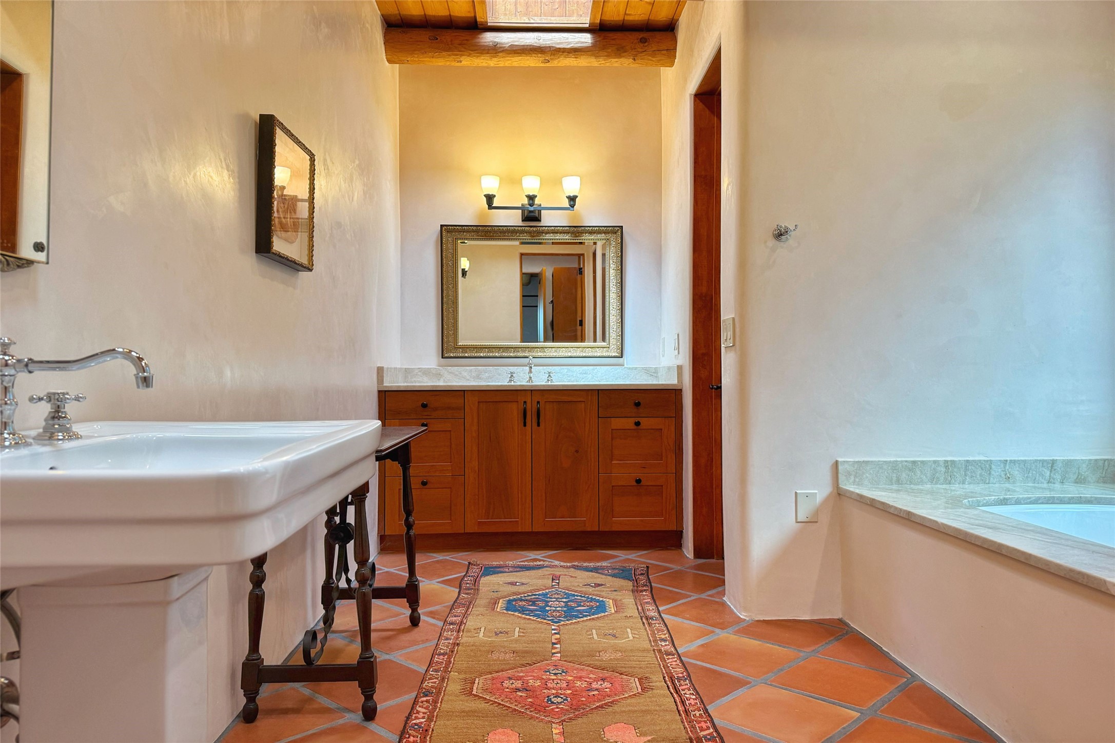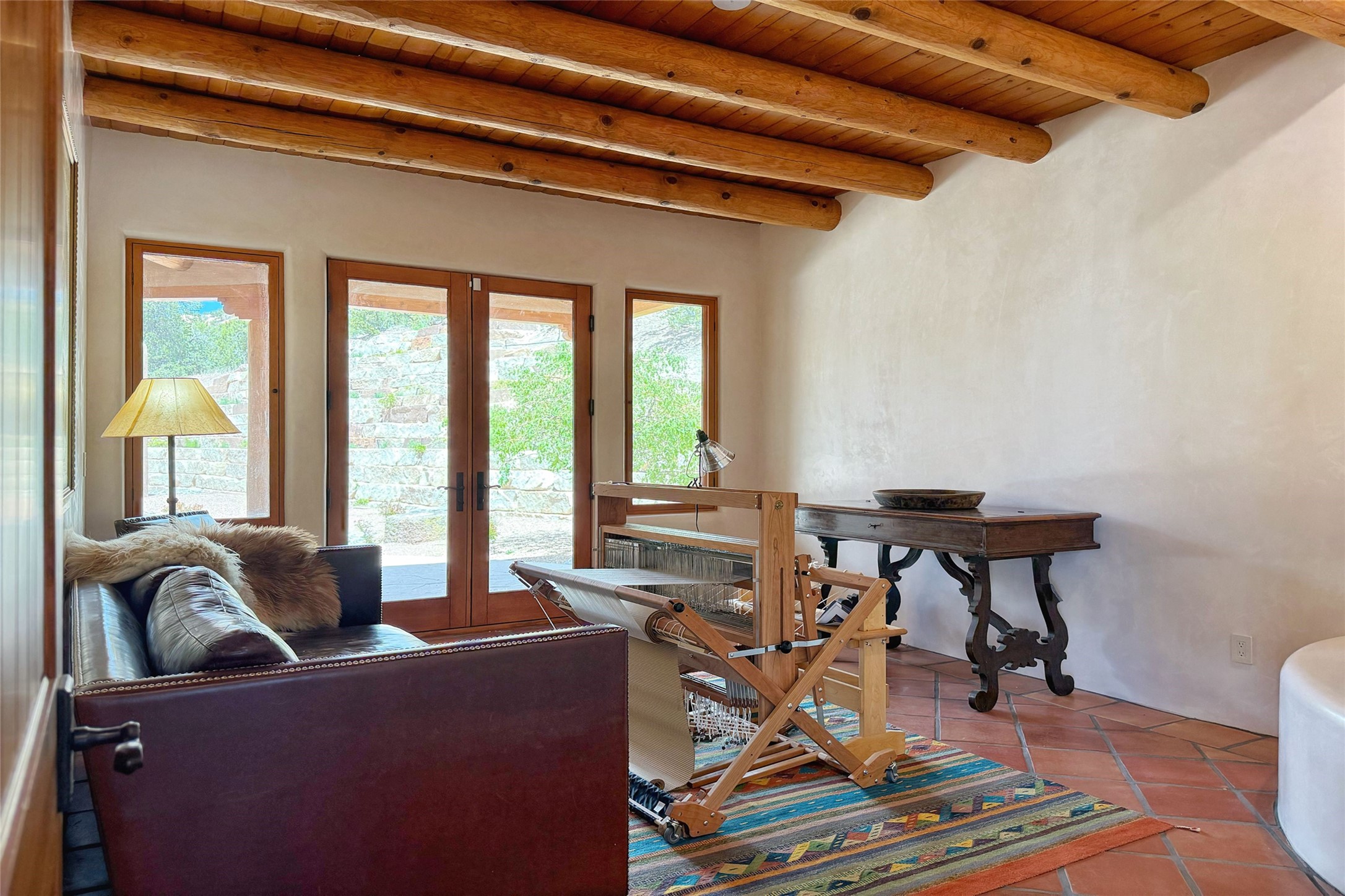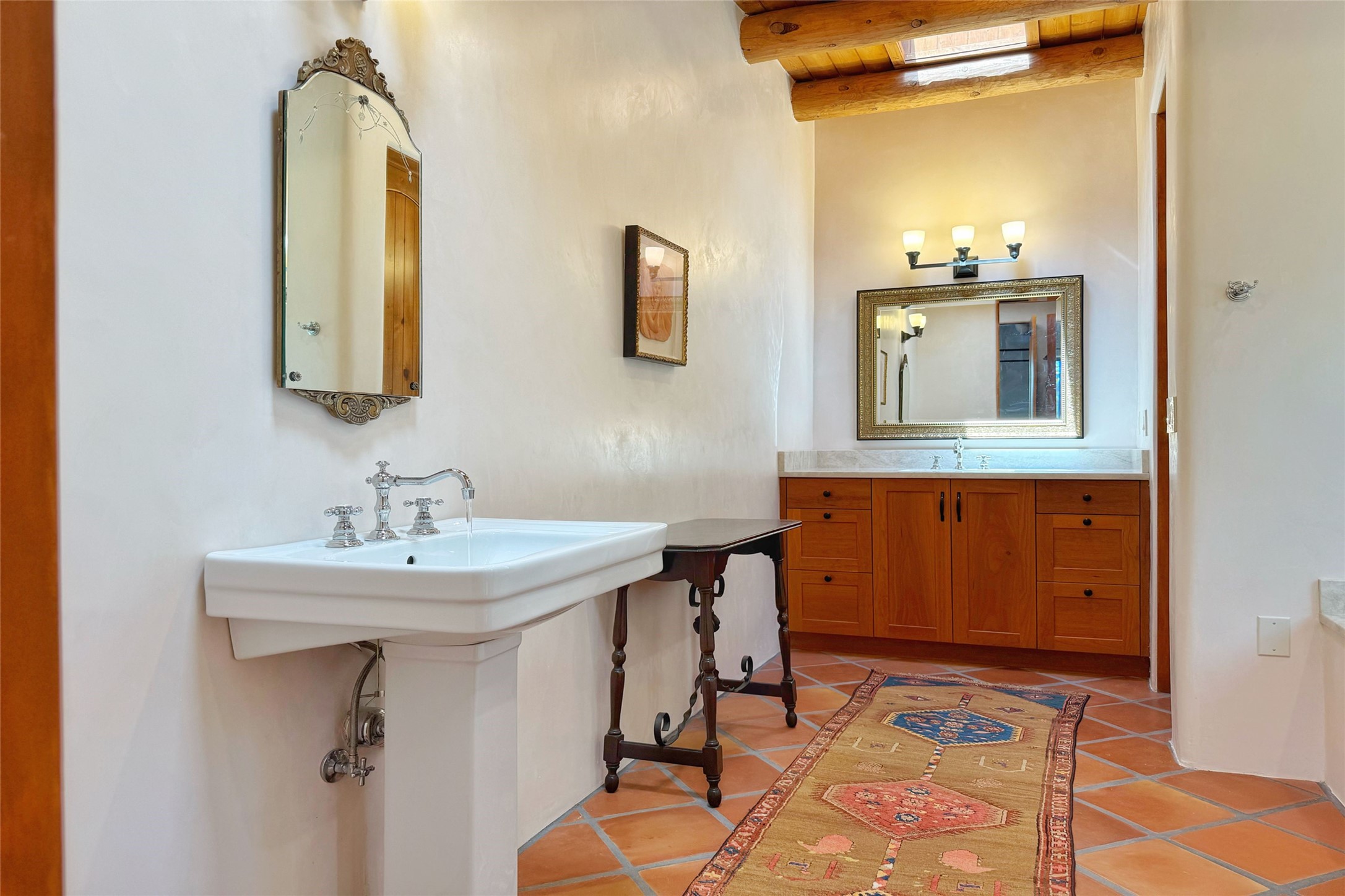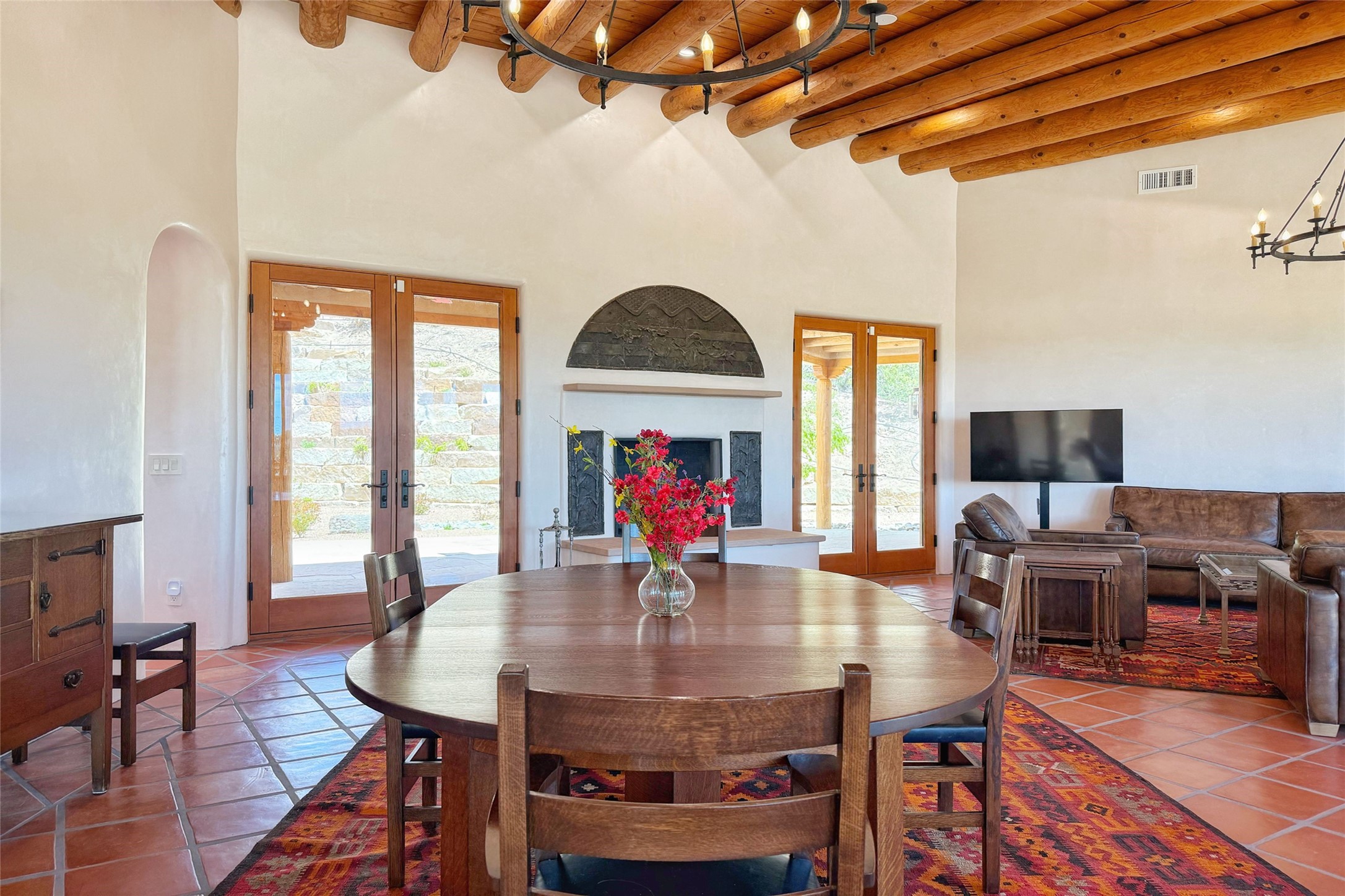Southwest Elegance Meets Modern Luxury - Tesuque Estate Near Santa FeExperience timeless charm and refined upgrades in this exceptional Tesuque estate just 15 minutes from downtown Santa Fe. The property includes a beautifully renovated main house, a private guesthouse, and a versatile third structure ideal as a studio, barn, or additional guest quarters.The main residence showcases superior craftsmanship with diamond plaster walls, Loewen windows and doors, and Saltillo tile floors. The chef's kitchen features SubZero and Wolf appliances, an Asko dishwasher, an imported porcelain farmhouse sink, and striking Taj Mahal quartz countertops. The great room impresses with soaring ceilings, dual chandeliers, a wood-burning fireplace, and expansive western views, flowing onto two covered flagstone patios--perfect for indoor-outdoor living.The primary suite offers a luxurious retreat with its own fireplace, a spa-like bath with soaking tub, walk-in shower, dual pedestal sinks, and an adjacent study with fireplace and patio access. Two additional bedrooms complete the home--one with ensuite bath, the other with access to a nearby half bath. Comforts include radiant floor heating and central A/C.The guesthouse offers two bedrooms and two baths, with upgrades mirroring the main home: diamond plaster walls, quartz countertops, radiant heating, central A/C, and Loewen windows. Its primary suite features a kiva fireplace, soaking tub, and walk-in shower, while the second bedroom enjoys tranquil western views. A cozy living/dining area with kiva fireplace and a private flagstone patio complete the space.Set on a beautifully landscaped lot with mature junipers, fenced areas, and irrigated gardens, this private estate offers peace and elegance just minutes from the heart of Santa Fe.