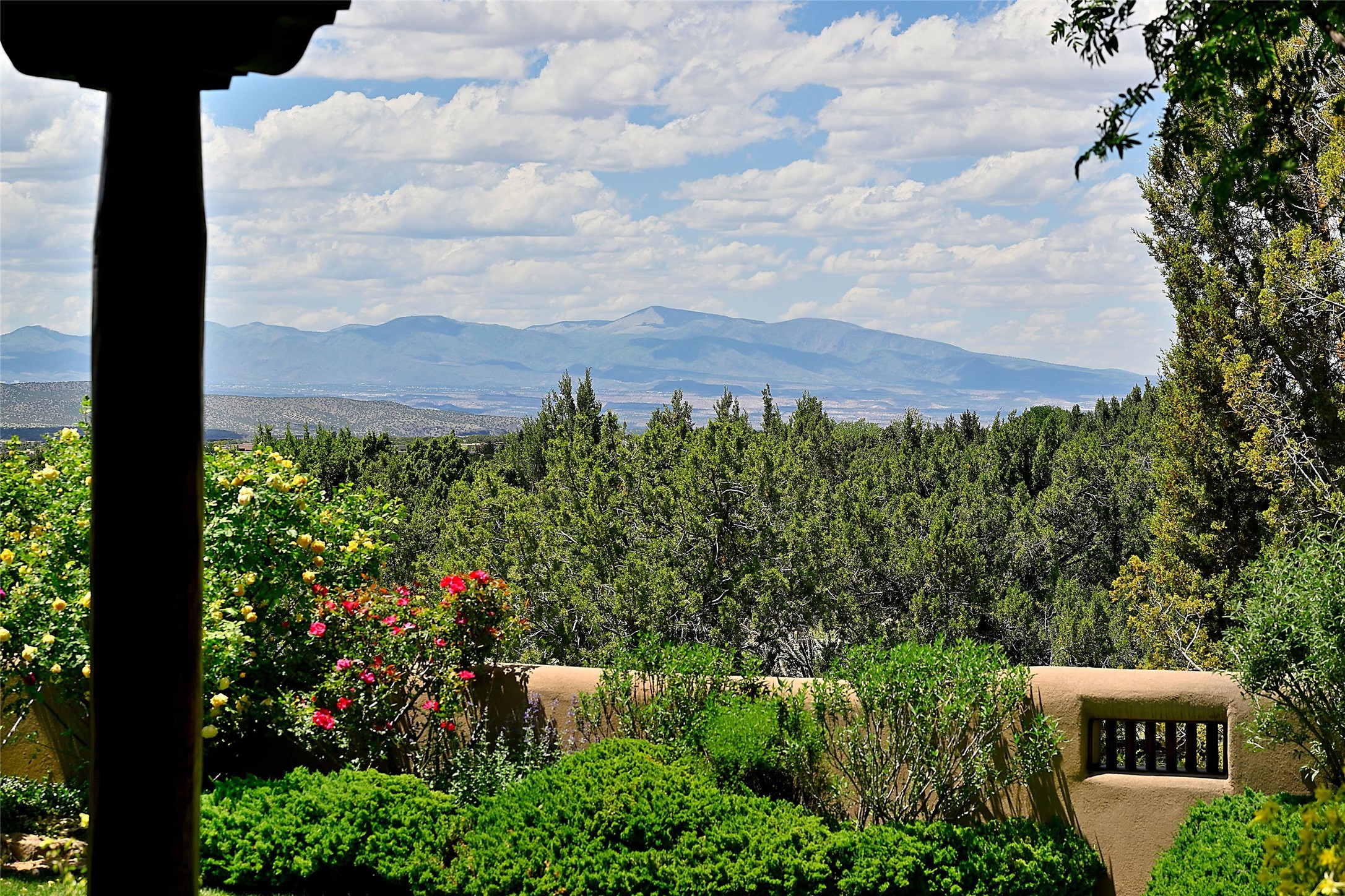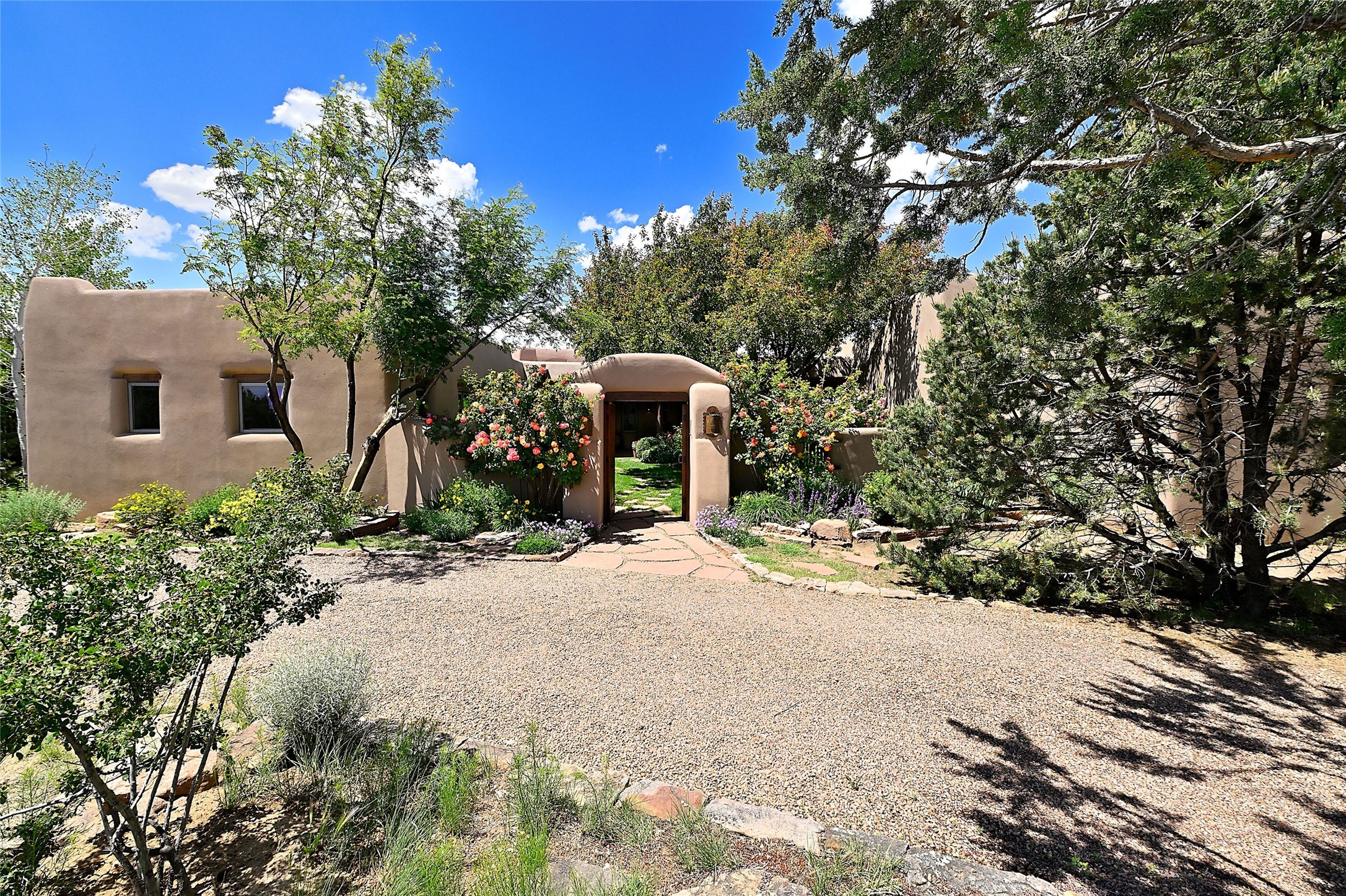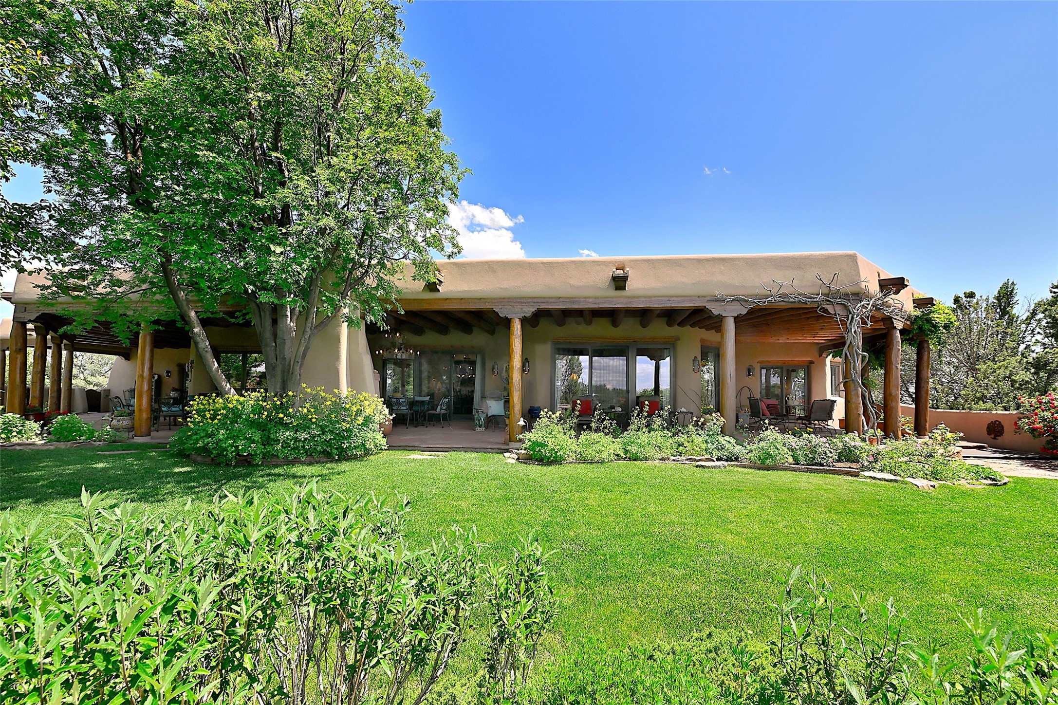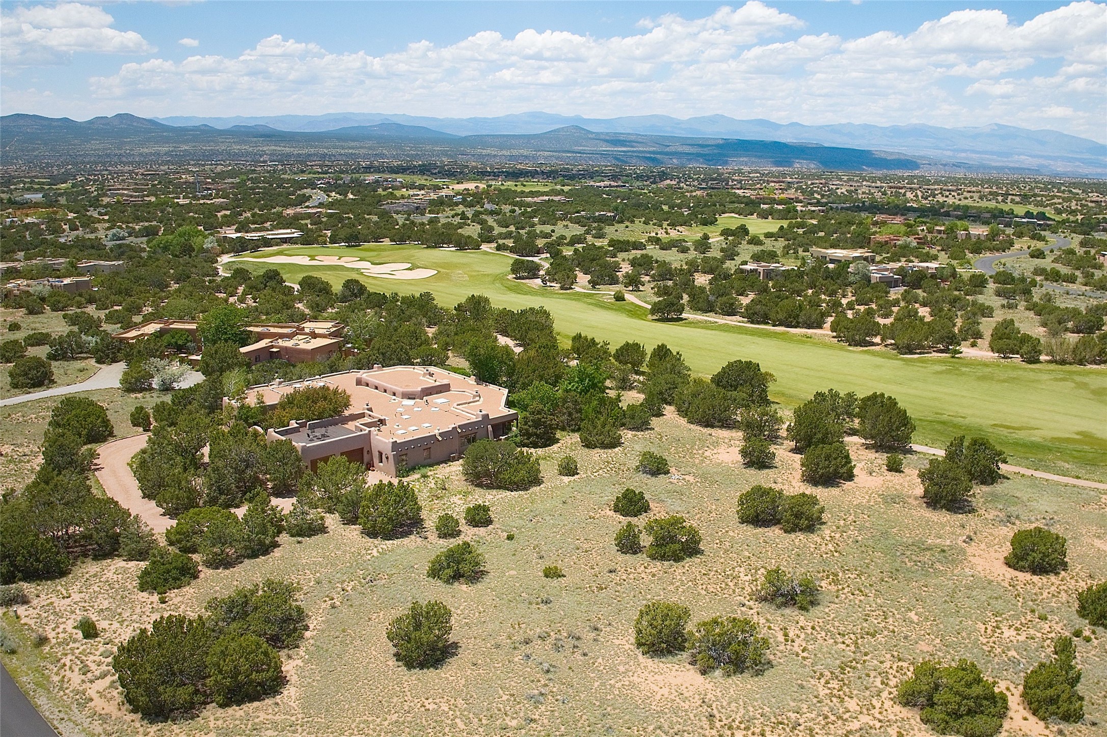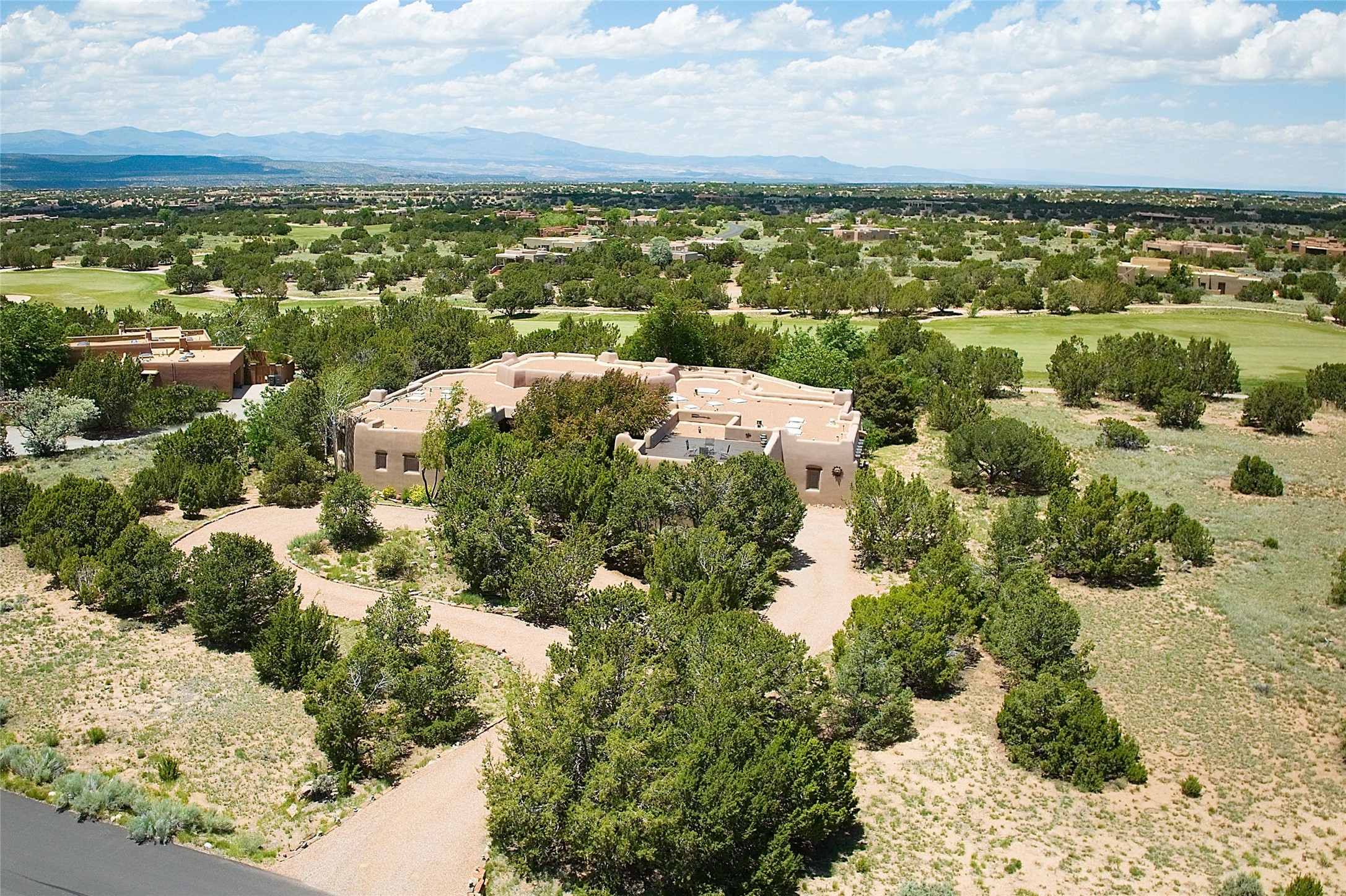Nestled in a prime location on the Sunrise Golf Course, this exceptional adobe residence invites you into a lifestyle defined by comfort, artistry, and connection to the outdoors. A stunning portal wraps around the entire back of the home, framing expansive views of both the Jemez and Sangre de Cristo Mountains. Overlooking lush gardens and a beautifully landscaped backyard, this outdoor space is a favorite spot for outdoor dining, relaxing with a book, or simply enjoying the peaceful and quiet. Inside, the great room welcomes you with warmth and grandeur. A unique entryway, curved walls, artful niches, and a substantial fireplace create a space that feels both impressive and intimate. Just beyond, the warm and cheerful kitchen draws everyone in--anchored by a cozy fireplace and defined by handcrafted tin and tile accents, custom cabinetry, and inviting seating areas. The primary suite is a spacious retreat with a beautifully designed bathroom and a generous double shower. A separate wing of the house holds three self-contained guest bedrooms, each with its own distinctive bath, offering privacy and comfort to family and visitors alike. A charming library, currently used as an office, is accompanied by a finely finished guest bath. Throughout the home, attention to detail abounds--from hand-carved wooden doors to vigas and latillas that lend warmth and texture to every room. Thick adobe walls offer natural insulation year-round, while gently curved interior walls contribute to the home's organic flow. Multiple fireplaces throughout the home and portal provide both ambiance and warmth. This is a home filled with light, character, and soul--whether strolling near the golf course at sunset or savoring the serenity of the gardens, every space offers something truly special. Above all, it is simply a wonderful home to live in and love.