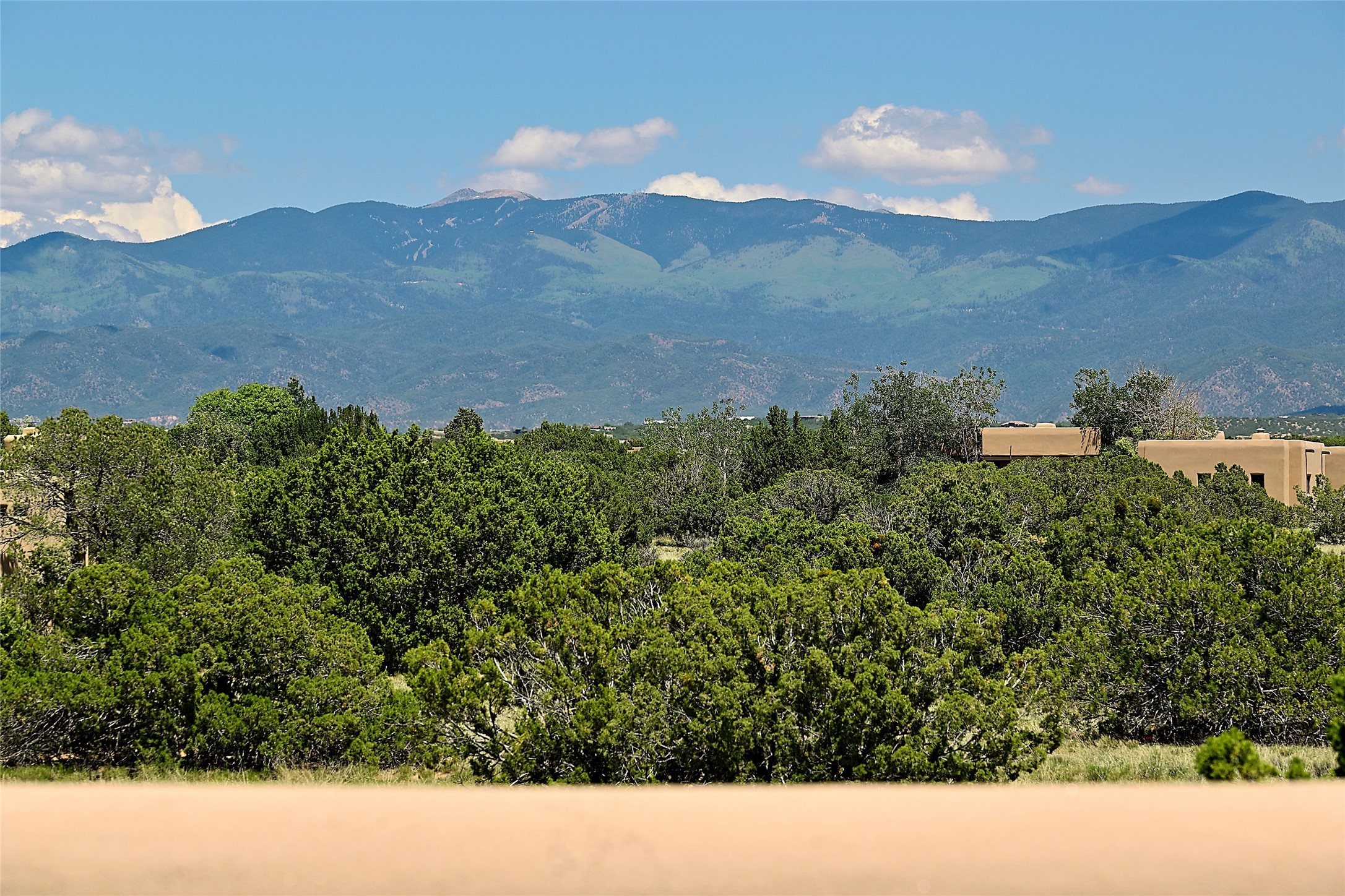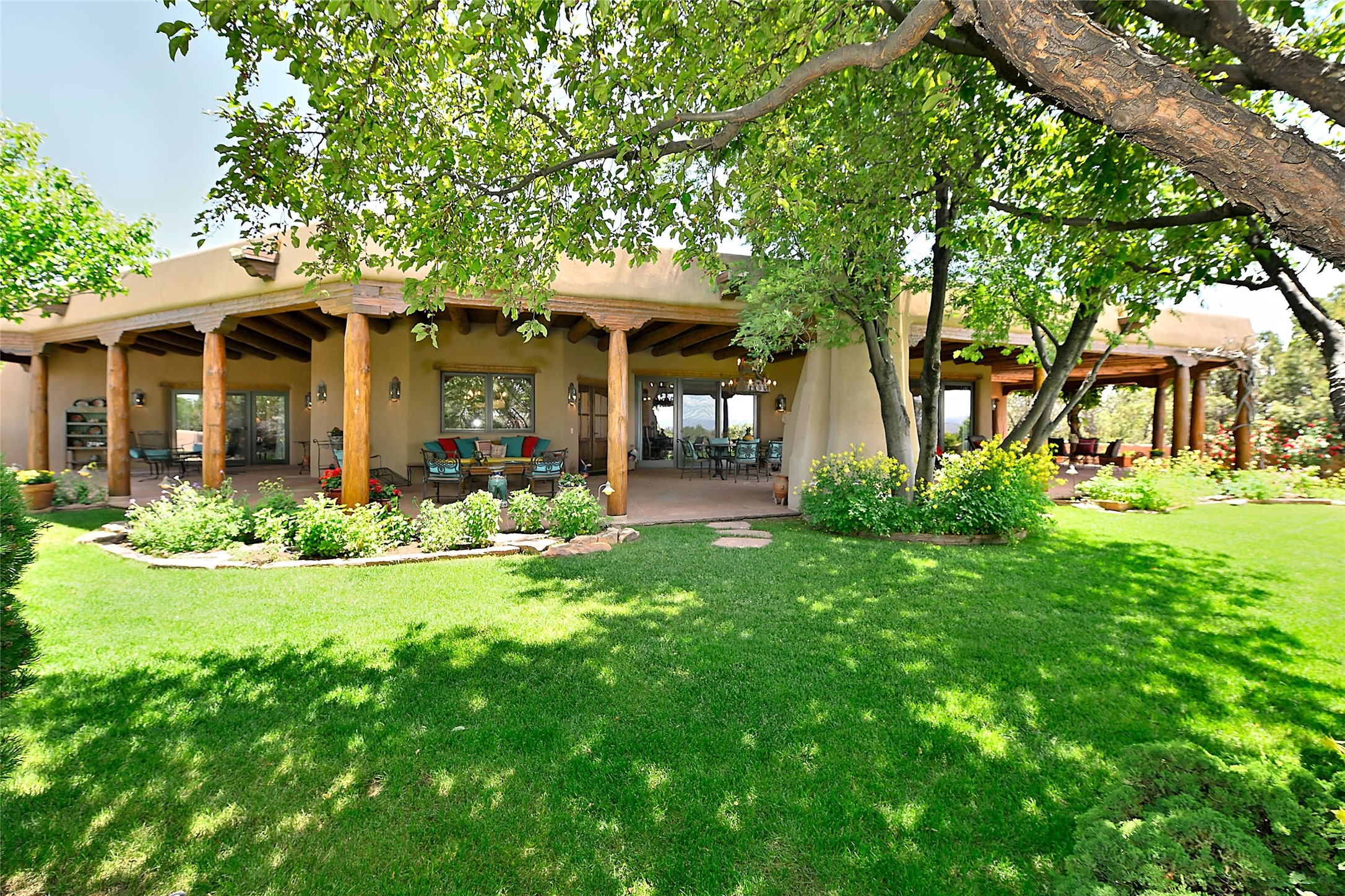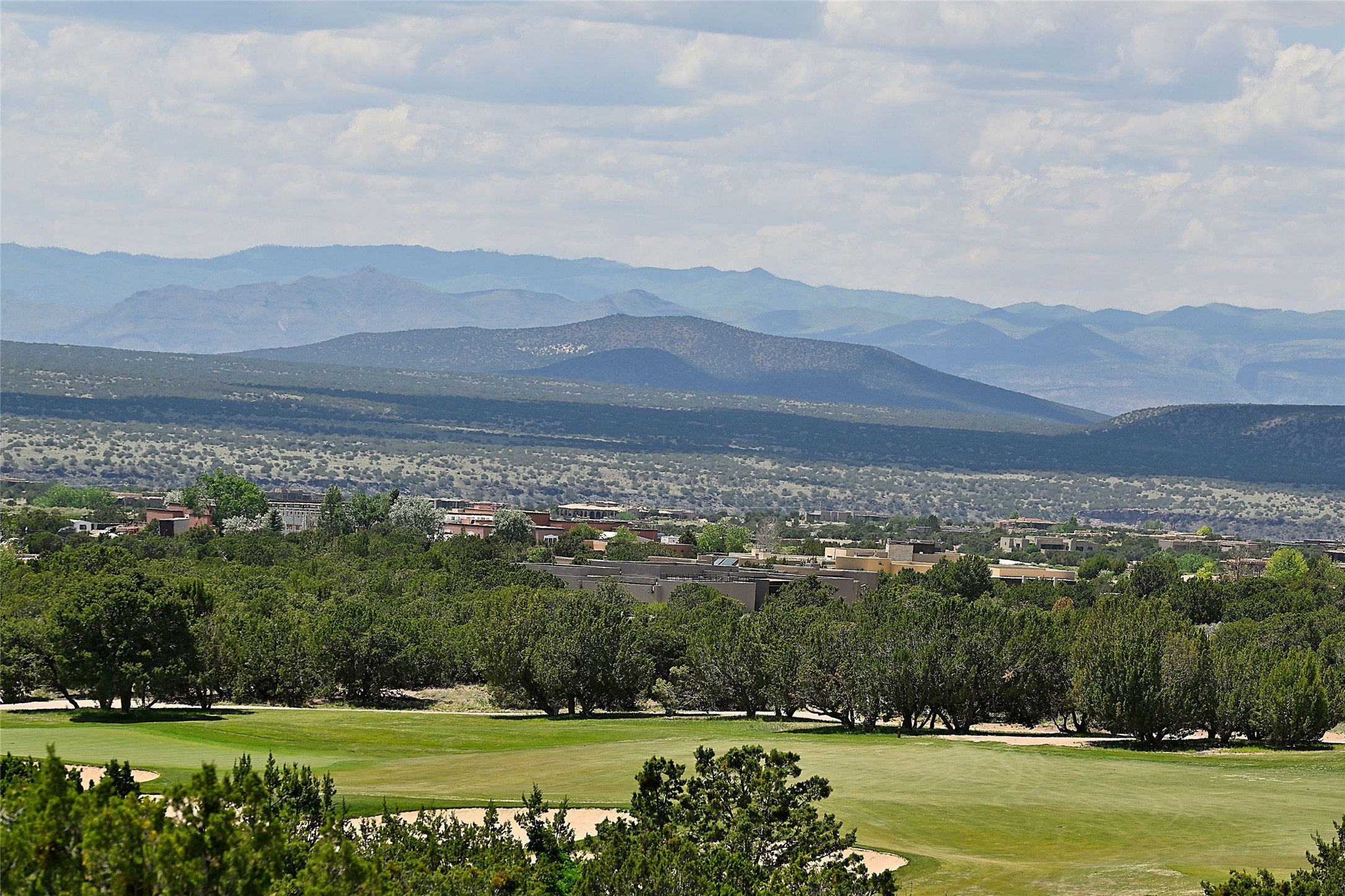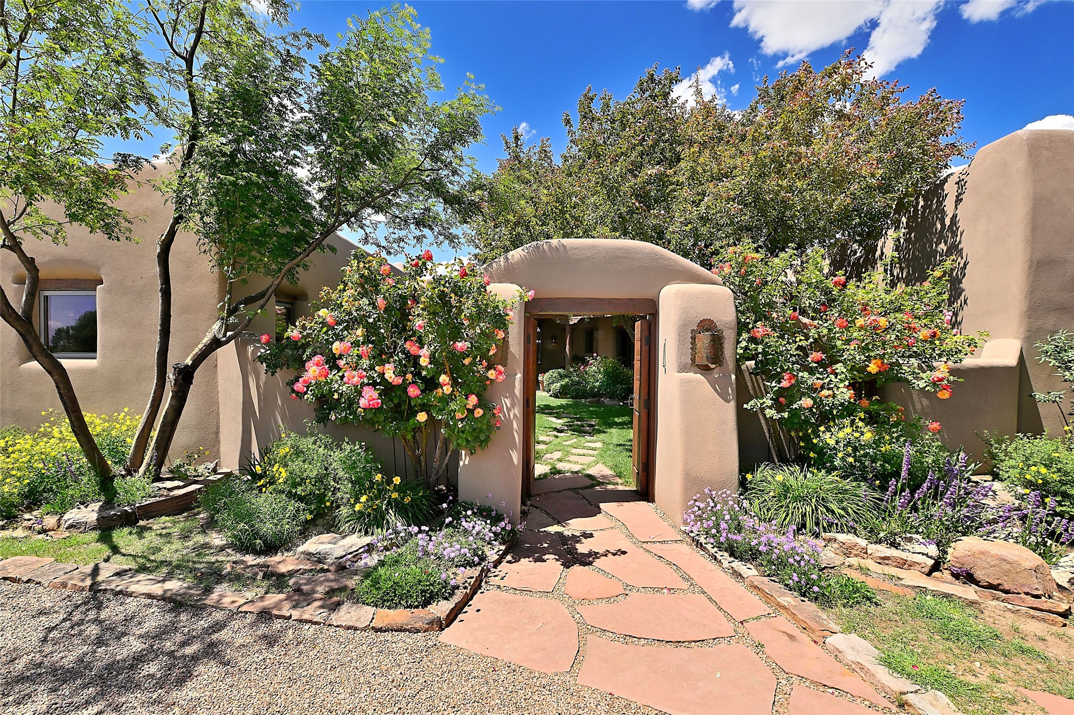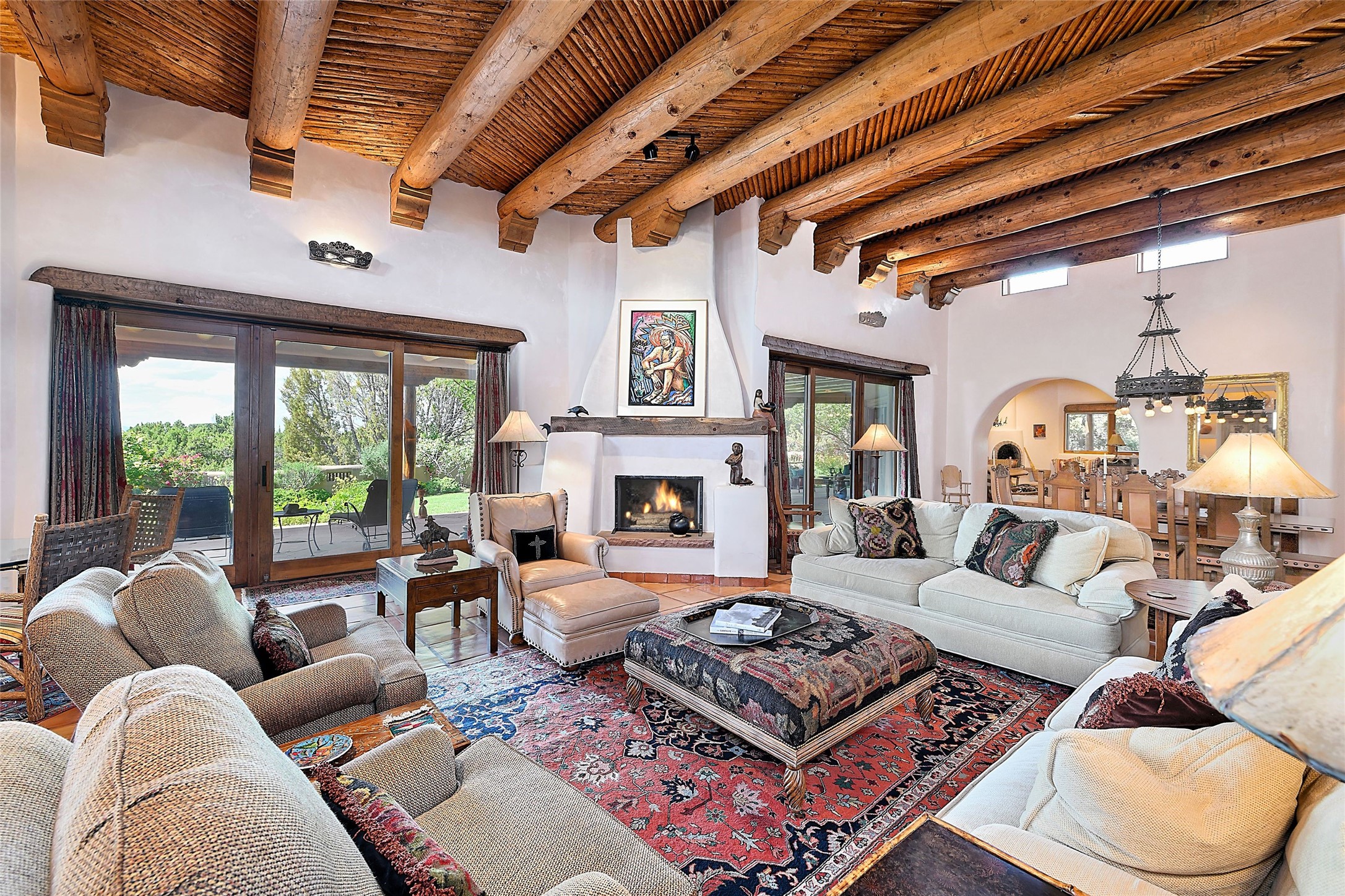 Nestled in a prime location on the Sunrise Golf Course, this exceptional adobe residence invites you into a lifestyle defined by comfort, artistry, and connection to the outdoors. A stunning portal wraps around the entire back of the home, framing expansive views of both the Jemez and Sangre de Cristo Mountains. Overlooking lush gardens and a beautifully landscaped backyard, this outdoor space is a favorite spot for outdoor dining, relaxing with a book, or simply enjoying the peaceful and quiet. Inside, the great room welcomes you with warmth and grandeur. A unique entryway, curved walls, artful niches, and a substantial fireplace create a space that feels both impressive and intimate. Just beyond, the warm and cheerful kitchen draws everyone in--anchored by a cozy fireplace and defined by handcrafted tin and tile accents, custom cabinetry, and inviting seating areas. The primary suite is a spacious retreat with a beautifully designed bathroom and a generous double shower. A separate wing of the house holds three self-contained guest bedrooms, each with its own distinctive bath, offering privacy and comfort to family and visitors alike. A charming library, currently used as an office, is accompanied by a finely finished guest bath. Throughout the home, attention to detail abounds--from hand-carved wooden doors to vigas and latillas that lend warmth and texture to every room. Thick adobe walls offer natural insulation year-round, while gently curved interior walls contribute to the home's organic flow. Multiple fireplaces throughout the home and portal provide both ambiance and warmth. This is a home filled with light, character, and soul--whether strolling near the golf course at sunset or savoring the serenity of the gardens, every space offers something truly special. Above all, it is simply a wonderful home to live in and love.