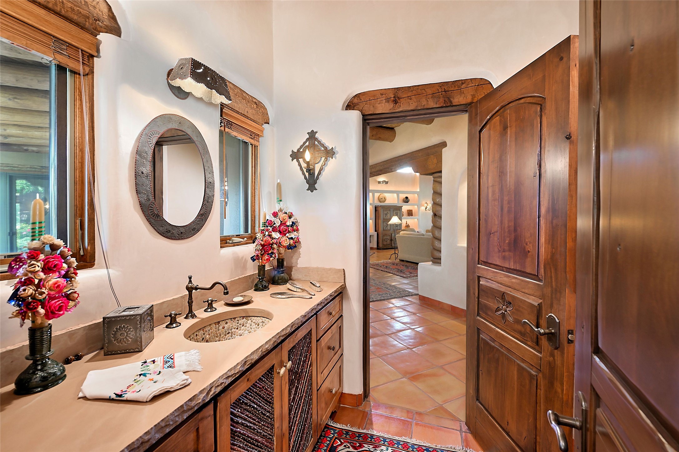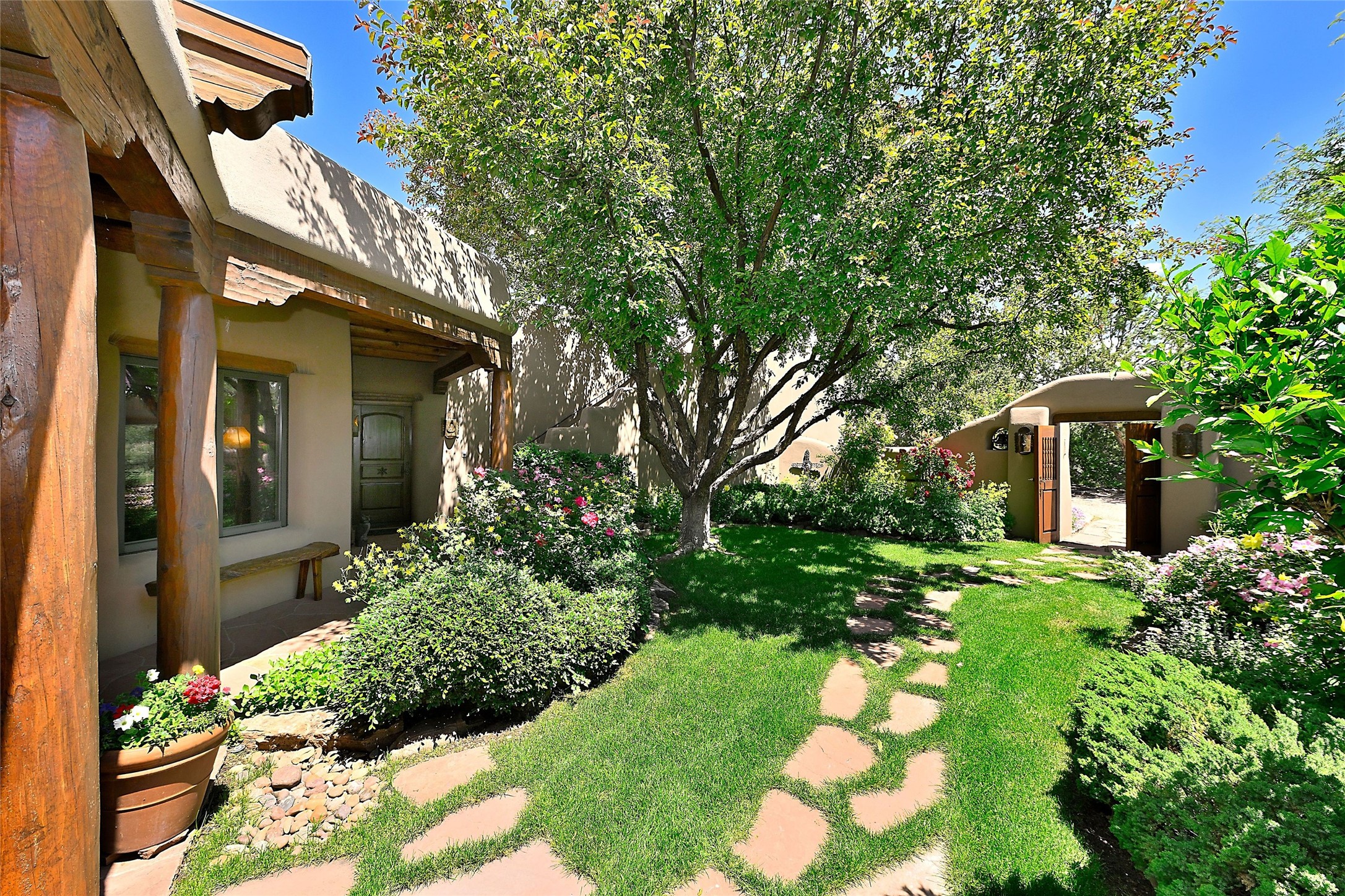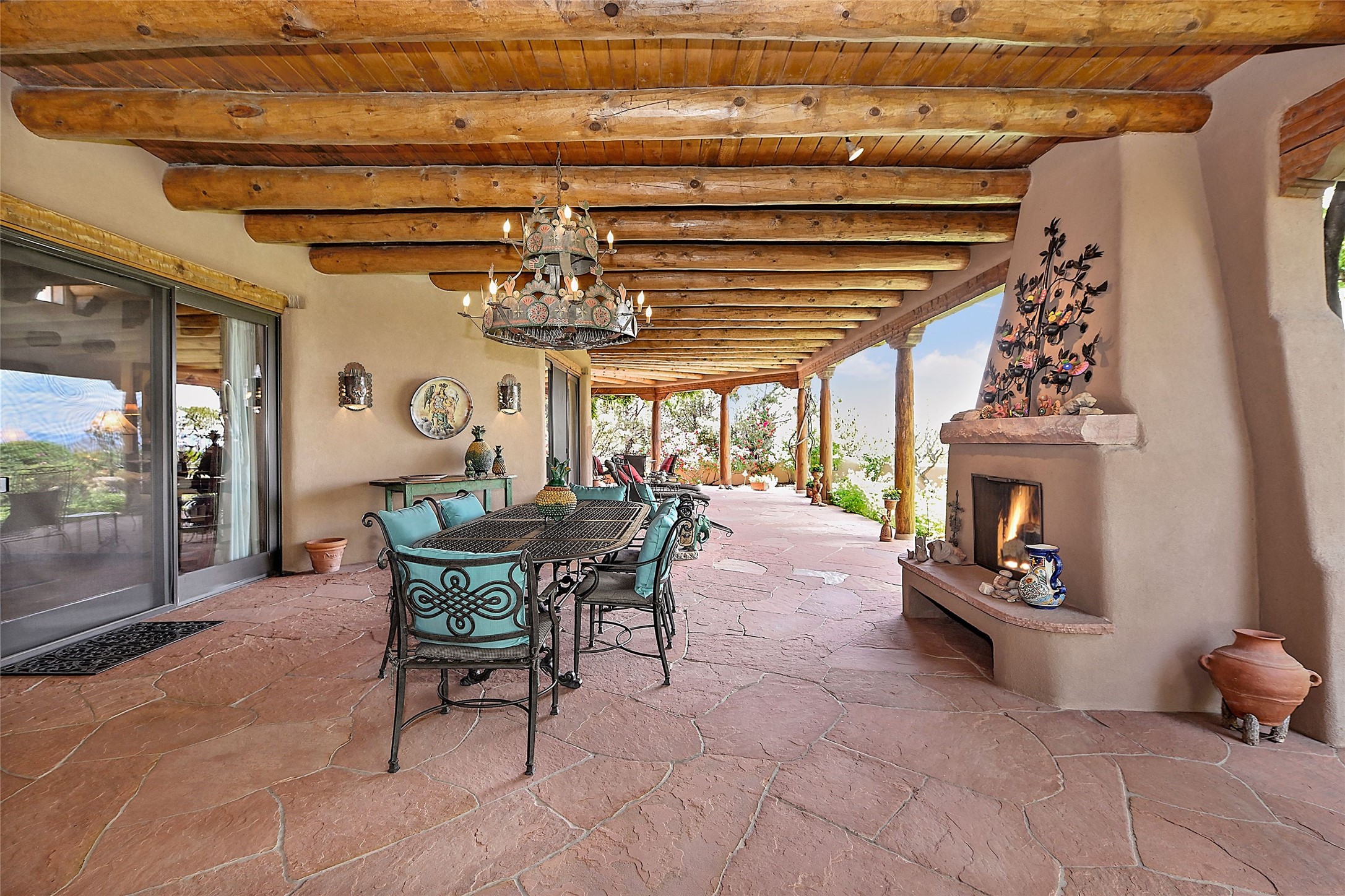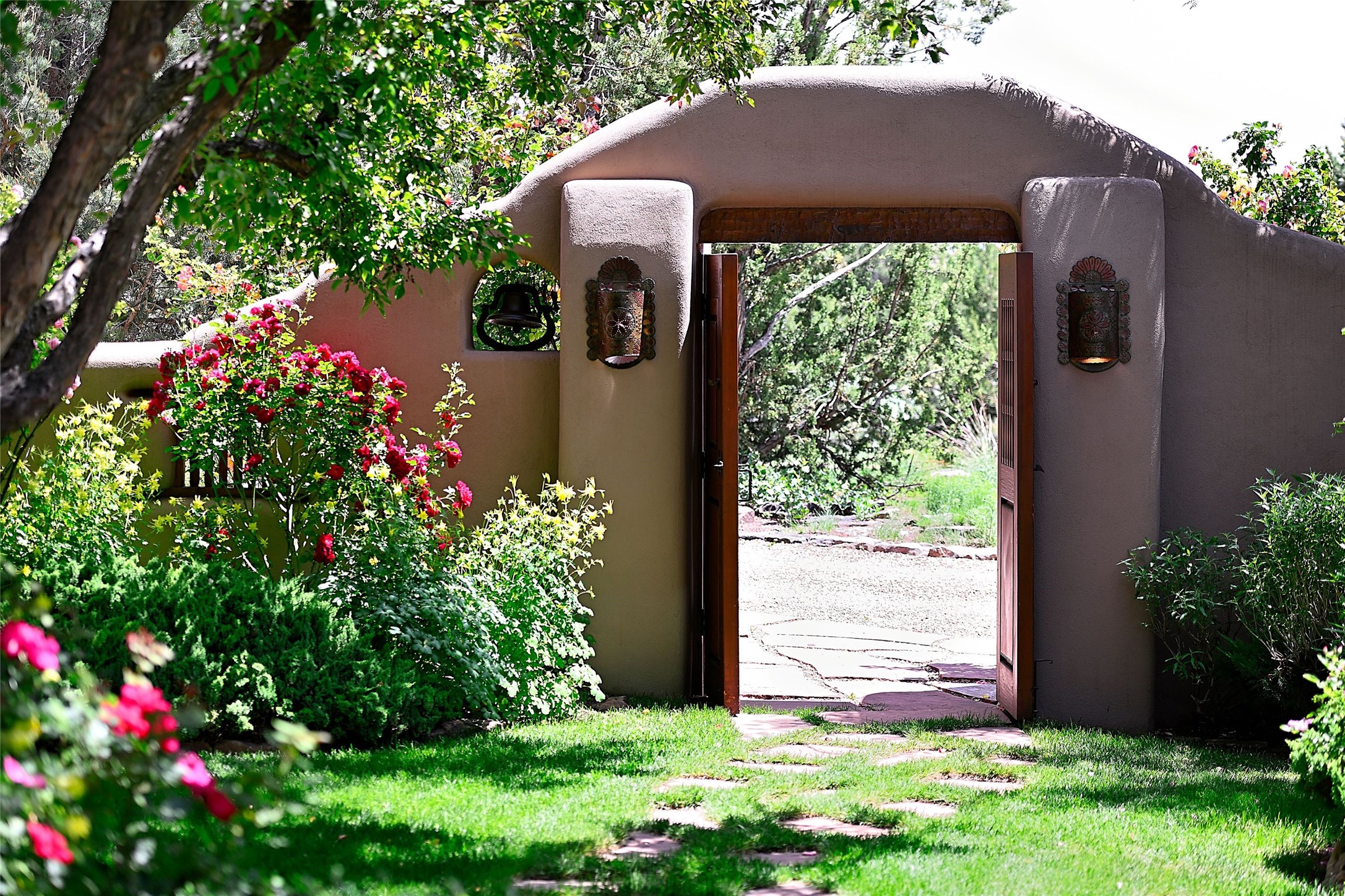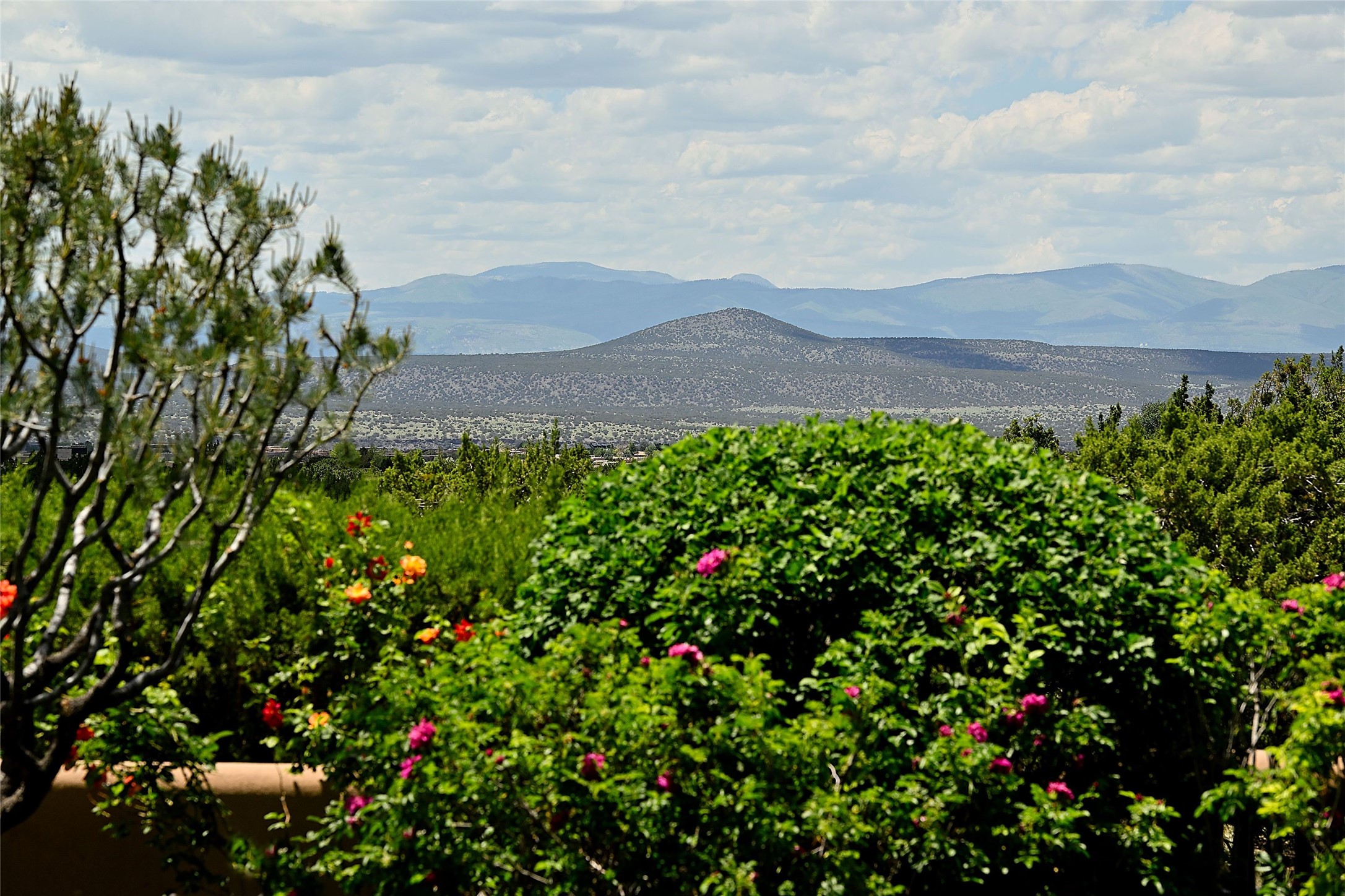 Nestled in a prime location on the Sunrise Golf Course, this exceptional adobe residence invites you into a lifestyle defined by comfort, artistry, and connection to the outdoors. A stunning portal wraps around the entire back of the home, framing expansive views of both the Jemez and Sangre de Cristo Mountains. Overlooking lush gardens and a beautifully landscaped backyard, this outdoor space is a favorite spot for outdoor dining, relaxing with a book, or simply enjoying the peaceful and quiet. Inside, the great room welcomes you with warmth and grandeur. A unique entryway, curved walls, artful niches, and a substantial fireplace create a space that feels both impressive and intimate. Just beyond, the warm and cheerful kitchen draws everyone in--anchored by a cozy fireplace and defined by handcrafted tin and tile accents, custom cabinetry, and inviting seating areas. The primary suite is a spacious retreat with a beautifully designed bathroom and a generous double shower. A separate wing of the house holds three self-contained guest bedrooms, each with its own distinctive bath, offering privacy and comfort to family and visitors alike. A charming library, currently used as an office, is accompanied by a finely finished guest bath. Throughout the home, attention to detail abounds--from hand-carved wooden doors to vigas and latillas that lend warmth and texture to every room. Thick adobe walls offer natural insulation year-round, while gently curved interior walls contribute to the home's organic flow. Multiple fireplaces throughout the home and portal provide both ambiance and warmth. This is a home filled with light, character, and soul--whether strolling near the golf course at sunset or savoring the serenity of the gardens, every space offers something truly special. Above all, it is simply a wonderful home to live in and love.