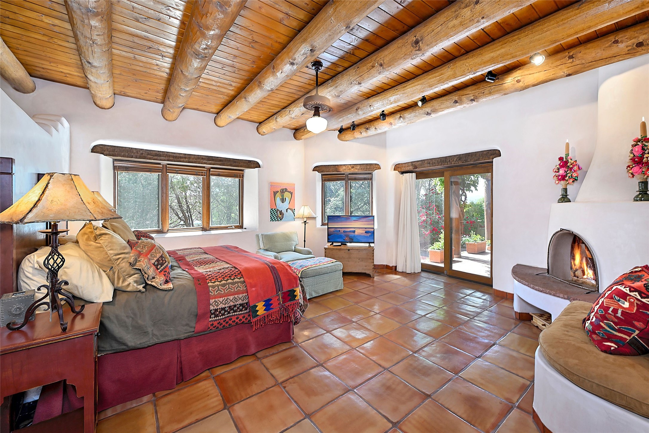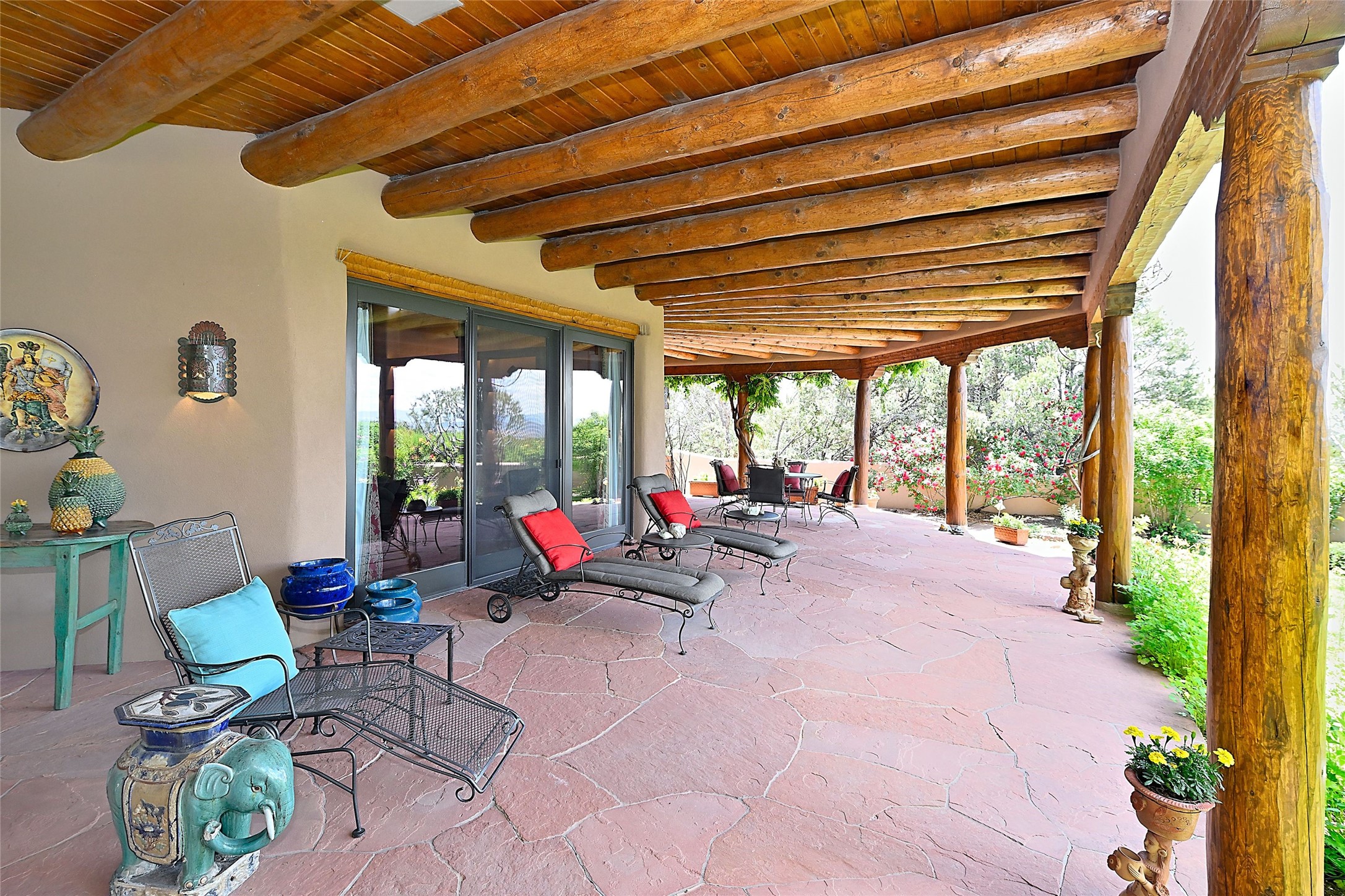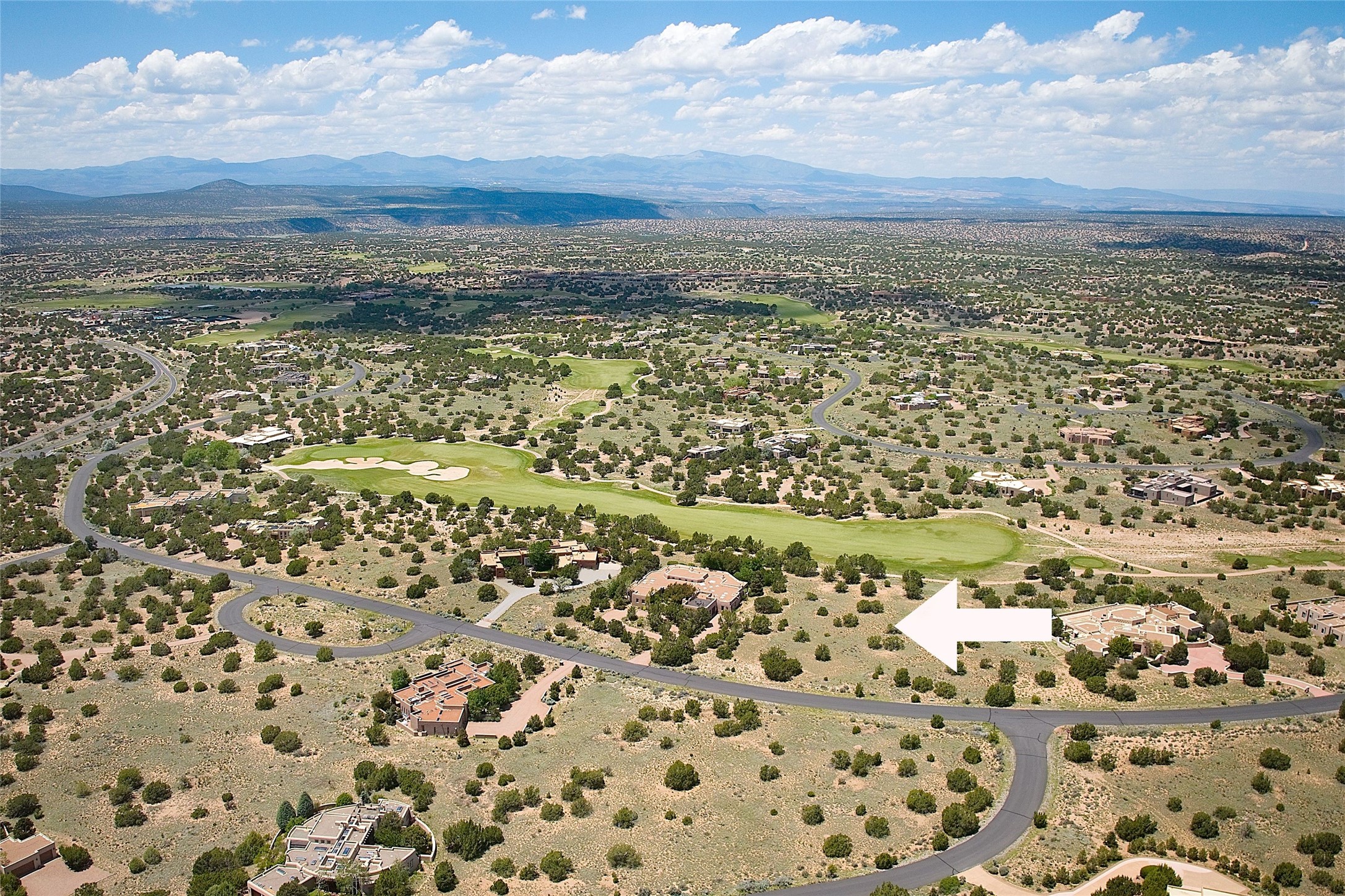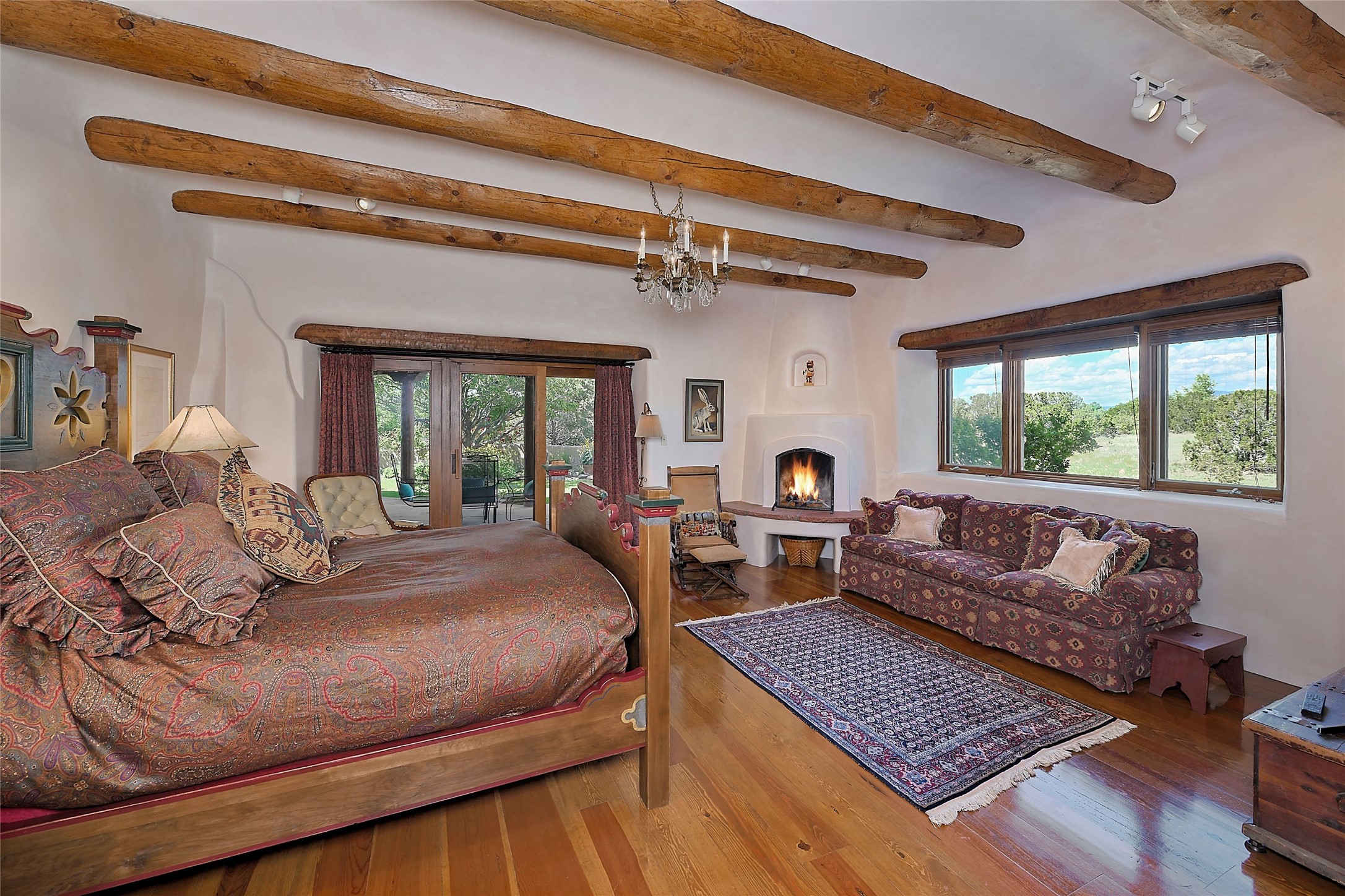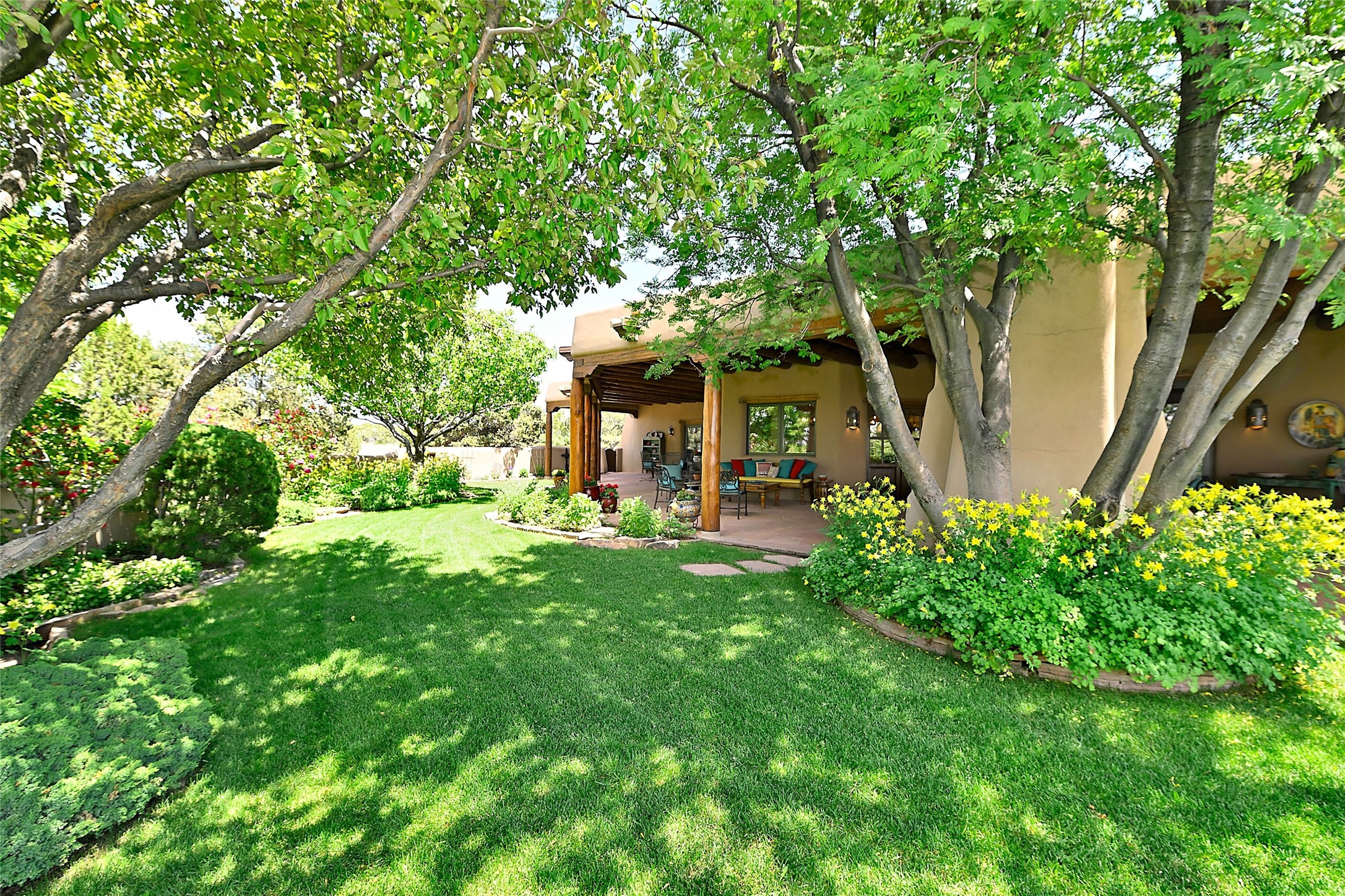 Nestled in a prime location on the Sunrise Golf Course, this exceptional adobe residence invites you into a lifestyle defined by comfort, artistry, and connection to the outdoors. A stunning portal wraps around the entire back of the home, framing expansive views of both the Jemez and Sangre de Cristo Mountains. Overlooking lush gardens and a beautifully landscaped backyard, this outdoor space is a favorite spot for outdoor dining, relaxing with a book, or simply enjoying the peaceful and quiet. Inside, the great room welcomes you with warmth and grandeur. A unique entryway, curved walls, artful niches, and a substantial fireplace create a space that feels both impressive and intimate. Just beyond, the warm and cheerful kitchen draws everyone in--anchored by a cozy fireplace and defined by handcrafted tin and tile accents, custom cabinetry, and inviting seating areas. The primary suite is a spacious retreat with a beautifully designed bathroom and a generous double shower. A separate wing of the house holds three self-contained guest bedrooms, each with its own distinctive bath, offering privacy and comfort to family and visitors alike. A charming library, currently used as an office, is accompanied by a finely finished guest bath. Throughout the home, attention to detail abounds--from hand-carved wooden doors to vigas and latillas that lend warmth and texture to every room. Thick adobe walls offer natural insulation year-round, while gently curved interior walls contribute to the home's organic flow. Multiple fireplaces throughout the home and portal provide both ambiance and warmth. This is a home filled with light, character, and soul--whether strolling near the golf course at sunset or savoring the serenity of the gardens, every space offers something truly special. Above all, it is simply a wonderful home to live in and love.