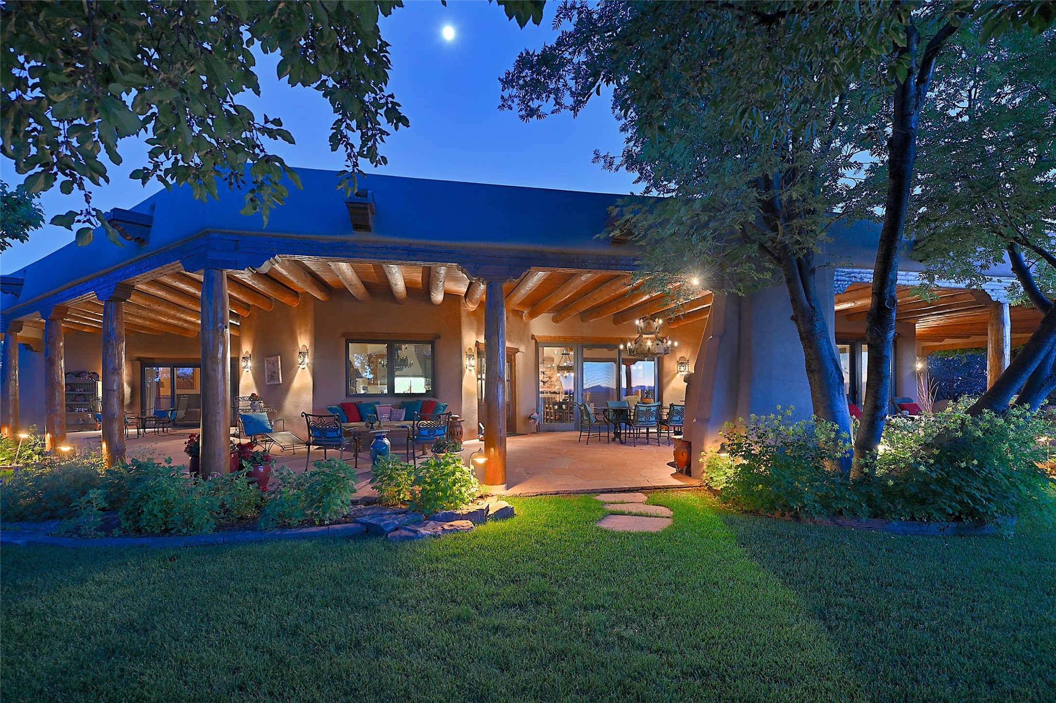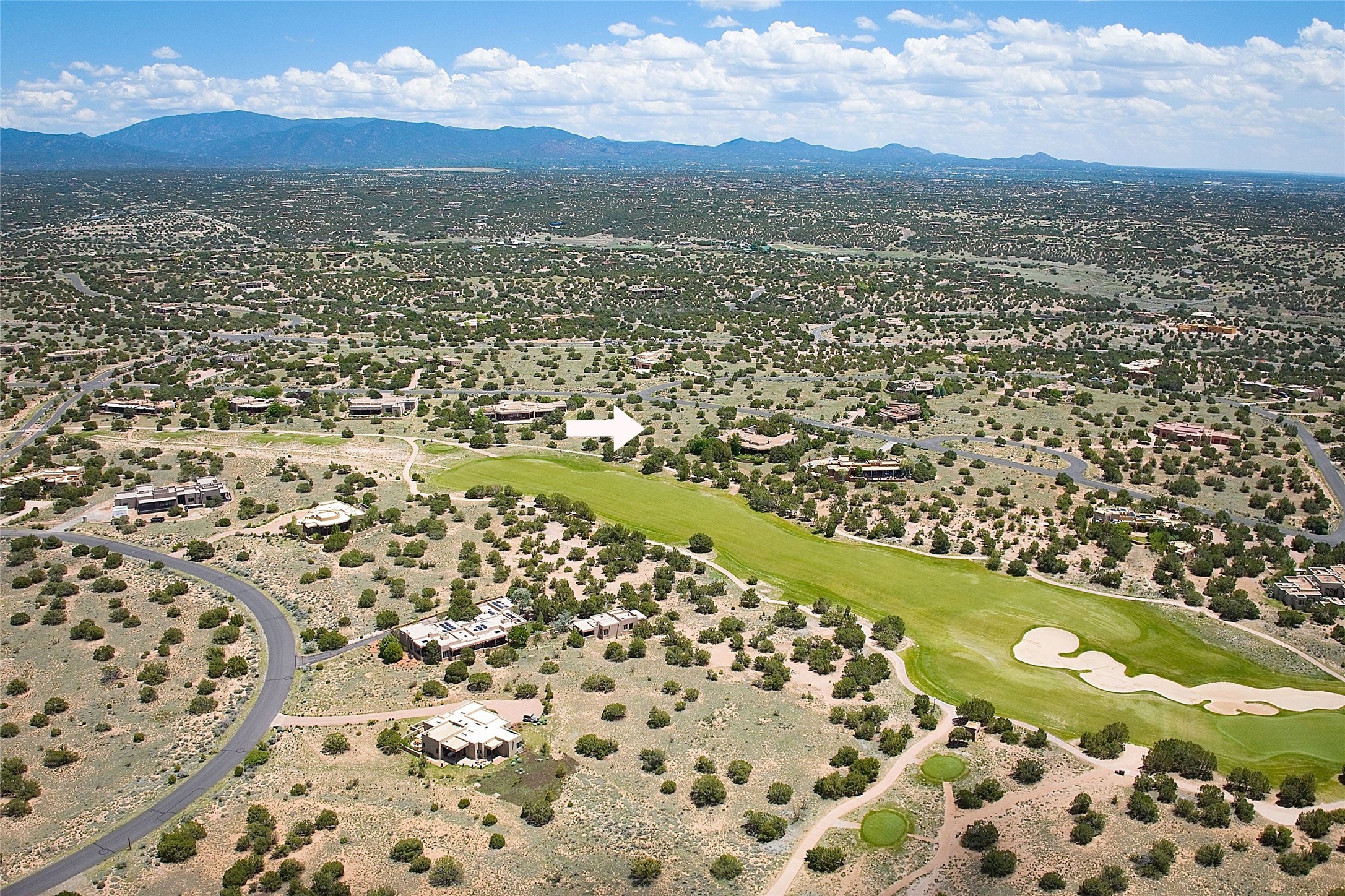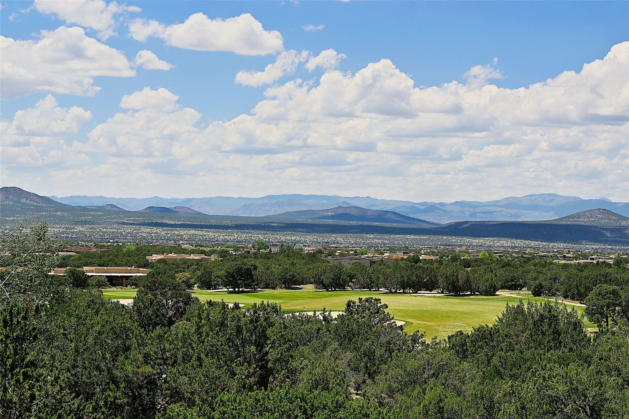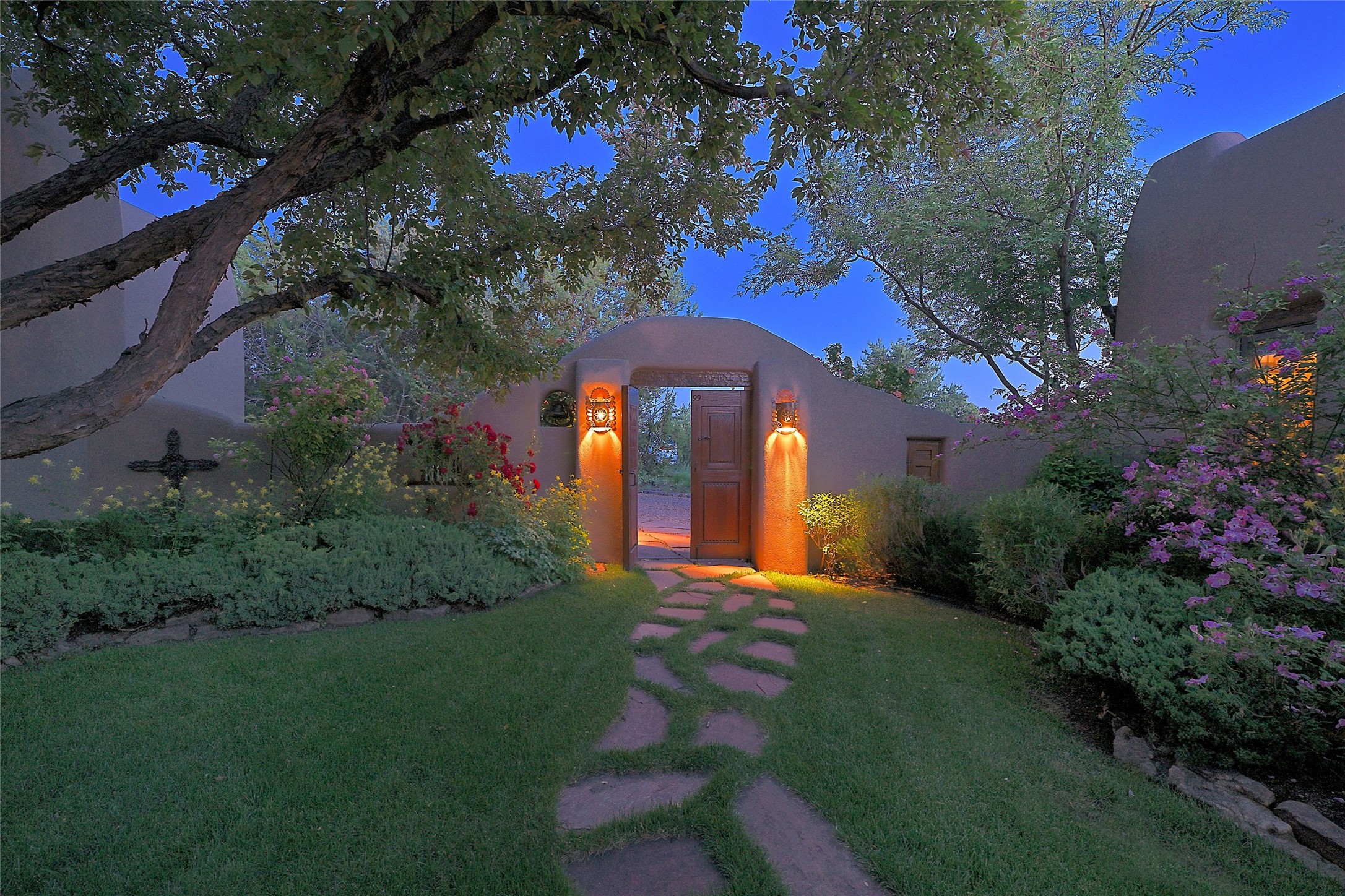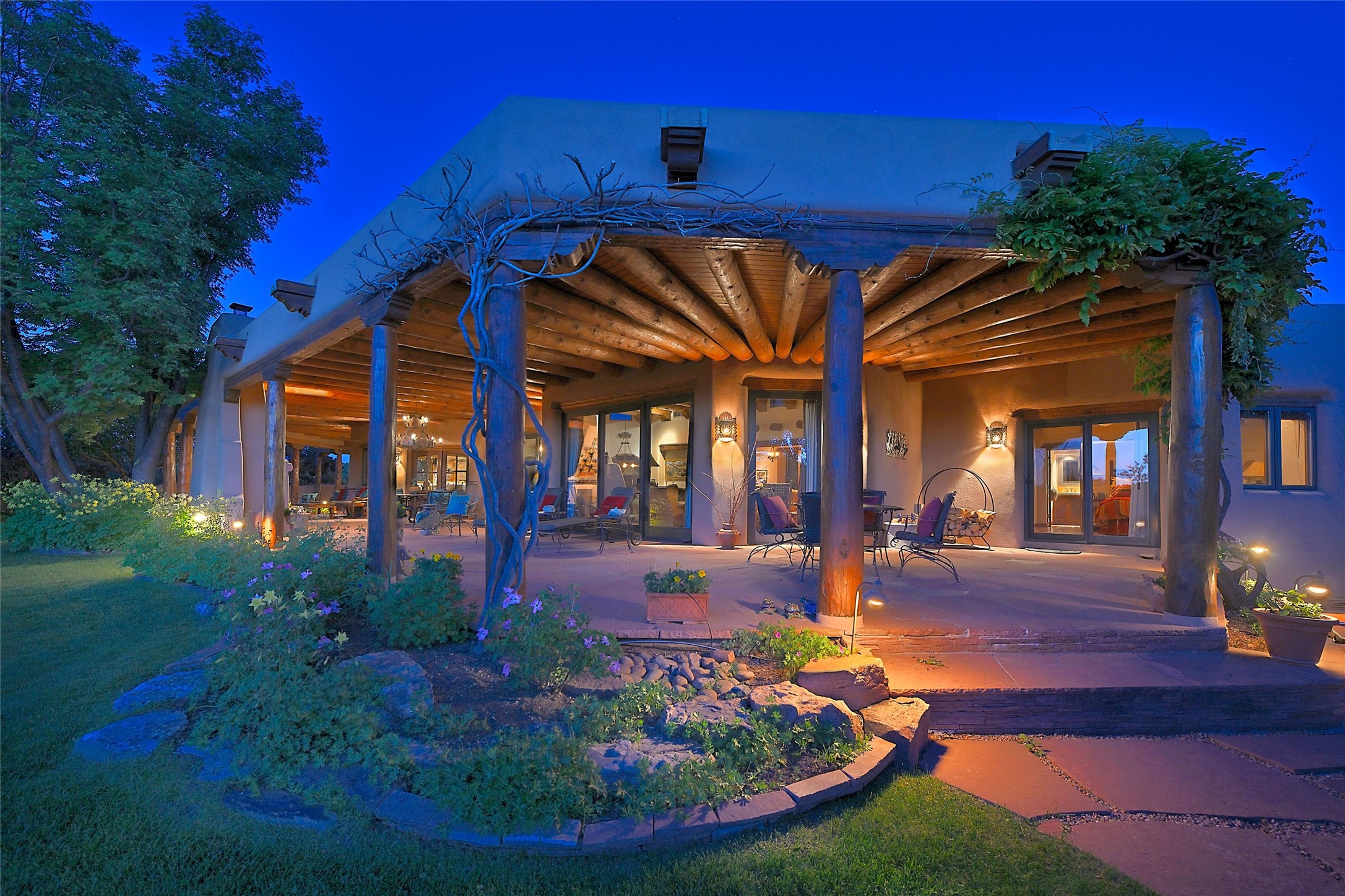 Nestled in a prime location on the Sunrise Golf Course, this exceptional adobe residence invites you into a lifestyle defined by comfort, artistry, and connection to the outdoors. A stunning portal wraps around the entire back of the home, framing expansive views of both the Jemez and Sangre de Cristo Mountains. Overlooking lush gardens and a beautifully landscaped backyard, this outdoor space is a favorite spot for outdoor dining, relaxing with a book, or simply enjoying the peaceful and quiet. Inside, the great room welcomes you with warmth and grandeur. A unique entryway, curved walls, artful niches, and a substantial fireplace create a space that feels both impressive and intimate. Just beyond, the warm and cheerful kitchen draws everyone in--anchored by a cozy fireplace and defined by handcrafted tin and tile accents, custom cabinetry, and inviting seating areas. The primary suite is a spacious retreat with a beautifully designed bathroom and a generous double shower. A separate wing of the house holds three self-contained guest bedrooms, each with its own distinctive bath, offering privacy and comfort to family and visitors alike. A charming library, currently used as an office, is accompanied by a finely finished guest bath. Throughout the home, attention to detail abounds--from hand-carved wooden doors to vigas and latillas that lend warmth and texture to every room. Thick adobe walls offer natural insulation year-round, while gently curved interior walls contribute to the home's organic flow. Multiple fireplaces throughout the home and portal provide both ambiance and warmth. This is a home filled with light, character, and soul--whether strolling near the golf course at sunset or savoring the serenity of the gardens, every space offers something truly special. Above all, it is simply a wonderful home to live in and love.