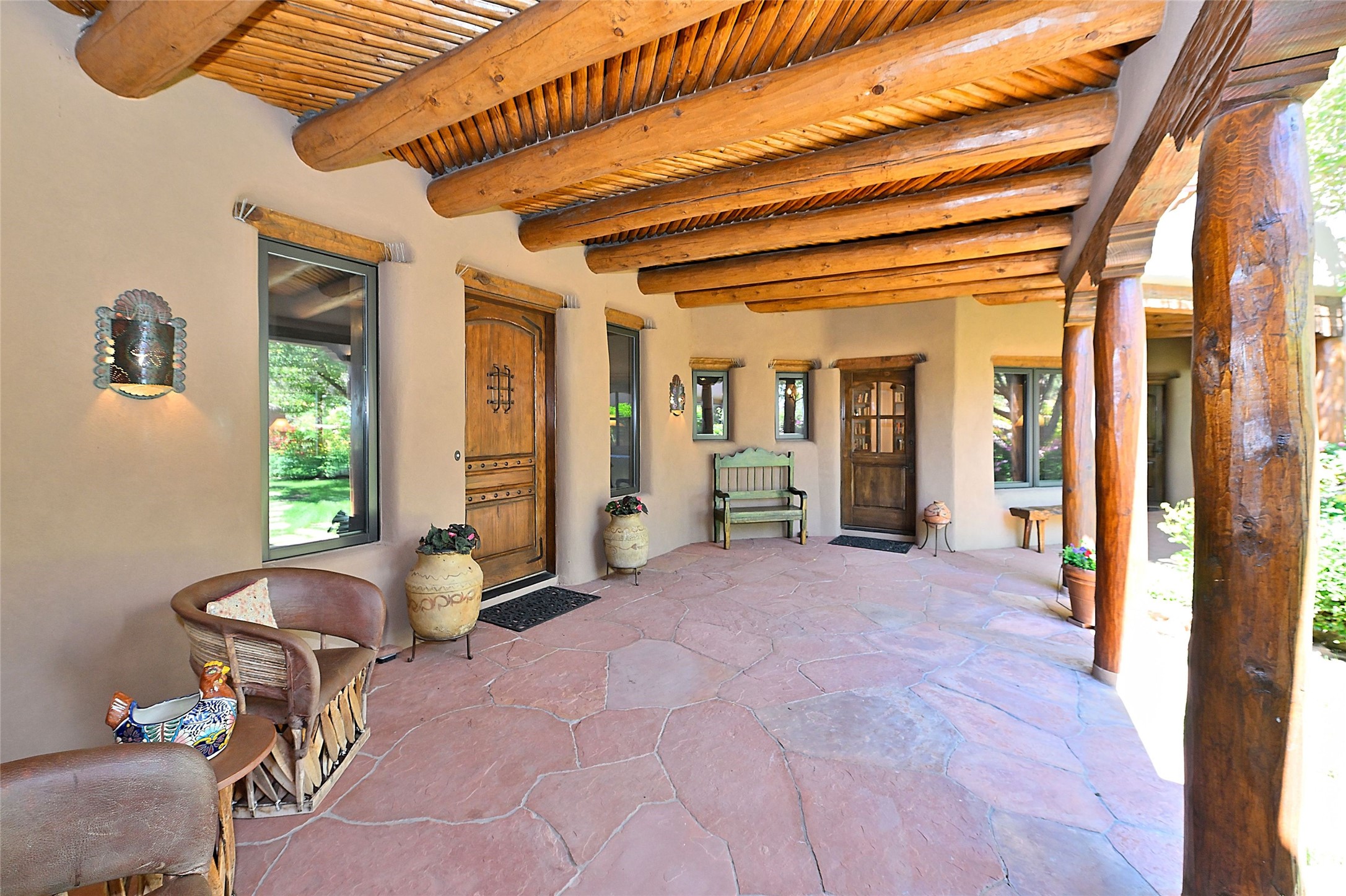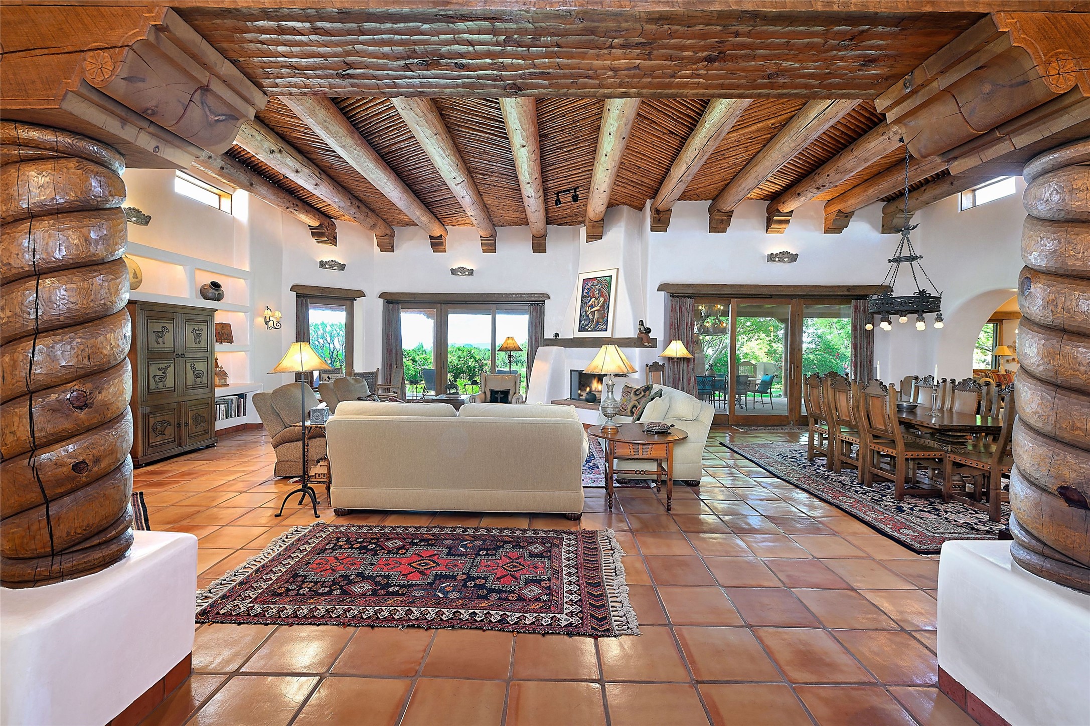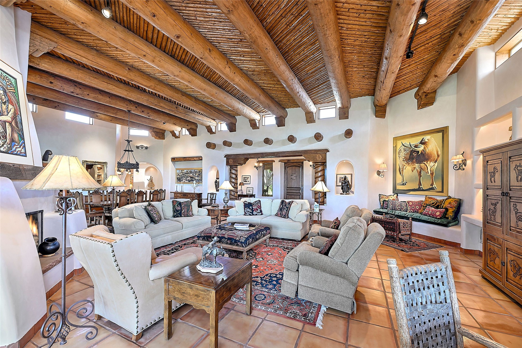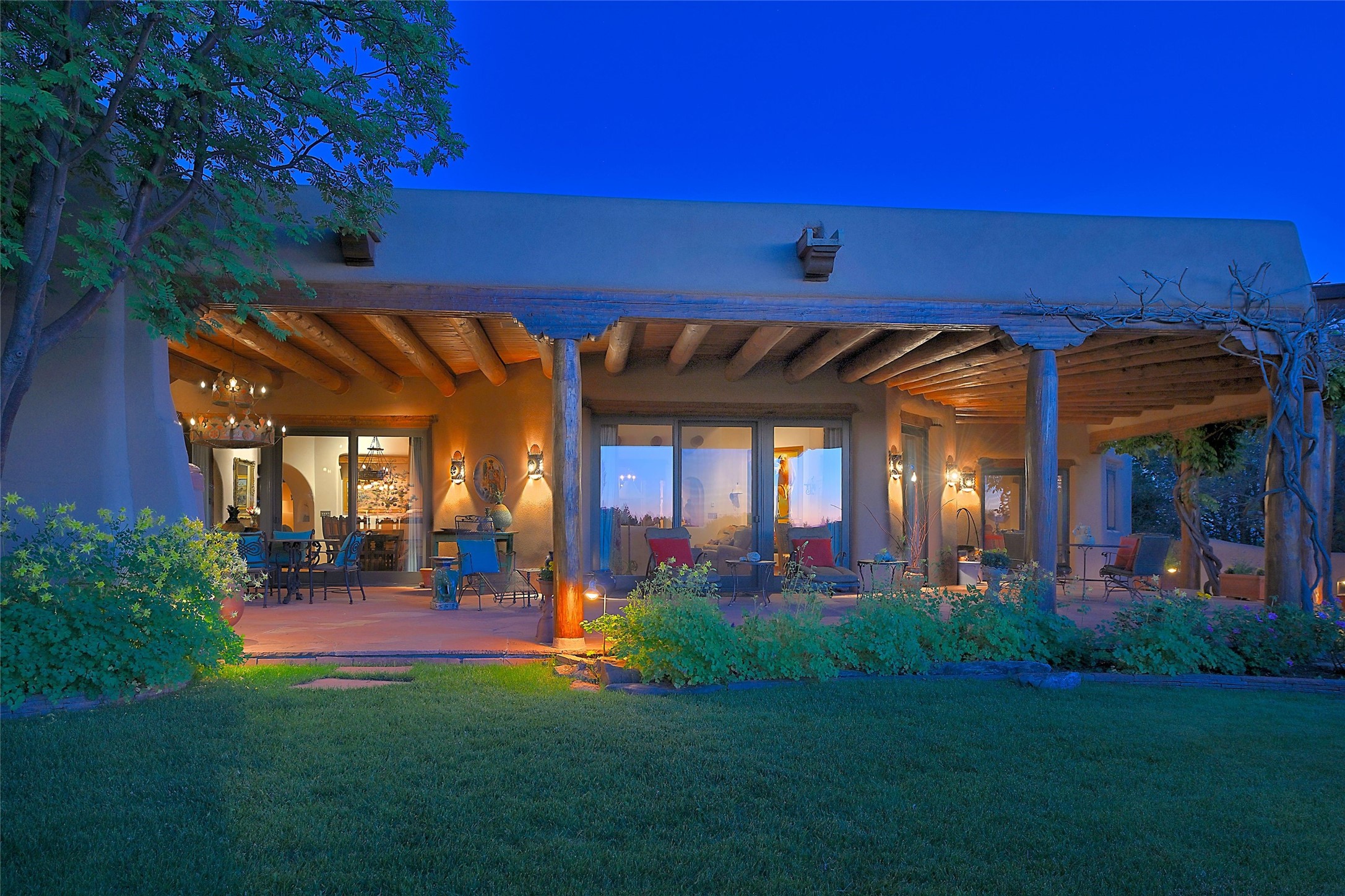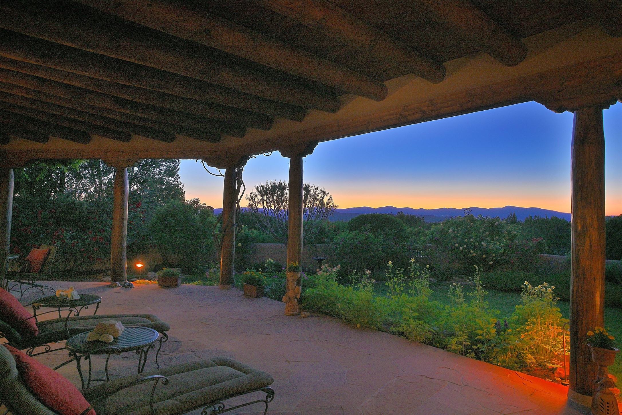 Nestled in a prime location on the Sunrise Golf Course, this exceptional adobe residence invites you into a lifestyle defined by comfort, artistry, and connection to the outdoors. A stunning portal wraps around the entire back of the home, framing expansive views of both the Jemez and Sangre de Cristo Mountains. Overlooking lush gardens and a beautifully landscaped backyard, this outdoor space is a favorite spot for outdoor dining, relaxing with a book, or simply enjoying the peaceful and quiet. Inside, the great room welcomes you with warmth and grandeur. A unique entryway, curved walls, artful niches, and a substantial fireplace create a space that feels both impressive and intimate. Just beyond, the warm and cheerful kitchen draws everyone in--anchored by a cozy fireplace and defined by handcrafted tin and tile accents, custom cabinetry, and inviting seating areas. The primary suite is a spacious retreat with a beautifully designed bathroom and a generous double shower. A separate wing of the house holds three self-contained guest bedrooms, each with its own distinctive bath, offering privacy and comfort to family and visitors alike. A charming library, currently used as an office, is accompanied by a finely finished guest bath. Throughout the home, attention to detail abounds--from hand-carved wooden doors to vigas and latillas that lend warmth and texture to every room. Thick adobe walls offer natural insulation year-round, while gently curved interior walls contribute to the home's organic flow. Multiple fireplaces throughout the home and portal provide both ambiance and warmth. This is a home filled with light, character, and soul--whether strolling near the golf course at sunset or savoring the serenity of the gardens, every space offers something truly special. Above all, it is simply a wonderful home to live in and love.