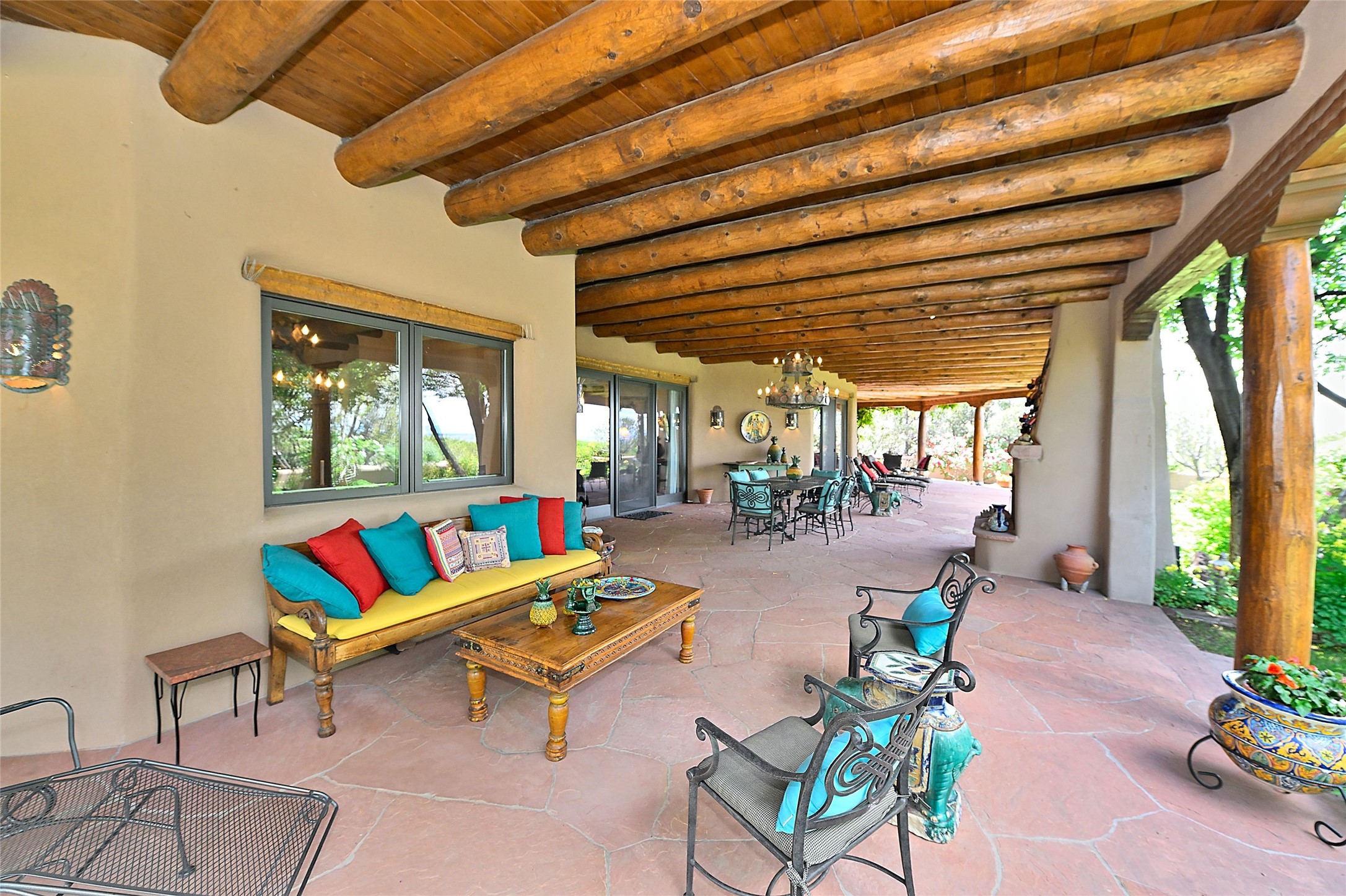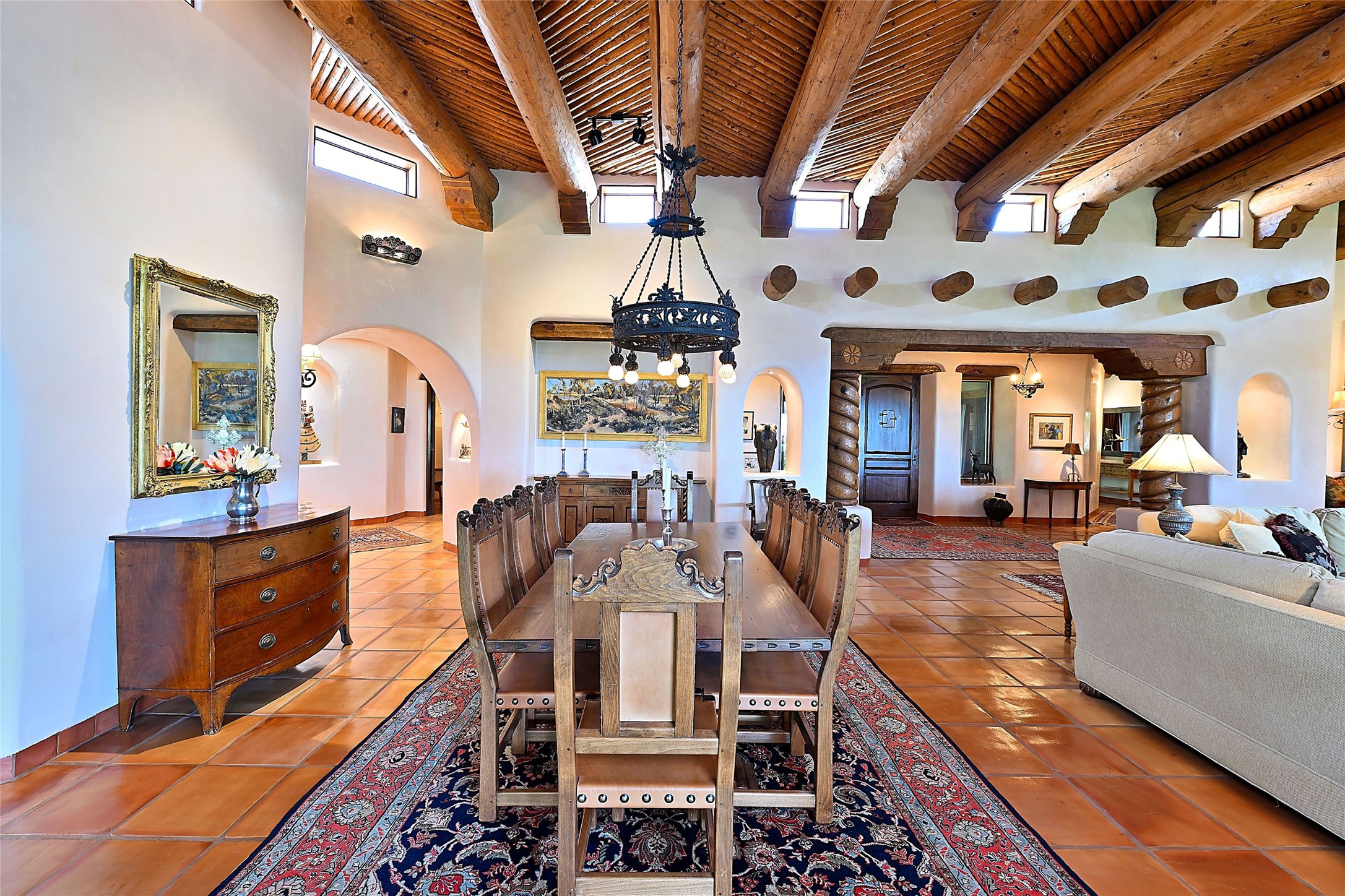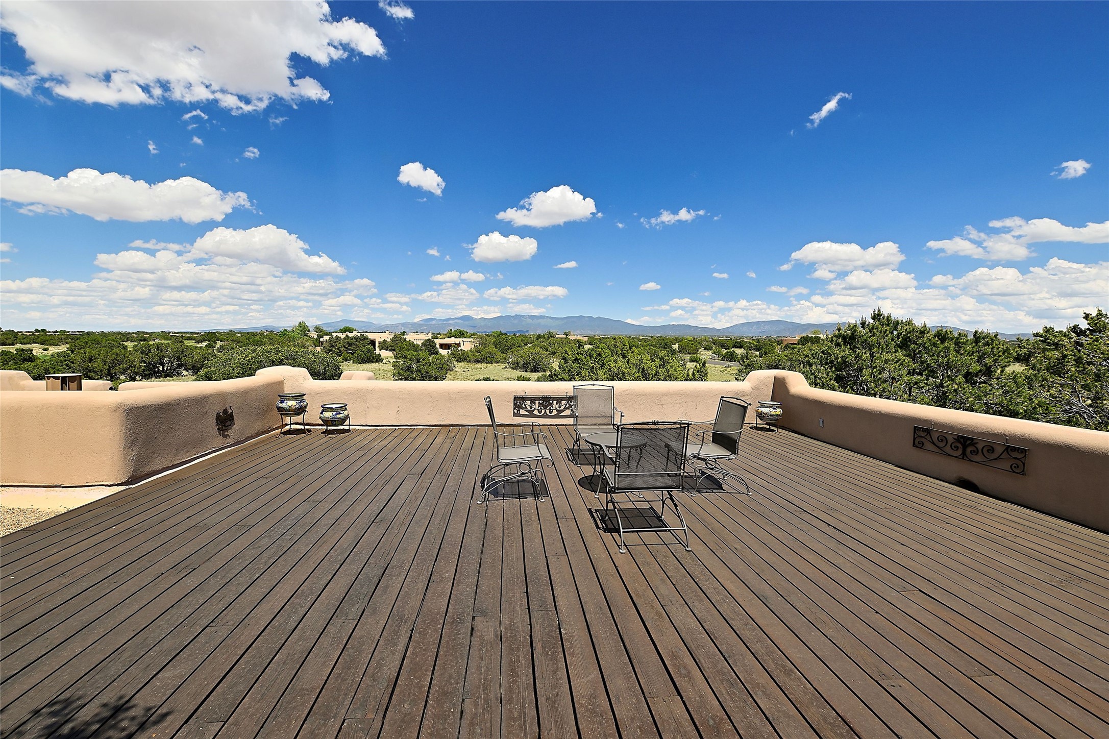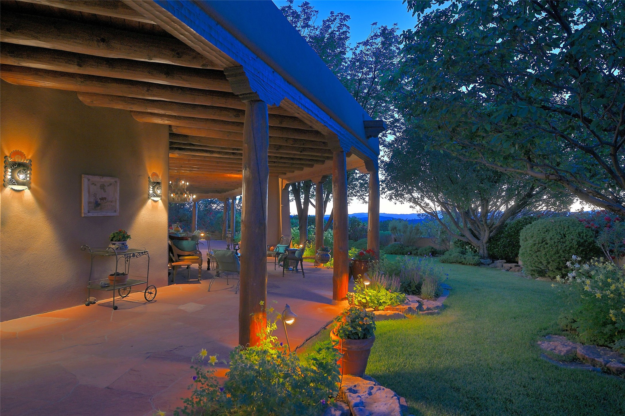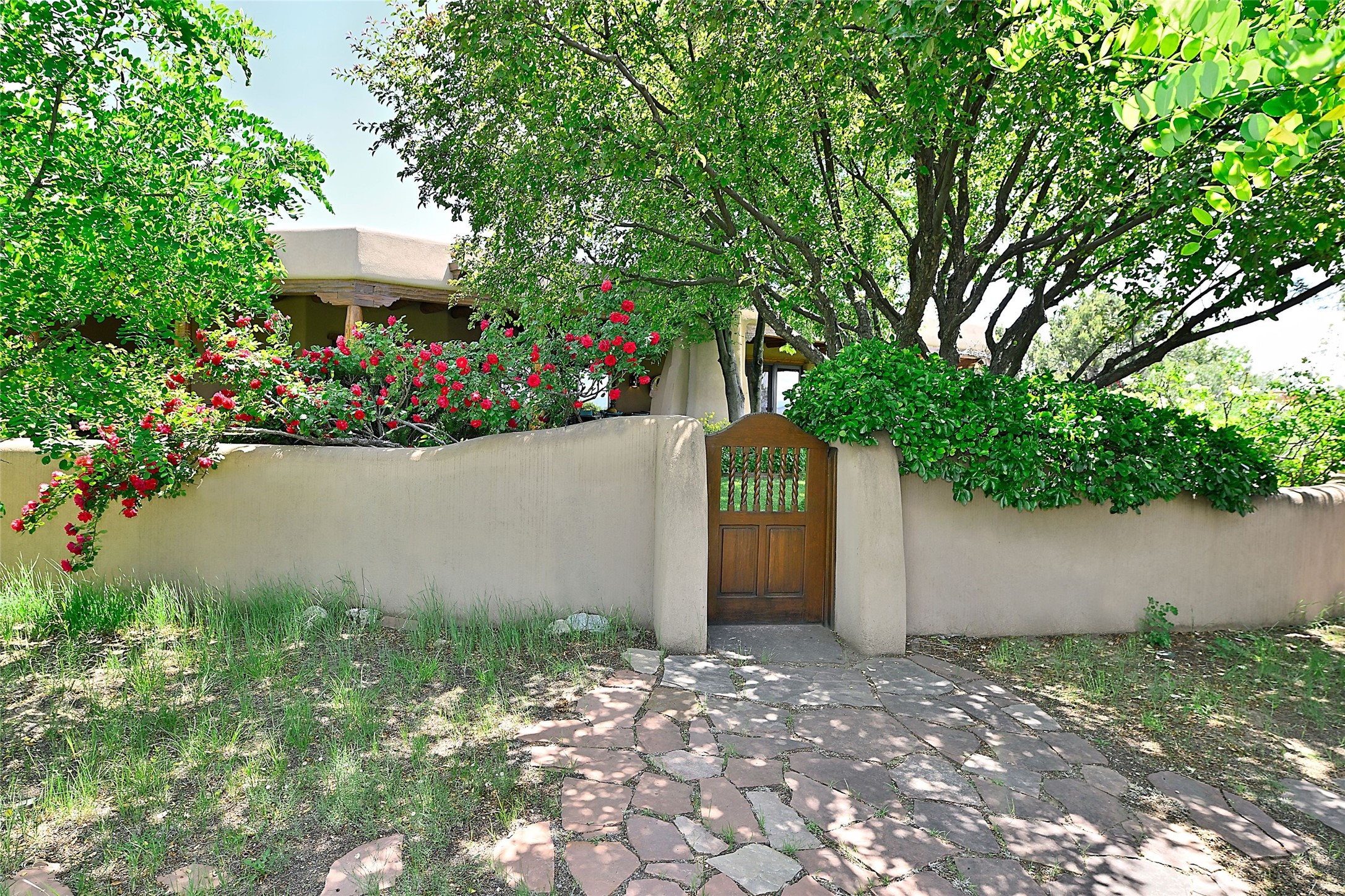 Nestled in a prime location on the Sunrise Golf Course, this exceptional adobe residence invites you into a lifestyle defined by comfort, artistry, and connection to the outdoors. A stunning portal wraps around the entire back of the home, framing expansive views of both the Jemez and Sangre de Cristo Mountains. Overlooking lush gardens and a beautifully landscaped backyard, this outdoor space is a favorite spot for outdoor dining, relaxing with a book, or simply enjoying the peaceful and quiet. Inside, the great room welcomes you with warmth and grandeur. A unique entryway, curved walls, artful niches, and a substantial fireplace create a space that feels both impressive and intimate. Just beyond, the warm and cheerful kitchen draws everyone in--anchored by a cozy fireplace and defined by handcrafted tin and tile accents, custom cabinetry, and inviting seating areas. The primary suite is a spacious retreat with a beautifully designed bathroom and a generous double shower. A separate wing of the house holds three self-contained guest bedrooms, each with its own distinctive bath, offering privacy and comfort to family and visitors alike. A charming library, currently used as an office, is accompanied by a finely finished guest bath. Throughout the home, attention to detail abounds--from hand-carved wooden doors to vigas and latillas that lend warmth and texture to every room. Thick adobe walls offer natural insulation year-round, while gently curved interior walls contribute to the home's organic flow. Multiple fireplaces throughout the home and portal provide both ambiance and warmth. This is a home filled with light, character, and soul--whether strolling near the golf course at sunset or savoring the serenity of the gardens, every space offers something truly special. Above all, it is simply a wonderful home to live in and love.