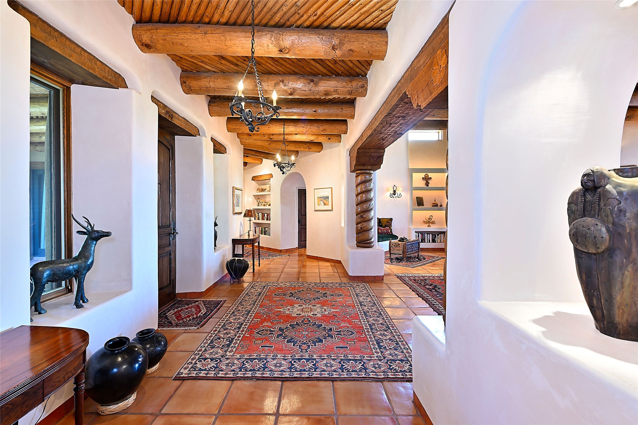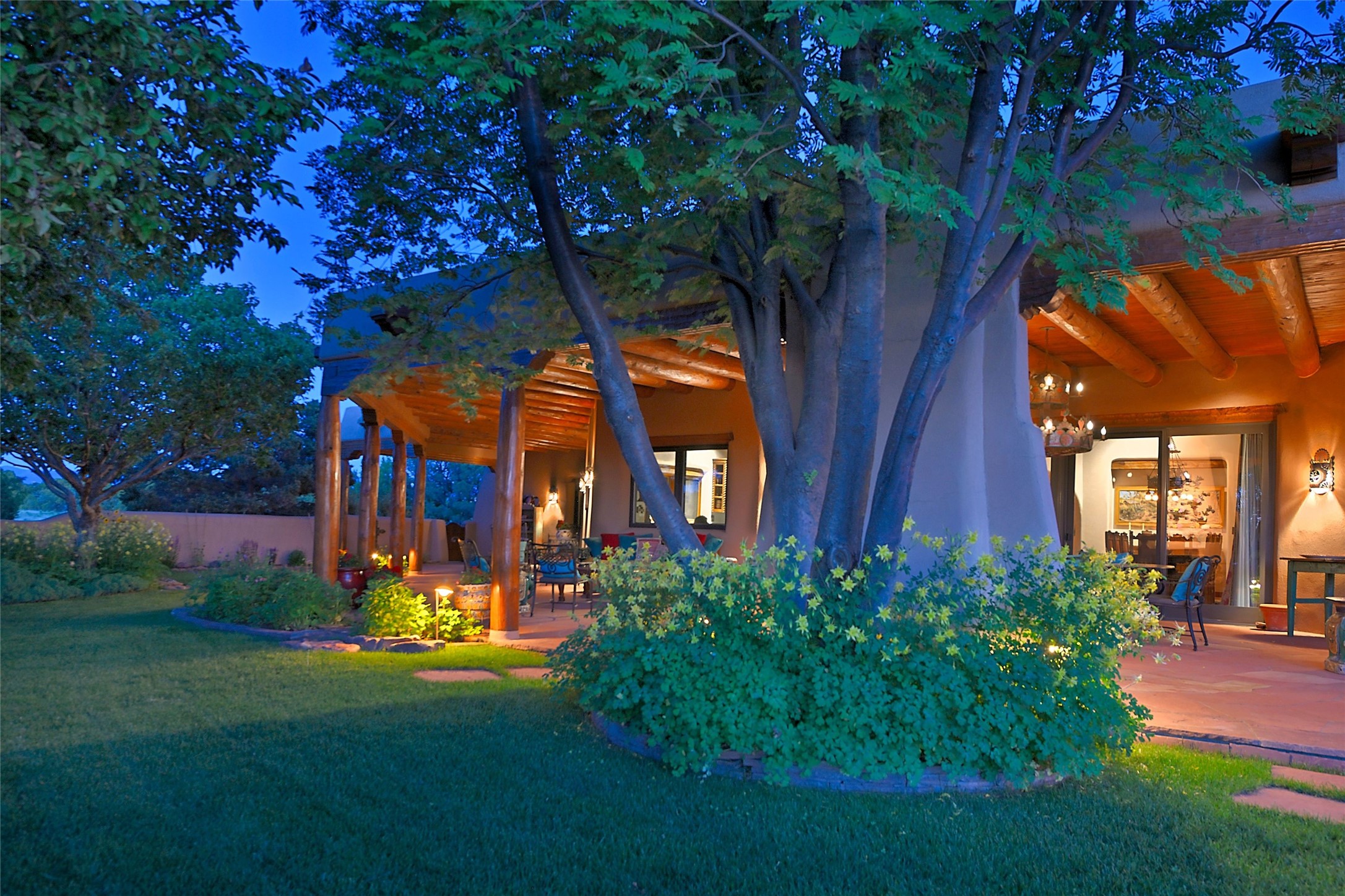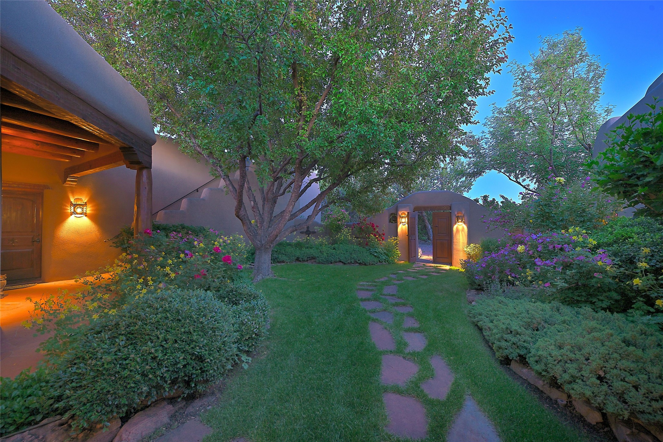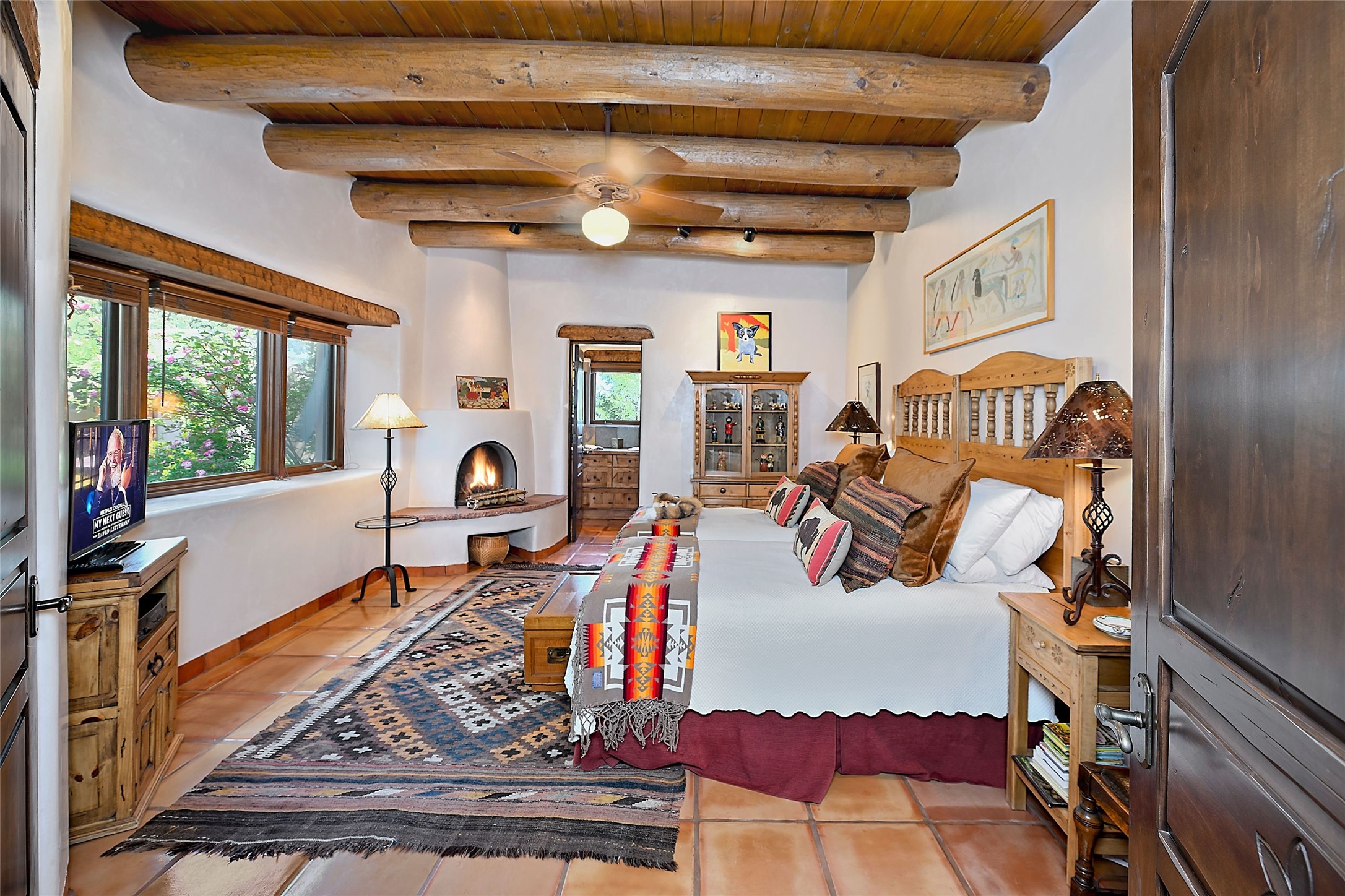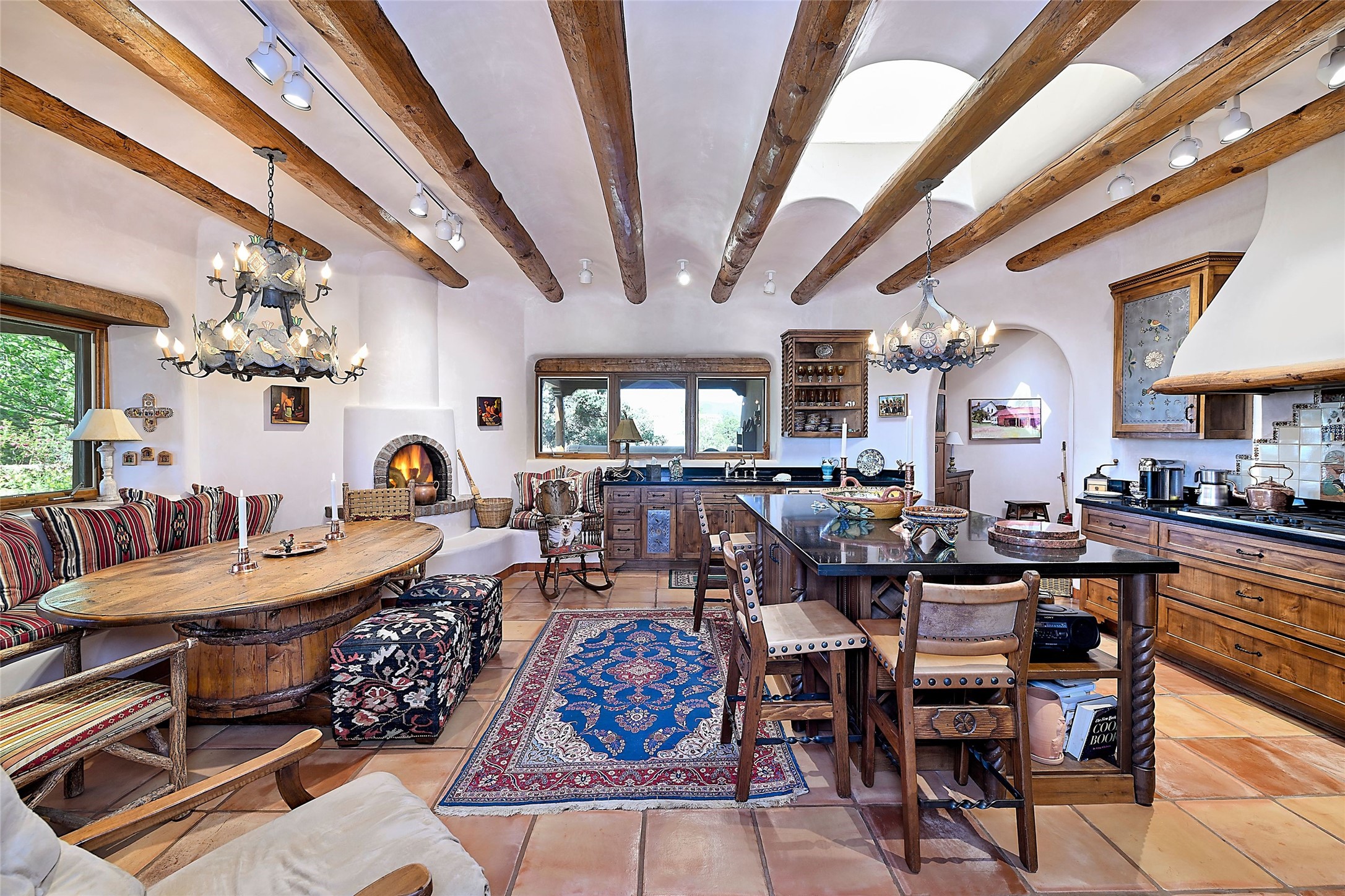 Nestled in a prime location on the Sunrise Golf Course, this exceptional adobe residence invites you into a lifestyle defined by comfort, artistry, and connection to the outdoors. A stunning portal wraps around the entire back of the home, framing expansive views of both the Jemez and Sangre de Cristo Mountains. Overlooking lush gardens and a beautifully landscaped backyard, this outdoor space is a favorite spot for outdoor dining, relaxing with a book, or simply enjoying the peaceful and quiet. Inside, the great room welcomes you with warmth and grandeur. A unique entryway, curved walls, artful niches, and a substantial fireplace create a space that feels both impressive and intimate. Just beyond, the warm and cheerful kitchen draws everyone in--anchored by a cozy fireplace and defined by handcrafted tin and tile accents, custom cabinetry, and inviting seating areas. The primary suite is a spacious retreat with a beautifully designed bathroom and a generous double shower. A separate wing of the house holds three self-contained guest bedrooms, each with its own distinctive bath, offering privacy and comfort to family and visitors alike. A charming library, currently used as an office, is accompanied by a finely finished guest bath. Throughout the home, attention to detail abounds--from hand-carved wooden doors to vigas and latillas that lend warmth and texture to every room. Thick adobe walls offer natural insulation year-round, while gently curved interior walls contribute to the home's organic flow. Multiple fireplaces throughout the home and portal provide both ambiance and warmth. This is a home filled with light, character, and soul--whether strolling near the golf course at sunset or savoring the serenity of the gardens, every space offers something truly special. Above all, it is simply a wonderful home to live in and love.