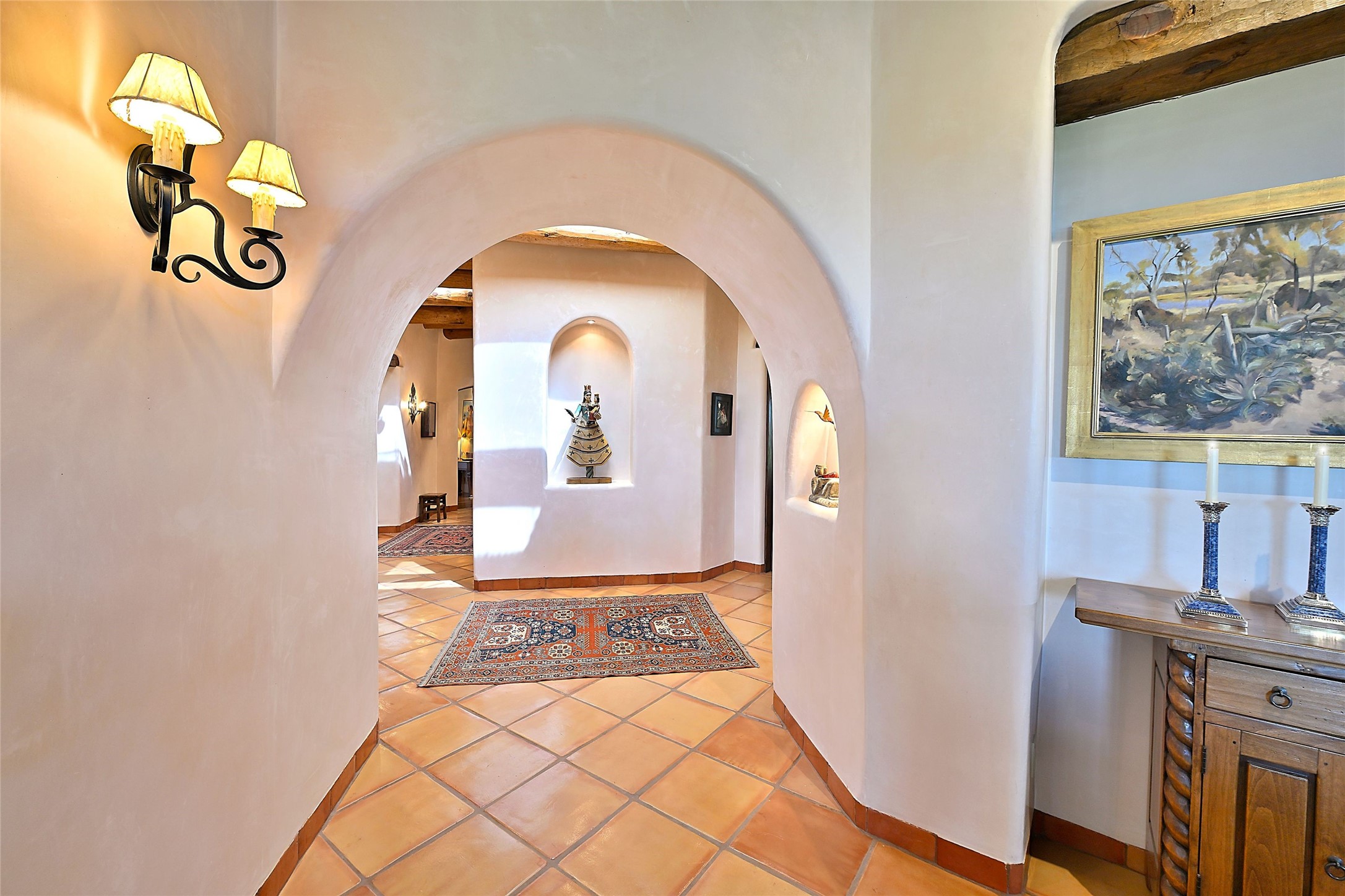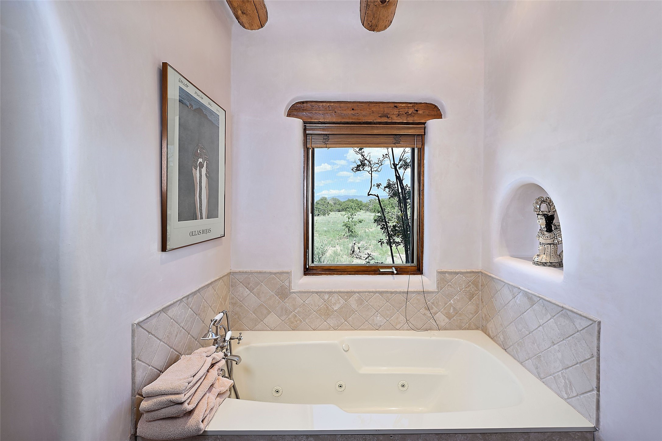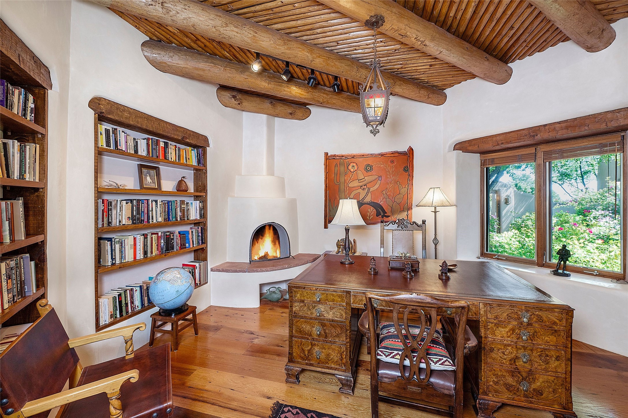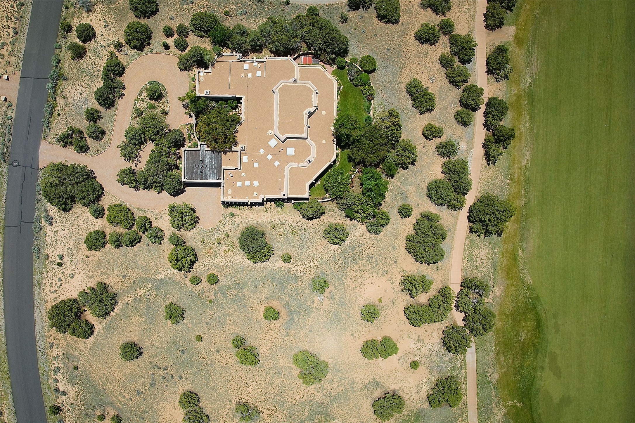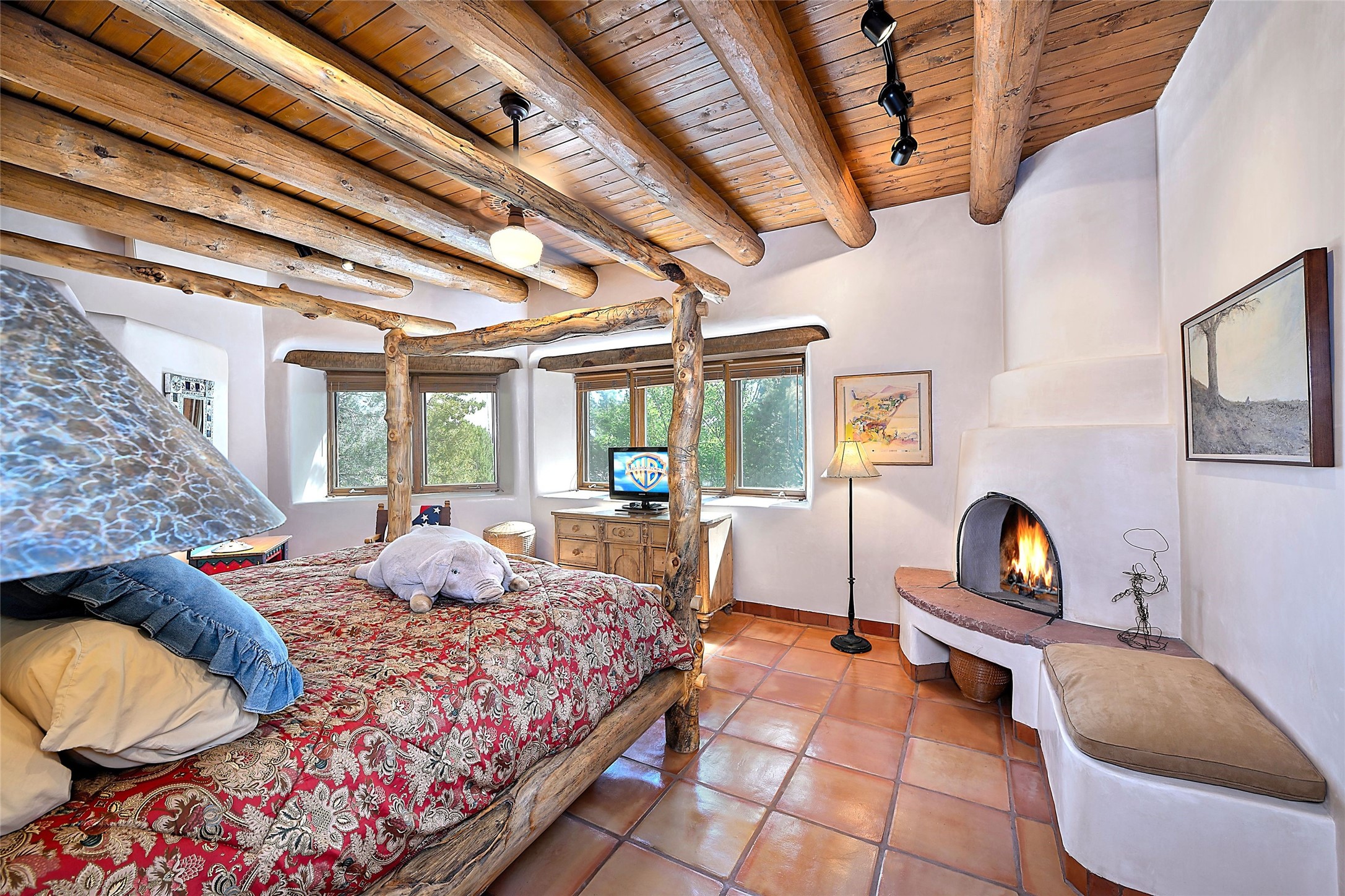 Nestled in a prime location on the Sunrise Golf Course, this exceptional adobe residence invites you into a lifestyle defined by comfort, artistry, and connection to the outdoors. A stunning portal wraps around the entire back of the home, framing expansive views of both the Jemez and Sangre de Cristo Mountains. Overlooking lush gardens and a beautifully landscaped backyard, this outdoor space is a favorite spot for outdoor dining, relaxing with a book, or simply enjoying the peaceful and quiet. Inside, the great room welcomes you with warmth and grandeur. A unique entryway, curved walls, artful niches, and a substantial fireplace create a space that feels both impressive and intimate. Just beyond, the warm and cheerful kitchen draws everyone in--anchored by a cozy fireplace and defined by handcrafted tin and tile accents, custom cabinetry, and inviting seating areas. The primary suite is a spacious retreat with a beautifully designed bathroom and a generous double shower. A separate wing of the house holds three self-contained guest bedrooms, each with its own distinctive bath, offering privacy and comfort to family and visitors alike. A charming library, currently used as an office, is accompanied by a finely finished guest bath. Throughout the home, attention to detail abounds--from hand-carved wooden doors to vigas and latillas that lend warmth and texture to every room. Thick adobe walls offer natural insulation year-round, while gently curved interior walls contribute to the home's organic flow. Multiple fireplaces throughout the home and portal provide both ambiance and warmth. This is a home filled with light, character, and soul--whether strolling near the golf course at sunset or savoring the serenity of the gardens, every space offers something truly special. Above all, it is simply a wonderful home to live in and love.